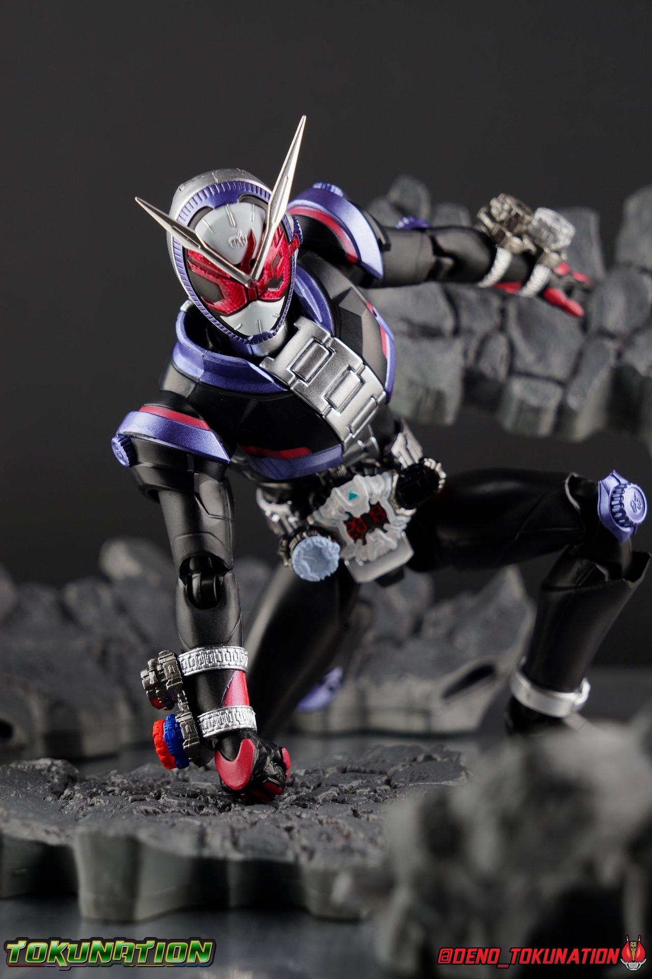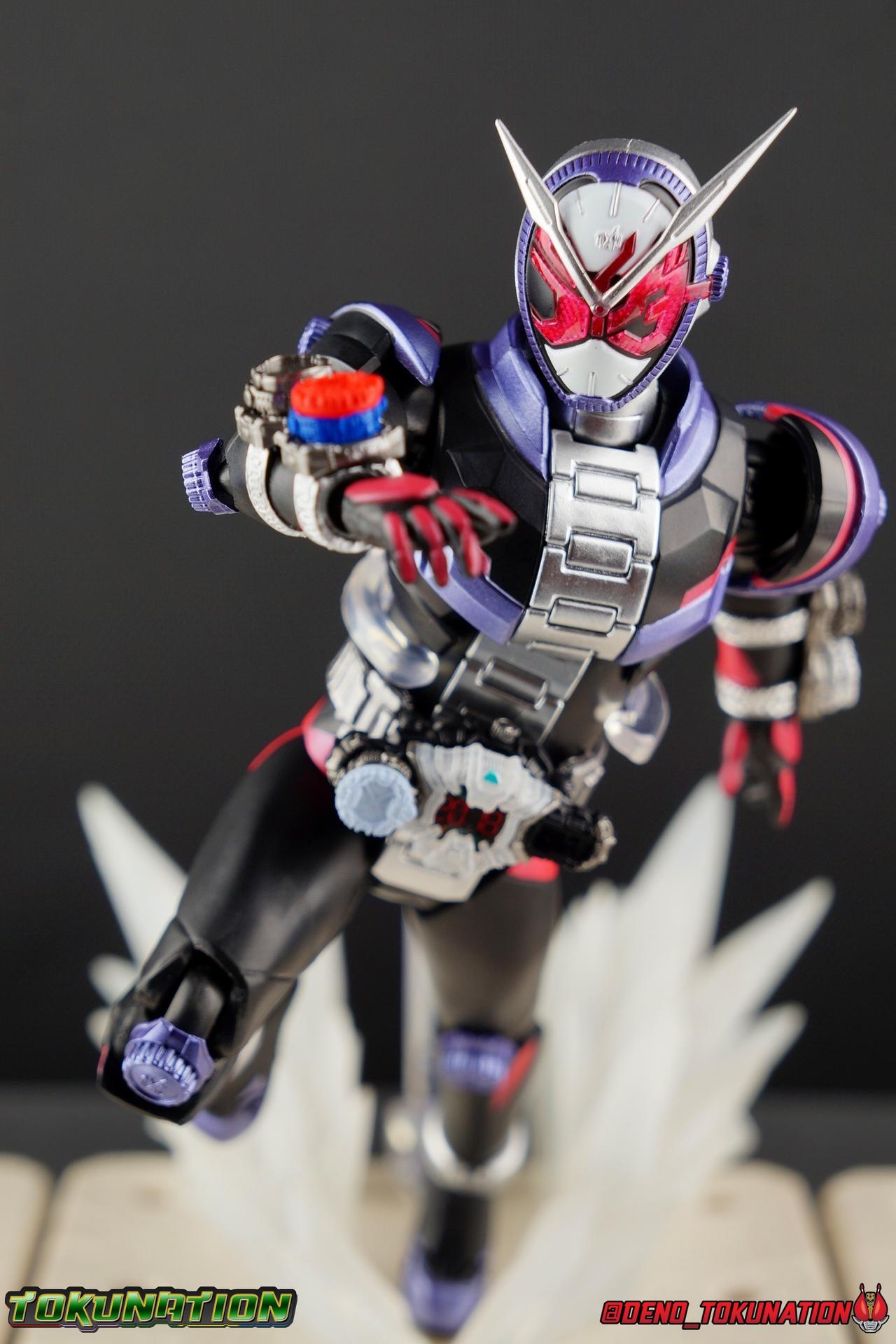 Since he was a child, Sougo Tokiwa dreamed of being a great king. Little did he know his dreams were prophetic. Should they ever come to pass, they could create a desolate future, one where Sougo became the evil overlord of time Oma Zi-O! In the present, Sougo begins his journey down the path of the overlord, defeating Another Riders as Kamen Rider Zi-O! With the Day of Oma swiftly approaching, will Zi-O become the future he's determined to avoid? Will all riders fall to the lord of time and space? Or will Geiz, the Time Jackers, Kamen Rider Woz, or even the destroyer of worlds Kamen Rider Decade, manage to contain his power? Time, will tell.... Packaging Zi-O's packaging is themed basically the same way as the new 20 Rider Kicks Heisei reissues. Those boxes all features the same hallmarks as his own, simply in a white color scheme. I actually think Zi-O's packaging is much sharper looking than the reissue line. Silver chrome on black just always work for me. The purple pink and silver color scheme is just nice, like his suit, it's all very complimentary. Main Figure Around this time every year I get the opportunity to check out the inaugural figure of a new Kamen Rider main line. A first impression is a really big deal to me. When the first figure is an absolute dud (Ghost) I rarely buy much of the rest of the line. When it's an excellent figure (Drive or Build for example) I buy practically everything and then some. So what kind of bar has Kamen Rider Zi-O set for this years line? A solid one. At 3240 yen. Zi-O was a well priced release. If you missed out on the initial pre-orders, it's out now and selling for a bit of a premium. Lack of accessories surely kept a lot of people from ordering it, but that apprehension may have backfired just a bit since any sort of re-issue isn't likely to occur during the show's run. Thankfully despite it's cheap price this is a pretty solid figure, and that starts with the base. Zi-O's legs provide a well rounded base of support. Wide flat feet, really solid toe bends, and nearly perfect ankles go a long way to allowing a figure to hit all the right balanced poses. Add to this basically wide open hip joints and double jointed knees and you've really got the full package. My only complaint is that the knee joints are quite tight and squeak when moved, and I could do with a better thigh swivel. As you can see with image 34 below, Zi-O's solid base of support allows him to execute very well balanced poses like that. This figure also features one of the best functional rider belts out there. The Ziku Driver is a really nicely detailed and functional piece that's more interactive than a lot of SHF scale belts, though you're just as likely to lose it's accessories. The Driver itself can rotate a full 360 degrees like the show prop and DX. The read out is permanently set to the year 2018 seeing as there's no armor swapping gimmick with the SHF's for Zi-O to change it. Each side of the Driver can however accept a Ridewatch. The right side of the driver comes with the Zi-O Ridewatch already attached. As with all the ride watches attached to this figure, none of them have accurately painted rider faces. Each opts for a simple base paint job, though the details of proper watches are sculpted into each face. And all aside from the Zi-O watch, are molded in a dormant position. More on that in the next section. The Bandai Figurise Standard mode kits all come with Ridewatches that have labels to make them look accurate. I'm not sure why a similar decision wasn't made here. I've seen a number of collectors make very nice labels for these tiny accessories. I just wish Bandai had done it for them in the first place. The upper body is wonderfully articulated, much better than I would have guessed initially. The lower torso has good rotation to it, but the surprise is how well the upper body can spin around it despite the bulk and the watch band running down the center. As you can see below it's got a pretty dynamic range to it going both directions as well as up and down. The sculpt of the watch band is well defined though I've seen some factory errors in the paint that irk me. The arms are also quite well done. While not perfect (I wish they could bend back closer to the bicep) they really do manage to get the job done. The shoulder pads are thankfully not a problem as can be the case with the first figure in a new line. There is a minor issue with the forearms though. Each has a double ridewatch holder on it. The left arm contains a completely blank watch, like those used by Time Jackers before creating an Another Rider. It also has what should be a Ride Striker Watch but the absence of any paint or label details makes it look pretty generic. The right arm has the Build Ridewatch and another blank. These watches are all set in the pre-position. As in the face is in the deactivated position, so even putting it on the Ziku Driver, it'll actually be in the wrong position no matter what you do. The big issue with the arms is that there's no cut in the mid-wrist to allow the holders to move around the arm. So posing Zi-O for his signature pointing up pose is imperfect. But it's not the worst thing in the world. Zi-O's helmet design is definitely an acquired taste for many. The pink visor spells out "Rider" in Katakana which is a pretty unique look for compound eyes. When light catches them the right though way they really sparkle. I find that some of the details around the watch face lining his head are a little spotty paint wise, but everything appears to be there. I'd honestly never noticed it before now, but the clock hands on his face are set to 10:10 which is actually a common standard setting in the watch world and works out to be a nod to his 20th Heisei Rider numbering. A neat touch! Overall the figure looks really good with the only real detractor being the way the Ridewatch's are unfinished. Accessories In what's become a more and more common trend with mainline f