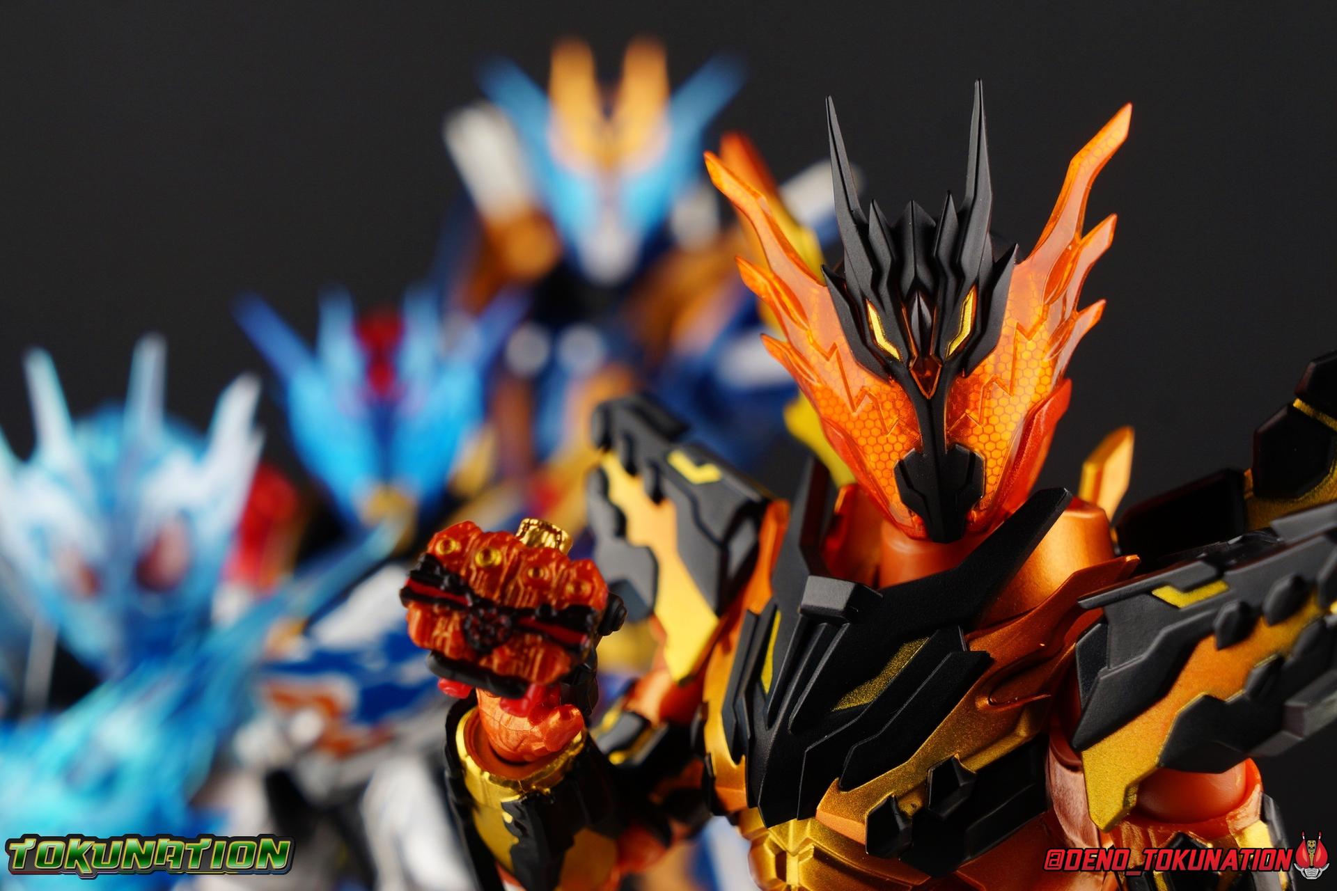 To stop Blood Stalk, to save Sento, to reclaim Pandora's box, Banjou will bathe in the fires of his own rage! Born from the burnt Dragon Magma Full Bottle, Cross-Z undergoes his ultimate transformation. Let's see just how bright this fire burns in our latest gallery, with S.H. Figuarts Kamen Rider Cross-Z Magma!! Packaging As with all Build releases the standard two-tone packaging is back with an orange fade. Nothing particularly fascinating or noteworthy, but Magma has some seriously hot stock photos. Oddly the interior tray is pretty wide open to accommodate the Pyro Wings molded on to his back. So be careful if you plan to store his closed fists in the tray, they will fall out on the sides. Main Figure Cross-Z Magma is yet another outing of the excellent Build/Cross-Z mold we've come to be familiar with. Each time it sees release it feels like it gets better to me. I've been a big fan of Build releases, and Magma is one I was very excited for. Thankfully it turned out wonderfully. While the basic structure of the body is what we've seen before, there are a number of new cosmetic physical details and paint applications that have been added. The legs are essentially the same. They're symmetrical like the previous two Cross-Z releases. The bulk of them, as well as the rest of the body, has also been painted in a vibrant metallic orange that looks even better in hand than in photos. New remolds to the legs include cracked magma ankle cuffs, dragon face/skulls running the length of each shin, a pair of smaller faces above the shin serving as really wicked knee pads, and cracked magma bands around each thigh. As before the knees can be tight, the hips have a pretty great range to them, and the ankles could always have a better tilt, but thankfully are very strong on this release. At the waist is the standard Build Driver, carried directly over from the previous Cross-Z(s) so the driver itself is identical to that of Build's as well. The new addition here, taking the place of the Cross-Z Dragon, is the Dragon Fist Magma Knuckle! This new bit is removable and can change modes. If you want to get it into the handheld weapon mode for any figure to hold, just rotate the handle backwards, you can also add or remove a Full Bottle as you wish. Pre-installed in the Knuckle is the Dragon Magma Full Bottle, a burnt version is included as a separate accessory as well. The front panels of the Knuckle are held on by small pegs, you can pop them off and center them back up for the close fist mode. It makes for a great little weapon and let's you display regular Cross-Z prior to the Magma transformation. If you want to leave it on the Driver, it plugs down snugly into the full bottle slots. As always there is a Full Bottle holder on the left hip if you wish to store extras. The upper body features an array of newly molded parts. The entire torso is new parts in fact. The lower section is an insanely ripped looking set of abs with a fading gold paint job. The chest section is molded to look like another really wicked dragon face while the orange accents around it mimic the stylized flames of Cross-Z's compound eyes. On his back, Magma features an enormous pair of appropriately named Pyro Wings. Styled like dragon wings covered in magma, these are easily the coolest and most striking feature of the figure. There is also a really cool spiked spine coming down the center of his back. Similarly to the legs, the arms feature the same style of magma bands around the bicep. While the forearm armor has been replaced with a dragon's head that appears to engulf the arm itself. Like the legs and chest, the eyes on this head are painted gold giving them a really striking look. The shoulders likewise have incredibly gorgeous heads protruding from them. Be wary of the shoulder pads as they can impact the chest protrusions. These ornate heads all over the body lead right back to the piece de resistance of the figure, which is Cross-Z Magma's own helmet. The usual dragon design takes on a slightly more fiery and fierce expression here. A bit larger than the previous figures and featuring gorgeous orange compound eyes, Magma is absolutely gorgeous. The head brings the whole design together in fantastic fashion. I got a bit experimental with my lighting in several shots and couldn't decide what I liked better, so I included a bunch of choices below ![]() Accessories Harkening back to numerous other web exclusives through out the years, Magma comes in a little lite: 2 - pairs of hands. One pair for holding things, primarily the Build Driver crank or the Magma Knuckle, the other pair open. I would have liked to see a little more variety here but these get the job done. The Holding hands leave a bit to be desired, getting previous Cross-Z weapons into these hands can be a tight fit, but it works well enough. 1 - Burnt Dragon Magma Bottle. A burnt black version of the bottle already in the driver. This is a fun and totally unnecessary inclusion. Banjou only had it until he finally raised his Hazard Level high enough to release it's full potential with the Magma Knuckle. That's pretty scant. I would have liked to have seen a few more hands and maybe a repacked Beat Crosser? Some flames effect, of any kind, would have been great too. Final Thoughts This is a stellar release. Lack of accessories aside, Kamen Rider Cross-Z Magma is a drop dead gorgeous figure. It's a form that really takes center stage in any Kamen Rider Build collection, and particularly if you have a focus on Banjou. Given we've gotten all of his other forms so far, I'd really really like to get Cross-Z Evol and Cross-Z Build at some point as well. For now, I'm ridiculously pleased with how lovely this figure turned out.