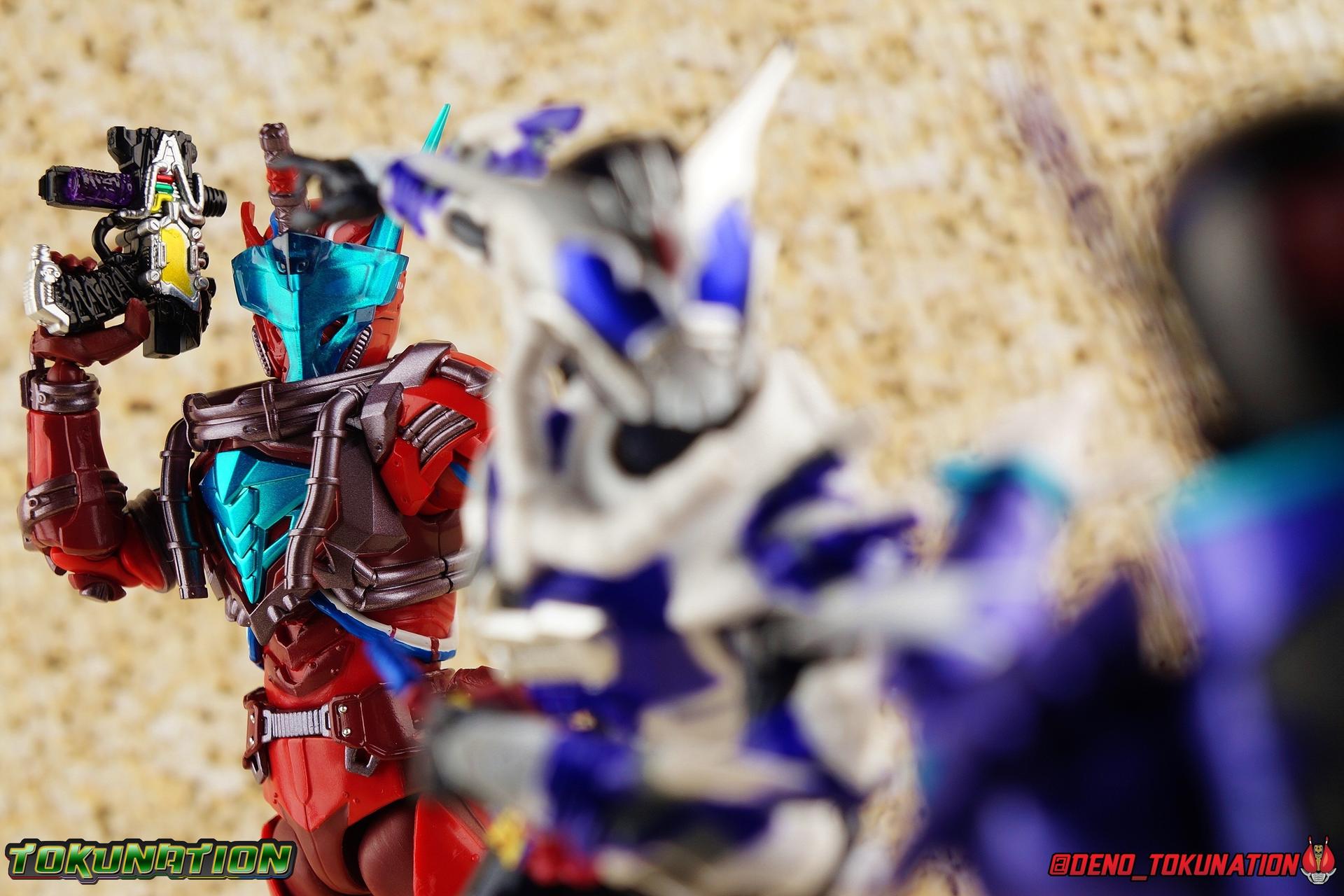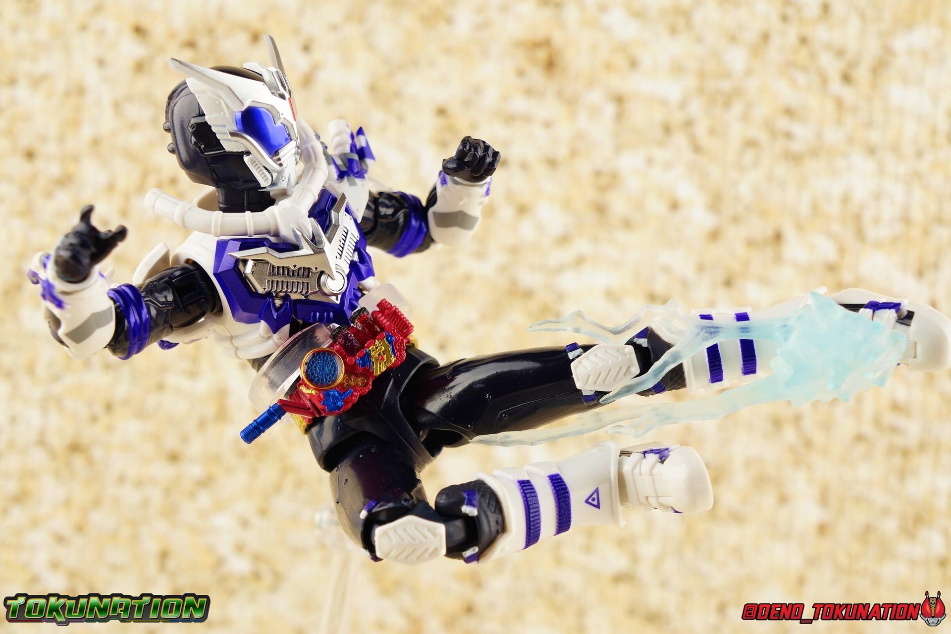 Utsumi Nariaki was one of the Nanba Children. Raised to be loyal to one man only, Juzaburo Nanba, he spent his life in service to his mentor. Loyal until the day Juzaburo was murdered, Utsumi faithfully served. But seeing his master's death at the hands of Kamen Rider Evol pushed him over the edge. With Utsumi's spirit broken, he was faced with the impossible option to take revenge, or serve Evol. Accepting the power of the Evol Driver and rejecting the pain of his grief, Utsumi is reborn as Kamen Rider Mad Rogue! Packaging As with practically all Build releases Mad Rogue has a pleasing two tone package design. Nothing's really changed aside from color choice and stock photos this go around. Main Figure The 4th times the charm right? If you're looking at Kamen Rider Mad Rogue and thinking that he looks pretty familiar, then you'd be right. This is the 4th outing so far of the mold at the core of this figure from Build's lineup. Previously we've seen a lot of this figure through Night Rogue, Blood Stalk, and of course Hell Bros. So you know what to expect out of a lot of this mold. That being said, I think this may be the best version of it released yet. Much like Night Rogue, Mad Rogue has an under suit that is ostensibly black, but upon closer inspection looks to be a dark dark blue instead. So far, Hell Bros is the only release that's used the brown suit parts. Now one of the few flaws I originally found with the mold, was the ankle design. Because of the way the cuff of the shin armor comes down around them, you do lose a small portion of movement in all directions. But the ankle ball is also designed in such a way that you can't really angle the feet outward properly. It's still a bother but it still works well enough too. Despite appearances, the bulk of the thighs doesn't impede leg movement either. As with the others, this figure can pose with the best. As before with this mold, I recommend you definitely pull the hips down far enough before moving them up, if you don't then the waist armor can dig some small grooves into the hips. The hips on this release are quite tight as well. This release of the mold also features the first driver attached to it, as well as the first release of Evol Driver itself. While the just announced Kamen Rider Evol will also feature this Driver, Mad Rogue is the first physical release of it in this line. A lavish repaint of the Build Driver in Gold, Red, & blue and features two new Full Bottles. The Bat & Engine Bottles. Both are removable as with any version of this mold and can interact with any accessory in the line that accepts them. The really pronounced difference with this release is of course the new molding and colors for the upper body. I should have mentioned the new white shin pads on the legs before, because they really help break up all that black as well, and tie it all together. While the upper body is hugely different, it shares so much with Night Rogue. Nearly all the parts are physically identical, but in a radically different paint scheme. And I can't be the only one who sees Mad Rogue and thinks he looks an awful lot like Transformers G2 Blast Off right? Anyways, the lower torso is the same part as what's featured on night rogue. In this instance the cables running around the ribs are left black, while the ab section is painted silver letting it stand out a bit more. The chest armor is really gorgeous. Basically the only molded difference is the new grill with the bat emblem that replaces the old gold bat on Night Rogue. But it's that stark difference from black/gold/silver to purple/silver/white that really sells how gorgeous this figure is by comparison. And I was seriously wowed by Night Rogue at the time of release. Mad Rogue has lot's of room to move in his waist and also has the same fluid movement in the upper torso as his mold predecessors. The arms are likewise identical molds, just with the new paint job. I have to say that I thoroughly enjoy the way the purple on white does look like a camouflage pattern. Again it's just amazing the stark difference that a paint job and a few new parts can illustrate. While the bicep swivel works wonderfully the elbow still can only hit about a 90 degree angle. Luckily this release does have the same great shoulder pads as Night Rogue giving him plenty of range that Hell Bros & Blood Stalk did not. The wrist joint is still a bit too close to the wrist cuff so you lose a bit of up and down movement, but ultimately the loss doesn't amount to much of an issue in the end. Finally Mad Rogue has a brand new head that takes inspiration from his mold mate & name sake Night Rogue. While still absolutely portraying a bat theme it's done very differently. Honestly this head has always evoked the look of Kamen Rider Saga from Kiva to me. Between the bat theme and the colors this rider as a whole reminds me of Saga or perhaps even Kiva-La. All in all this figure has turned out wonderfully and I think easily is the most striking and interesting use of the Kaiser/Transteam System body type we've gotten so far. Accessories As with any Build Rider worth their salt, Mad Rogue comes with everything he needs: 1 - Nebula Steam Gun. This is a straight repack of the accessory that Kamen Rider Rogue came with. Which is interesting given the the Hell Bros release included a purposefully different version of the weapon. This also marks the 5th release of this weapon across the line. Night Rogue, Blood Stalk, Rogue, Hell Bros, Mad Rogue. 1 - Steam Blade. A repack of the components that have been included with the Nebula Steam Gun, 5 times now. Use them as a stand alone blade, or the Nebula Steam Gun can still use them in the exact same way, combining to form the Nebula Steam Rifle. 3 - sets of hands. That's a set of open pose hands, 1 for holding the gun, and 1 for holding the blade. Everything you need! Given the late stage appearances of Mad Rogue, his arsenal was pretty focused, so this is a pretty much perfect