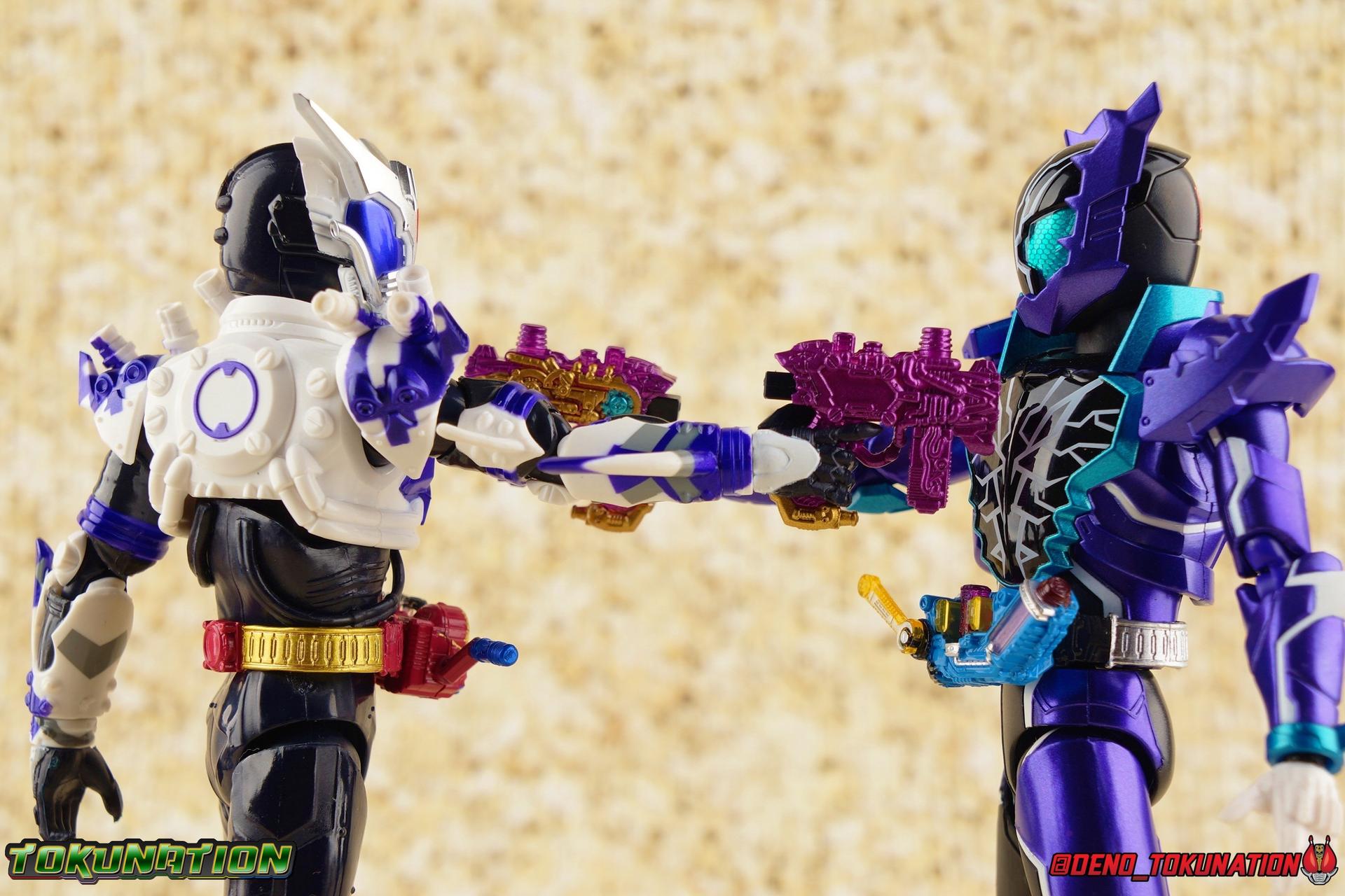 Utsumi Nariaki was one of the Nanba Children. Raised to be loyal to one man only, Juzaburo Nanba, he spent his life in service to his mentor. Loyal until the day Juzaburo was murdered, Utsumi faithfully served. But seeing his master's death at the hands of Kamen Rider Evol pushed him over the edge. With Utsumi's spirit broken, he was faced with the impossible option to take revenge, or serve Evol. Accepting the power of the Evol Driver and rejecting the pain of his grief, Utsumi is reborn as Kamen Rider Mad Rogue! Packaging As with practically all Build releases Mad Rogue has a pleasing two tone package design. Nothing's really changed aside from color choice and stock photos this go around. Main Figure The 4th times the charm right? If you're looking at Kamen Rider Mad Rogue and thinking that he looks pretty familiar, then you'd be right. This is the 4th outing so far of the mold at the core of this figure from Build's lineup. Previously we've seen a lot of this figure through Night Rogue, Blood Stalk, and of course Hell Bros. So you know what to expect out of a lot of this mold. That being said, I think this may be the best version of it released yet. Much like Night Rogue, Mad Rogue has an under suit that is ostensibly black, but upon closer inspection looks to be a dark dark blue instead. So far, Hell Bros is the only release that's used the brown suit parts. Now one of the few flaws I originally found with the mold, was the ankle design. Because of the way the cuff of the shin armor comes down around them, you do lose a small portion of movement in all directions. But the ankle ball is also designed in such a way that you can't really angle the feet outward properly. It's still a bother but it still works well enough too. Despite appearances, the bulk of the thighs doesn't impede leg movement either. As with the others, this figure can pose with the best. As before with this mold, I recommend you definitely pull the hips down far enough before moving them up, if you don't then the waist armor can dig some small grooves into the hips. The hips on this release are quite tight as well. This release of the mold also features the first driver attached to it, as well as the first release of Evol Driver itself. While the just announced Kamen Rider Evol will also feature this Driver, Mad Rogue is the first physical release of it in this line. A lavish repaint of the Build Driver in Gold, Red, & blue and features two new Full Bottles. The Bat & Engine Bottles. Both are removable as with any version of this mold and can interact with any accessory in the line that accepts them. The really pronounced difference with this release is of course the new molding and colors for the upper body. I should have mentioned the new white shin pads on the legs before, because they really help break up all that black as well, and tie it all together. While the upper body is hugely different, it shares so much with Night Rogue. Nearly all the parts are physically identical, but in a radically different paint scheme. And I can't be the only one who sees Mad Rogue and thinks he looks an awful lot like Transformers G2 Blast Off right? Anyways, the lower torso is the same part as what's featured on night rogue. In this instance the cables running around the ribs are left black, while the ab section is painted silver letting it stand out a bit more. The chest armor is really gorgeous. Basically the only molded difference is the new grill with the bat emblem that replaces the old gold bat on Night Rogue. But it's that stark difference from black/gold/silver to purple/silver/white that really sells how gorgeous this figure is by comparison. And I was seriously wowed by Night Rogue at the time of release. Mad Rogue has lot's of room to move in his waist and also has the same fluid movement in the upper torso as his mold predecessors. The arms are likewise identical molds, just with the new paint job. I have to say that I thoroughly enjoy the way the purple on white does look like a camouflage pattern. Again it's just amazing the stark difference that a paint job and a few new parts can illustrate. While the bicep swivel works wonderfully the elbow still can only hit about a 90 degree angle. Luckily this release does have the same great shoulder pads as Night Rogue giving him plenty of range that Hell Bros & Blood Stalk did not. The wrist joint is still a bit too close to the wrist cuff so you lose a bit of up and down movement, but ultimately the loss doesn't amount to much of an issue in the end. Finally Mad Rogue has a brand new head that takes inspiration from his mold mate & name sake Night Rogue. While still absolutely portraying a bat theme it's done very differently. Honestly this head has always evoked the look of Kamen Rider Saga from Kiva to me. Between the bat theme and the colors this rider as a whole reminds me of Saga or perhaps even Kiva-La. All in all this figure has turned out wonderfully and I think easily is the most striking and interesting use of the Kaiser/Transteam System body type we've gotten so far. Accessories As with any Build Rider worth their salt, Mad Rogue comes with everything he needs: 1 - Nebula Steam Gun. This is a straight repack of the accessory that Kamen Rider Rogue came with. Which is interesting given the the Hell Bros release included a purposefully different version of the weapon. This also marks the 5th release of this weapon across the line. Night Rogue, Blood Stalk, Rogue, Hell Bros, Mad Rogue. 1 - Steam Blade. A repack of the components that have been included with the Nebula Steam Gun, 5 times now. Use them as a stand alone blade, or the Nebula Steam Gun can still use them in the exact same way, combining to form the Nebula Steam Rifle. 3 - sets of hands. That's a set of open pose hands, 1 for holding the gun, and 1 for holding the blade. Everything you need! Given the late stage appearances of Mad Rogue, his arsenal was pretty focused, so this is a pretty much perfect