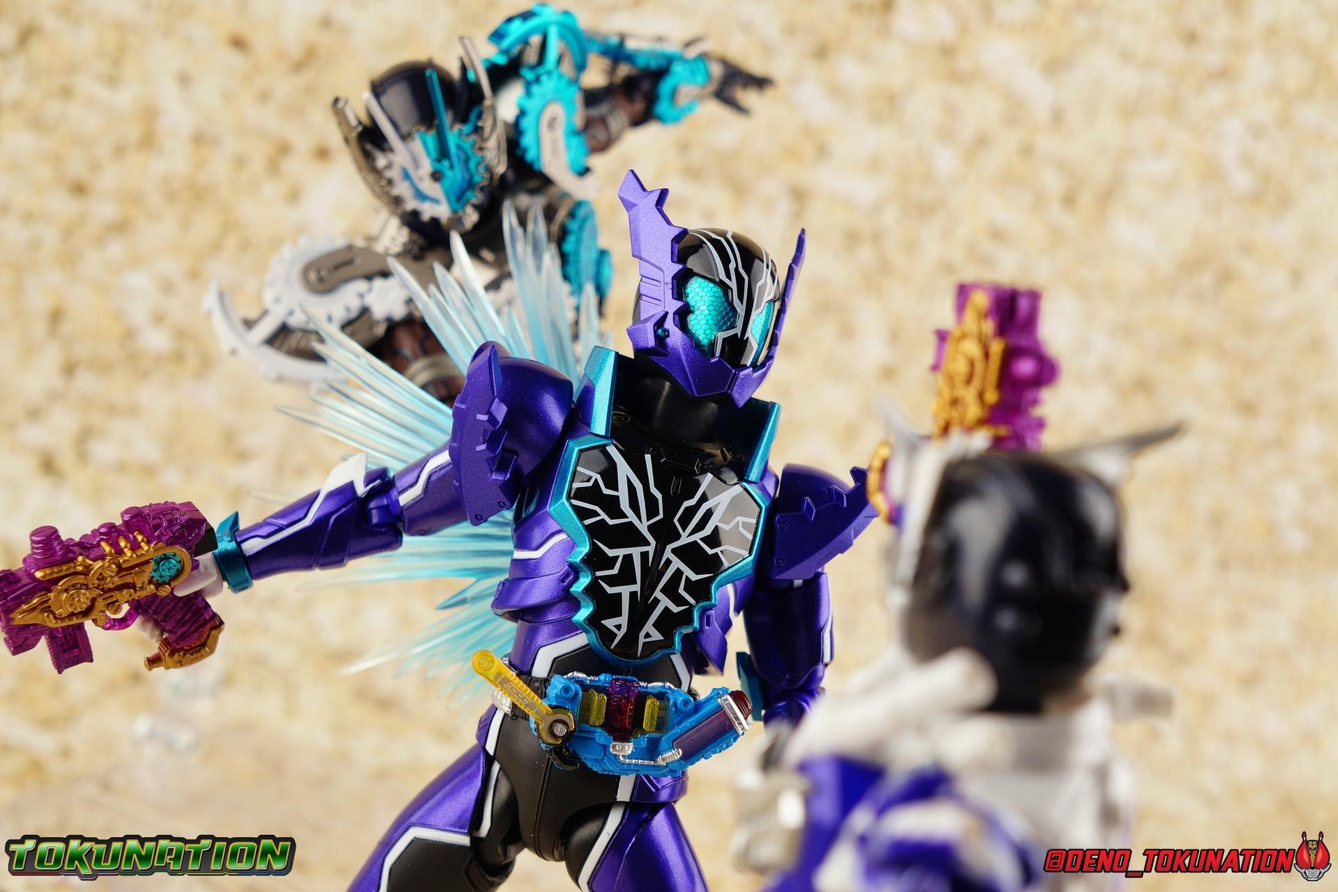 Utsumi Nariaki was one of the Nanba Children. Raised to be loyal to one man only, Juzaburo Nanba, he spent his life in service to his mentor. Loyal until the day Juzaburo was murdered, Utsumi faithfully served. But seeing his master's death at the hands of Kamen Rider Evol pushed him over the edge. With Utsumi's spirit broken, he was faced with the impossible option to take revenge, or serve Evol. Accepting the power of the Evol Driver and rejecting the pain of his grief, Utsumi is reborn as Kamen Rider Mad Rogue! Packaging As with practically all Build releases Mad Rogue has a pleasing two tone package design. Nothing's really changed aside from color choice and stock photos this go around. Main Figure The 4th times the charm right? If you're looking at Kamen Rider Mad Rogue and thinking that he looks pretty familiar, then you'd be right. This is the 4th outing so far of the mold at the core of this figure from Build's lineup. Previously we've seen a lot of this figure through Night Rogue, Blood Stalk, and of course Hell Bros. So you know what to expect out of a lot of this mold. That being said, I think this may be the best version of it released yet. Much like Night Rogue, Mad Rogue has an under suit that is ostensibly black, but upon closer inspection looks to be a dark dark blue instead. So far, Hell Bros is the only release that's used the brown suit parts. Now one of the few flaws I originally found with the mold, was the ankle design. Because of the way the cuff of the shin armor comes down around them, you do lose a small portion of movement in all directions. But the ankle ball is also designed in such a way that you can't really angle the feet outward properly. It's still a bother but it still works well enough too. Despite appearances, the bulk of the thighs doesn't impede leg movement either. As with the others, this figure can pose with the best. As before with this mold, I recommend you definitely pull the hips down far enough before moving them up, if you don't then the waist armor can dig some small grooves into the hips. The hips on this release are quite tight as well. This release of the mold also features the first driver attached to it, as well as the first release of Evol Driver itself. While the just announced Kamen Rider Evol will also feature this Driver, Mad Rogue is the first physical release of it in this line. A lavish repaint of the Build Driver in Gold, Red, & blue and features two new Full Bottles. The Bat & Engine Bottles. Both are removable as with any version of this mold and can interact with any accessory in the line that accepts them. The really pronounced difference with this release is of course the new molding and colors for the upper body. I should have mentioned the new white shin pads on the legs before, because they really help break up all that black as well, and tie it all together. While the upper body is hugely different, it shares so much with Night Rogue. Nearly all the parts are physically identical, but in a radically different paint scheme. And I can't be the only one who sees Mad Rogue and thinks he looks an awful lot like Transformers G2 Blast Off right? Anyways, the lower torso is the same part as what's featured on night rogue. In this instance the cables running around the ribs are left black, while the ab section is painted silver letting it stand out a bit more. The chest armor is really gorgeous. Basically the only molded difference is the new grill with the bat emblem that replaces the old gold bat on Night Rogue. But it's that stark difference from black/gold/silver to purple/silver/white that really sells how gorgeous this figure is by comparison. And I was seriously wowed by Night Rogue at the time of release. Mad Rogue has lot's of room to move in his waist and also has the same fluid movement in the upper torso as his mold predecessors. The arms are likewise identical molds, just with the new paint job. I have to say that I thoroughly enjoy the way the purple on white does look like a camouflage pattern. Again it's just amazing the stark difference that a paint job and a few new parts can illustrate. While the bicep swivel works wonderfully the elbow still can only hit about a 90 degree angle. Luckily this release does have the same great shoulder pads as Night Rogue giving him plenty of range that Hell Bros & Blood Stalk did not. The wrist joint is still a bit too close to the wrist cuff so you lose a bit of up and down movement, but ultimately the loss doesn't amount to much of an issue in the end. Finally Mad Rogue has a brand new head that takes inspiration from his mold mate & name sake Night Rogue. While still absolutely portraying a bat theme it's done very differently. Honestly this head has always evoked the look of Kamen Rider Saga from Kiva to me. Between the bat theme and the colors this rider as a whole reminds me of Saga or perhaps even Kiva-La. All in all this figure has turned out wonderfully and I think easily is the most striking and interesting use of the Kaiser/Transteam System body type we've gotten so far. Accessories As with any Build Rider worth their salt, Mad Rogue comes with everything he needs: 1 - Nebula Steam Gun. This is a straight repack of the accessory that Kamen Rider Rogue came with. Which is interesting given the the Hell Bros release included a purposefully different version of the weapon. This also marks the 5th release of this weapon across the line. Night Rogue, Blood Stalk, Rogue, Hell Bros, Mad Rogue. 1 - Steam Blade. A repack of the components that have been included with the Nebula Steam Gun, 5 times now. Use them as a stand alone blade, or the Nebula Steam Gun can still use them in the exact same way, combining to form the Nebula Steam Rifle. 3 - sets of hands. That's a set of open pose hands, 1 for holding the gun, and 1 for holding the blade. Everything you need! Given the late stage appearances of Mad Rogue, his arsenal was pretty focused, so this is a pretty much perfect