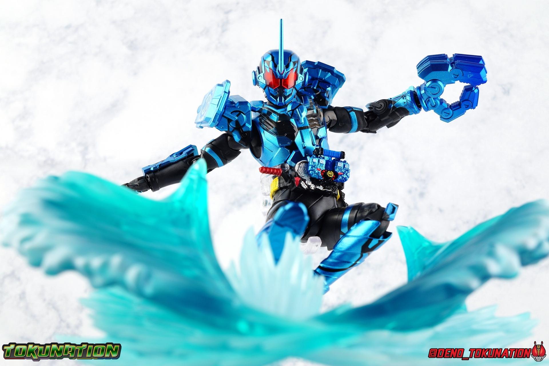 "Damn right I am." Evolt is mere minutes away from total victory, harnessing the power of Pandora's Box & the Lost Bottles, he will consume the Earth and countless more planets. Sento & Banjou must press on to fight him, but standing in their way are clones of the Hokuto Three! With only his life left to give, Kazumi will face his fallen friends one more time. But the power of Grease alone just isn't enough. A parting gift from Sento, Kazumi must wield the deadly Blizzard Knuckle and walk the lonely path of a hero. With frozen fists and an icy resolve, Grease becomes Kamen Rider Grease Blizzard! Packaging As with practically all Build releases Grease Blizzard has a pleasing two tone package design. Nothing's really changed aside from color choice and stock photos this go around. Main figure A big portion of this review will identical to that of my review for the original Grease Figuart. There are some obvious paint and molding differences between the two which I will call attention to, but the bulk of things will be the same. The abrupt difference in color scheme is of course the biggest change. Grease was almost fully painted in a really gorgeous metallic gold, Grease Blizzard tradse this out for a fantastic dark metallic blue. When it hits the right light it really shines like ice on a cold moonlit night. Essentially almos the entire figure is molded in black plastic with blue painted on top of this. This makes the more intricate applications on the shins and shoulders that much more impressive. The finish on this is really excellent, no iffy spots like the first figuart. That said, the body itself is almost totally different. This release, and the show suit, uses Kamen Rider Cross-Z version of the basic suit for it's core. So that means Grease's entire lower body is Cross-Z parts for sure. The legs are the same mold as Cross-Z, having removed the unique parts from build like the rabbit spring. the excellent and far covering paint may obscure this at first but these are Banjou legs and feet through and through. You're going to get exactly the same range of motion out of these legs as you would with Build, Sparkling, Hazard, etc. They work really great and with successive releases it seems joint tightness has been resolved. The waist features a brand new driver for Grease, this is his first outing with a [B]Build Driver.[B] I love the circular nature of upgrades in this show. Ultimately the 3 secondary heroes have all come back to the power of the Build Driver for their most powerful upgrades. Rogue has Prime Rouge and Cross-Z has Cross-Z Evol. Meanwhile Grease had Grease Blizzard as his most powerful form in the TV series, while the upcoming Grease New World film will give him a new final form based on the Build Driver with Kamen Rider Grease Perfect. The Build Driver still remains one of my favorite Figuarts scale devices and thankfully this go around it's also equipped with another new trinket, the Blizzard Knuckle. A very stylish blue repaint of the Magma Knuckle which came with Cross-Z Magma, the Blizzard Knuckle is every bit as removable. It transforms (so to speak) as well. To make a handheld weapon mode for any figure to hold, rotate the handle backwards and pop off the face plates & plug them back on closer to the center. You can also add or remove a Full Bottle as you wish. Pre-installed in the Knuckle is the North Blizzard Full Bottle, a really gorgeous clear blue bottle. Grease Blizzard doesn't come with any other bottles so if you want to do more swapping you'll need to grab another one of you Build family figuarts. As is the option to use the Knuckle in this way gives you lots of photo and posing opportunists, as you can see below. The upper body has an elaborate translucent black robot/mechanical design stretched across it that I really dig. For this release it's a bit darker and compliments the blue of the torso very well The sculpt for this part is very well defined and the black plastic is just the right opacity compared to the original feeling a bit too translucent. The entire torso is an identical sculpt to the first SHF as well. The arms are pretty much the same as well, aside from the new and intricate blue paint apps. The shoulder pads do have a fantastic new airbrushed logo on one of them. While the right pad still features the Robot Full Bottles emlbem, the left now features the North Blizzard Bottle emblem. As before the shoulder pads can fully rotate to recreate Grease's rider kick. Taking the place of Grease's left forearm is a new robotic claw, officially known as the GBZ Demolition One. With fully articulated fingers and nice tight joints this thing works great and has a very firm grip as well as a rotational wrist joint. Ultimately the head is one of the most striking changes for this release. Where the original was beige underneath with a semi-translucent black plastic casing around it, the new one is a darker shade of black but is largely painted over in dark metallic blue. The faceplate is sharp and well defined, but the most striking aspect here is the crimson compound eyes. Just that perfect shade of practically blood red. If this form belonged to any other character I think it would instantly be recognized as a villain. But in Kazumi's hands, it's the form of a cold and calculated warrior. The entire figure comes together flawlessly. If you loved the original Grease you absolutely must own this one. Accessories Despite my love of this form and this figure, this is the aspect where it really falls short. Grease Blizzard comes only with two alternate right hands. While that makes sense given the articulated claw he now has for a left hand, I am disappointed. But on the flip side, there's not really anything this figure could have come with. Much like a similar form that preceeded it (Chaser Mach) Grease Blizzard is a single episode power up. The transformation finishes in the last seconds of episode 46 and it's debut fight and ultimately Grease's death