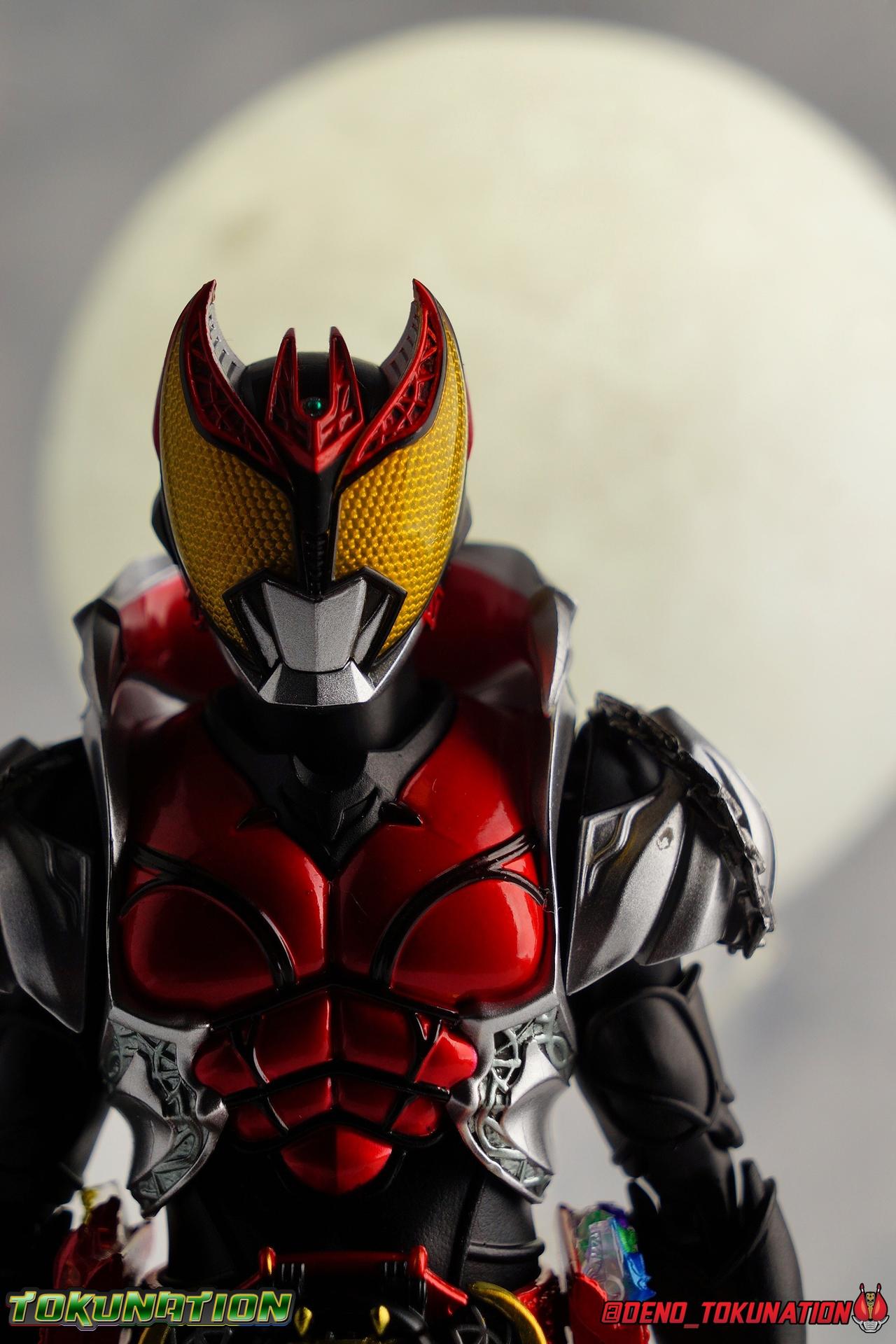 The shy young man Wataru Kurenai would rather spend his time crafting violins as his father Otoya did in life. But given that he's the son of the Fangire Queen as well, he was destined to become Kamen Rider Kiva, the Fangire King. And like the King's before him Wataru has one trusted partner, a member of the Kivat family, Kivat Bat III. With Kivat in tow, Wataru sets out to fight Fangires and protect humanity, just as his father did 20 years prior. But can Wataru overcome the fear and anxiety that have haunted him his entire life? Can he break the chains of his own fate and save the world? With a host of friends, family, and allies along the way, the history of Kiva and the Fangire plays out, across the past & present! It's time to break the chains and bust out a long awaited brand new gallery from Kamen Rider Kiva! S.H. Figuarts collectors have waited with baited breath for years, and years, for Tamashii Nations to finally deliver on the promise of Kiva. Well it may have taken until the end of the Heisei Era but he's finally here and we couldn't be more excited to share a proper review of S.H. Figuarts Shinkocchou Seihou Kamen Rider Kiva! ** This gallery contains 100 images, and is spread across the first three posts of this thread. Skip below to see the good stuff if you like! Packaging It's the familiar Shinkocchou Seihou slip cover box once again! Not much can be said about it this time that hasn't been said before. While it hasn't really changed, maintaining the same basic form factor with every single release, it's still a pleasing type of uniform collector's box thats great for storage. It's just great to finally see one of these boxes with Kiva's art adorning it! Main Figure It's been some time since the last new mold joined the Shinkocchou Seihou line. In fact Seihou Wizard was the last brand new mold the line gave us and that was last year. Since then we've had a few remolds/repaints but Kiva is the first truly new figure in a while. And with the Seihou line in particular, that always brings huge levels of excitement, and big expectations. How does the long awaited king stack up? Find out below! Kiva is an incredible addition to the line. I've said this many times with Shinkocchou Seihou releases in the past, but this one truly looks like it walked off the screen. It's an absolutely stunning recreation. From an engineering standpoint I'd say it's one of the best as well. The W mold was my long time favorite from the line, Rider 1 really upped the ante, and Wizard was an absolute delight. While I'm not sure that Kiva necessarily blows any of the other releases away, it is remarkably nice. Starting with Kiva's feet and legs, they provide a very solid base of support. The asymmetrical design of his right leg has always struck me as well, the chains always draw my attention. It's just such a unique look that sticks with you, much like how I've always loved Kamen Rider Kickhopper's leg design. For their part, these chains are molded in place but have some minor flexibility to them so that you can hopefully avoid litearlly breaking them. Kiva's toe bends function properly on both feet despite the bulk of the chains on one and the ankle tilts seem to be pretty even as well. Always good to see asymmetry that somehow still leads to symmetrical articulation cuts. The knee bends leave a little to be desired, coming out to about a 45 degree angle, but the hips make up for this shortcoming with a wealth of range. Which is totally necessary to recreate that iconic kick pose of Kiva's. Kiva's waist in it's dormant state out of box is just the red Kibuckle belt which holds his driver and trinkets. Fun fact, Kiva's belt was actually the final Heisei henshin belt to not be called a "Driver". From Decade on we've had nothing but Drivers. You'll need to grab the 6 individual Fuestels and 2 Fuestel holders included with Kiva and attach them to the sides of the belt to get his hips looking right. The big thing here of course is really the second star of the Kiva show, Kivat Bat III! The talkative sidekick to Watar Kurenai, Kivat also allows him to transform into Kamen Rider Kiva. On his own, Kivat is a tiny but slightly poseable bat. The ends of his wings can rotate up to simulate flight while his mouth opens to simulate his speech as well as to accept Fuestles. A small tamashii stage adapter is included to let you display Kivat flying around Kiva as well. To get him on the belt just plug his feet over the bar along the top of the belt and rotate him down, plugging him in place. He can still accept Fuestels in this state as well, plenty of clearance for the mouth to open. Kiva's upper body does some really interesting things that I appreciate too. The red armor that makes up his chest extends down around the ab area of the figure. Despite appearing to be one piece, the lower section actually sits under the chest and is independently articulated. As you push the torso down towards the waist, arching the back, the abs push up into the chest. This increases the range of movement and makes for more natural articulation as well. If you straighten the torso back out, you can see where th e tip of this ab armor is sort of tucked up into the chest and there's a small gap, pushing it back down seamlessly fills the torso once more. It's really genius. Likewise the figure's back also tries something interesting. The entire chunk of armor that makes up the collar around Kiva's neck and the armor extending down his back, is on it's own sort of raised joint that allows it to lift up from the back & shoulders. This gives the figure an interesting clearance extension. It's unnecessary, kind of bizarre, but really cool and appreciated. While side to side torso movement may be hindered somewhat by the silver armor around Kiva's ribs, it's hard to deny just how good and seamless the entire upper body looks. At first glance every bit of it look likes one piece, but there's so much complexity involved. I was worried tha
