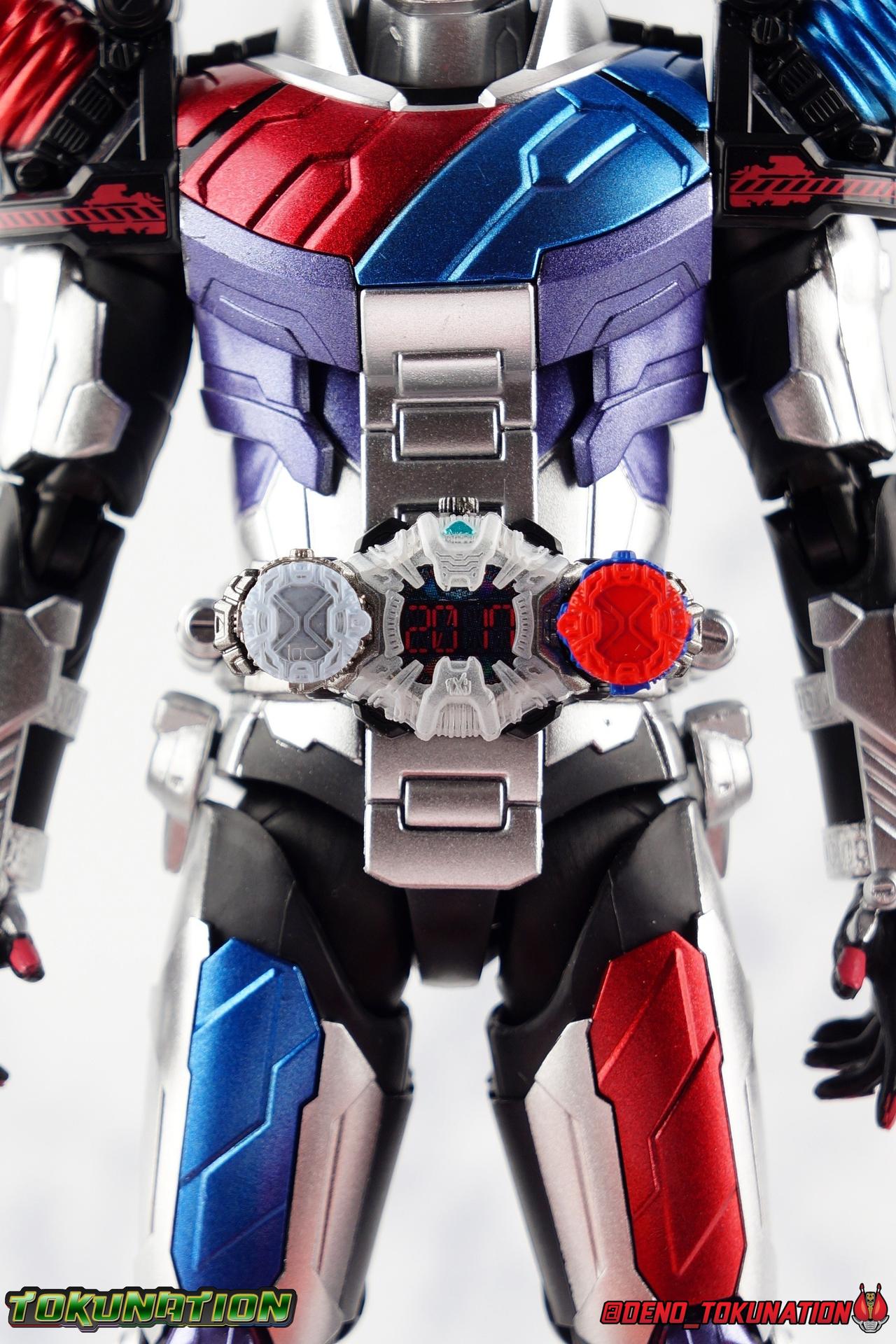 Before he can eventually become the overlord of time Oma Zi-O, Sougo Tokiwa must first inherit the powers of the Heisei Riders who have come before him! Kamen Rider Build, is gone. And to defeat Another Build Sougo must grasp the power of Sento Kiryu for himself and wear the armor of Build. It's Rider Time in our latest Kamen Rider Zi-O gallery with the Build Armor! This is the first of Zi-O's power ups to join the line and we couldn't be more excited to finally have it in hand. Between this and the simultaneously released Geiz GenM Armor, we're pretty excited for the prospect of future figuarts from the series. Related Galleries: Kamen Rider Zi-O, Kamen Rider Build Rabbit/Tank Form. Packaging Taking it's design cues from Kamen Rider Zi-O's packaging, Zi-O Build Armor box features that now iconic 20 rider kicks style of box. Featuring the year the Armor is from (2017) and a splash of blue & red, the Build Armor really pops in it's official photos. It's a basic and very pleasing to the eyes. Main Figure Zi-O Build Armor comes from the earliest parts of Zi-O, and as such is really a form that plays it safe. As the first Rider Armor it comes across as quite basic, but ultimately very charming. And the standard armor application it used for the legs torso and arms, would be a pattern used to design some in-show forms as well as numerous artwork/toy only ones that never made their proper appearances. You can see basic elements of it present in Kuuga, Agito, Ryuki, Blade, Hibiki, Kabuto, Den-O, & Kiva Armors. With elements peppered through out some of the others. I would hope this means we could see more of these as Figuarts down the line, but who knows. Honestly the easiest one at this point would be Zi-O Kuuga Armor as it's a very easy remold of the Build Armor. In any case this is clearly the perfect armor to kick off Zi-O's line of numerous power-ups for the S.H. Figuarts line-up. At first glance Build Armor appears to be very mechanical and bulky, seemingly not very dynamic because of these qualities. Shocking even myself, it's astonishingly well articulated. Honestly the articulation layout is basically that of standard Zi-O, as the two are more or less the same mold with the top layers of armor and molding being the big difference, but somehow I feel like the way Build Armor can move is actually a bit nicer. Like Zi-O, the Build Armor can execute wide and stable poses thanks in no small part to the feet. In this case the feet are a bit wider and thicker, covering more ground and just making this figure solidly stable. The perfect toe bends accent this, and while the ankles have minor limitations because of the skirt around them, they just work incredibly well. The extra layer of armor on the legs doesn't considerably bulk anything up to impact articulation, in fact it's hardly noticeable. So you manage to get the same great hips, and knees that can still hit about a 45 degree angle. As with base Zi-O & Geiz, Build Armor comes with the Ziku Driver attached. At the scale this figure is, the Ziku Driver still manages to be one of the better and more functional Drivers out there. The Driver itself can rotate a full 360 degrees like the show prop and DX toy. The read out is permanently set to the year 2017, the year Sougo traveled to in order to obtain Build's power. Each side of the Driver can however accept a Ridewatch. The left facing side of the driver comes with the Zi-O Ridewatch pre-set. As with all the ride watches attached to this figure, none of them have properly painted rider faces. Each opts for a simple base paint job, though the details of proper watches are sculpted very nicely into each face. And like base Zi-O, the only watch molded in active positions are those already attached to the Driver. The 4 wrist mounted watches are dormant blanks, which make sense given that Build Armor was Zi-O's first power-up. At that time he didn't have any other ride watches. Though one should theoretically be the Ride Striker watch. On the right facing side of the Driver however is an active Build Ridewatch. This is great because the Build watch that came with base Zi-O was dormant. If you pop this one off the Driver and give it Zi-O then you can properly simulate his transformation to Build Armor. A very nice, minor detail that I appreciate. Also of minor note, the new Build watch also seems to have a different red paint application to the face of it, allowing a bit more light to shine through from the back of the watch now. While focused on the waist I want to talk about the small pieces of hip armor on either side of Build. I was certain these would impact posing but was pleasantly surprised to see that they fully rotate! Believe it or not, that upper body is almost entirely just normal Zi-O. The layer of armor on top is really just an aesthetic change. The ab section with the watch band is nigh identical. The upper body has merely been remolded to reflect Build's two tone nature. Though I do appreciate that these chest parts have the same lines molded into them facing out that Build himself did. Articulation will be identical to the first Zi-O here though it feels a bit more free and loose in a good way. the side to side motion of the upper body in particular just feels really good. The arms do actually have a bit more bulk to them thanks to the armor. New silver armor accents the Ridewatch holsters and biceps. While very nicely sculpted ornamental Rabbit & Tank Full Bottles adorn the shoulders! These are probably the most surprising bit about the figure, I fully expected these shoulders to kill the articulation, but they really just don't. As with so many figuarts they're on a hinge which slides down and out enough to accommodate the inward and upward motion of the actual shoulder joint. You don't really lose anything from these shoulders at all even compared to regular Zi-O. I'd like to mention that I am very much into the armored look the hands now have. The index and middle finger ha