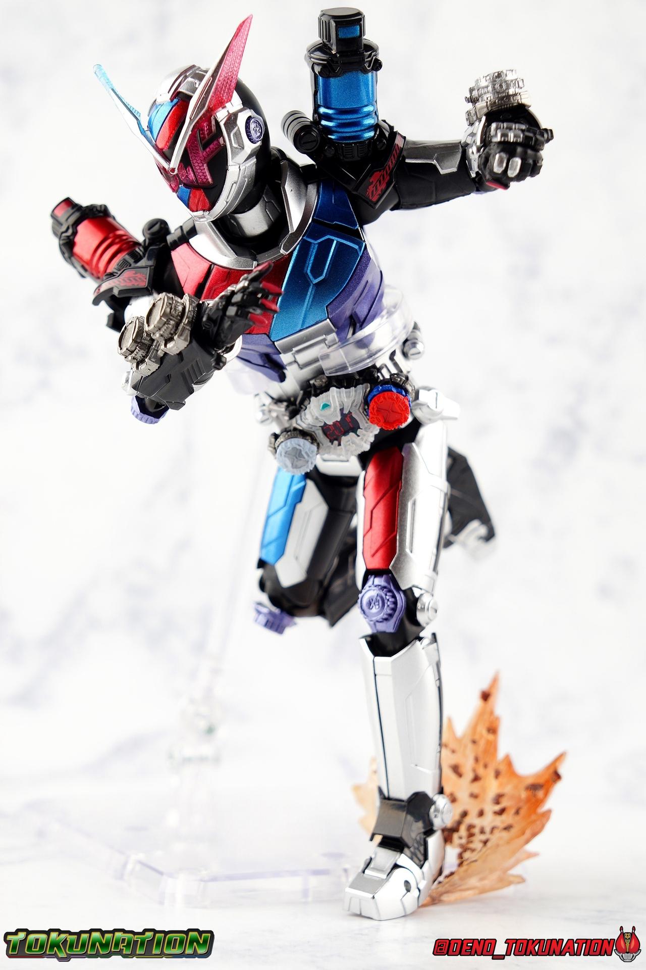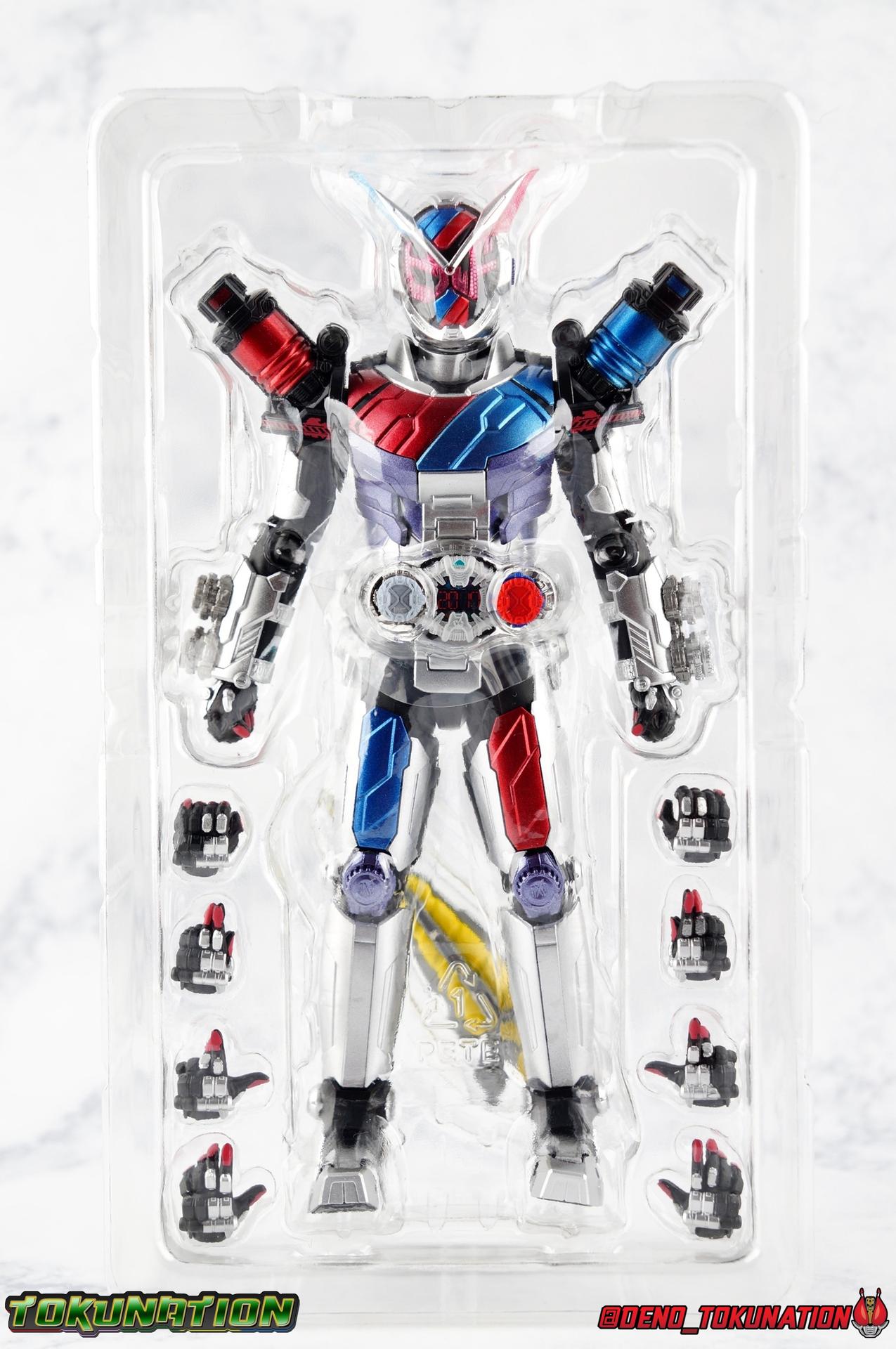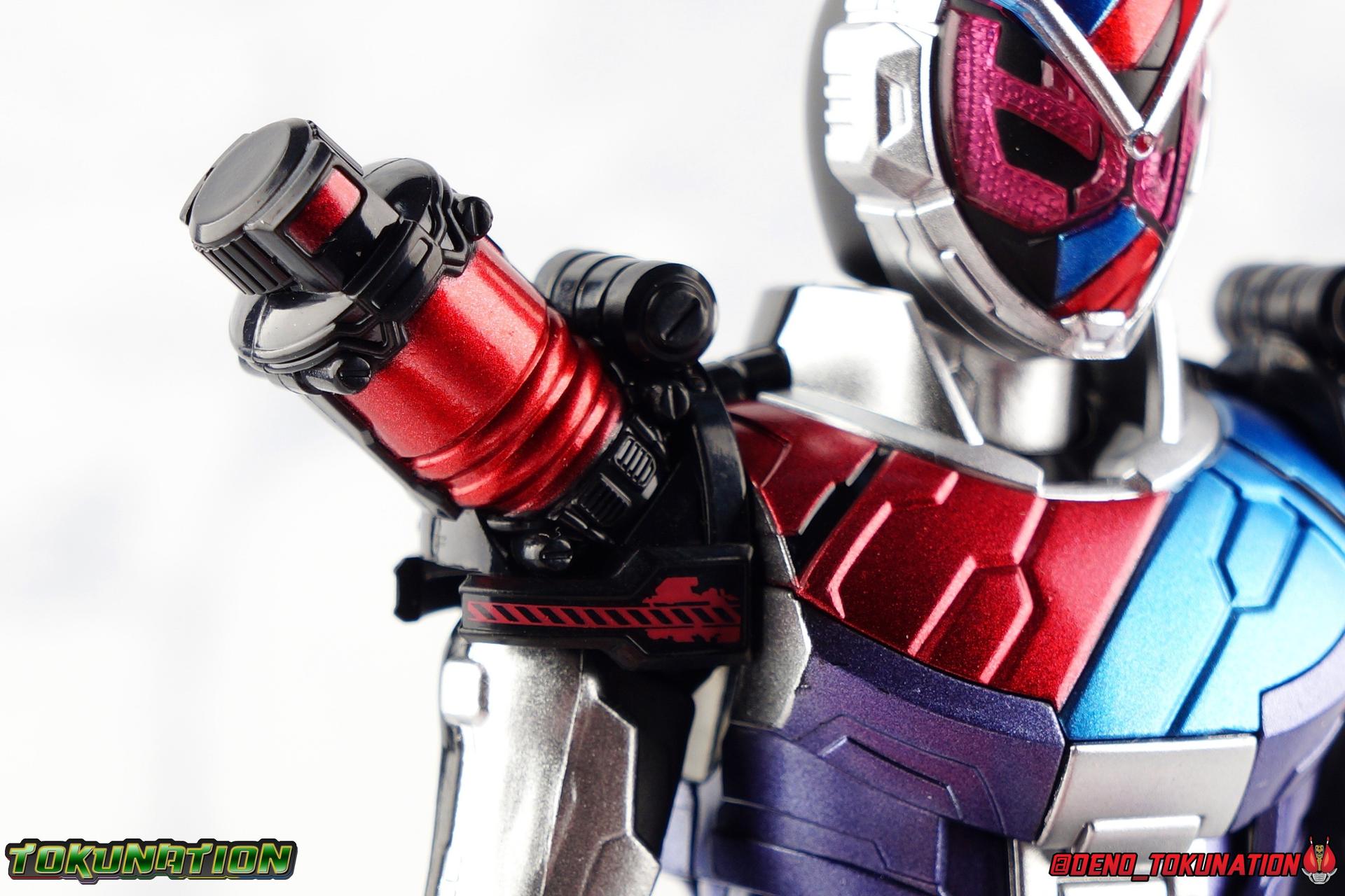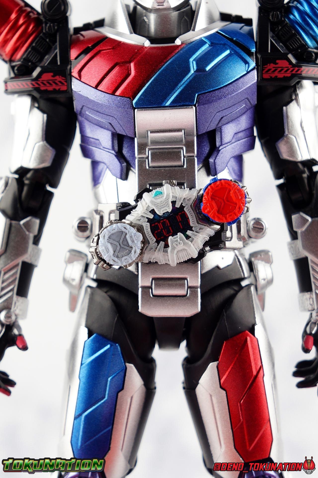 Before he can eventually become the overlord of time Oma Zi-O, Sougo Tokiwa must first inherit the powers of the Heisei Riders who have come before him! Kamen Rider Build, is gone. And to defeat Another Build Sougo must grasp the power of Sento Kiryu for himself and wear the armor of Build. It's Rider Time in our latest Kamen Rider Zi-O gallery with the Build Armor! This is the first of Zi-O's power ups to join the line and we couldn't be more excited to finally have it in hand. Between this and the simultaneously released Geiz GenM Armor, we're pretty excited for the prospect of future figuarts from the series. Related Galleries: Kamen Rider Zi-O, Kamen Rider Build Rabbit/Tank Form. Packaging Taking it's design cues from Kamen Rider Zi-O's packaging, Zi-O Build Armor box features that now iconic 20 rider kicks style of box. Featuring the year the Armor is from (2017) and a splash of blue & red, the Build Armor really pops in it's official photos. It's a basic and very pleasing to the eyes. Main Figure Zi-O Build Armor comes from the earliest parts of Zi-O, and as such is really a form that plays it safe. As the first Rider Armor it comes across as quite basic, but ultimately very charming. And the standard armor application it used for the legs torso and arms, would be a pattern used to design some in-show forms as well as numerous artwork/toy only ones that never made their proper appearances. You can see basic elements of it present in Kuuga, Agito, Ryuki, Blade, Hibiki, Kabuto, Den-O, & Kiva Armors. With elements peppered through out some of the others. I would hope this means we could see more of these as Figuarts down the line, but who knows. Honestly the easiest one at this point would be Zi-O Kuuga Armor as it's a very easy remold of the Build Armor. In any case this is clearly the perfect armor to kick off Zi-O's line of numerous power-ups for the S.H. Figuarts line-up. At first glance Build Armor appears to be very mechanical and bulky, seemingly not very dynamic because of these qualities. Shocking even myself, it's astonishingly well articulated. Honestly the articulation layout is basically that of standard Zi-O, as the two are more or less the same mold with the top layers of armor and molding being the big difference, but somehow I feel like the way Build Armor can move is actually a bit nicer. Like Zi-O, the Build Armor can execute wide and stable poses thanks in no small part to the feet. In this case the feet are a bit wider and thicker, covering more ground and just making this figure solidly stable. The perfect toe bends accent this, and while the ankles have minor limitations because of the skirt around them, they just work incredibly well. The extra layer of armor on the legs doesn't considerably bulk anything up to impact articulation, in fact it's hardly noticeable. So you manage to get the same great hips, and knees that can still hit about a 45 degree angle. As with base Zi-O & Geiz, Build Armor comes with the Ziku Driver attached. At the scale this figure is, the Ziku Driver still manages to be one of the better and more functional Drivers out there. The Driver itself can rotate a full 360 degrees like the show prop and DX toy. The read out is permanently set to the year 2017, the year Sougo traveled to in order to obtain Build's power. Each side of the Driver can however accept a Ridewatch. The left facing side of the driver comes with the Zi-O Ridewatch pre-set. As with all the ride watches attached to this figure, none of them have properly painted rider faces. Each opts for a simple base paint job, though the details of proper watches are sculpted very nicely into each face. And like base Zi-O, the only watch molded in active positions are those already attached to the Driver. The 4 wrist mounted watches are dormant blanks, which make sense given that Build Armor was Zi-O's first power-up. At that time he didn't have any other ride watches. Though one should theoretically be the Ride Striker watch. On the right facing side of the Driver however is an active Build Ridewatch. This is great because the Build watch that came with base Zi-O was dormant. If you pop this one off the Driver and give it Zi-O then you can properly simulate his transformation to Build Armor. A very nice, minor detail that I appreciate. Also of minor note, the new Build watch also seems to have a different red paint application to the face of it, allowing a bit more light to shine through from the back of the watch now. While focused on the waist I want to talk about the small pieces of hip armor on either side of Build. I was certain these would impact posing but was pleasantly surprised to see that they fully rotate! Believe it or not, that upper body is almost entirely just normal Zi-O. The layer of armor on top is really just an aesthetic change. The ab section with the watch band is nigh identical. The upper body has merely been remolded to reflect Build's two tone nature. Though I do appreciate that these chest parts have the same lines molded into them facing out that Build himself did. Articulation will be identical to the first Zi-O here though it feels a bit more free and loose in a good way. the side to side motion of the upper body in particular just feels really good. The arms do actually have a bit more bulk to them thanks to the armor. New silver armor accents the Ridewatch holsters and biceps. While very nicely sculpted ornamental Rabbit & Tank Full Bottles adorn the shoulders! These are probably the most surprising bit about the figure, I fully expected these shoulders to kill the articulation, but they really just don't. As with so many figuarts they're on a hinge which slides down and out enough to accommodate the inward and upward motion of the actual shoulder joint. You don't really lose anything from these shoulders at all even compared to regular Zi-O. I'd like to mention that I am very much into the armored look the hands now have. The index and middle finger ha