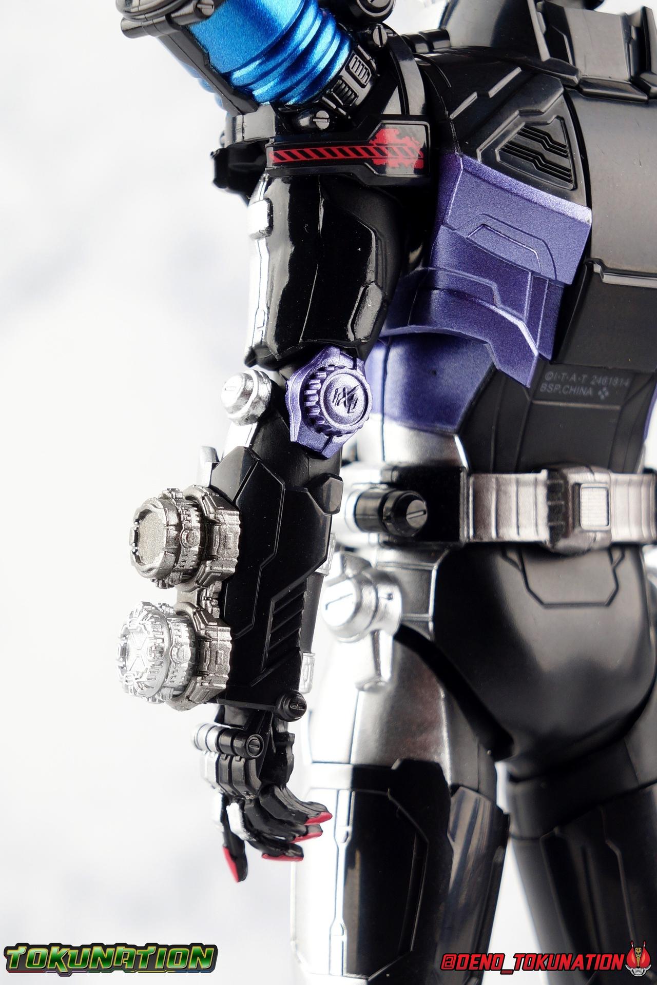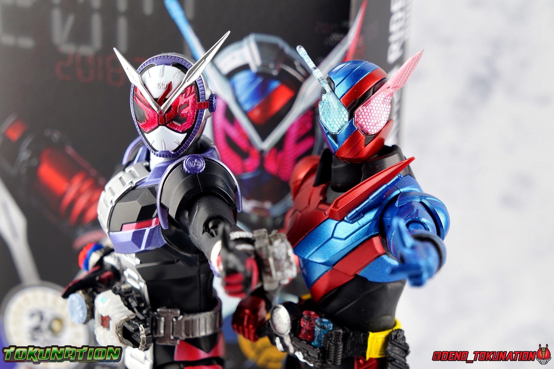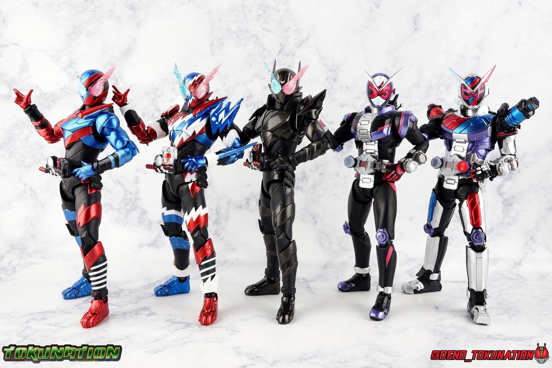 Before he can eventually become the overlord of time Oma Zi-O, Sougo Tokiwa must first inherit the powers of the Heisei Riders who have come before him! Kamen Rider Build, is gone. And to defeat Another Build Sougo must grasp the power of Sento Kiryu for himself and wear the armor of Build. It's Rider Time in our latest Kamen Rider Zi-O gallery with the Build Armor! This is the first of Zi-O's power ups to join the line and we couldn't be more excited to finally have it in hand. Between this and the simultaneously released Geiz GenM Armor, we're pretty excited for the prospect of future figuarts from the series. Related Galleries: Kamen Rider Zi-O, Kamen Rider Build Rabbit/Tank Form. Packaging Taking it's design cues from Kamen Rider Zi-O's packaging, Zi-O Build Armor box features that now iconic 20 rider kicks style of box. Featuring the year the Armor is from (2017) and a splash of blue & red, the Build Armor really pops in it's official photos. It's a basic and very pleasing to the eyes. Main Figure Zi-O Build Armor comes from the earliest parts of Zi-O, and as such is really a form that plays it safe. As the first Rider Armor it comes across as quite basic, but ultimately very charming. And the standard armor application it used for the legs torso and arms, would be a pattern used to design some in-show forms as well as numerous artwork/toy only ones that never made their proper appearances. You can see basic elements of it present in Kuuga, Agito, Ryuki, Blade, Hibiki, Kabuto, Den-O, & Kiva Armors. With elements peppered through out some of the others. I would hope this means we could see more of these as Figuarts down the line, but who knows. Honestly the easiest one at this point would be Zi-O Kuuga Armor as it's a very easy remold of the Build Armor. In any case this is clearly the perfect armor to kick off Zi-O's line of numerous power-ups for the S.H. Figuarts line-up. At first glance Build Armor appears to be very mechanical and bulky, seemingly not very dynamic because of these qualities. Shocking even myself, it's astonishingly well articulated. Honestly the articulation layout is basically that of standard Zi-O, as the two are more or less the same mold with the top layers of armor and molding being the big difference, but somehow I feel like the way Build Armor can move is actually a bit nicer. Like Zi-O, the Build Armor can execute wide and stable poses thanks in no small part to the feet. In this case the feet are a bit wider and thicker, covering more ground and just making this figure solidly stable. The perfect toe bends accent this, and while the ankles have minor limitations because of the skirt around them, they just work incredibly well. The extra layer of armor on the legs doesn't considerably bulk anything up to impact articulation, in fact it's hardly noticeable. So you manage to get the same great hips, and knees that can still hit about a 45 degree angle. As with base Zi-O & Geiz, Build Armor comes with the Ziku Driver attached. At the scale this figure is, the Ziku Driver still manages to be one of the better and more functional Drivers out there. The Driver itself can rotate a full 360 degrees like the show prop and DX toy. The read out is permanently set to the year 2017, the year Sougo traveled to in order to obtain Build's power. Each side of the Driver can however accept a Ridewatch. The left facing side of the driver comes with the Zi-O Ridewatch pre-set. As with all the ride watches attached to this figure, none of them have properly painted rider faces. Each opts for a simple base paint job, though the details of proper watches are sculpted very nicely into each face. And like base Zi-O, the only watch molded in active positions are those already attached to the Driver. The 4 wrist mounted watches are dormant blanks, which make sense given that Build Armor was Zi-O's first power-up. At that time he didn't have any other ride watches. Though one should theoretically be the Ride Striker watch. On the right facing side of the Driver however is an active Build Ridewatch. This is great because the Build watch that came with base Zi-O was dormant. If you pop this one off the Driver and give it Zi-O then you can properly simulate his transformation to Build Armor. A very nice, minor detail that I appreciate. Also of minor note, the new Build watch also seems to have a different red paint application to the face of it, allowing a bit more light to shine through from the back of the watch now. While focused on the waist I want to talk about the small pieces of hip armor on either side of Build. I was certain these would impact posing but was pleasantly surprised to see that they fully rotate! Believe it or not, that upper body is almost entirely just normal Zi-O. The layer of armor on top is really just an aesthetic change. The ab section with the watch band is nigh identical. The upper body has merely been remolded to reflect Build's two tone nature. Though I do appreciate that these chest parts have the same lines molded into them facing out that Build himself did. Articulation will be identical to the first Zi-O here though it feels a bit more free and loose in a good way. the side to side motion of the upper body in particular just feels really good. The arms do actually have a bit more bulk to them thanks to the armor. New silver armor accents the Ridewatch holsters and biceps. While very nicely sculpted ornamental Rabbit & Tank Full Bottles adorn the shoulders! These are probably the most surprising bit about the figure, I fully expected these shoulders to kill the articulation, but they really just don't. As with so many figuarts they're on a hinge which slides down and out enough to accommodate the inward and upward motion of the actual shoulder joint. You don't really lose anything from these shoulders at all even compared to regular Zi-O. I'd like to mention that I am very much into the armored look the hands now have. The index and middle finger ha