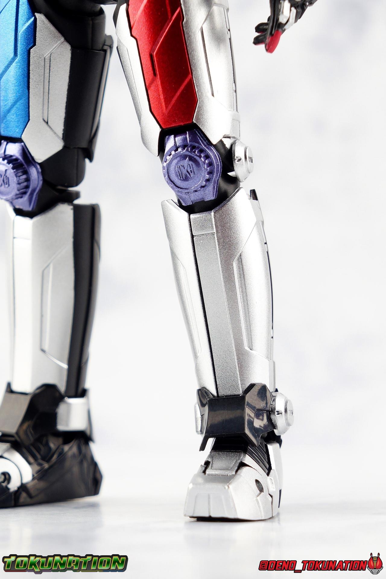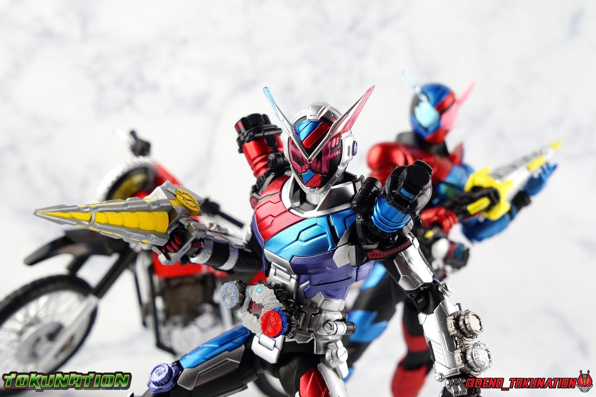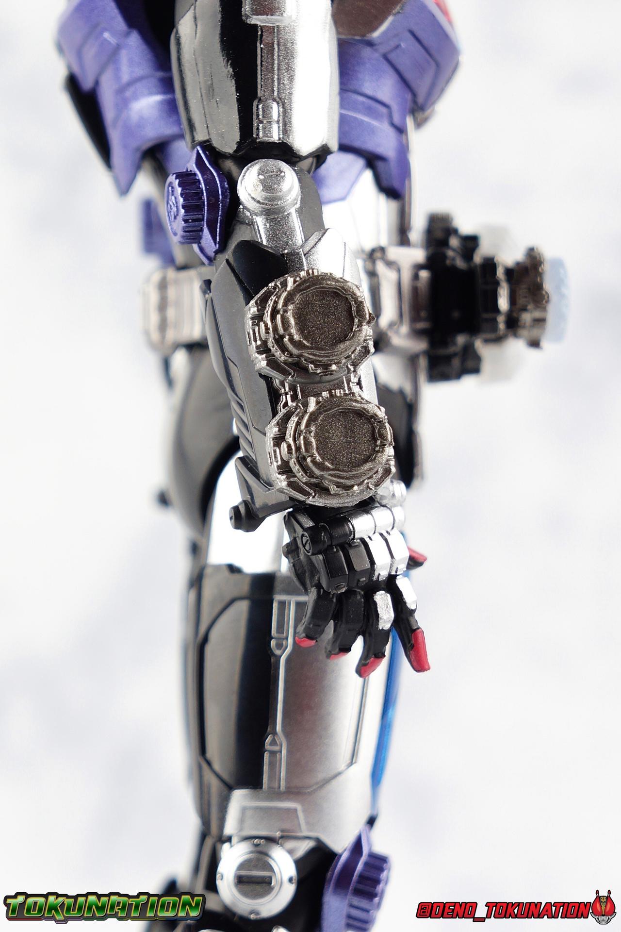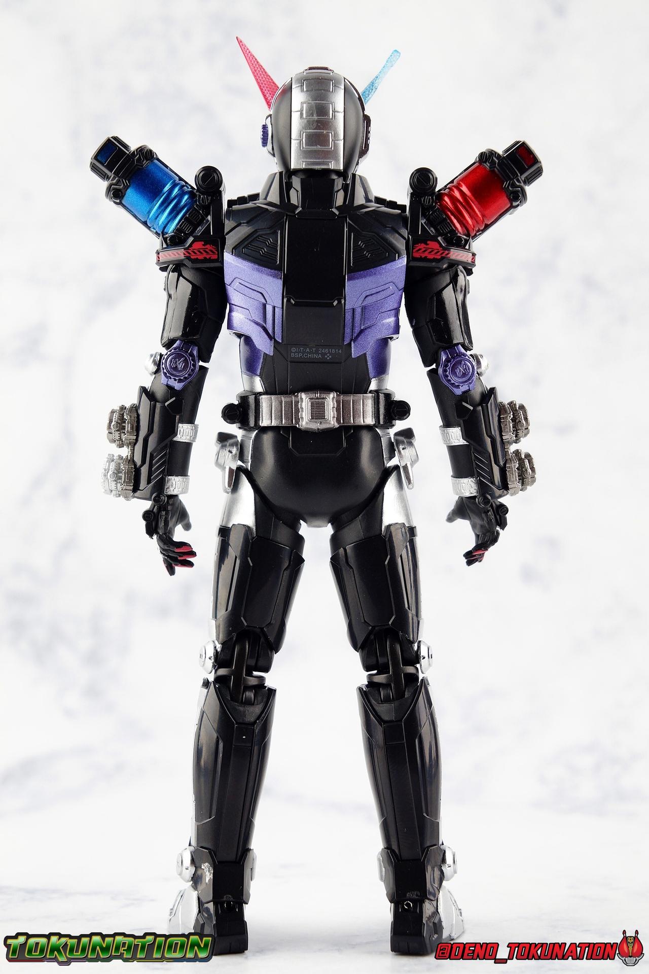 Before he can eventually become the overlord of time Oma Zi-O, Sougo Tokiwa must first inherit the powers of the Heisei Riders who have come before him! Kamen Rider Build, is gone. And to defeat Another Build Sougo must grasp the power of Sento Kiryu for himself and wear the armor of Build. It's Rider Time in our latest Kamen Rider Zi-O gallery with the Build Armor! This is the first of Zi-O's power ups to join the line and we couldn't be more excited to finally have it in hand. Between this and the simultaneously released Geiz GenM Armor, we're pretty excited for the prospect of future figuarts from the series. Related Galleries: Kamen Rider Zi-O, Kamen Rider Build Rabbit/Tank Form. Packaging Taking it's design cues from Kamen Rider Zi-O's packaging, Zi-O Build Armor box features that now iconic 20 rider kicks style of box. Featuring the year the Armor is from (2017) and a splash of blue & red, the Build Armor really pops in it's official photos. It's a basic and very pleasing to the eyes. Main Figure Zi-O Build Armor comes from the earliest parts of Zi-O, and as such is really a form that plays it safe. As the first Rider Armor it comes across as quite basic, but ultimately very charming. And the standard armor application it used for the legs torso and arms, would be a pattern used to design some in-show forms as well as numerous artwork/toy only ones that never made their proper appearances. You can see basic elements of it present in Kuuga, Agito, Ryuki, Blade, Hibiki, Kabuto, Den-O, & Kiva Armors. With elements peppered through out some of the others. I would hope this means we could see more of these as Figuarts down the line, but who knows. Honestly the easiest one at this point would be Zi-O Kuuga Armor as it's a very easy remold of the Build Armor. In any case this is clearly the perfect armor to kick off Zi-O's line of numerous power-ups for the S.H. Figuarts line-up. At first glance Build Armor appears to be very mechanical and bulky, seemingly not very dynamic because of these qualities. Shocking even myself, it's astonishingly well articulated. Honestly the articulation layout is basically that of standard Zi-O, as the two are more or less the same mold with the top layers of armor and molding being the big difference, but somehow I feel like the way Build Armor can move is actually a bit nicer. Like Zi-O, the Build Armor can execute wide and stable poses thanks in no small part to the feet. In this case the feet are a bit wider and thicker, covering more ground and just making this figure solidly stable. The perfect toe bends accent this, and while the ankles have minor limitations because of the skirt around them, they just work incredibly well. The extra layer of armor on the legs doesn't considerably bulk anything up to impact articulation, in fact it's hardly noticeable. So you manage to get the same great hips, and knees that can still hit about a 45 degree angle. As with base Zi-O & Geiz, Build Armor comes with the Ziku Driver attached. At the scale this figure is, the Ziku Driver still manages to be one of the better and more functional Drivers out there. The Driver itself can rotate a full 360 degrees like the show prop and DX toy. The read out is permanently set to the year 2017, the year Sougo traveled to in order to obtain Build's power. Each side of the Driver can however accept a Ridewatch. The left facing side of the driver comes with the Zi-O Ridewatch pre-set. As with all the ride watches attached to this figure, none of them have properly painted rider faces. Each opts for a simple base paint job, though the details of proper watches are sculpted very nicely into each face. And like base Zi-O, the only watch molded in active positions are those already attached to the Driver. The 4 wrist mounted watches are dormant blanks, which make sense given that Build Armor was Zi-O's first power-up. At that time he didn't have any other ride watches. Though one should theoretically be the Ride Striker watch. On the right facing side of the Driver however is an active Build Ridewatch. This is great because the Build watch that came with base Zi-O was dormant. If you pop this one off the Driver and give it Zi-O then you can properly simulate his transformation to Build Armor. A very nice, minor detail that I appreciate. Also of minor note, the new Build watch also seems to have a different red paint application to the face of it, allowing a bit more light to shine through from the back of the watch now. While focused on the waist I want to talk about the small pieces of hip armor on either side of Build. I was certain these would impact posing but was pleasantly surprised to see that they fully rotate! Believe it or not, that upper body is almost entirely just normal Zi-O. The layer of armor on top is really just an aesthetic change. The ab section with the watch band is nigh identical. The upper body has merely been remolded to reflect Build's two tone nature. Though I do appreciate that these chest parts have the same lines molded into them facing out that Build himself did. Articulation will be identical to the first Zi-O here though it feels a bit more free and loose in a good way. the side to side motion of the upper body in particular just feels really good. The arms do actually have a bit more bulk to them thanks to the armor. New silver armor accents the Ridewatch holsters and biceps. While very nicely sculpted ornamental Rabbit & Tank Full Bottles adorn the shoulders! These are probably the most surprising bit about the figure, I fully expected these shoulders to kill the articulation, but they really just don't. As with so many figuarts they're on a hinge which slides down and out enough to accommodate the inward and upward motion of the actual shoulder joint. You don't really lose anything from these shoulders at all even compared to regular Zi-O. I'd like to mention that I am very much into the armored look the hands now have. The index and middle finger ha