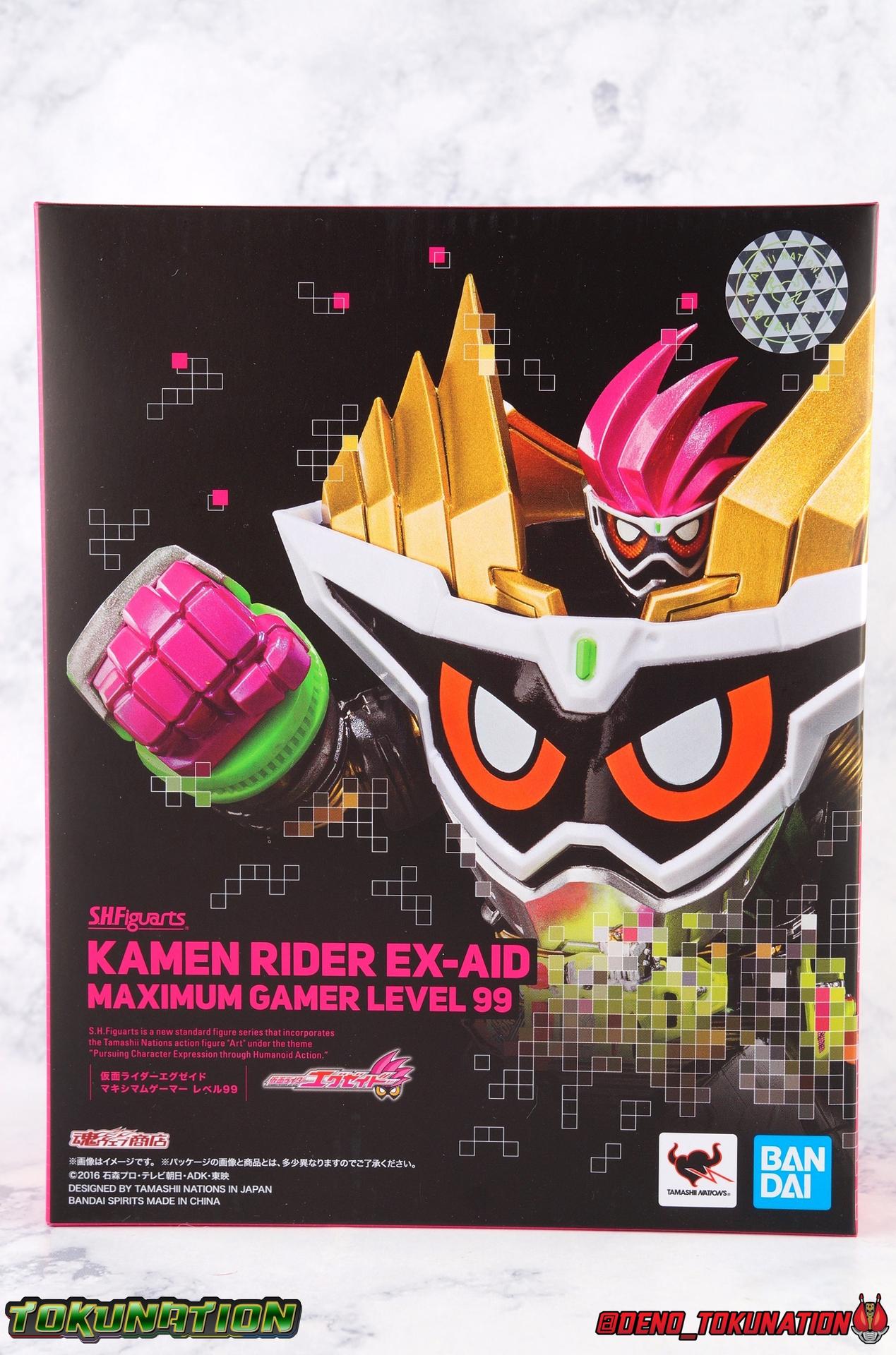 Seeking to complete Kamen Rider Chronicle, Kuroto Dan wreaks havoc once again as the Dangerous Zombie. But a parting gift from the deceased Kiriya Kujo, could be the key to stopping him. A new Gashat with the ability to reprogram the Bugster Virus can only be used by one person, the very source of the virus itself, Emu Hojo! Entrusted with the fate of humanity by Lazer, Ex-Aid must reach the maximum level with the strongest body to take on the immortal GenM. The Maximum Mighty Gamer arrives at last as Ex-Aid reaches Level 99! Packaging Shocking all of us, Ex-Aid Level 99 has finally been released! In an appropriately hefty and powerfully colorful box, Level 99 is a welcome sight after being superseded by the the release of GenM Level Billion. Main Figure Last time around with this mold, we got the odd release of GenM Level Billion. A "pre-paint" as I like to call him, Level Billion was revealed after Level 99, but released well before it. Because of the monumental difference in popularity for the character of Kuroto Dan vs Emu Hojo and the then recent Ex-Aid film trilogy. It was still really weird to see what should ostensibly be a repaint, released prior to what should be the original figure. But hey, things are weird with Kamen Rider sometimes right? Now that we've finally gotten to the point where you can actually own both of these guys it's time to show them off together! If you want to skip the review portion, feel free. This review will be largely identical to Level Billion since the mold is unchanged. Way back in May 2017, Ex-Aid Level 99 was first revealed to the public at the Akiba Showroom. Typically, items displayed here are soon to be announced for release, or are at least far more likely to be than those seen at Tamashii events. It was seen again in June of that year, though it still would not see release until May of 2019. In March 2018, Ex-Aid's final form Muteki was also revealed via Build Sparkling official images though it has not been seen since. Finally, it was April 2018 when we saw confirmation that yes, Level Billion would somehow see release first. Level 99 at first glance would seem to be a pretty difficult to pose figure. I'm happy to say I'm impressed by what Bandai was able to fit into this big beefy boy. The Ex-Aid line has relied pretty heavily on the original Ex-Aid Level 2 mold, with new parts and paint apps where needed to create most of the characters and forms in the series. The Level 99/Billion mold is the first truly new mold we've really had, though it does share 3 components with previous releases. Before we jump into all that, I want to talk about the paint apps. Overall, Level 99 is a gorgeous form. While on the whole, I prefer the rich purples of the Level Billion version of the mold, it's undeniable how gorgeous Level 99 is. The paint apps are crisply applied everywhere, and the color selection and placement results in all the sharply sculpted details being fully brought out. In particular I really appreciate the sort of brushed gold used for the "tubing" that makes up the limbs. This contrasts really nicely with the white of the main body as well as the neon green & pink accents. The additional silver & gunmetal grey along with those gorgeous eyes on the chest make this such a unique looking form. Honestly it looks even better here than it did in show. As I mentioned above, this figure packs quite an impressive punch for articulation given it's design. It's surprising given the chunky design that it can pull off what it does. Beginning with the legs, Ex-Aid is able to hit a fairly wide stance, while keeping his feet flat. The large flat bases of the feet give him marvelous stability, but it's really the sort of hollow ankles that allow for it. Most of the ankles themselves are a free joint underneath a cuff. This floating ankle cuff can spin and move as needed to accommodate the foot itself. Also surprising for a figure of this beefy-ness, the knees get a full bend. The tubing design of the legs extends into the knee joint and works in a way reminiscent of a Seihou Kamen Rider. As you bend it, the knee extends to fill the gap in a natural way that doesn't break up the design. I will admit that the hips look a bit unnatural in the way they pull down from the waist, but it's really beneficial. While they do still inevitably hit the waist no matter what, it isn't nearly as severe or as pronounced as one might imagine. The pull down joints do all the work in opening this area of the figure up. While imperfect, the legs really work fantastically. Above the waist we have the first reused part from another figure, the Gamer Driver. The basic driver itself is the one we've seen over and over again in this line, it's just attached to a much larger belt around the waist. The apps remain unchanged on the belt, aside from the Rider Readout. This features an image of the God Maximum Gamer. The Driver also features a new dummy Gashat in the form of God Maximum Mighty X. As with most Gashats in the line, it's a dummy so it just plugs into the top slots of the driver, or into compatible Gashacon weapons. The upper body from here, is actually far more robustly articulated than it looks. The "face" portion of the torso actually floats on an ab section that spins pretty freely. It can be hard to line everything back up in a static pose sometimes, but I'm frankly shocked by how well it works. You can rotate the waist and upper body enough to really get this guy in more dynamic poses than you'd assume. The real secret of the upper body, lies in the arms. The wrists swivel partially, but are limited because of the large gauntlets. However, despite the forearm size, the elbows bend up at really nice right angles. AND the elbow joint pulls out just a little, and rotates on a sort of swivel. the upper arm attaches to the interior shoulder joint in a way that at first seems a little too close to the body. That is until you look at the instructions and realize that the s