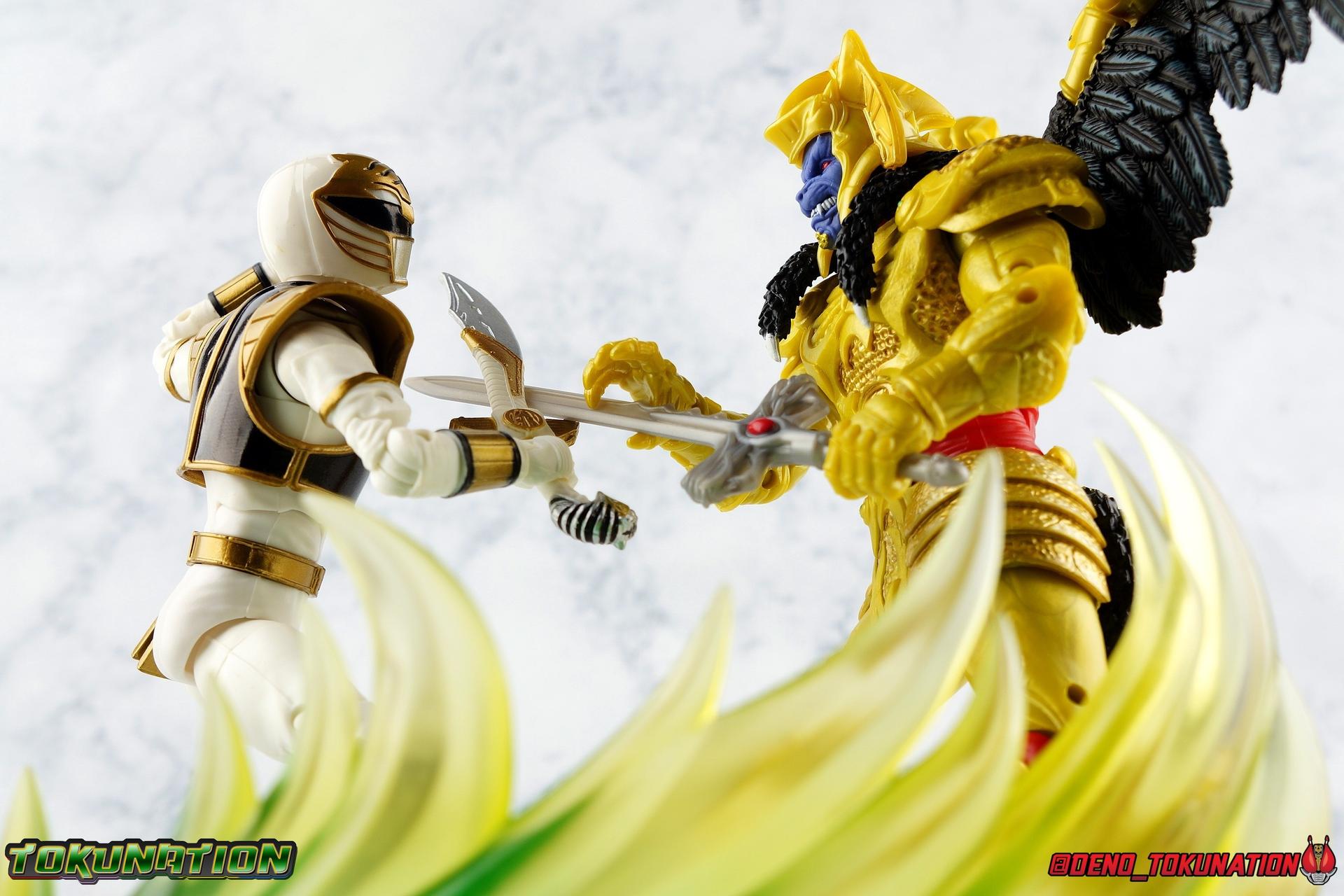 This mighty winged menace has been known to terrorize heroes far and wide across the galaxy. Waging wars on countless worlds, he's made his mark in the fight to control the universe. But after being freed from a 10,000 year slumber, the Power Rangers of Earth became his greatest foes. For millennia, he has served at the beck and call of his empress, Rita Repulsa. And even before that, he was a loyal general in the armies of the fearsome Lord Zedd. Born on Titan, Saturn's largest moon, the shining warrior Goldar is a force for all heroes to reckon with. For (more or less) 4 seasons and two movies Goldar has menaced the Power Rangers, while sometimes being a bit of a goof about it. While he fought the Mighty Morphin Power Rangers many times, as the series began to phase out of usable Zyuranger footage, he certainly took less of a starring villain role. But even by the time of the third season/Alien Rangers, he still had plenty of scenery to chew with his best bud Rito Revolto. Though he became more of a comedic relief character in Zeo (honestly my favorite characterization of him) he would eventually albeit briefly return for In Space. As a member of the Alliance of Evil, still faithfully serving Rita & Zedd. Goldar went out fighting as Zordon's light engulfed all evil in the galaxy, thus expunging it and him. Goldar is honestly one of the most complex villains the franchise has ever produced. Like Zedd, Rita, and Rito he's had multiple seasons of evolving characterization, but in his case even more so. Goldar is the standard bearer of all villains for this franchise. And his debut in the Lightning Collection toyline is honestly a huge deal to me, and I think it should be a huge deal to all collectors. For years fans begged Bandai America to make more villains. Hasbro has already delivered 3 pretty snazzy ones in this line so far with Lord Zedd, the Putty and now Goldar. Packaging In creating this line, Hasbro was keen to make sure they appealed to collectors and fans of the franchise from throughout it's various eras. Given the aim to make this appeal to an older crowd, the packaging seems to have taken a page out of the Star Wars Black Series book. In similar collector style boxes, the Lightning collection figure's look a bit brighter thanks to a primarily white color scheme. But they also really pop thanks in no small part to some wonderful box art, lovingly crafted by artist Tom Whalen aka @strongstufftom on twitter. His artwork is breathtaking, and makes these figure's feel like just a bit more of a passion project from the folks at Hasbro. Goldar's profile artwork takes up a majority of the packaging, while the back of the box is relegated to a single stock photo of the figure. I find this box delightfully loud and garish too. Goldar comes in a primarily orange and gold box, at odds with the predominantly white standard packaging of the rest of the line. So it's a nice pop of color to the otherwise uniform collection. Main Figure The likeness of this Goldar figure strikes (in my opinion) a pretty great balance of the original Grifforzer suit most often seen during MMPR season 1 Zyuranger based footage, and the slightly adjusted suit that would become standard in all american footage throughout the rest of his canonical appearances. As time went on in the American footage the particular type of gold coloring seemed to change a bit, but also a specific physical change was made to the suits' mouth after season 1, episode 45. As with any prop used for long term filming, wear/tear/repair takes a toll, and small fixes add up over time to make drastic change. I know some collector's may dislike the particular way this figure is colored, but I have to say, I think it's a fantastic compromise of the show suits used. The two movie designs are an entirely different can of worms we won't get into. It should be noted that the stock photo on the box portrays a uniformly gold painted figure, something I would have liked. But who knows what happened between the time that was mocked up, and the figure was actually getting ready to drop for mass production. But enough about paint, how about how the figure is engineered? Purely based on the finer details, this figure has the most intricate sculpt in the line, even more so than Zedd. Goldar is adorned with pads, and armor, and straps, and rivets, and fabric folds, the works. While the somewhat uniform color scheme can sometimes mask these details, on closer inspection they really do shine so to speak. The shins in particular features some of my favorites like the subtle scarring or fabric fold on the shin armor, or the sculpted leather straps that run around the back of the leg as though to keep the two halves of the muscle together. While impressive looking though, these shins do impact the foot's movement. The forward tilt of the ankle is sadly nullified, but the backward tilt works pretty well. Thankfully the ankle rockers can compensate somewhat, but even they suffer a bit from this design. The bulky sculpt of the legs is broken only by the glaringly narrow knees, particularly from a side view. Though the bulk of the lower legs still means you lose a little of the knee bend. If the ankles were less restricted then this wouldn't be a huge issue but as is it it's not a great mix. Goldar's waste skirt armor is something that looks absolutely stunning, but could have probably used another pass on design. The extra gold paint apps are gorgeous, though one of the green jewels isn't fully painted on mine. The back of the skirt has Goldar's tail molded to it, and although it's not a rigid plastic, it's not exactly flexible either so it may get in the way while posing. The armor itself as one an entire piece though really knocks out a lot of the usefulness of the hips themselves. It's quite frustrating how the design choices of the lower body impact the way the overall figure looks when posed, because everything else about it like the paint and sculpt are ex