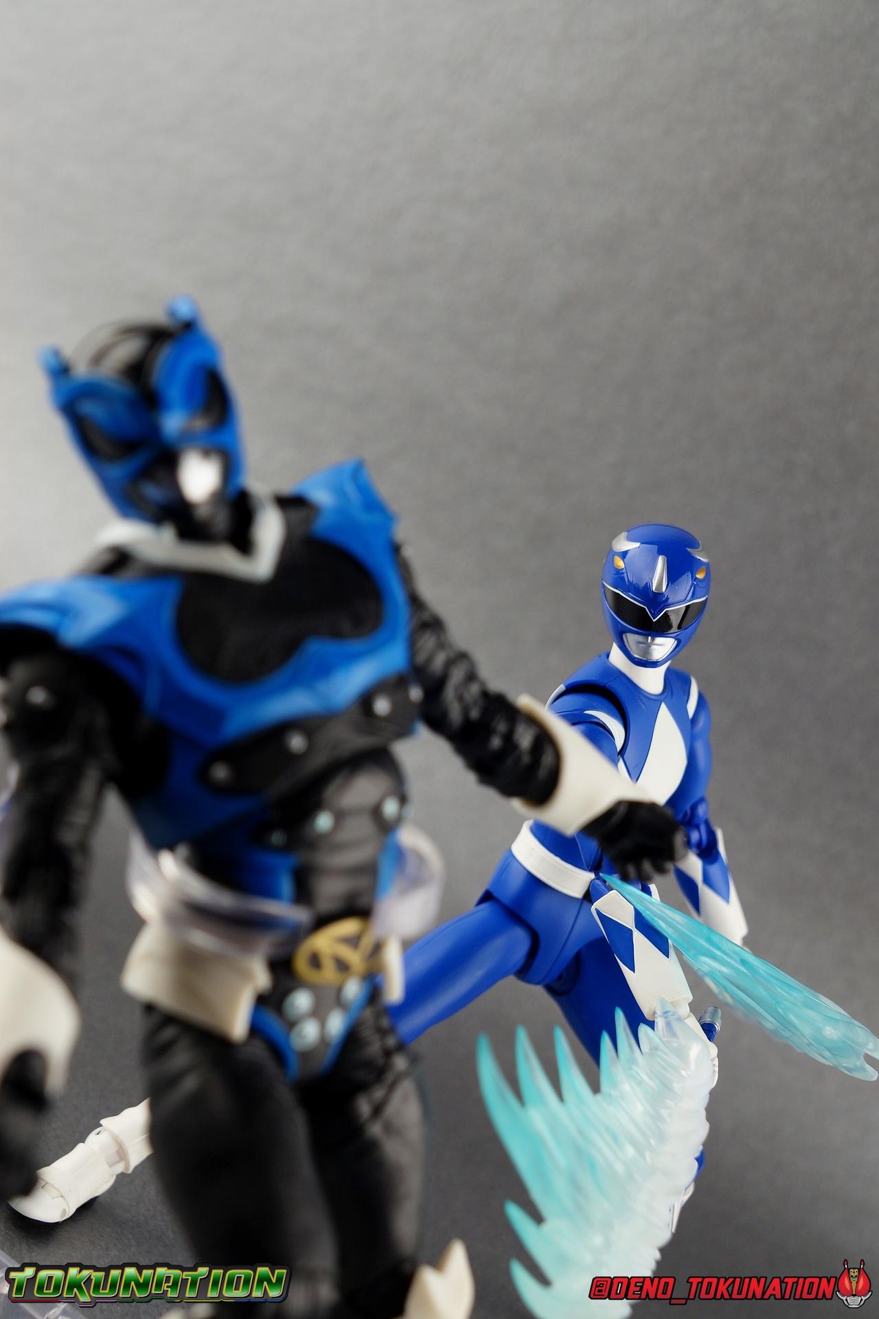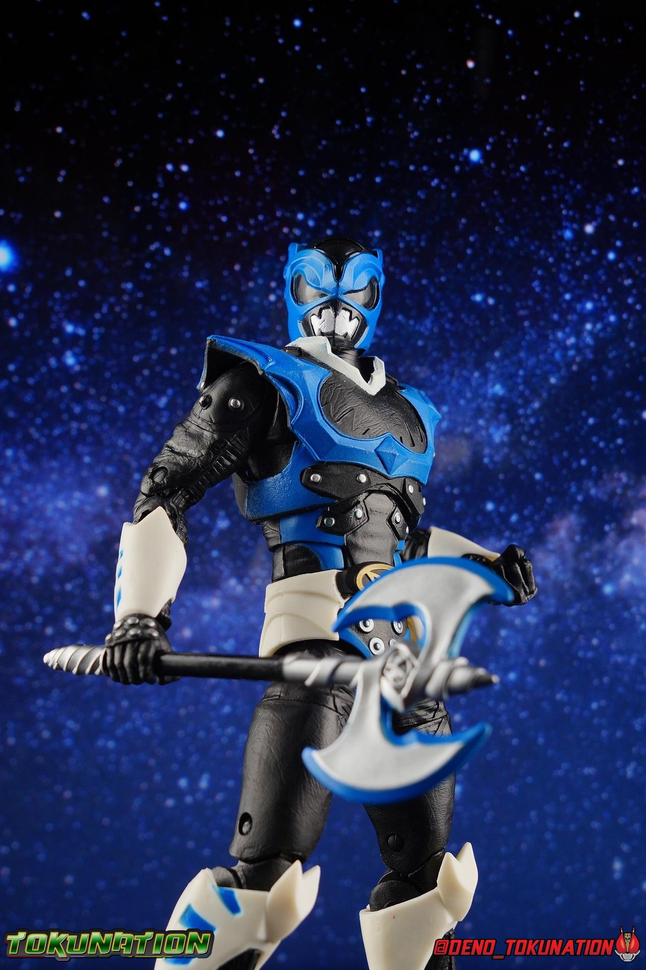 As the Space Rangers quest through the stars to save Zordon and bring peace to the galaxy, the newly brainwashed Astronema has finally found the key to their defeat. Drawing their power from the great Dark Specter, these malevolent machines are faster smarter stronger, and evil. First posing as the Power Rangers then attacking them relentlessly, the Psycho Rangers hide even more monstrous strength just below the surface. Each Psycho Ranger is programmed to ruthlessly hunt down the opposing Power Ranger of their color, and Psycho Blue will stop at nothing to find and defeat TJ, the Blue Space Ranger. Easily the most memorable and powerful team of evil rangers in franchise history, the Psycho Rangers have earned their place in the hearts of fans and collectors. So it's no surprise that seeing this team shaping up in Hasbro's Lighting Collection line has been received so well. Let's dive in and see just how much of an improvement the Hasbro Psychos are compared to the slightly older Bandai America releases! Packaging As we are all pretty familiar with the line by now, I'm sure I probably don't need to go through my usual list of reasons why it's awesome. Hasbro was keen to make sure these appealed to collectors and fans of the franchise from throughout it's various eras. And they also really pop thanks in no small part to some wonderful box art, lovingly crafted by artist Tom Whalen aka @strongstufftom on twitter. His artwork is breathtaking, and makes these figure's feel like just a bit more of a passion project from the folks at Hasbro. Psycho Blue's profile artwork takes up a majority of the packaging, while the back of the box is relegated to a single stock photo of the figure. Like Goldar and the recently released Dragon Shield Black Ranger, Psycho Blue features a non-standard color palette for the box. Main Figure Who would have thought, even just a year ago, that we'd be on our second round of Psycho Ranger figures? In the dying days of Bandai America's grip on the Power Rangers license, they did finally cater to at least one big fan demand by beginning to release Psycho Rangers in their Legacy Collection 6.5" line. Since their appearance in Power Rangers In Space in 1998, the Psycho Ranger designs had never been translated to toy form. In fact, no proper figures had ever been produced of these characters even for Denji Sentai Megaranger the year prior. So the prospect of having them at the time, was really appealing. That hopeful prospect was pretty quickly derailed by terrible QC on Bandai's Psycho's as well as the fact that they never even completed the team. Yellow & Pink were never released, while Psycho Silver & Boom! Comic character Psycho Green were exclusives. In comes Hasbro to save the day. Within their first year of having the Power Rangers license, the Lightning Collection line has now touched on a number of seasons and rangers that run the spectrum of the franchise. And now this includes a foray back to the days of In Space with their own takes on the Psycho Rangers. A true case of one upping Bandai's less than perfect attempt at the characters. Kicking off Hasbro's line is an odd choice, Psycho Blue. Released as a Gamestop Exclusive in the US (and through various other retailers internationally) Psycho Blue is our first look at the new Hasbro 6" mold that will be used to produced the rest of the team. While Understandably there may be some collector's who don't necessarily see many differences from the old Bandai Psycho's to Hasbro's, I'm here to tell you it's a world of difference. Hasbro's Psycho's come in at a much more agreeable scale than the old Bandai 6.5" line. As you can see bleow, when compared to other villains in the line like Zedd or Goldar, he's a bit shorter than them, and basically the same height as most of the Power Rangers in the line. While he also scales decently well with S.H. Figuarts. Oddly Psycho Blue is the first and so far only Blue Ranger of any kind in the Lightning Collection line as well, so I tossed in my S.H. Figuarts Tricera Ranger (MMPR Blue) as well as Vul Shark for some fun shots. Scale aside, the figure also functions much better than the last attempt at these characters, and sets a great bench mark for the rest of the team. Just looking physically at these figures its oh so apparent how much more accurate the sculpt on the Hasbro figures are by comparison. Much of the articulation present in the Lightning Collection line is pretty standard, generally with a few adjustments to suit a new mold here and there. Psycho Blue starts with tried and true side to side rocker ankle joints and ratchets for forward and back. These provide plenty of range for wide stances and stability for the figure to lean front or back. As with other Rangers, Psycho Blue also has a hidden cut below the shin armor allowing you to rotate the leg beneath the knee joint, while the knee itself is double jointed to fold back upon itself. The upper kneew joints on mine function as normal, but the lower hinge is quite tight, so just be careful if yours is the same. The sculpt on the hips is much sharper and more accurate and disguises pretty well the thigh swivel, where the old Psycho figures had limited in set hip joints. The hips themselves aren't really obstructed in any appreciable way, so thankfully them combined with the ankles and knees gives you plenty of play for posing. The waist itself is another area of huge improvement. Where Bandai opted for soft flat surfaces, Bandai has fully sculpted raised 3 dimensional detailing, particularly on the hip armor and Psycho Ranger emblem. The upper body takes a page out of the book for basically all the shield wearing rangers in this line as well. Bandai handled the Psychos' torsos by making them two vertical parts, interlocked by an ab crunch joint. Hasbro opts to have a lower torso with ab crunch coming out the waist, while the upper body is on a floating rotating joint that can move independently and provide you a 