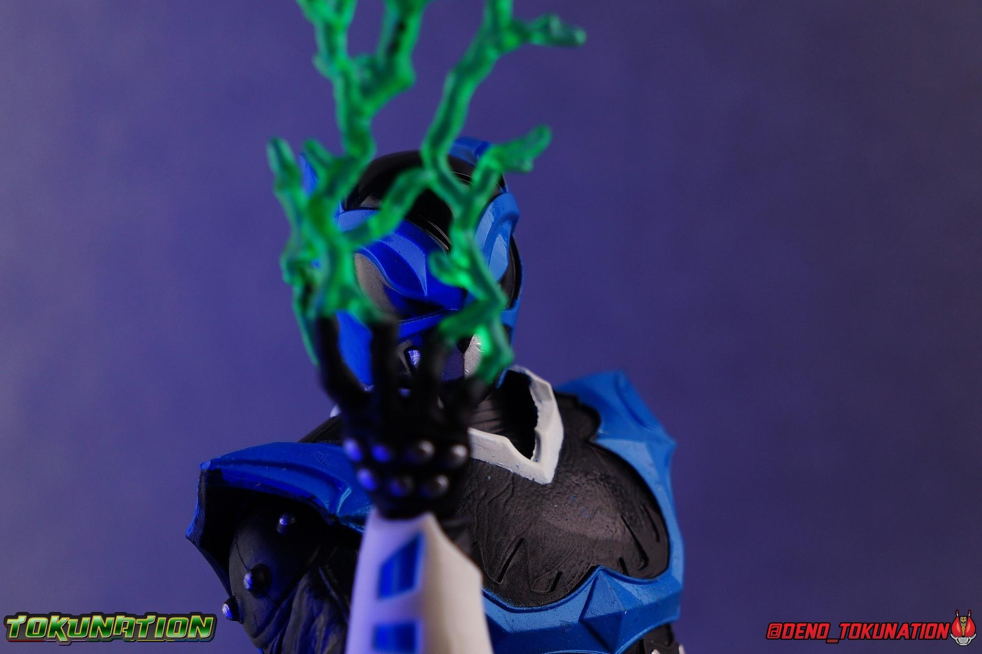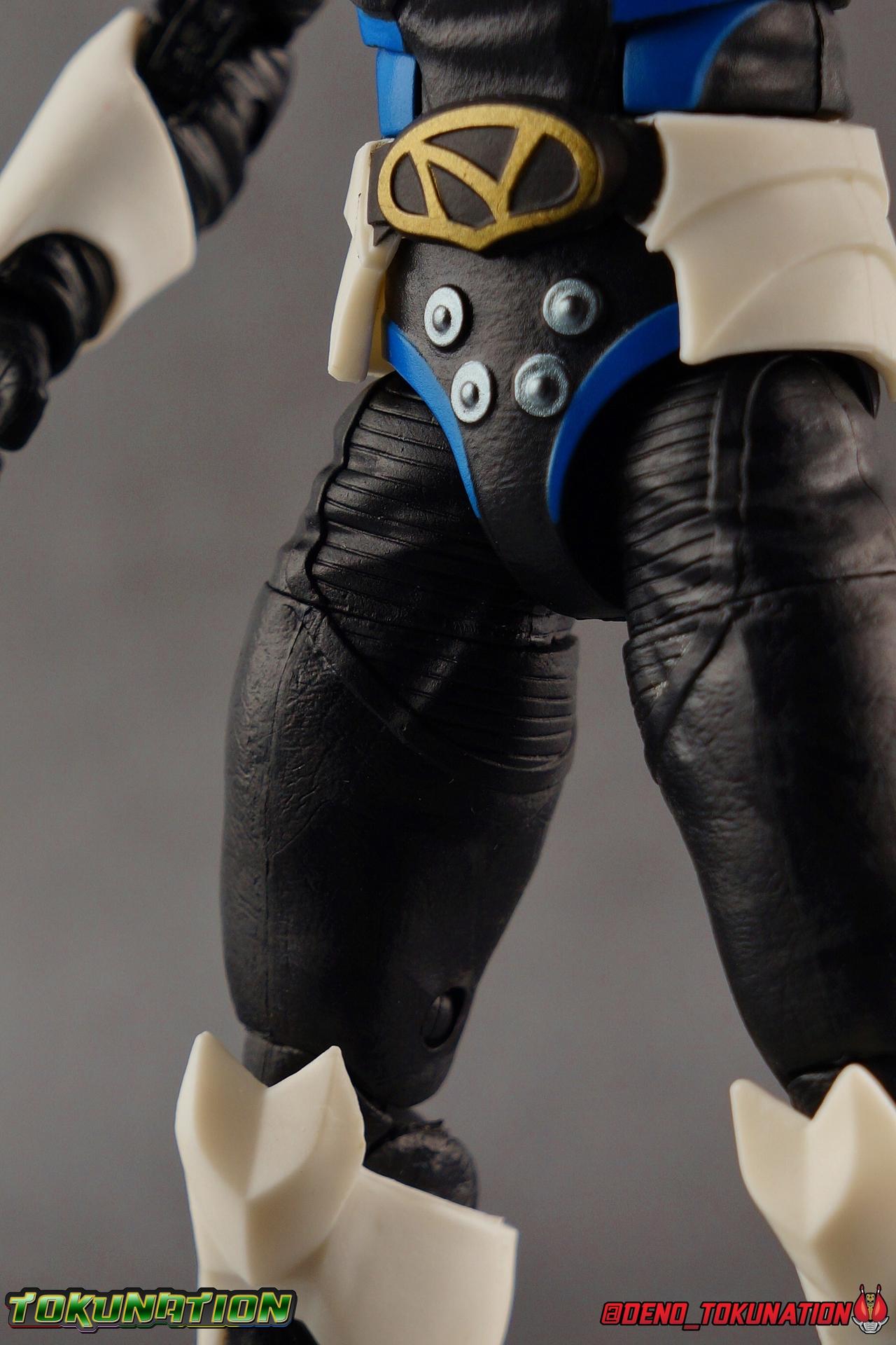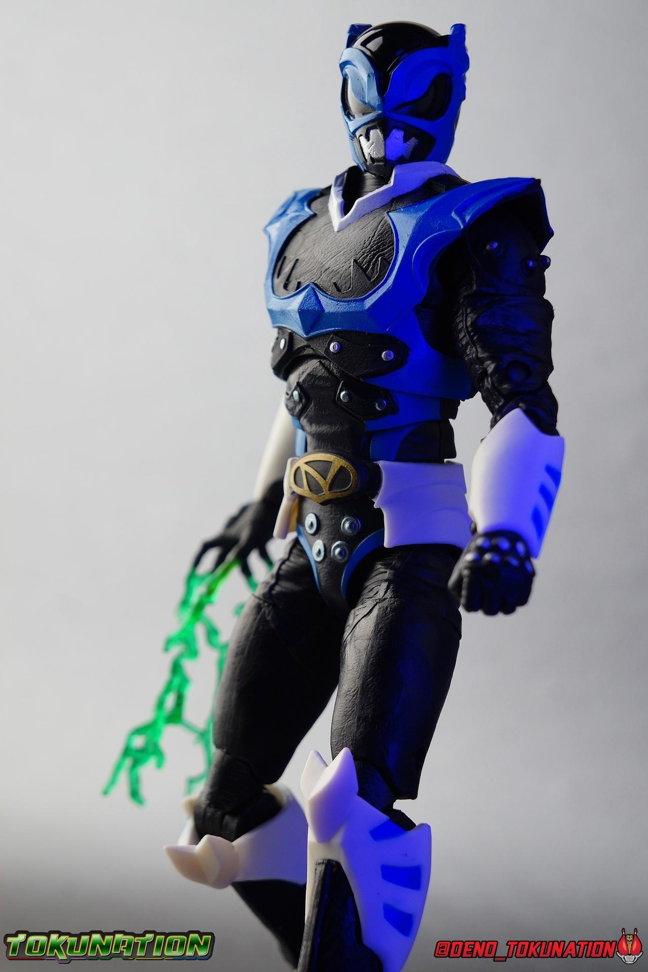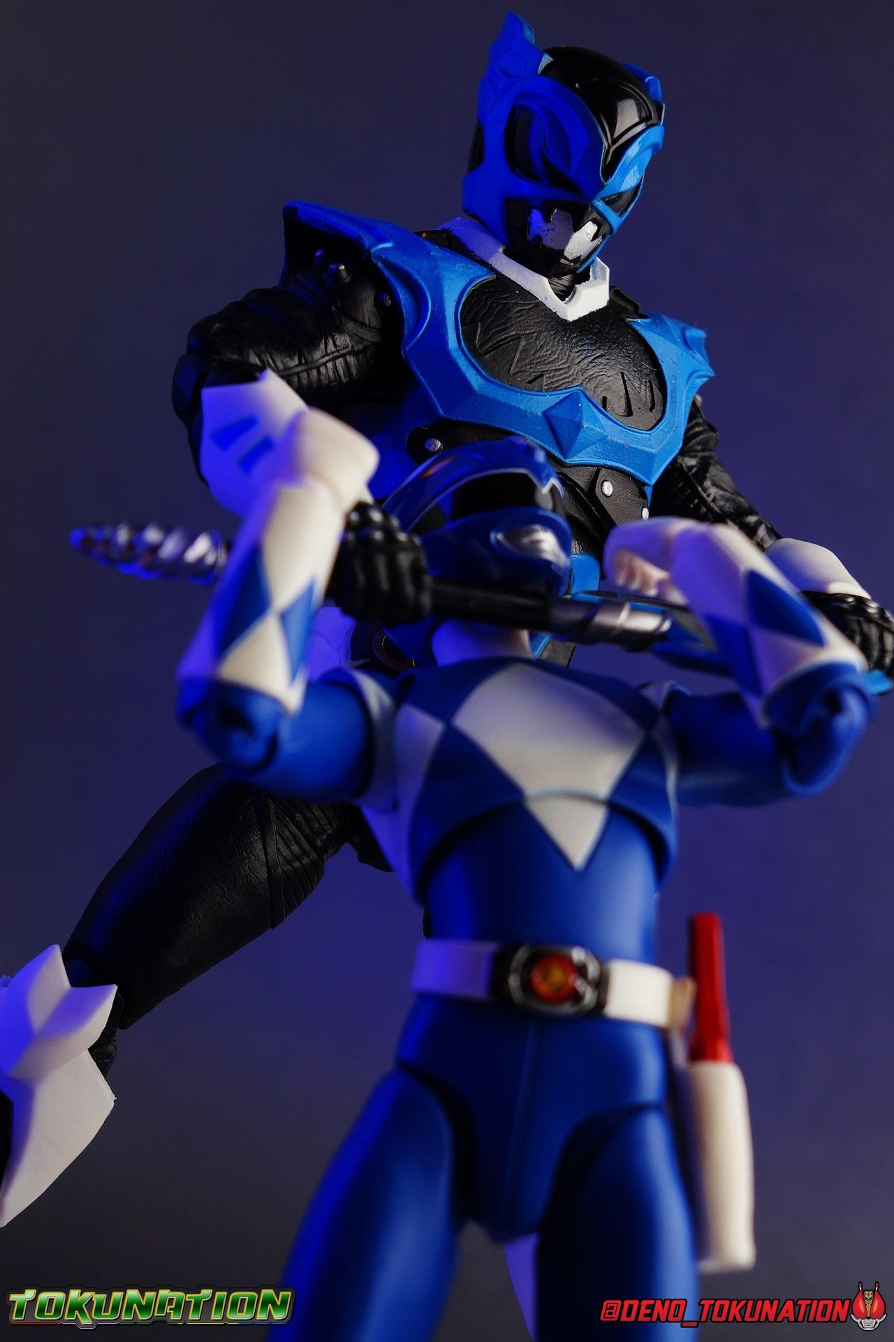As the Space Rangers quest through the stars to save Zordon and bring peace to the galaxy, the newly brainwashed Astronema has finally found the key to their defeat. Drawing their power from the great Dark Specter, these malevolent machines are faster smarter stronger, and evil. First posing as the Power Rangers then attacking them relentlessly, the Psycho Rangers hide even more monstrous strength just below the surface. Each Psycho Ranger is programmed to ruthlessly hunt down the opposing Power Ranger of their color, and Psycho Blue will stop at nothing to find and defeat TJ, the Blue Space Ranger. Easily the most memorable and powerful team of evil rangers in franchise history, the Psycho Rangers have earned their place in the hearts of fans and collectors. So it's no surprise that seeing this team shaping up in Hasbro's Lighting Collection line has been received so well. Let's dive in and see just how much of an improvement the Hasbro Psychos are compared to the slightly older Bandai America releases! Packaging As we are all pretty familiar with the line by now, I'm sure I probably don't need to go through my usual list of reasons why it's awesome. Hasbro was keen to make sure these appealed to collectors and fans of the franchise from throughout it's various eras. And they also really pop thanks in no small part to some wonderful box art, lovingly crafted by artist Tom Whalen aka @strongstufftom on twitter. His artwork is breathtaking, and makes these figure's feel like just a bit more of a passion project from the folks at Hasbro. Psycho Blue's profile artwork takes up a majority of the packaging, while the back of the box is relegated to a single stock photo of the figure. Like Goldar and the recently released Dragon Shield Black Ranger, Psycho Blue features a non-standard color palette for the box. Main Figure Who would have thought, even just a year ago, that we'd be on our second round of Psycho Ranger figures? In the dying days of Bandai America's grip on the Power Rangers license, they did finally cater to at least one big fan demand by beginning to release Psycho Rangers in their Legacy Collection 6.5" line. Since their appearance in Power Rangers In Space in 1998, the Psycho Ranger designs had never been translated to toy form. In fact, no proper figures had ever been produced of these characters even for Denji Sentai Megaranger the year prior. So the prospect of having them at the time, was really appealing. That hopeful prospect was pretty quickly derailed by terrible QC on Bandai's Psycho's as well as the fact that they never even completed the team. Yellow & Pink were never released, while Psycho Silver & Boom! Comic character Psycho Green were exclusives. In comes Hasbro to save the day. Within their first year of having the Power Rangers license, the Lightning Collection line has now touched on a number of seasons and rangers that run the spectrum of the franchise. And now this includes a foray back to the days of In Space with their own takes on the Psycho Rangers. A true case of one upping Bandai's less than perfect attempt at the characters. Kicking off Hasbro's line is an odd choice, Psycho Blue. Released as a Gamestop Exclusive in the US (and through various other retailers internationally) Psycho Blue is our first look at the new Hasbro 6" mold that will be used to produced the rest of the team. While Understandably there may be some collector's who don't necessarily see many differences from the old Bandai Psycho's to Hasbro's, I'm here to tell you it's a world of difference. Hasbro's Psycho's come in at a much more agreeable scale than the old Bandai 6.5" line. As you can see bleow, when compared to other villains in the line like Zedd or Goldar, he's a bit shorter than them, and basically the same height as most of the Power Rangers in the line. While he also scales decently well with S.H. Figuarts. Oddly Psycho Blue is the first and so far only Blue Ranger of any kind in the Lightning Collection line as well, so I tossed in my S.H. Figuarts Tricera Ranger (MMPR Blue) as well as Vul Shark for some fun shots. Scale aside, the figure also functions much better than the last attempt at these characters, and sets a great bench mark for the rest of the team. Just looking physically at these figures its oh so apparent how much more accurate the sculpt on the Hasbro figures are by comparison. Much of the articulation present in the Lightning Collection line is pretty standard, generally with a few adjustments to suit a new mold here and there. Psycho Blue starts with tried and true side to side rocker ankle joints and ratchets for forward and back. These provide plenty of range for wide stances and stability for the figure to lean front or back. As with other Rangers, Psycho Blue also has a hidden cut below the shin armor allowing you to rotate the leg beneath the knee joint, while the knee itself is double jointed to fold back upon itself. The upper kneew joints on mine function as normal, but the lower hinge is quite tight, so just be careful if yours is the same. The sculpt on the hips is much sharper and more accurate and disguises pretty well the thigh swivel, where the old Psycho figures had limited in set hip joints. The hips themselves aren't really obstructed in any appreciable way, so thankfully them combined with the ankles and knees gives you plenty of play for posing. The waist itself is another area of huge improvement. Where Bandai opted for soft flat surfaces, Bandai has fully sculpted raised 3 dimensional detailing, particularly on the hip armor and Psycho Ranger emblem. The upper body takes a page out of the book for basically all the shield wearing rangers in this line as well. Bandai handled the Psychos' torsos by making them two vertical parts, interlocked by an ab crunch joint. Hasbro opts to have a lower torso with ab crunch coming out the waist, while the upper body is on a floating rotating joint that can move independently and provide you a 