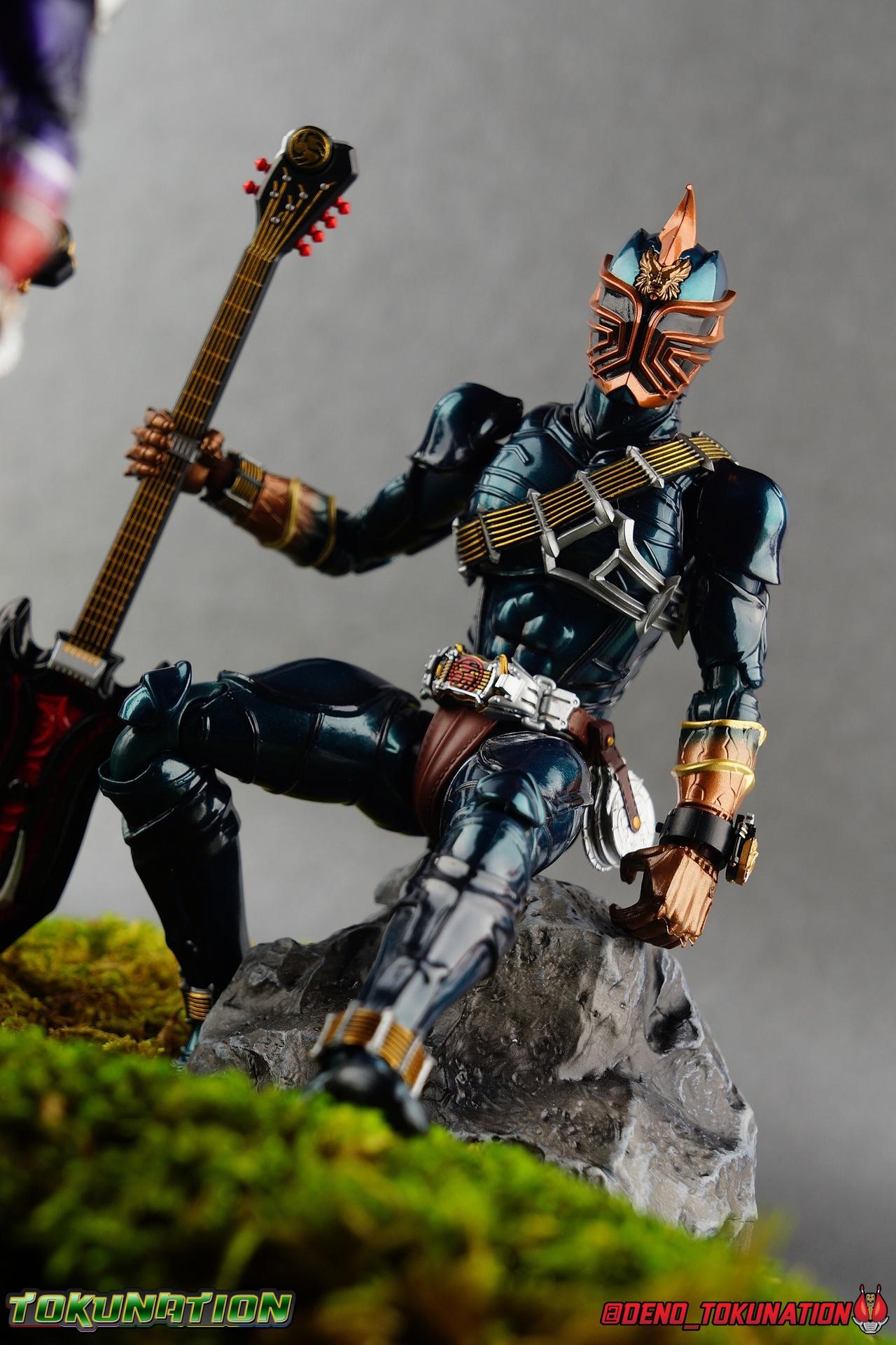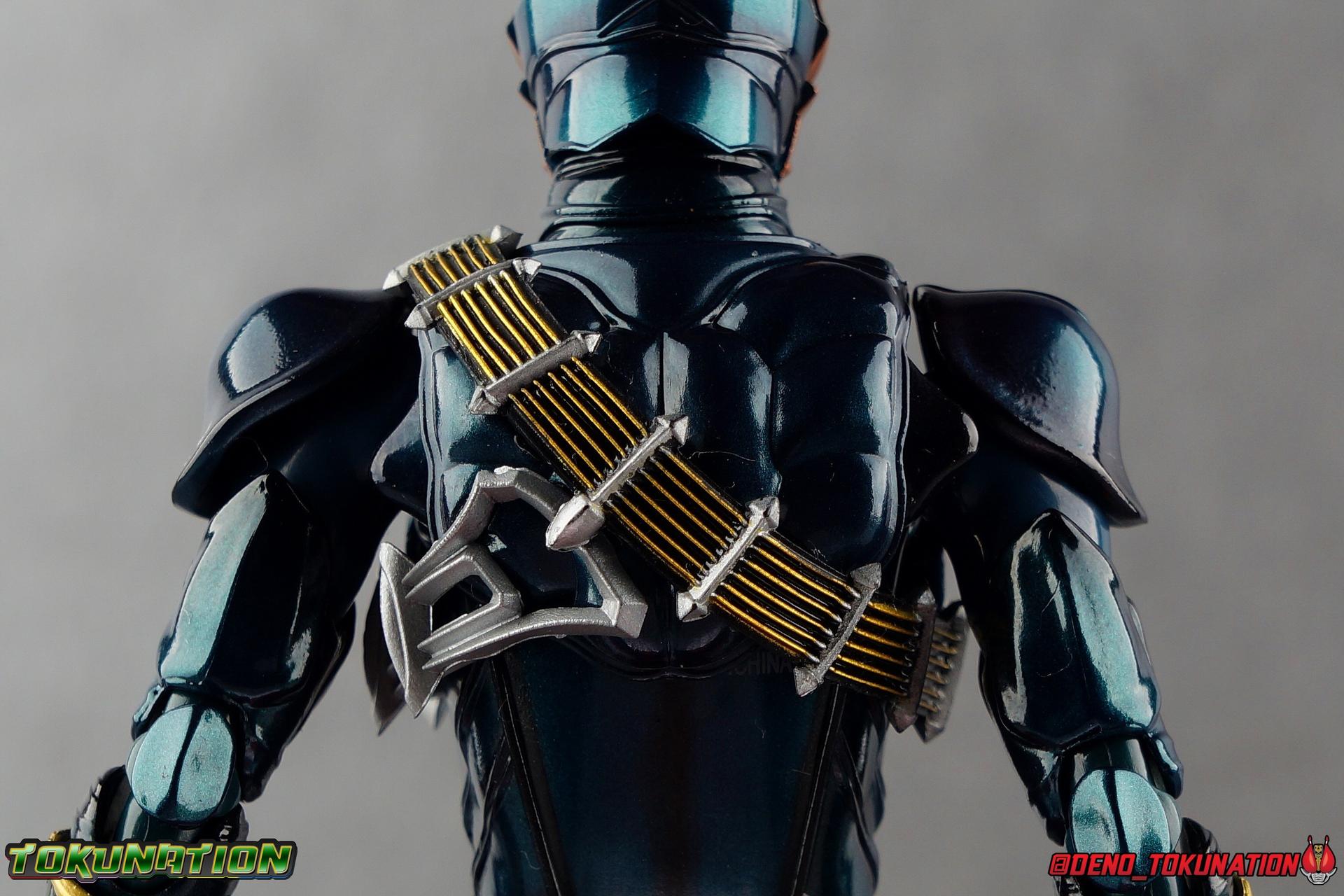 Kamen Rider Hibiki finally joined the S.H. Figuarts line for the first time over 4 years ago. Then last year, Tamashii at last made their second addition from Hibiki's world to this line with Kamen Rider Ibuki. It's taken quite some time for the beautiful Oni Riders to show up in the Shinkocchou Seihou line, but after the recent release of Kamen Rider Todoroki it's befitting that his master has been released as well. Kamen Rider Zanki! Like any Oni master, Zaoumaru Zaitsuhara took on an apprentice. Someone to pass along his skills to, his techniques, and one day his title as well. But the young man once known as Tomizo Todoyama had other plans. This kind warrior wasn't as experienced as his contemporaries Hibiki or Ibuki in the fight against the Makamou, but his dedication to protect others made him the hero he is today. Refusing to inherit his masters title to create his own legacy, Todoyama took on the name Todoroki! Kamen Rider Zanki passed on the remainder of his knowledge, his skills, and the mighty Ongekiken Retsurai to the young Todoroki. But a warrior's journey never ends. Never far from the battlefield, and returning once again to take up the Ongekiken Retsuzan, Zanki continues the fight alongside his disciple, for as long as his body will last! Packaging It's the familiar Shinkocchou Seihou slip cover box once again! Not much can be said about it this time that hasn't been said before. It's gotten a bit stale (to me) over time but it's still a pleasing type of uniform collector's box thats great for storage. Main Figure This review will be nearly identical to that of Todoroki. The two figure's have very very minor physical differences. So don't be surprised to see huge portions of this review be word for word identical to that one. Like Hibiki, Ibuki, & Todoroki, Zanki is a stunning figure. The sculpt of this body type is superb (even 4 years on!), really bringing to life these unique Oni Rider suits. In every way imaginable it captures the look of the on screen suit right down to the textured musculature, and the gloss of the armor really gives in that pleather/vinyl feel of the actual suits. A favorite detail of mine. The design process Seihou's go through has always been much much more involved than that of the standard figuarts line and the best examples of this were the special booklets included with Kabuto & Hibiki. When the design begins with a sort of skeletal inner frame, and builds out what would be like a suit over a real human body like this, you get a much more realistic application of articulation and proportion to the body as a result. Now despite the obvious color changes, Zanki is the same basic mold as Hibiki & Ibuki, but is literally identical to Todoroki even featuring identical articulation placement. When Bandai nails the basic design of the body, it can be truly astounding how outer level cosmetic changes can create a vastly different presentation. But of course, even 4 years later some of my issues with this mold still persist. I've always found the legs to be quite odd. To me, they look really long and at odds with the torso, especially when bent for crouching poses. Something about them looks off. They function well enough, though I've always thought this mold had one of the more strange figuarts hip joints out there. While the part separation undoubtedly gives them great range, the hips look very small by the time you angle them out fully, making the thigh seem huge by comparison. And while the knees function just fine, the feet could be slightly better. Despite being pretty large, they don't easily rest flat on any surface, and the toe bends can be difficult to line up straight. Znki's belt is really loaded up with accessories like his predecessors. This figure comes with a lot and luckily you can store some of it on his belt given the display options you've chosen. When loaded out for static poses, the left hip can be outfitted with a Disc Animal holster with 3 non-removable discs sculpted in. Or you can keep the out of box standard part which is an empty holster for when you want him to hold the discs in hand. Straight out of the box, the center of the belt has Zanki's Ongekishin Zantetsu attached. This rectangular piece is removable to simulate how it combines with the Ongekigen - Retsuzan, though it does not actually combine (a separate piece is included). It can be used with any Oni Rider that has a similarly designed belt. In Zanki's original role as Todoroki's master, his belt featured the Ongekishin - Raigou, but since training Todoroki it has been passed down to him. The upper body is identical to Todoroki as well, just removing the red string accents and replacing them with gold. This bandoleer like sash is still my favorite part of the Zanki/Todoroki design. The upper and lower halves of the torso move independent of one another, though it's a tight fit to get either to move very far. I've always felt this body type was a bit stiff, but it gets the job done very nicely still. Zanki's arms are basically identical to all of the other Oni Riders, though like the rest of the body these are painted in a nice glossy deep green. The silver fade from Todoroki has been replaced by a gorgeous gold on Zanki, as well as further red accents. The left shoulder pad does impact the bandoleer at times so be careful not to scratch it, but thankfully the pads don't pop off frequently as they did with Ibuki. The left wrist also features the Henshin Kigen Onka. This one is in it's closed form, but an open version of the accessory is included to replicate Zanki's transformation. And like others, but particularly Todoroki, Zanki has a stunningly accurate headsculpt. All 4 riders have insanely well detailed sculpts, but the Oni face on Todoroki's head is just top notch. The horn protrusion on his head is actually quite sharp as well, so watch out there. Zanki's head is of course a real nice mostly bronze repaint of Todoroki and it's just stunning on this mold. Th