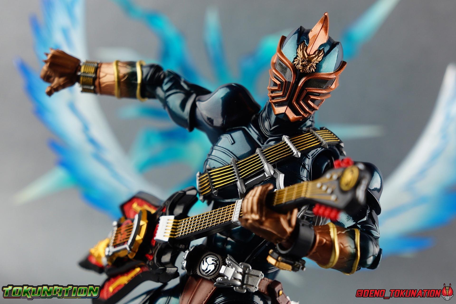 Kamen Rider Hibiki finally joined the S.H. Figuarts line for the first time over 4 years ago. Then last year, Tamashii at last made their second addition from Hibiki's world to this line with Kamen Rider Ibuki. It's taken quite some time for the beautiful Oni Riders to show up in the Shinkocchou Seihou line, but after the recent release of Kamen Rider Todoroki it's befitting that his master has been released as well. Kamen Rider Zanki! Like any Oni master, Zaoumaru Zaitsuhara took on an apprentice. Someone to pass along his skills to, his techniques, and one day his title as well. But the young man once known as Tomizo Todoyama had other plans. This kind warrior wasn't as experienced as his contemporaries Hibiki or Ibuki in the fight against the Makamou, but his dedication to protect others made him the hero he is today. Refusing to inherit his masters title to create his own legacy, Todoyama took on the name Todoroki! Kamen Rider Zanki passed on the remainder of his knowledge, his skills, and the mighty Ongekiken Retsurai to the young Todoroki. But a warrior's journey never ends. Never far from the battlefield, and returning once again to take up the Ongekiken Retsuzan, Zanki continues the fight alongside his disciple, for as long as his body will last! Packaging It's the familiar Shinkocchou Seihou slip cover box once again! Not much can be said about it this time that hasn't been said before. It's gotten a bit stale (to me) over time but it's still a pleasing type of uniform collector's box thats great for storage. Main Figure This review will be nearly identical to that of Todoroki. The two figure's have very very minor physical differences. So don't be surprised to see huge portions of this review be word for word identical to that one. Like Hibiki, Ibuki, & Todoroki, Zanki is a stunning figure. The sculpt of this body type is superb (even 4 years on!), really bringing to life these unique Oni Rider suits. In every way imaginable it captures the look of the on screen suit right down to the textured musculature, and the gloss of the armor really gives in that pleather/vinyl feel of the actual suits. A favorite detail of mine. The design process Seihou's go through has always been much much more involved than that of the standard figuarts line and the best examples of this were the special booklets included with Kabuto & Hibiki. When the design begins with a sort of skeletal inner frame, and builds out what would be like a suit over a real human body like this, you get a much more realistic application of articulation and proportion to the body as a result. Now despite the obvious color changes, Zanki is the same basic mold as Hibiki & Ibuki, but is literally identical to Todoroki even featuring identical articulation placement. When Bandai nails the basic design of the body, it can be truly astounding how outer level cosmetic changes can create a vastly different presentation. But of course, even 4 years later some of my issues with this mold still persist. I've always found the legs to be quite odd. To me, they look really long and at odds with the torso, especially when bent for crouching poses. Something about them looks off. They function well enough, though I've always thought this mold had one of the more strange figuarts hip joints out there. While the part separation undoubtedly gives them great range, the hips look very small by the time you angle them out fully, making the thigh seem huge by comparison. And while the knees function just fine, the feet could be slightly better. Despite being pretty large, they don't easily rest flat on any surface, and the toe bends can be difficult to line up straight. Znki's belt is really loaded up with accessories like his predecessors. This figure comes with a lot and luckily you can store some of it on his belt given the display options you've chosen. When loaded out for static poses, the left hip can be outfitted with a Disc Animal holster with 3 non-removable discs sculpted in. Or you can keep the out of box standard part which is an empty holster for when you want him to hold the discs in hand. Straight out of the box, the center of the belt has Zanki's Ongekishin Zantetsu attached. This rectangular piece is removable to simulate how it combines with the Ongekigen - Retsuzan, though it does not actually combine (a separate piece is included). It can be used with any Oni Rider that has a similarly designed belt. In Zanki's original role as Todoroki's master, his belt featured the Ongekishin - Raigou, but since training Todoroki it has been passed down to him. The upper body is identical to Todoroki as well, just removing the red string accents and replacing them with gold. This bandoleer like sash is still my favorite part of the Zanki/Todoroki design. The upper and lower halves of the torso move independent of one another, though it's a tight fit to get either to move very far. I've always felt this body type was a bit stiff, but it gets the job done very nicely still. Zanki's arms are basically identical to all of the other Oni Riders, though like the rest of the body these are painted in a nice glossy deep green. The silver fade from Todoroki has been replaced by a gorgeous gold on Zanki, as well as further red accents. The left shoulder pad does impact the bandoleer at times so be careful not to scratch it, but thankfully the pads don't pop off frequently as they did with Ibuki. The left wrist also features the Henshin Kigen Onka. This one is in it's closed form, but an open version of the accessory is included to replicate Zanki's transformation. And like others, but particularly Todoroki, Zanki has a stunningly accurate headsculpt. All 4 riders have insanely well detailed sculpts, but the Oni face on Todoroki's head is just top notch. The horn protrusion on his head is actually quite sharp as well, so watch out there. Zanki's head is of course a real nice mostly bronze repaint of Todoroki and it's just stunning on this mold. Th