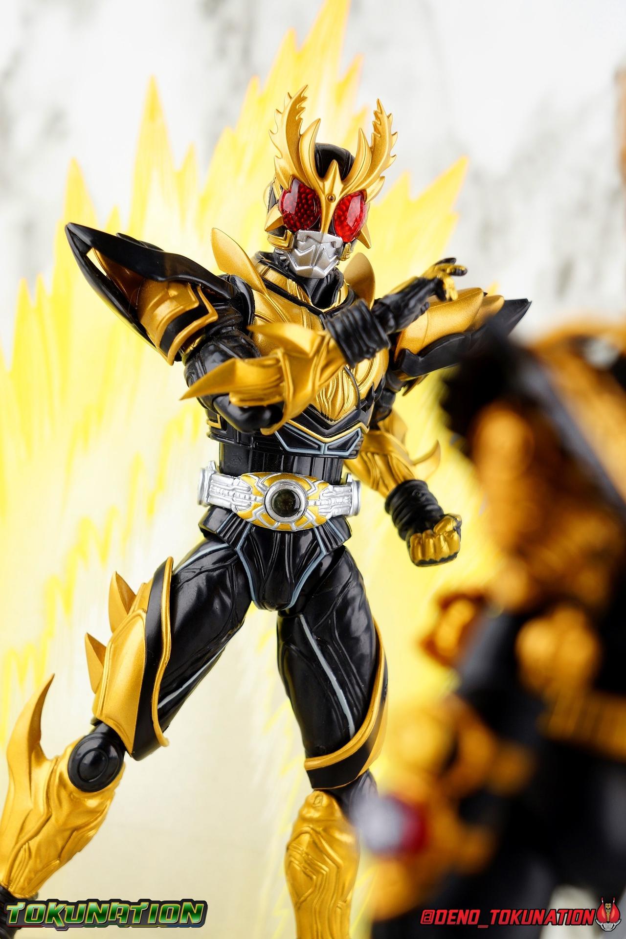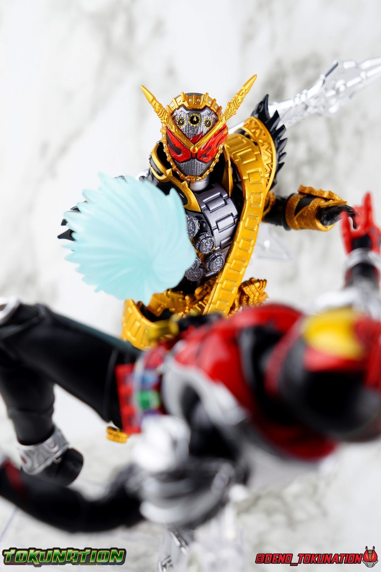 50 years from now, there are no Kamen Riders. The world is ruled by one all-powerful overlord of time and space, Ohma Zi-O! Taking as his own the power of the 20 Heisei Riders, Sougo Tokiwa conquered the world. But in another time Kamen Rider Zi-O was a hero, thanks largely to Swartz and his Time Jackers altering history. But even here the young Sougo is still on the path to becoming Ohma. Destined to have the powers of the demon king, and with the fate of all worlds in the balance, will Sougo destroy time itself? Or will he choose to rebuild everything? The day of Ohma is here! Packaging Ohma Zi-O comes in the same standard style of box as the rest of Zi-O's line. The only difference here of course being the really ornate official images of this gorgeous figure. Main Figure Ohma Zi-O is another extensive remold of the base Zi-O S.H. Figuarts. Though it may seem less apparent because of all the ornamentation on the armor, Zi-O is in there. Unfortunately I'm not sure that enough of him shines through to really make this release a winner. The box of course lists this character as "Kamen Rider" Ohma Zi-O, which feels a bit odd? Ohma Zi-O is only ever addressed as Ohma Zi-O in the series, or as the Demon King/Overlord etc. The term Kamen Rider is never applied to him. It makes sense given his rule over and subjugation of the Heisei Riders and their powers, and because he was originally a young Kamen rider Zi-O. None the less, it's odd to see the character named in this manner. While the legs in this line have been pretty standard (aside from Woz), Ohma's don't feel nearly as dynamic. The foot and ankle structure are identical to that of Zi-O, Geiz, etc. which gives you a solid base to work from. Beginning with the ankle cuff though we have new molding. In fact the entire calve section of the leg is a new bulkier part compared to original Zi-O, while the thighs and hips are carried over. Again there's a ton of gold accenting going here, with very elaborate boot cuffs, knee pads, and thigh strips. The one thing this release has going for it is indeed the stellar detailing to the new bits of armor. While the legs function identically to previous releases, I found them to be extra tight, as well as difficult to even out and position symmetrically. There's a lot going on with the upper body in terms of new parts and attempting to get everything settled without messing anything else up, can be a real challenge. So the legs in particular can be hard to maneuver given this, and the extra length "Mid Band Liner Anthem" watch band that comes down the torso. Ohma Zi-O also features a brand new Driver on his waist in the form of the Ohma Zi-O Driver or just Ohma Driver. An incredibly ostentatious design, this is contextually a far more powerful version of the Ziku Driver from Sougo's future. Unlike Ziku & Beyondrivers, the Ohma Zi-O Driver has no way of accepting Ridewatches, nor does it need to. Ohma Zi-O accesses Rider powers simply by activating the Ridewatches in his hands. Now it may confuse some a bit, but the Ohma Driver features the year 2018 on it's readout. This is because in Sougo's original timeline he became Ohma Zi-O in the year 2018. Whereas the lead character of the show, the 2nd timeline Sougo, did not become Ohma maliciously, only doing so in 2019 after the sacrifice of Geiz. So ostensibly this figure only represents Ohma Zi-O from the future, though it can double as Sougo from the series finale technically. As with Ziku Drivers, the Ohma Driver can spin though you'll find that difficult. Running diagonally around the torso is the "Meridian Sash", A giant gold watch band/glitzy bandoleer. Functionally it doesn't serve any purpose on the figure, and unfortunately it's more or less affixed in place. It's fixed at the upper left shoulder and to the back, it's really only flexible on the lower right of the figure where it crosses in front of the Ohma Zi-O Driver. You can techincally bend it back behind the driver to see the entire thing more easily, but I wouldn't leave it there for an extended period or you'll risk warping it. The rest of the base upper body is identical to base Zi-O, but the sash largely neuters the articulation built into it since it hooks around the lower body. The upper right of the chest also features a number of Ridewatch bases sculpted in. While Ohma Zi-O does not generally carry ridewatches on his person (as he can summon them) these pieces remain as a show of his collection of the Heisei Rider powers. The "Apocalypse of Kingdom" clock hands on Ohma's back can present some big frustrations most of the time as well. While gorgeously sculpted and painted in bright silver, these rigid parts also impact the main body and appendages rather easily. Thankfully they can spin independently of each other and stay in place, but moving them out too much risks throwing the delicate center of gravity for the figure out of whack. You really don't want this guy to take a fall. Breaking something on him or scuffing that golden paint won't make anyone happy. The arms likewise present their own problems. While gorgeous like much of the figure, they are quite limited. I love the giant angular shoulder pads on Ohma, but they aren't really hinged at all, thus you lose nearly all the upward & outward movement of the shoulder itself. They can still rotate fully, and in most cases that would alleviate the problem, but as the shoulder pads extend down and around the top of the bicep as well you lose all that outward articulation as well. The combination means that all you can really do is rotate the arm and extend the arms forward, creating some very odd and awkward poses. The elbows function fine, but the wrist ball joints are very tight. And the gold pads on the back of the hands are so thick that they impact the Ridewatch holsters on the wrists as well. The holsters themselves are gorgeous, though because of the added paint it's a much tighter fit when you actually put watches in there.
