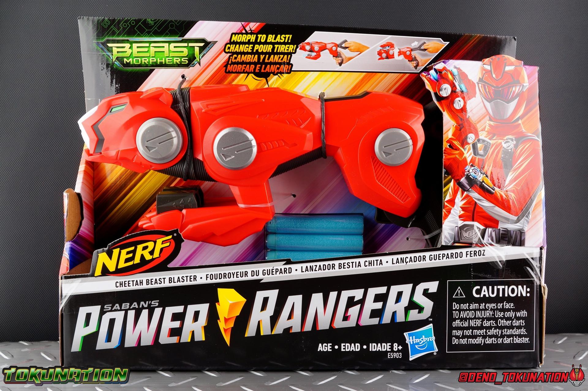 When it's time to take on a Gigantronic with the Beast Racer Zord, there's one mighty weapon that's sure to do the trick. To destroy these viral villains the Red Ranger can call on the Cheetah Beast Blaster for one powerful attack! And now thanks to Hasbro you can call on the power of this mighty power up to take on your friends with the NERF Cheetah Beast Blaster! I'd also like to mention that this item was provided to me totally for FREE, from Hasbro directly. Their generous Beast Morphers Product Mailer, which I broke down in an unboxing gallery a couple weeks ago, arrived for us to review and I'm more than happy to share each and every item from that box with the community. The Cheetah Beast Blaster is yet another wonderful gift from the fine folks at Hasbro. Packaging The Cheetah Beast Blaster comes in an open style box, similar to many roleplay items that the Power Rangers toyline has featured over the decades. This is also most similar to the style of packaging that most lower price point NERF blasters come in. So devoid of it's Power Rangers connection, this blaster will fit right into a NERF collection at the very least. The box also features more of that stellar character artwork we've come to know the Beast Morphers line for. It's a really wonderful profile of the Red Ranger holding the Beast Blaster. Main Item As with most any roleplay weapon made for the Power Rangers toyline, this one very much is made with the show's younger fans in mind. It's sized very much for the age range it's designed for, ages 8+. But I'm happy to say if you're an adult fan of Power Rangers or NERF blasters in general, it's a pretty great size for you as well. The Cheetah Beast Blaster comes packaged in it's Cheetah Mode first. On it's own, the Cheetah Mode is a pretty decent new stylized take on the general cheetah theme that the Red Buster/Red Beast Morpher has had. The original creations that the Power Rangers series comes up with versus it's sentai originator can often feel a bit tacked on and don't necessarily fit in with the theme of the series. But the Beast Blaster really does feel like a genuine member of this design family. While the cheetah mode doesn't offer much in the way of functionality, it's a really nice static display piece to compliment either your Beast Racer Zord action figure, or your 6" Basic Red Ranger. The great thing about this toy is that it transforms in a really fun way to Blaster Mode. To get there you first need to rotate the rear legs back. Doing so folds them out enough to make a handle for blaster mode, and reveals the trigger. While certainly sized with child hands in mind, the grip is large enough to accommodate plenty of adult sized hands as well. Making it a great RP toy to me personally. To get to the next step you need to press down the large silver button on the cheetah thigh, this unlocks the rotation in the Cheetah's main body, allowing it to spin up and around so that the front legs wind up slung over the head. The legs also act as holsters for two extra darts so this makes for really smart storage. When the torso is rotated this also automatically opens up the cheetah mouth, showing the barrel to load a single dart in. In order to fire a dart, you need to pull back the Cheetah's tail until it locks in place. Now just pull the trigger, making sure you're at a safe distance, and you're good to go! This things fires dart pretty hard and fast, so just play carefully as you should at any point when using a toy that fires projectiles. Don't for anyone's eyes, and don't be malicious. This is a fun toy that I think fans of all ages can have fun with. And seeing that we have an evil sort of Red Ranger as well this year in Blaze, I'd love to see a dark red and black repaint of this thing to go with him. His 6" basic figure comes with one so it only makes sense to me. And as long as we're getting original weapons, and NERF ones at that which is a first for Power Rangers, then I'd love to see some NERF swords & shields. Accessories As with any good NERF blaster worth it's salt, this one comes with 3 blue darts. These soft foam flexible darts have a slightly more firm soft rubber tip. If you fire this thing at a hard surface it makes quite the satisfying impact sound. And given that the Beast Blaster also fires them quite forcefully, this thing is a pretty powerful roleplay toy. Be careful when loading the darts as it takes a fare bit of pressure to get them in, you may wind up bending or breaking them by mistake. Final Thoughts When Hasbro took on the Power Rangers license, their involvement was bound to introduce some really new concepts to both the TV show and toyline. One thing I just never expected even though it's obvious in hindsight, is that this deal opened the door for NERF products to be involved. Stylized, fun, action oriented roleplay weapons for Power Rangers are a must. And with the NERF design philosophies, it really opens the door on possibilities. Imagine a NERF MMPR Red Power Sword. Or perhaps NERF Blaster SPD Delta Blasters. The possibilities really are endless. The Cheetah Beast Blaster is just a taste of what's to come. "It's NERF or or nothin'!"