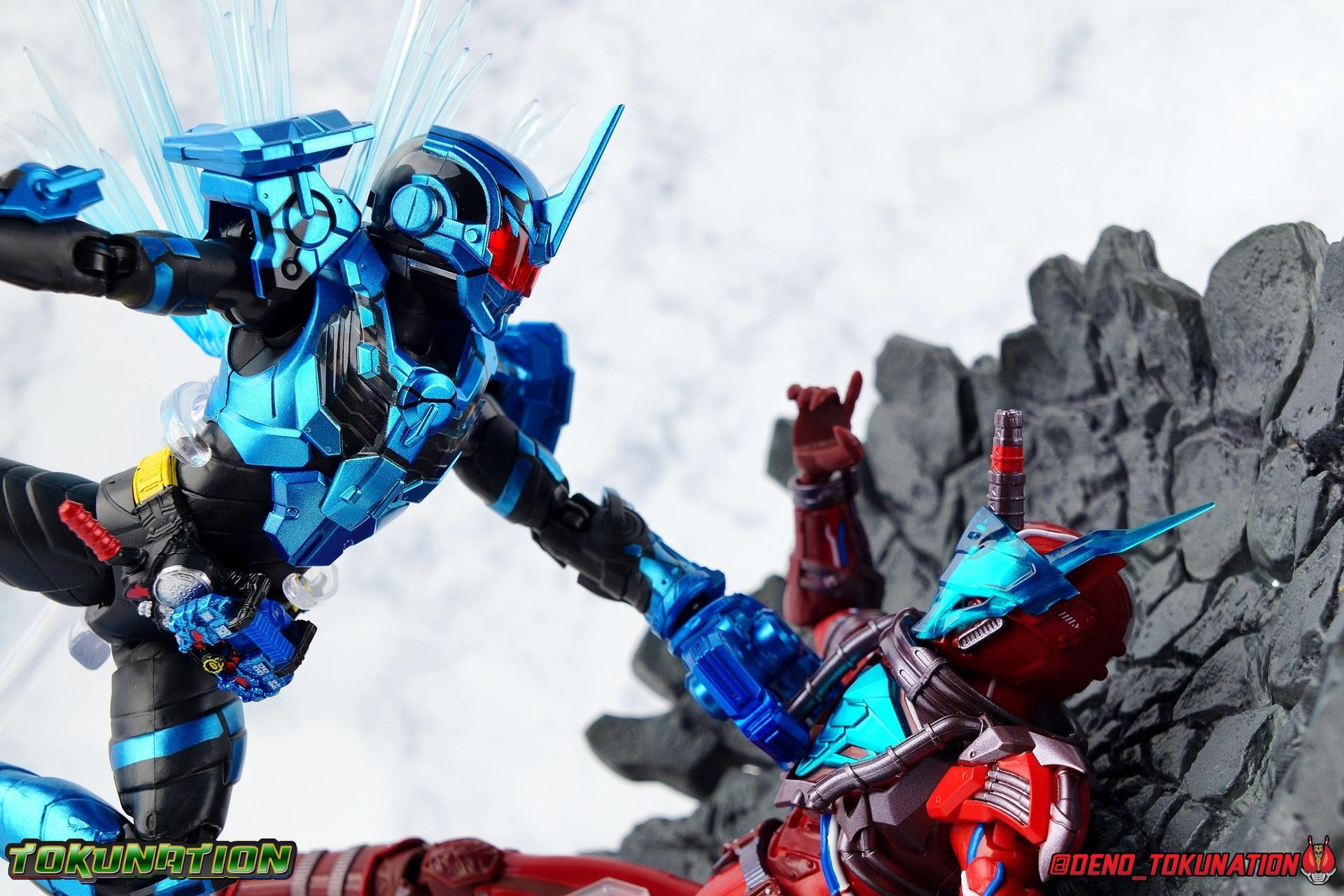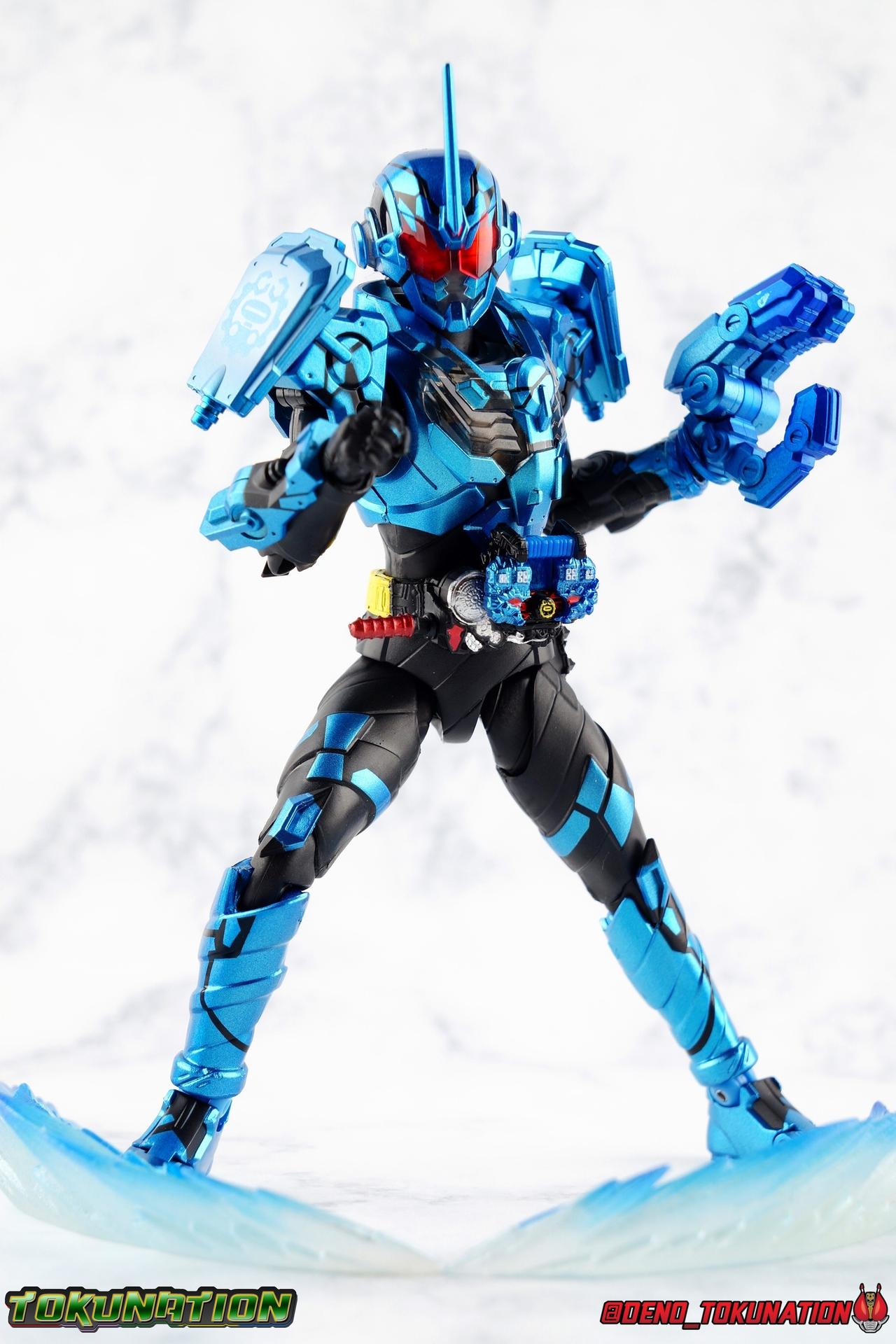"Damn right I am." Evolt is mere minutes away from total victory, harnessing the power of Pandora's Box & the Lost Bottles, he will consume the Earth and countless more planets. Sento & Banjou must press on to fight him, but standing in their way are clones of the Hokuto Three! With only his life left to give, Kazumi will face his fallen friends one more time. But the power of Grease alone just isn't enough. A parting gift from Sento, Kazumi must wield the deadly Blizzard Knuckle and walk the lonely path of a hero. With frozen fists and an icy resolve, Grease becomes Kamen Rider Grease Blizzard! Packaging As with practically all Build releases Grease Blizzard has a pleasing two tone package design. Nothing's really changed aside from color choice and stock photos this go around. Main figure A big portion of this review will identical to that of my review for the original Grease Figuart. There are some obvious paint and molding differences between the two which I will call attention to, but the bulk of things will be the same. The abrupt difference in color scheme is of course the biggest change. Grease was almost fully painted in a really gorgeous metallic gold, Grease Blizzard tradse this out for a fantastic dark metallic blue. When it hits the right light it really shines like ice on a cold moonlit night. Essentially almos the entire figure is molded in black plastic with blue painted on top of this. This makes the more intricate applications on the shins and shoulders that much more impressive. The finish on this is really excellent, no iffy spots like the first figuart. That said, the body itself is almost totally different. This release, and the show suit, uses Kamen Rider Cross-Z version of the basic suit for it's core. So that means Grease's entire lower body is Cross-Z parts for sure. The legs are the same mold as Cross-Z, having removed the unique parts from build like the rabbit spring. the excellent and far covering paint may obscure this at first but these are Banjou legs and feet through and through. You're going to get exactly the same range of motion out of these legs as you would with Build, Sparkling, Hazard, etc. They work really great and with successive releases it seems joint tightness has been resolved. The waist features a brand new driver for Grease, this is his first outing with a [B]Build Driver.[B] I love the circular nature of upgrades in this show. Ultimately the 3 secondary heroes have all come back to the power of the Build Driver for their most powerful upgrades. Rogue has Prime Rouge and Cross-Z has Cross-Z Evol. Meanwhile Grease had Grease Blizzard as his most powerful form in the TV series, while the upcoming Grease New World film will give him a new final form based on the Build Driver with Kamen Rider Grease Perfect. The Build Driver still remains one of my favorite Figuarts scale devices and thankfully this go around it's also equipped with another new trinket, the Blizzard Knuckle. A very stylish blue repaint of the Magma Knuckle which came with Cross-Z Magma, the Blizzard Knuckle is every bit as removable. It transforms (so to speak) as well. To make a handheld weapon mode for any figure to hold, rotate the handle backwards and pop off the face plates & plug them back on closer to the center. You can also add or remove a Full Bottle as you wish. Pre-installed in the Knuckle is the North Blizzard Full Bottle, a really gorgeous clear blue bottle. Grease Blizzard doesn't come with any other bottles so if you want to do more swapping you'll need to grab another one of you Build family figuarts. As is the option to use the Knuckle in this way gives you lots of photo and posing opportunists, as you can see below. The upper body has an elaborate translucent black robot/mechanical design stretched across it that I really dig. For this release it's a bit darker and compliments the blue of the torso very well The sculpt for this part is very well defined and the black plastic is just the right opacity compared to the original feeling a bit too translucent. The entire torso is an identical sculpt to the first SHF as well. The arms are pretty much the same as well, aside from the new and intricate blue paint apps. The shoulder pads do have a fantastic new airbrushed logo on one of them. While the right pad still features the Robot Full Bottles emlbem, the left now features the North Blizzard Bottle emblem. As before the shoulder pads can fully rotate to recreate Grease's rider kick. Taking the place of Grease's left forearm is a new robotic claw, officially known as the GBZ Demolition One. With fully articulated fingers and nice tight joints this thing works great and has a very firm grip as well as a rotational wrist joint. Ultimately the head is one of the most striking changes for this release. Where the original was beige underneath with a semi-translucent black plastic casing around it, the new one is a darker shade of black but is largely painted over in dark metallic blue. The faceplate is sharp and well defined, but the most striking aspect here is the crimson compound eyes. Just that perfect shade of practically blood red. If this form belonged to any other character I think it would instantly be recognized as a villain. But in Kazumi's hands, it's the form of a cold and calculated warrior. The entire figure comes together flawlessly. If you loved the original Grease you absolutely must own this one. Accessories Despite my love of this form and this figure, this is the aspect where it really falls short. Grease Blizzard comes only with two alternate right hands. While that makes sense given the articulated claw he now has for a left hand, I am disappointed. But on the flip side, there's not really anything this figure could have come with. Much like a similar form that preceeded it (Chaser Mach) Grease Blizzard is a single episode power up. The transformation finishes in the last seconds of episode 46 and it's debut fight and ultimately Grease's death