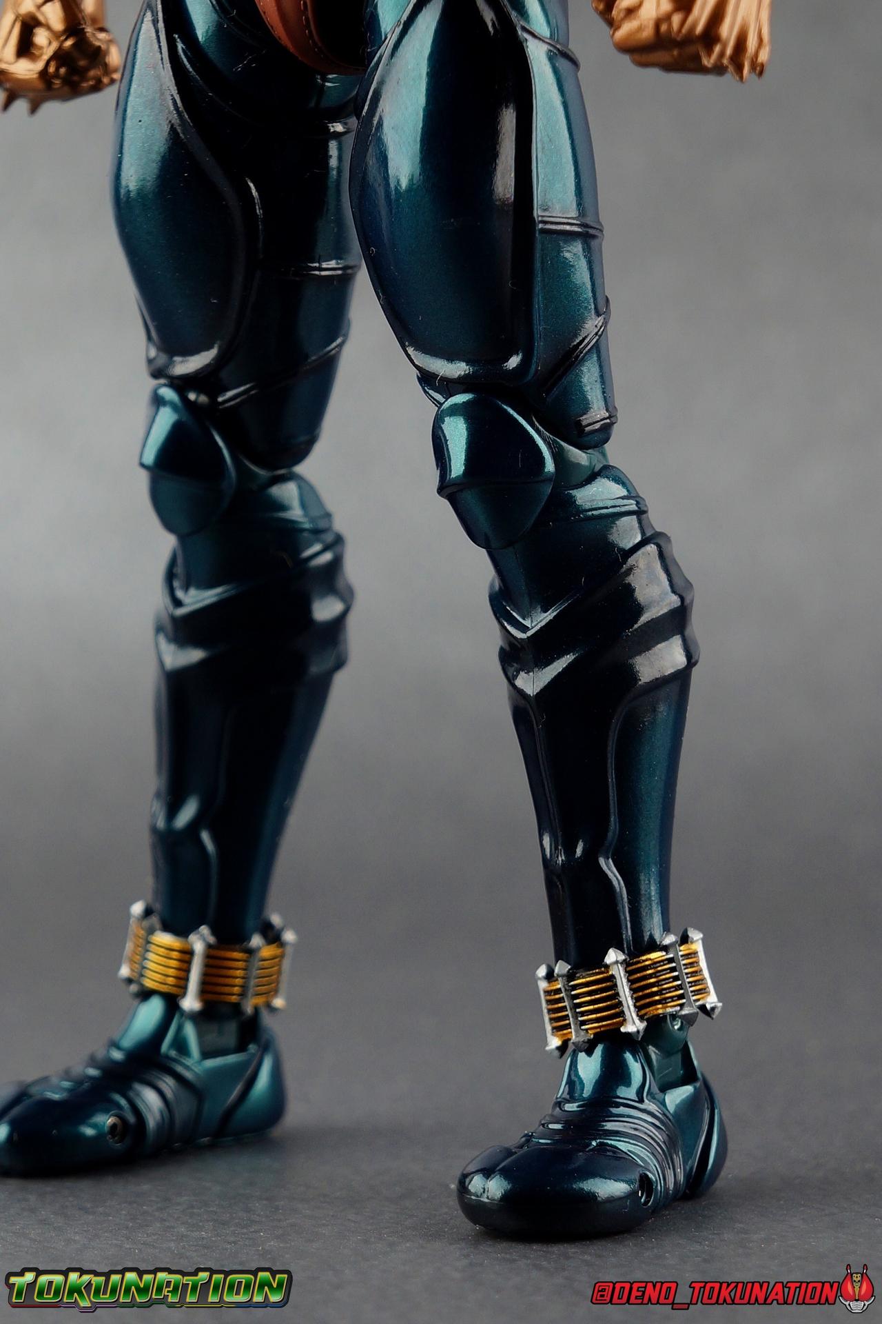 Kamen Rider Hibiki finally joined the S.H. Figuarts line for the first time over 4 years ago. Then last year, Tamashii at last made their second addition from Hibiki's world to this line with Kamen Rider Ibuki. It's taken quite some time for the beautiful Oni Riders to show up in the Shinkocchou Seihou line, but after the recent release of Kamen Rider Todoroki it's befitting that his master has been released as well. Kamen Rider Zanki! Like any Oni master, Zaoumaru Zaitsuhara took on an apprentice. Someone to pass along his skills to, his techniques, and one day his title as well. But the young man once known as Tomizo Todoyama had other plans. This kind warrior wasn't as experienced as his contemporaries Hibiki or Ibuki in the fight against the Makamou, but his dedication to protect others made him the hero he is today. Refusing to inherit his masters title to create his own legacy, Todoyama took on the name Todoroki! Kamen Rider Zanki passed on the remainder of his knowledge, his skills, and the mighty Ongekiken Retsurai to the young Todoroki. But a warrior's journey never ends. Never far from the battlefield, and returning once again to take up the Ongekiken Retsuzan, Zanki continues the fight alongside his disciple, for as long as his body will last! Packaging It's the familiar Shinkocchou Seihou slip cover box once again! Not much can be said about it this time that hasn't been said before. It's gotten a bit stale (to me) over time but it's still a pleasing type of uniform collector's box thats great for storage. Main Figure This review will be nearly identical to that of Todoroki. The two figure's have very very minor physical differences. So don't be surprised to see huge portions of this review be word for word identical to that one. Like Hibiki, Ibuki, & Todoroki, Zanki is a stunning figure. The sculpt of this body type is superb (even 4 years on!), really bringing to life these unique Oni Rider suits. In every way imaginable it captures the look of the on screen suit right down to the textured musculature, and the gloss of the armor really gives in that pleather/vinyl feel of the actual suits. A favorite detail of mine. The design process Seihou's go through has always been much much more involved than that of the standard figuarts line and the best examples of this were the special booklets included with Kabuto & Hibiki. When the design begins with a sort of skeletal inner frame, and builds out what would be like a suit over a real human body like this, you get a much more realistic application of articulation and proportion to the body as a result. Now despite the obvious color changes, Zanki is the same basic mold as Hibiki & Ibuki, but is literally identical to Todoroki even featuring identical articulation placement. When Bandai nails the basic design of the body, it can be truly astounding how outer level cosmetic changes can create a vastly different presentation. But of course, even 4 years later some of my issues with this mold still persist. I've always found the legs to be quite odd. To me, they look really long and at odds with the torso, especially when bent for crouching poses. Something about them looks off. They function well enough, though I've always thought this mold had one of the more strange figuarts hip joints out there. While the part separation undoubtedly gives them great range, the hips look very small by the time you angle them out fully, making the thigh seem huge by comparison. And while the knees function just fine, the feet could be slightly better. Despite being pretty large, they don't easily rest flat on any surface, and the toe bends can be difficult to line up straight. Znki's belt is really loaded up with accessories like his predecessors. This figure comes with a lot and luckily you can store some of it on his belt given the display options you've chosen. When loaded out for static poses, the left hip can be outfitted with a Disc Animal holster with 3 non-removable discs sculpted in. Or you can keep the out of box standard part which is an empty holster for when you want him to hold the discs in hand. Straight out of the box, the center of the belt has Zanki's Ongekishin Zantetsu attached. This rectangular piece is removable to simulate how it combines with the Ongekigen - Retsuzan, though it does not actually combine (a separate piece is included). It can be used with any Oni Rider that has a similarly designed belt. In Zanki's original role as Todoroki's master, his belt featured the Ongekishin - Raigou, but since training Todoroki it has been passed down to him. The upper body is identical to Todoroki as well, just removing the red string accents and replacing them with gold. This bandoleer like sash is still my favorite part of the Zanki/Todoroki design. The upper and lower halves of the torso move independent of one another, though it's a tight fit to get either to move very far. I've always felt this body type was a bit stiff, but it gets the job done very nicely still. Zanki's arms are basically identical to all of the other Oni Riders, though like the rest of the body these are painted in a nice glossy deep green. The silver fade from Todoroki has been replaced by a gorgeous gold on Zanki, as well as further red accents. The left shoulder pad does impact the bandoleer at times so be careful not to scratch it, but thankfully the pads don't pop off frequently as they did with Ibuki. The left wrist also features the Henshin Kigen Onka. This one is in it's closed form, but an open version of the accessory is included to replicate Zanki's transformation. And like others, but particularly Todoroki, Zanki has a stunningly accurate headsculpt. All 4 riders have insanely well detailed sculpts, but the Oni face on Todoroki's head is just top notch. The horn protrusion on his head is actually quite sharp as well, so watch out there. Zanki's head is of course a real nice mostly bronze repaint of Todoroki and it's just stunning on this mold. Th