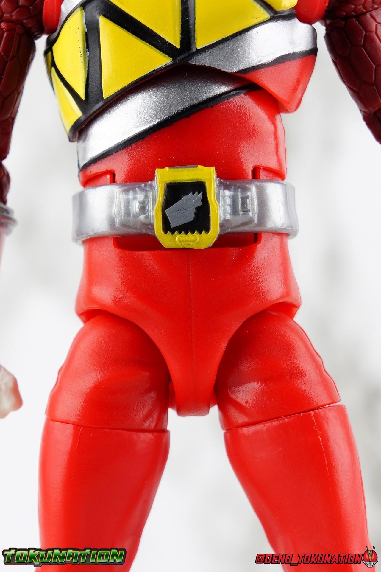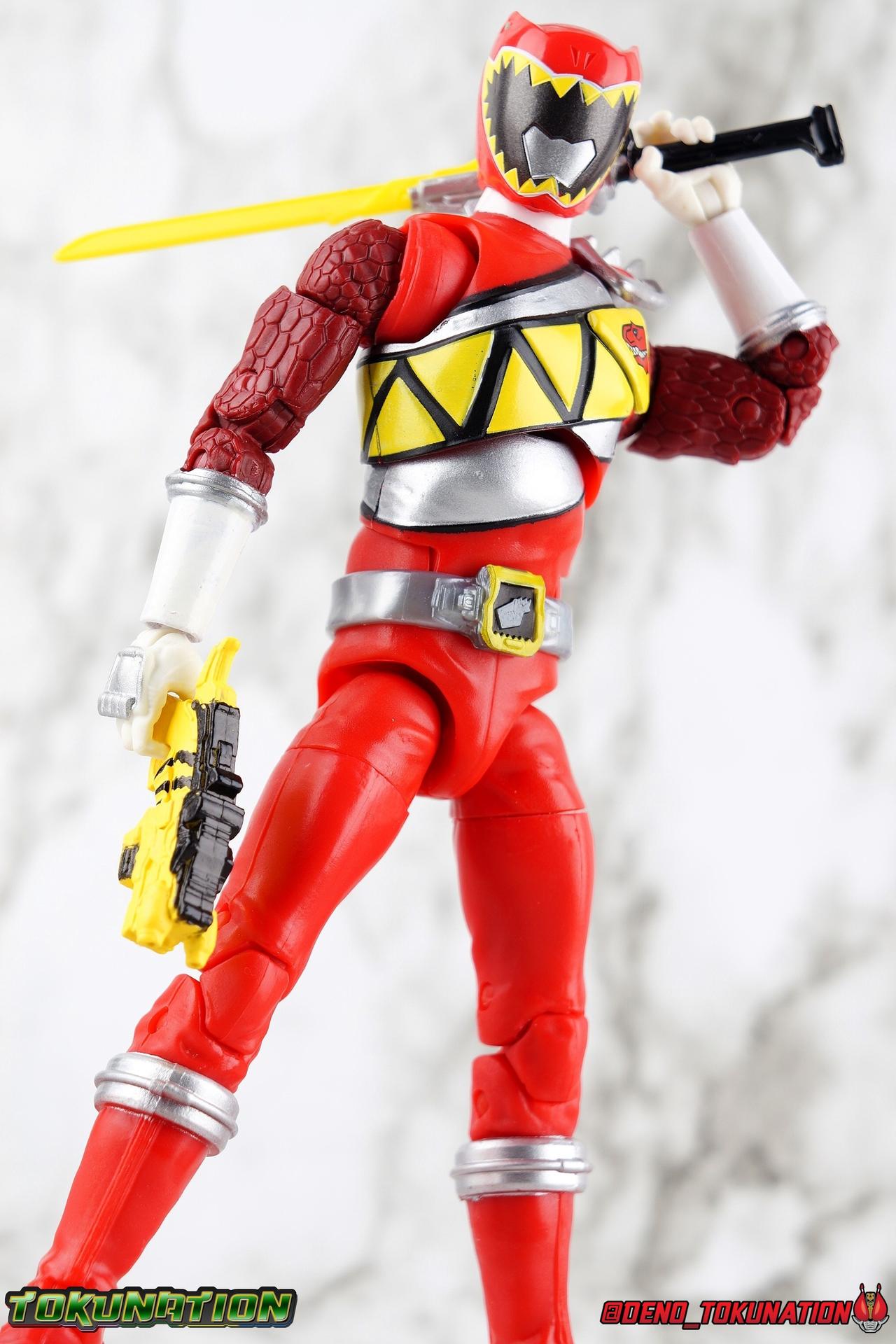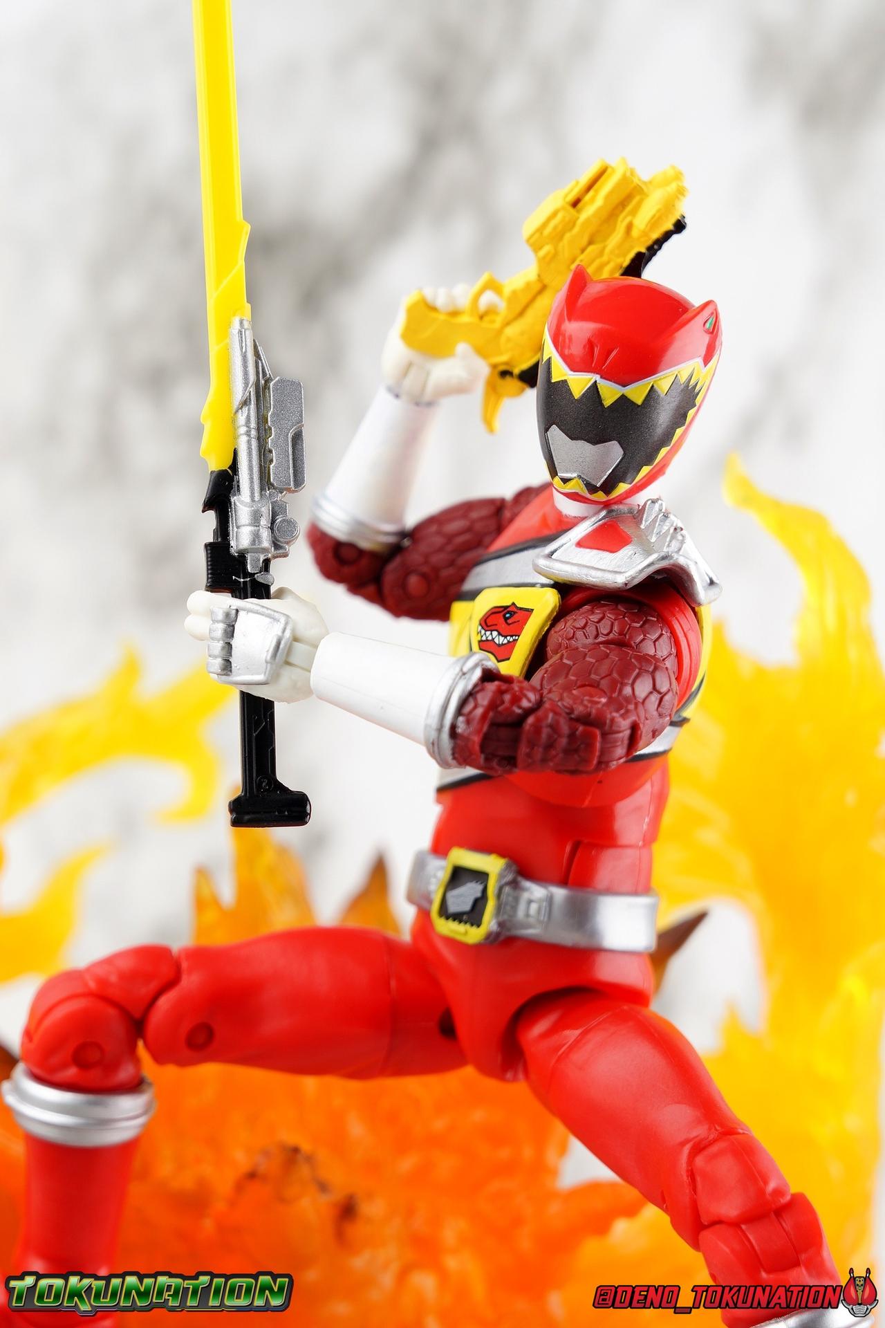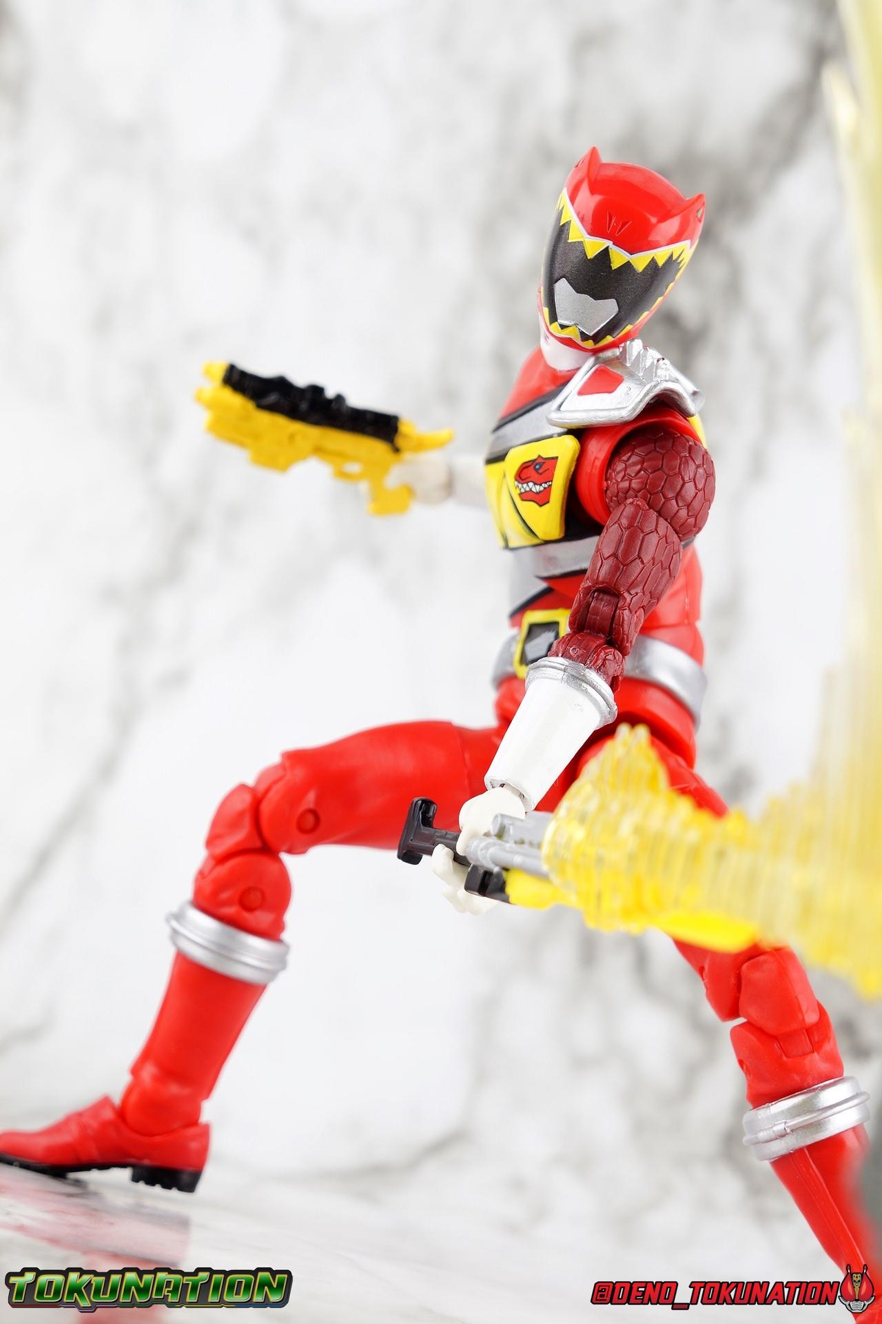 Arriving in Amber Beach on a mission to find his long lost father, Tyler Navarro could never imagine what really lay ahead for him. By chance, he and his new friends come into contact with the Energems, ancient crystals that channel the Morphin Grid and the energy of the universe. Once entrusted to the ancient dinosaurs of the past by the mysterious alien Keeper, these Energems have chosen Tyler and the others to be the next generation of Power Rangers! To defend the Earth, to defeat the villainous Sledge and his crew, to unlock the ultimate power of the universe, in a world full of strife the Dino Charge Red Ranger fights to survive! Packaging As we are all pretty familiar with the line by now, I'm sure I probably don't need to go through my usual list of reasons why it's awesome. Hasbro was keen to make sure these appealed to collectors and fans of the franchise from throughout it's various eras. And they also really pop thanks in no small part to some wonderful box art, lovingly crafted by artist Tom Whalen aka @strongstufftom on twitter. His artwork is breathtaking, and makes these figure's feel like just a bit more of a passion project from the folks at Hasbro. Main Figure I know. This one is way overdue. Lightning Collection has really come along in the last roughly year, moving at a pretty brisk clip. And in trying to catch up on previous releases I've finally gotten back around to Dino Charge Red. This was a figure I'd originally written off as unnecessary, largely due to the Kyoryu Red S.H. Figuart I had. My thinking on the matter has really swung around the other way since however. While LC figures will never replicate the same quality and engineering of SHF's, it's just so clear that they have such great play value for their price. I've been slowly selling off my Sentai SHF's and being pretty happy with the LC's I've replaced them with. Once I finally gave Dino Charge Red a chance, I was not disappointed. As the last figure from Wave 1 that I've reviewed, in fact having reviewed all of Wave 1 2 and half of 3 by now, I didn't expect the Red Ranger to blow me away. I'm happy to report that this is a very solid figure though, and I think people have really been sleeping on the quality of this mold. Though the recently released Dino Charge Gold Ranger has been divisive, people have been mostly quiet about Red. Like most figures in the line this is a well engineered and quite enjoyable figure. Standard articulation cuts in this line make most any figure feel good in hand and DC Red is no different. The standard rocker ratchet ankles work well as always, though on my copy the ankle ratchets are extremely tight making it very difficult to move them forward. I felt like I might snap the peg off but so far nothing like that has happened. DC Red still has the boot cuff style swivel below the knee though it's much less obvious because of the largely uniform red suit. The knees are the same typical double bend and although I know some collectors aren't fond of the sort of square shaped knee pad that's left from bending the leg, it's really the most sensible design for functionality. The standard hinged hips are present as well and they strike a nice balance of firm & flexible and are helped along in posing by the thigh swivel. Around his waste, Tyler has the signature Dino Charge Dino Com buckle. While it isn't fully painted, the details are sculpted and painted well enough to communicate what it is. The belt sits up just a bit high, in front of the ab crunch, but can be slid down a bit back out of the way. As with most any Lightning figure, DC Red's ab crunch is the best part of the upper body, really giving him some dynamic range. The floating ball jointed upper body is of course quite nice as well. The difference here is that unlike many rangers in the line who have either so far had a lot of chest armor over this section, or a less intricate design on the chest, Dino Charge Red has that elaborate sash design. And not only is it painted but also sculpted into the torso coming down from the upper body and back across the lower torso as well. Undoubtedly much of the cost for sculpting and paint apps went into this area of the figure, perhaps explaining some of the other missing details on it. I particularly appreciate how well the "Rexy" logo on Tyler's chest is painted given it's small scale. The upper body really is pretty great despite some minor discrepancies. The arms are based around the standard butterfly shoulder joint, though the chunks of torso used for it on this figure seem larger to me. Each arm gets some pretty great detailing in the form of sculpted in dino scales coming down from the shoulder peg and onto the forearms. We still get the bicep swivel we love, the double jointed elbow we need, and the wrists that get that the job done. Finally that brings us to the Red Ranger's helmet. Honestly this one of the more spot on sculpts in the line. The teeth accenting the visor are slightly off, but overall I find this to be a really well done figure in the line. Since DC Red has a pretty standard upper body and neck there's no danger of losing an articulation for the head so it really works like the best of the line. The gallery beloow features a few cameos I hope you'll enjoy. The S.H. Figuarts Kyoryugers join LC Red for some group shots, and we've got some good comparisons of this figure to Kyoryu Red specifically. Further below we also feature the Kyoryuger Deinochaser toy, which had quite a bit more functionality than Bandai's Dino Cycles released for Dino Charge. Accessories Like a lot of this line, the Dino Charge Red Ranger comes with a smattering of great accessories: 1 - Dino Charge Morpher. This yellow/black blaster is the US equivalent of the Gaburevolver from Kyoryuger. While I know the comparison isn't entirely fair I did include a comparison of the two just for some contrast. While neither of them can function or accept Dino Chargers/Zyudenchi and the Dino Charge M