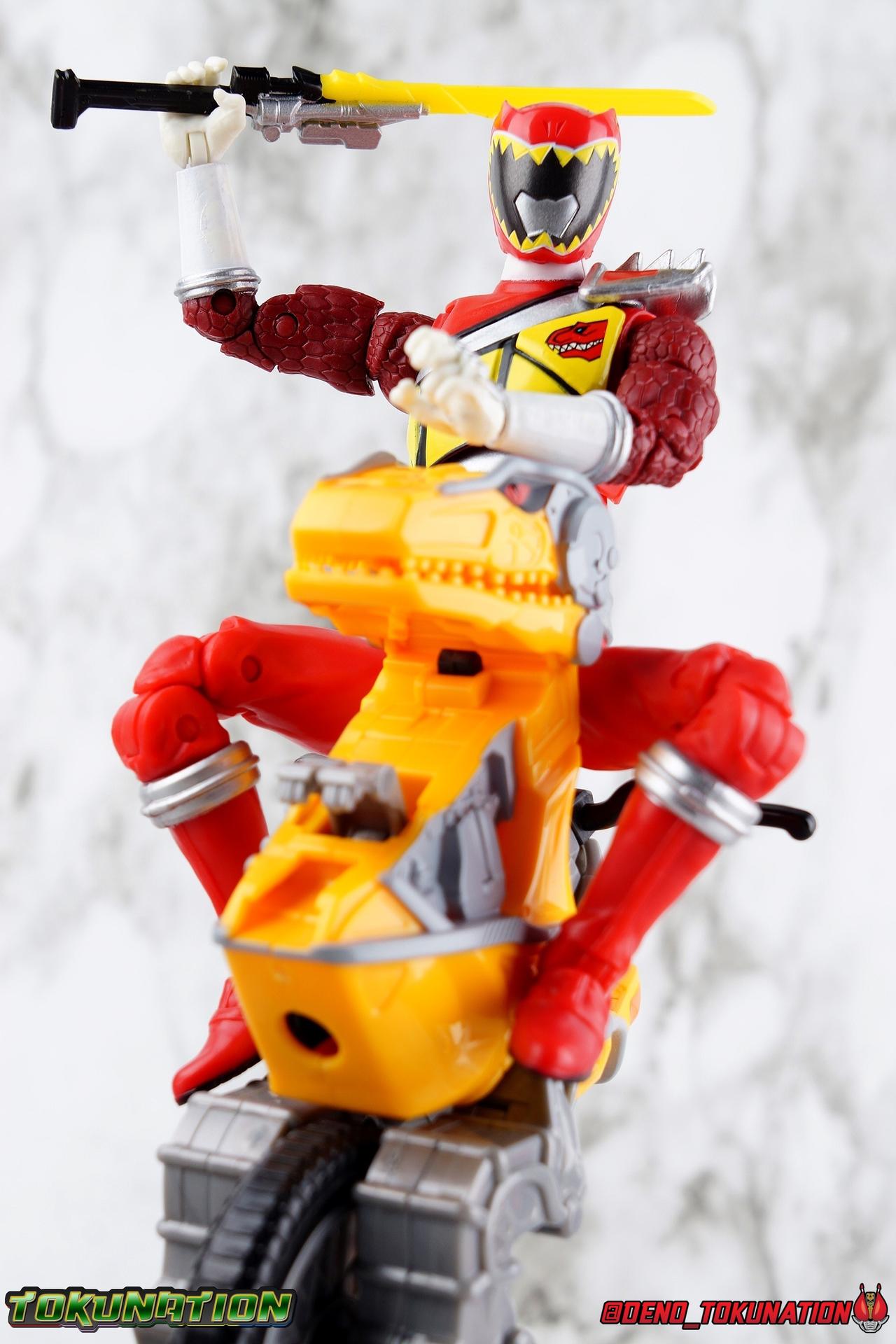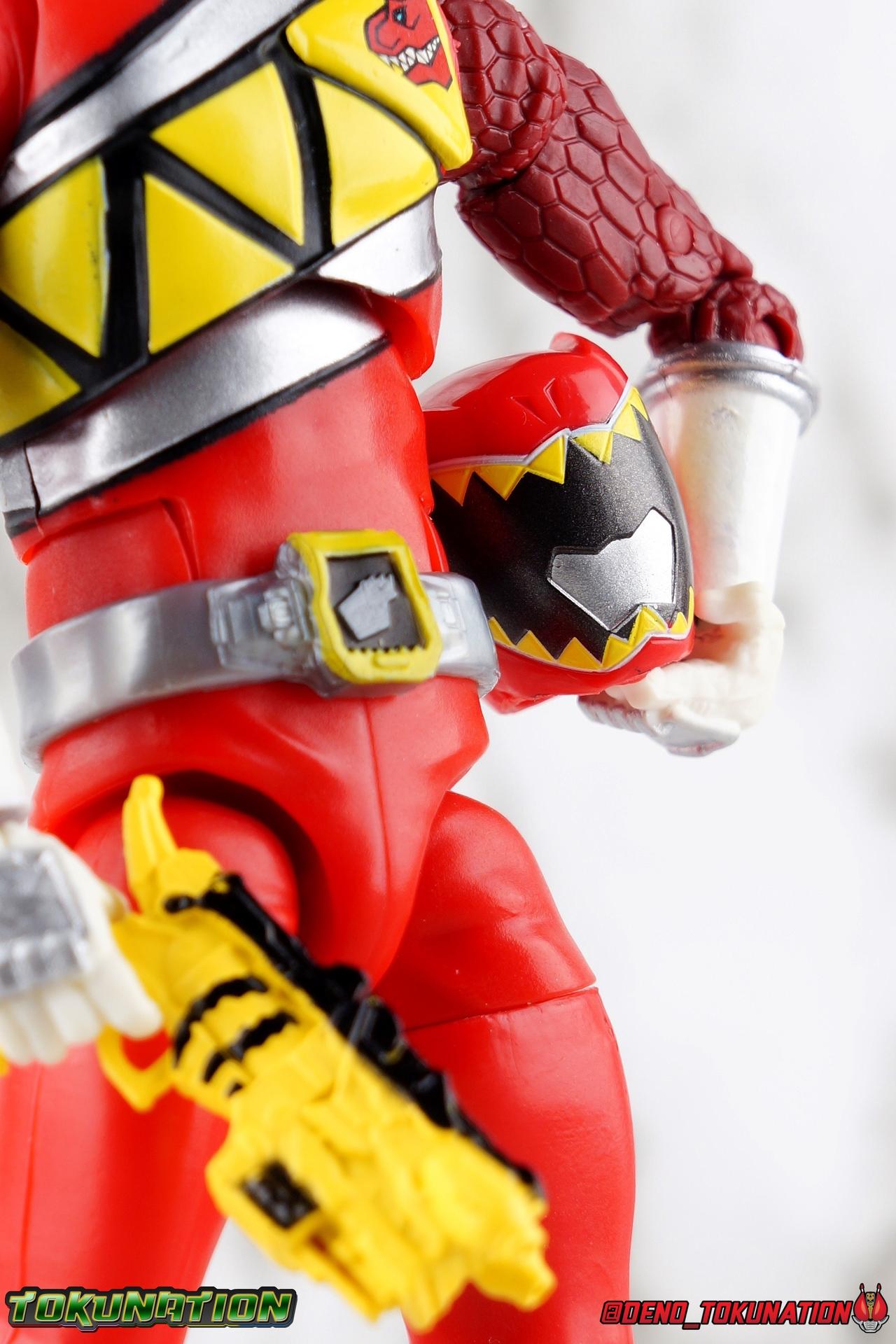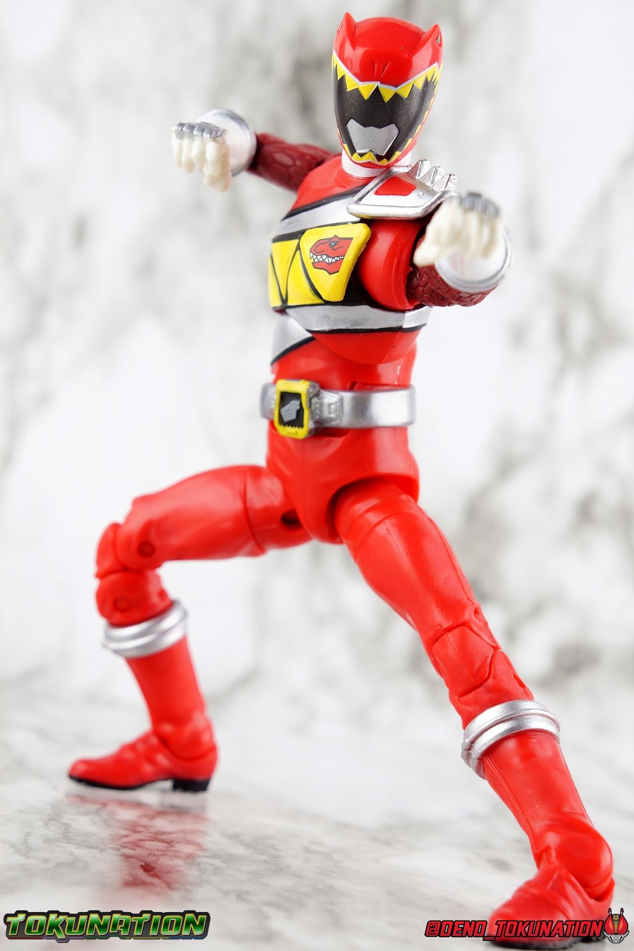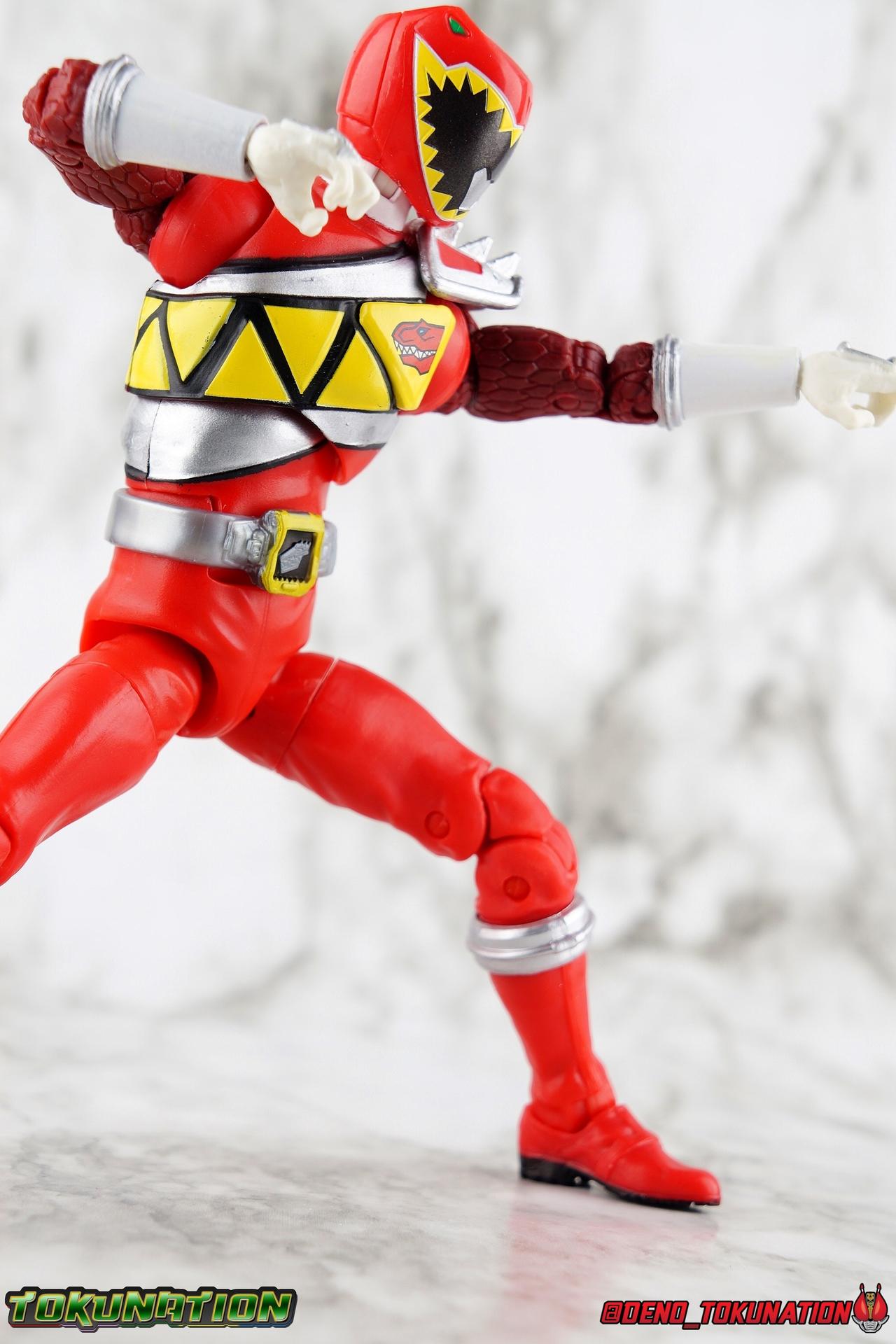 Arriving in Amber Beach on a mission to find his long lost father, Tyler Navarro could never imagine what really lay ahead for him. By chance, he and his new friends come into contact with the Energems, ancient crystals that channel the Morphin Grid and the energy of the universe. Once entrusted to the ancient dinosaurs of the past by the mysterious alien Keeper, these Energems have chosen Tyler and the others to be the next generation of Power Rangers! To defend the Earth, to defeat the villainous Sledge and his crew, to unlock the ultimate power of the universe, in a world full of strife the Dino Charge Red Ranger fights to survive! Packaging As we are all pretty familiar with the line by now, I'm sure I probably don't need to go through my usual list of reasons why it's awesome. Hasbro was keen to make sure these appealed to collectors and fans of the franchise from throughout it's various eras. And they also really pop thanks in no small part to some wonderful box art, lovingly crafted by artist Tom Whalen aka @strongstufftom on twitter. His artwork is breathtaking, and makes these figure's feel like just a bit more of a passion project from the folks at Hasbro. Main Figure I know. This one is way overdue. Lightning Collection has really come along in the last roughly year, moving at a pretty brisk clip. And in trying to catch up on previous releases I've finally gotten back around to Dino Charge Red. This was a figure I'd originally written off as unnecessary, largely due to the Kyoryu Red S.H. Figuart I had. My thinking on the matter has really swung around the other way since however. While LC figures will never replicate the same quality and engineering of SHF's, it's just so clear that they have such great play value for their price. I've been slowly selling off my Sentai SHF's and being pretty happy with the LC's I've replaced them with. Once I finally gave Dino Charge Red a chance, I was not disappointed. As the last figure from Wave 1 that I've reviewed, in fact having reviewed all of Wave 1 2 and half of 3 by now, I didn't expect the Red Ranger to blow me away. I'm happy to report that this is a very solid figure though, and I think people have really been sleeping on the quality of this mold. Though the recently released Dino Charge Gold Ranger has been divisive, people have been mostly quiet about Red. Like most figures in the line this is a well engineered and quite enjoyable figure. Standard articulation cuts in this line make most any figure feel good in hand and DC Red is no different. The standard rocker ratchet ankles work well as always, though on my copy the ankle ratchets are extremely tight making it very difficult to move them forward. I felt like I might snap the peg off but so far nothing like that has happened. DC Red still has the boot cuff style swivel below the knee though it's much less obvious because of the largely uniform red suit. The knees are the same typical double bend and although I know some collectors aren't fond of the sort of square shaped knee pad that's left from bending the leg, it's really the most sensible design for functionality. The standard hinged hips are present as well and they strike a nice balance of firm & flexible and are helped along in posing by the thigh swivel. Around his waste, Tyler has the signature Dino Charge Dino Com buckle. While it isn't fully painted, the details are sculpted and painted well enough to communicate what it is. The belt sits up just a bit high, in front of the ab crunch, but can be slid down a bit back out of the way. As with most any Lightning figure, DC Red's ab crunch is the best part of the upper body, really giving him some dynamic range. The floating ball jointed upper body is of course quite nice as well. The difference here is that unlike many rangers in the line who have either so far had a lot of chest armor over this section, or a less intricate design on the chest, Dino Charge Red has that elaborate sash design. And not only is it painted but also sculpted into the torso coming down from the upper body and back across the lower torso as well. Undoubtedly much of the cost for sculpting and paint apps went into this area of the figure, perhaps explaining some of the other missing details on it. I particularly appreciate how well the "Rexy" logo on Tyler's chest is painted given it's small scale. The upper body really is pretty great despite some minor discrepancies. The arms are based around the standard butterfly shoulder joint, though the chunks of torso used for it on this figure seem larger to me. Each arm gets some pretty great detailing in the form of sculpted in dino scales coming down from the shoulder peg and onto the forearms. We still get the bicep swivel we love, the double jointed elbow we need, and the wrists that get that the job done. Finally that brings us to the Red Ranger's helmet. Honestly this one of the more spot on sculpts in the line. The teeth accenting the visor are slightly off, but overall I find this to be a really well done figure in the line. Since DC Red has a pretty standard upper body and neck there's no danger of losing an articulation for the head so it really works like the best of the line. The gallery beloow features a few cameos I hope you'll enjoy. The S.H. Figuarts Kyoryugers join LC Red for some group shots, and we've got some good comparisons of this figure to Kyoryu Red specifically. Further below we also feature the Kyoryuger Deinochaser toy, which had quite a bit more functionality than Bandai's Dino Cycles released for Dino Charge. Accessories Like a lot of this line, the Dino Charge Red Ranger comes with a smattering of great accessories: 1 - Dino Charge Morpher. This yellow/black blaster is the US equivalent of the Gaburevolver from Kyoryuger. While I know the comparison isn't entirely fair I did include a comparison of the two just for some contrast. While neither of them can function or accept Dino Chargers/Zyudenchi and the Dino Charge M