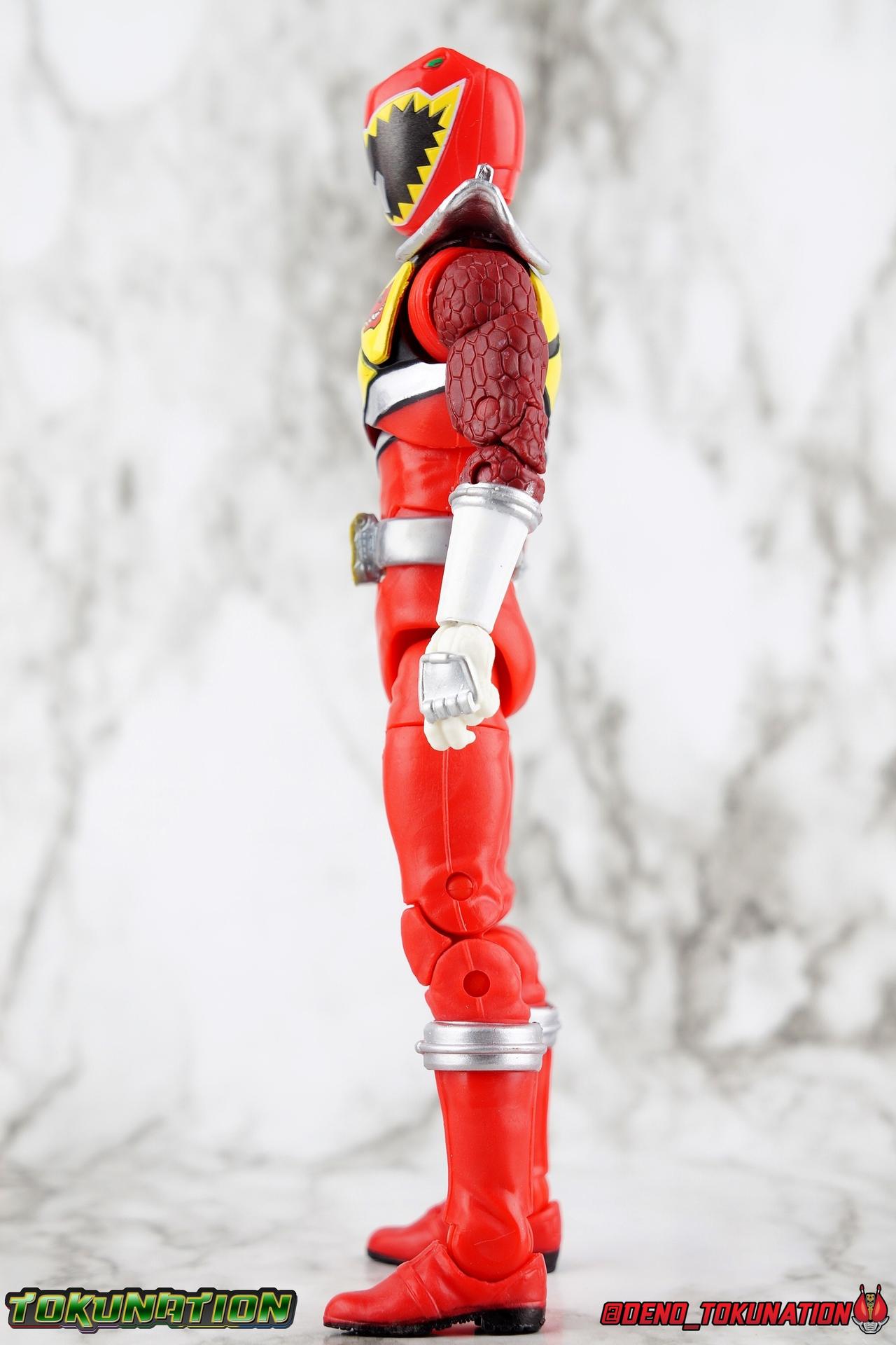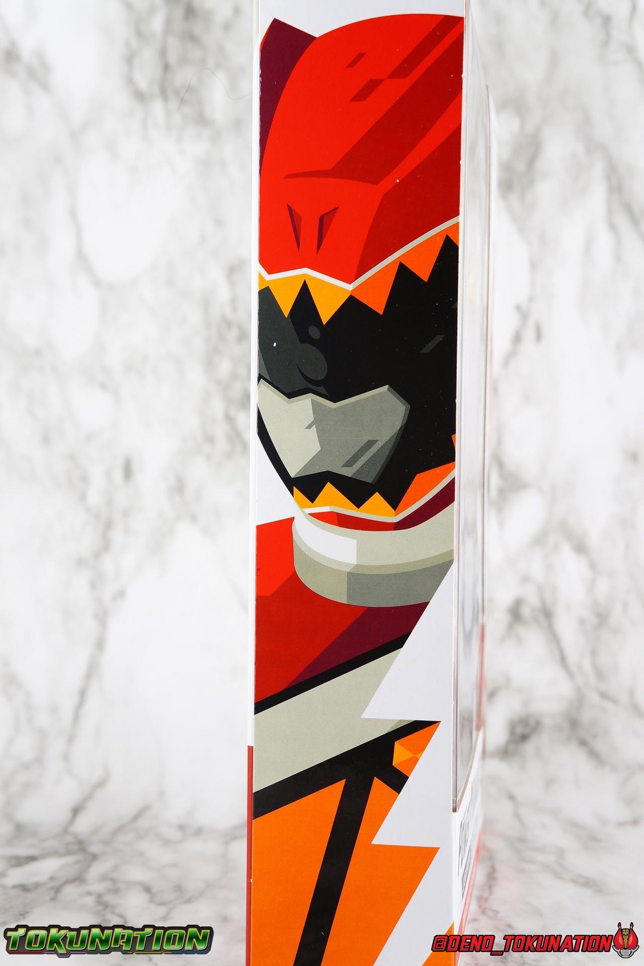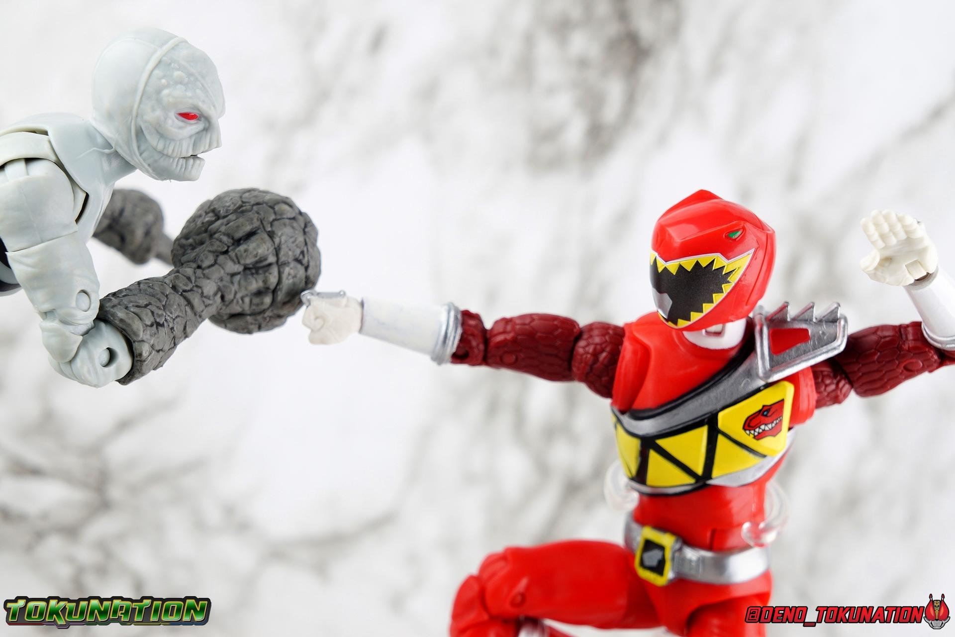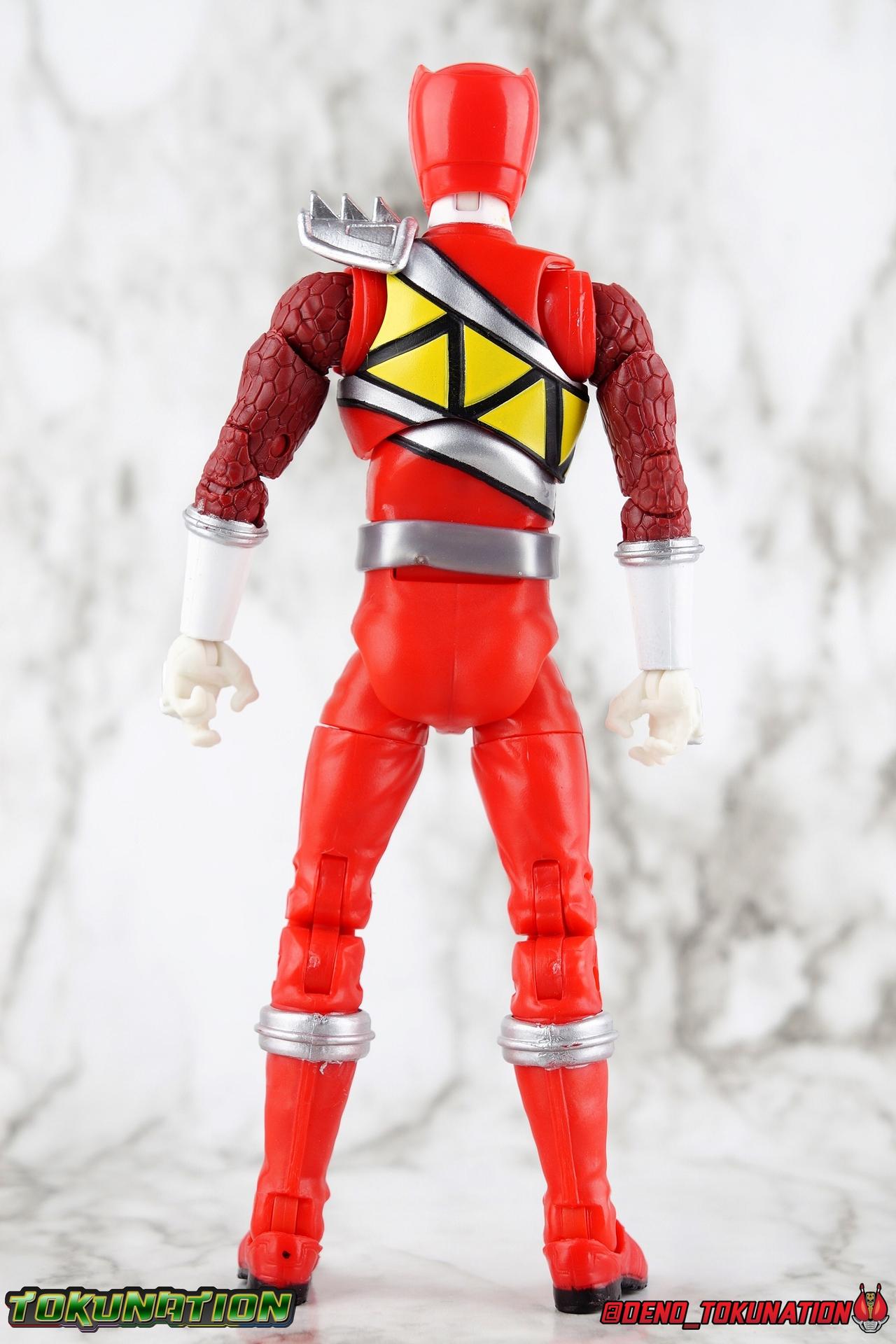 Arriving in Amber Beach on a mission to find his long lost father, Tyler Navarro could never imagine what really lay ahead for him. By chance, he and his new friends come into contact with the Energems, ancient crystals that channel the Morphin Grid and the energy of the universe. Once entrusted to the ancient dinosaurs of the past by the mysterious alien Keeper, these Energems have chosen Tyler and the others to be the next generation of Power Rangers! To defend the Earth, to defeat the villainous Sledge and his crew, to unlock the ultimate power of the universe, in a world full of strife the Dino Charge Red Ranger fights to survive! Packaging As we are all pretty familiar with the line by now, I'm sure I probably don't need to go through my usual list of reasons why it's awesome. Hasbro was keen to make sure these appealed to collectors and fans of the franchise from throughout it's various eras. And they also really pop thanks in no small part to some wonderful box art, lovingly crafted by artist Tom Whalen aka @strongstufftom on twitter. His artwork is breathtaking, and makes these figure's feel like just a bit more of a passion project from the folks at Hasbro. Main Figure I know. This one is way overdue. Lightning Collection has really come along in the last roughly year, moving at a pretty brisk clip. And in trying to catch up on previous releases I've finally gotten back around to Dino Charge Red. This was a figure I'd originally written off as unnecessary, largely due to the Kyoryu Red S.H. Figuart I had. My thinking on the matter has really swung around the other way since however. While LC figures will never replicate the same quality and engineering of SHF's, it's just so clear that they have such great play value for their price. I've been slowly selling off my Sentai SHF's and being pretty happy with the LC's I've replaced them with. Once I finally gave Dino Charge Red a chance, I was not disappointed. As the last figure from Wave 1 that I've reviewed, in fact having reviewed all of Wave 1 2 and half of 3 by now, I didn't expect the Red Ranger to blow me away. I'm happy to report that this is a very solid figure though, and I think people have really been sleeping on the quality of this mold. Though the recently released Dino Charge Gold Ranger has been divisive, people have been mostly quiet about Red. Like most figures in the line this is a well engineered and quite enjoyable figure. Standard articulation cuts in this line make most any figure feel good in hand and DC Red is no different. The standard rocker ratchet ankles work well as always, though on my copy the ankle ratchets are extremely tight making it very difficult to move them forward. I felt like I might snap the peg off but so far nothing like that has happened. DC Red still has the boot cuff style swivel below the knee though it's much less obvious because of the largely uniform red suit. The knees are the same typical double bend and although I know some collectors aren't fond of the sort of square shaped knee pad that's left from bending the leg, it's really the most sensible design for functionality. The standard hinged hips are present as well and they strike a nice balance of firm & flexible and are helped along in posing by the thigh swivel. Around his waste, Tyler has the signature Dino Charge Dino Com buckle. While it isn't fully painted, the details are sculpted and painted well enough to communicate what it is. The belt sits up just a bit high, in front of the ab crunch, but can be slid down a bit back out of the way. As with most any Lightning figure, DC Red's ab crunch is the best part of the upper body, really giving him some dynamic range. The floating ball jointed upper body is of course quite nice as well. The difference here is that unlike many rangers in the line who have either so far had a lot of chest armor over this section, or a less intricate design on the chest, Dino Charge Red has that elaborate sash design. And not only is it painted but also sculpted into the torso coming down from the upper body and back across the lower torso as well. Undoubtedly much of the cost for sculpting and paint apps went into this area of the figure, perhaps explaining some of the other missing details on it. I particularly appreciate how well the "Rexy" logo on Tyler's chest is painted given it's small scale. The upper body really is pretty great despite some minor discrepancies. The arms are based around the standard butterfly shoulder joint, though the chunks of torso used for it on this figure seem larger to me. Each arm gets some pretty great detailing in the form of sculpted in dino scales coming down from the shoulder peg and onto the forearms. We still get the bicep swivel we love, the double jointed elbow we need, and the wrists that get that the job done. Finally that brings us to the Red Ranger's helmet. Honestly this one of the more spot on sculpts in the line. The teeth accenting the visor are slightly off, but overall I find this to be a really well done figure in the line. Since DC Red has a pretty standard upper body and neck there's no danger of losing an articulation for the head so it really works like the best of the line. The gallery beloow features a few cameos I hope you'll enjoy. The S.H. Figuarts Kyoryugers join LC Red for some group shots, and we've got some good comparisons of this figure to Kyoryu Red specifically. Further below we also feature the Kyoryuger Deinochaser toy, which had quite a bit more functionality than Bandai's Dino Cycles released for Dino Charge. Accessories Like a lot of this line, the Dino Charge Red Ranger comes with a smattering of great accessories: 1 - Dino Charge Morpher. This yellow/black blaster is the US equivalent of the Gaburevolver from Kyoryuger. While I know the comparison isn't entirely fair I did include a comparison of the two just for some contrast. While neither of them can function or accept Dino Chargers/Zyudenchi and the Dino Charge M
