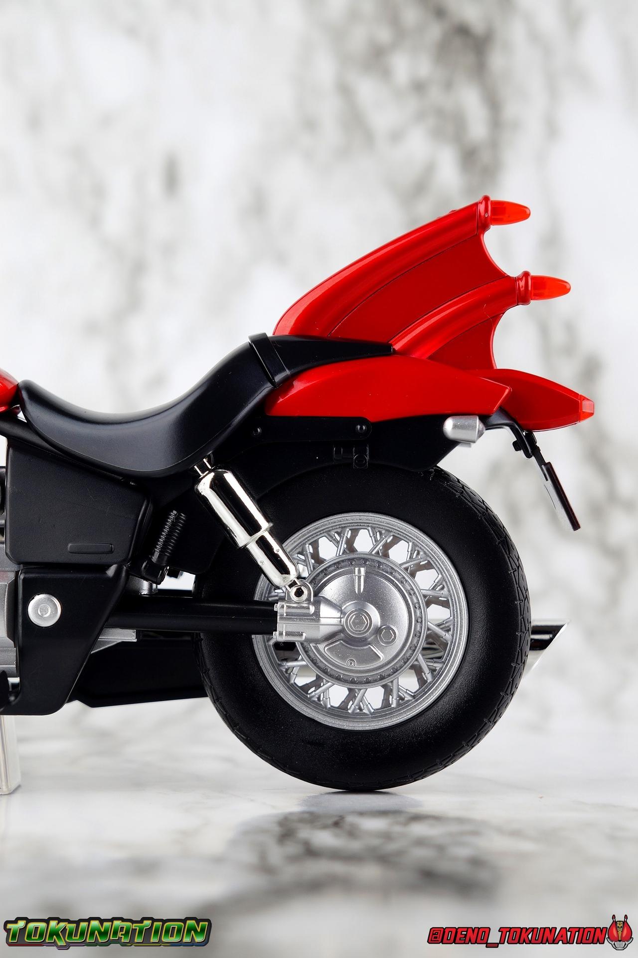 Wataru Kurenai was fated to be king. (No, not like you Zi-O!) As Kamen Rider Kiva, Wataru destroyed the Fangire's threatening humanity while still finding time to craft beautiful instruments as his father had before him. But what's a Kamen Rider without his well, ride? Overcoming his own fears and anxieties, Wataru discovered what real self reliance and confidence could do to transform a person. Though the whimsical talking belt certainly helps too! But what is a Kamen Rider without their, well, ride? Only a few short months after releasing the long demanded Shinkocchou Seihou Kiva, Tamashii has satisfied collectors once again by releasing not only his Rider Machine the Machin Kivaa, but also his signature throne and the Bloody Rose violin he inherited form his father! This massive accessory set completes any Kiva collection, and today we're breaking down the whole thing for a full gallery/review. Main Figure The biggest item, and maybe the big draw of this set if of course the Machine Kivaa. As I mentioned above, and I've said many time before, what's a rider without their ride? I find myself almost compelled to buy every Kamen Rider's bike to accompany their figuart. So seeing the Kivaa happen so soon after Kiva himself was incredibly satisfying. It's easy to look past bike and vehicle releases like this when they don't have transformations or action gimmicks as DX toy equivalents often do. We have to look more at the presentation and craftsmanship to get sense of value from these things. And in that regard, the Machine Kivaa is unmatched. Of the myriad number of S.H. Figuarts and accompanying vehicles I've handled in the last decade, the Kivaa is one of the most stunning. Kiva's bike is a bit unique among Rider Machine in that it's a street style bike (ala Hibiki) rather than a dirt biks (ala nearly everyone else). Based on a Honda Shadow 750, the curvature of the original chasis and design shine through the additional elements. It's a gorgeous standard bike anyway, but this facelift it's gotten as Kivaa is something else. The Figuart is superbly detailed, right down to the tread on each tire. No detail appears to be missing. Even the Speedometer is present thanks to a very crisp and very tiny label permanently affixed to it. The grooves on the engine are well defined and have depth. That gorgeous blood red glossy paint reflects light like the real thing from any angle. And the silver chrome that marks the handlebars and mirrors as well as the exhaust system, is truly magnificent. If you zoom in and look closely, you can even see my camera staring back at you in the chrome. It's that good! When Tamashii gets a chrome application right boy do they ever get it right. But more than just how it's detailed, this bike lives up to expectation as a magnificent vehicle for Kiva. It took 10 years of S.H. Figuarts to finally get Kiva himself, so when his bike arrived as well, it had to be a match made in heaven. And it is. Seihou molds are engineered so well, to function as closely to real people in actual suits as possible, that this figure looks natural and downright like a real person when seated on the bike. These two are a perfect pairing many years in the making in from Tamashii. On a funnier note, it's interesting that in the context of the series itself, we know that the Machine Kivaa is both sentient and houses the brain of a horse (presumably Fangire-like) creature. But the bike is oh so clearly designed like a bat on wheels. The blood red coloring of the bike would even helps suggest that link, but hey it's a horse apparently. Accessories While the Machine Kivaa itself is definitely a huge draw, if you're a big fan of Kamen Rider Kiva there's a good chance that the included accessories are what really sold you on the set: 1 - clear pedestal. I was confused at first when I saw this thing, but it's a brilliant little part. Rather than going for the mostly standard wheel base, or even including an optional Tamashii Stage adapter, the Machine Kivaa comes with it's own unique part. This small rectangle with a single peg on it plugs directly into the undercarriage of the Kivaa, with a couple grooves cut into it to work around the exhaust pipes even. This little block provides the most stable and balanced way to display an SHF bike I've ever seen. It's so simple, but brilliant and unobtrusive. 1 - Throne. While throne may be a bit more generous than calling it what it actually is, a fancy chair, it certainly looks regal. And with Kiva seated in this throne, it's hard to imagine doing anything else with him when he's not on the Machine Kivaa instead. Much in the same way Kiva looks like a real person riding a real motorcycle while sat on the Kivaa, in the Throne he looks much like the king he is. 1 - Bloody Rose violin & bow. Absolutely the signature item needed for any Kiva collection. I was astounded that the Bloody Rose wasn't included with Kiva himself, but waiting until now to include it with the Machine Kivaa is pretty brilliant. While basically any 1/12 violin would work fine with the figure, including the real deal in vehicle/accessory pack like this is a brilliant selling point to most fans. A gorgeously detailed accessory, it feels right at home in Wataru's hands. 2 - sets of additional hands. While the Seihou Kiva Figuart itself came with 2.5 sets of hands, it didn't include any specific to the accessories in this set, which at the time hadn't even been announced yet. So the added value of the sets we get here is a bonus on top of the excellent main item.s We get one set of Machin Kivaa hands so that Kiva's fingers are extended to grip the handlebars properly. And we get one asymmetrical set for holding the Bloody Rose & bow. The left hand for the rose, the right for the bow. Be careful putting the rose in hand though, it's pretty thin plastic and the gap it goes in isn't very wide. Always best to be careful. Considering this is a huge accessory set anyway, I can't imagine anything