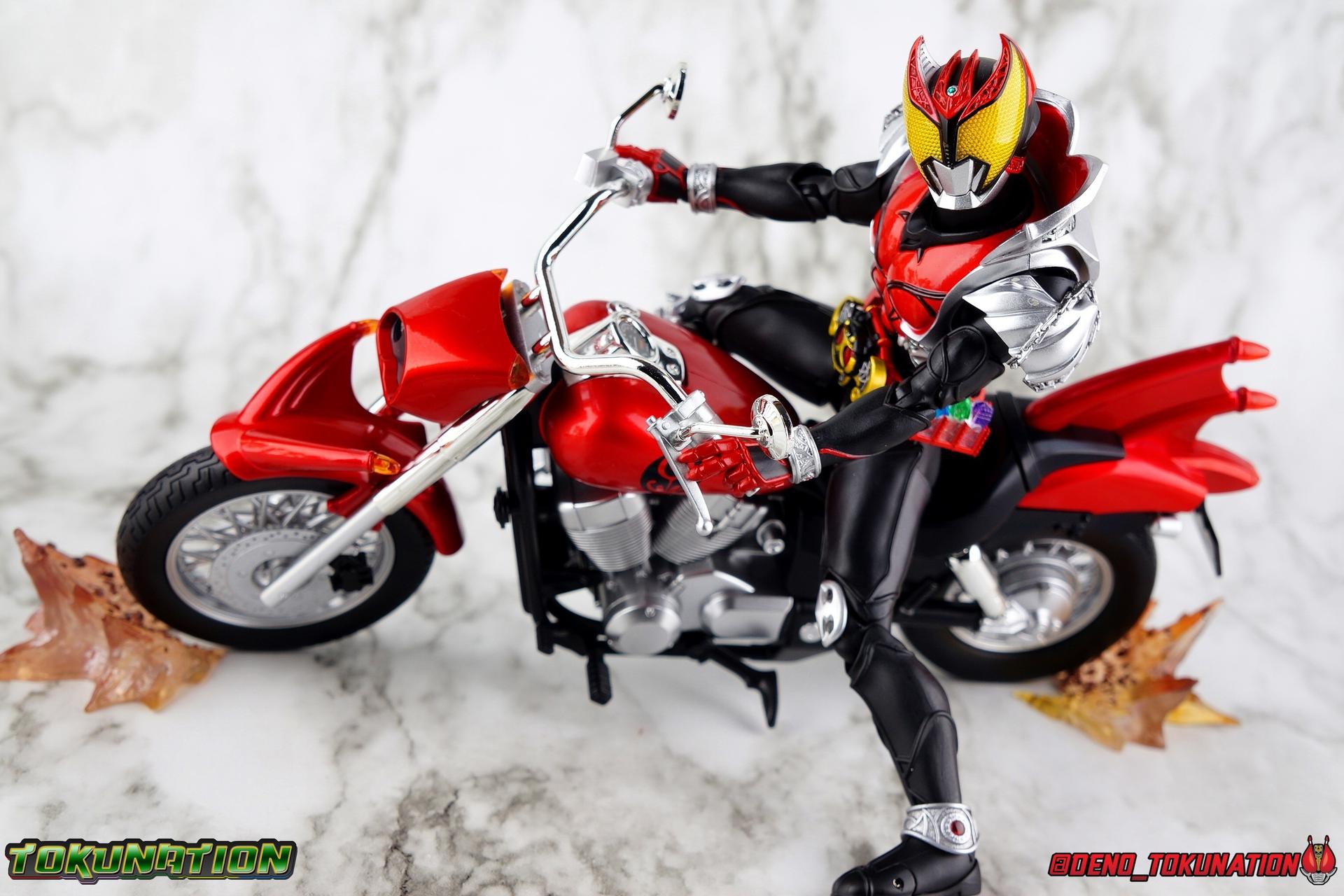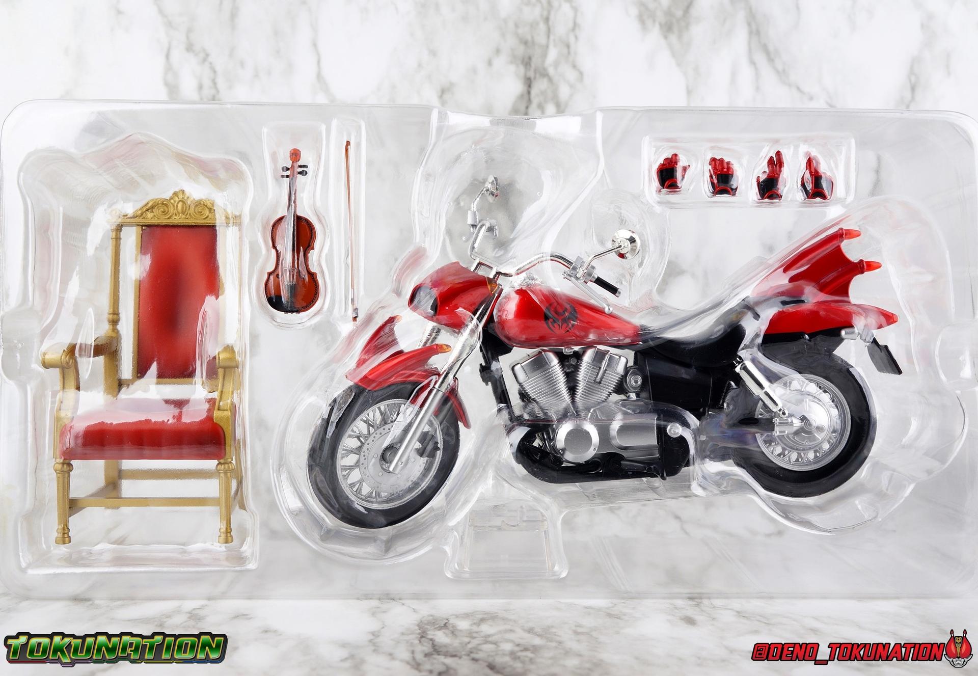 Wataru Kurenai was fated to be king. (No, not like you Zi-O!) As Kamen Rider Kiva, Wataru destroyed the Fangire's threatening humanity while still finding time to craft beautiful instruments as his father had before him. But what's a Kamen Rider without his well, ride? Overcoming his own fears and anxieties, Wataru discovered what real self reliance and confidence could do to transform a person. Though the whimsical talking belt certainly helps too! But what is a Kamen Rider without their, well, ride? Only a few short months after releasing the long demanded Shinkocchou Seihou Kiva, Tamashii has satisfied collectors once again by releasing not only his Rider Machine the Machin Kivaa, but also his signature throne and the Bloody Rose violin he inherited form his father! This massive accessory set completes any Kiva collection, and today we're breaking down the whole thing for a full gallery/review. Main Figure The biggest item, and maybe the big draw of this set if of course the Machine Kivaa. As I mentioned above, and I've said many time before, what's a rider without their ride? I find myself almost compelled to buy every Kamen Rider's bike to accompany their figuart. So seeing the Kivaa happen so soon after Kiva himself was incredibly satisfying. It's easy to look past bike and vehicle releases like this when they don't have transformations or action gimmicks as DX toy equivalents often do. We have to look more at the presentation and craftsmanship to get sense of value from these things. And in that regard, the Machine Kivaa is unmatched. Of the myriad number of S.H. Figuarts and accompanying vehicles I've handled in the last decade, the Kivaa is one of the most stunning. Kiva's bike is a bit unique among Rider Machine in that it's a street style bike (ala Hibiki) rather than a dirt biks (ala nearly everyone else). Based on a Honda Shadow 750, the curvature of the original chasis and design shine through the additional elements. It's a gorgeous standard bike anyway, but this facelift it's gotten as Kivaa is something else. The Figuart is superbly detailed, right down to the tread on each tire. No detail appears to be missing. Even the Speedometer is present thanks to a very crisp and very tiny label permanently affixed to it. The grooves on the engine are well defined and have depth. That gorgeous blood red glossy paint reflects light like the real thing from any angle. And the silver chrome that marks the handlebars and mirrors as well as the exhaust system, is truly magnificent. If you zoom in and look closely, you can even see my camera staring back at you in the chrome. It's that good! When Tamashii gets a chrome application right boy do they ever get it right. But more than just how it's detailed, this bike lives up to expectation as a magnificent vehicle for Kiva. It took 10 years of S.H. Figuarts to finally get Kiva himself, so when his bike arrived as well, it had to be a match made in heaven. And it is. Seihou molds are engineered so well, to function as closely to real people in actual suits as possible, that this figure looks natural and downright like a real person when seated on the bike. These two are a perfect pairing many years in the making in from Tamashii. On a funnier note, it's interesting that in the context of the series itself, we know that the Machine Kivaa is both sentient and houses the brain of a horse (presumably Fangire-like) creature. But the bike is oh so clearly designed like a bat on wheels. The blood red coloring of the bike would even helps suggest that link, but hey it's a horse apparently. Accessories While the Machine Kivaa itself is definitely a huge draw, if you're a big fan of Kamen Rider Kiva there's a good chance that the included accessories are what really sold you on the set: 1 - clear pedestal. I was confused at first when I saw this thing, but it's a brilliant little part. Rather than going for the mostly standard wheel base, or even including an optional Tamashii Stage adapter, the Machine Kivaa comes with it's own unique part. This small rectangle with a single peg on it plugs directly into the undercarriage of the Kivaa, with a couple grooves cut into it to work around the exhaust pipes even. This little block provides the most stable and balanced way to display an SHF bike I've ever seen. It's so simple, but brilliant and unobtrusive. 1 - Throne. While throne may be a bit more generous than calling it what it actually is, a fancy chair, it certainly looks regal. And with Kiva seated in this throne, it's hard to imagine doing anything else with him when he's not on the Machine Kivaa instead. Much in the same way Kiva looks like a real person riding a real motorcycle while sat on the Kivaa, in the Throne he looks much like the king he is. 1 - Bloody Rose violin & bow. Absolutely the signature item needed for any Kiva collection. I was astounded that the Bloody Rose wasn't included with Kiva himself, but waiting until now to include it with the Machine Kivaa is pretty brilliant. While basically any 1/12 violin would work fine with the figure, including the real deal in vehicle/accessory pack like this is a brilliant selling point to most fans. A gorgeously detailed accessory, it feels right at home in Wataru's hands. 2 - sets of additional hands. While the Seihou Kiva Figuart itself came with 2.5 sets of hands, it didn't include any specific to the accessories in this set, which at the time hadn't even been announced yet. So the added value of the sets we get here is a bonus on top of the excellent main item.s We get one set of Machin Kivaa hands so that Kiva's fingers are extended to grip the handlebars properly. And we get one asymmetrical set for holding the Bloody Rose & bow. The left hand for the rose, the right for the bow. Be careful putting the rose in hand though, it's pretty thin plastic and the gap it goes in isn't very wide. Always best to be careful. Considering this is a huge accessory set anyway, I can't imagine anything