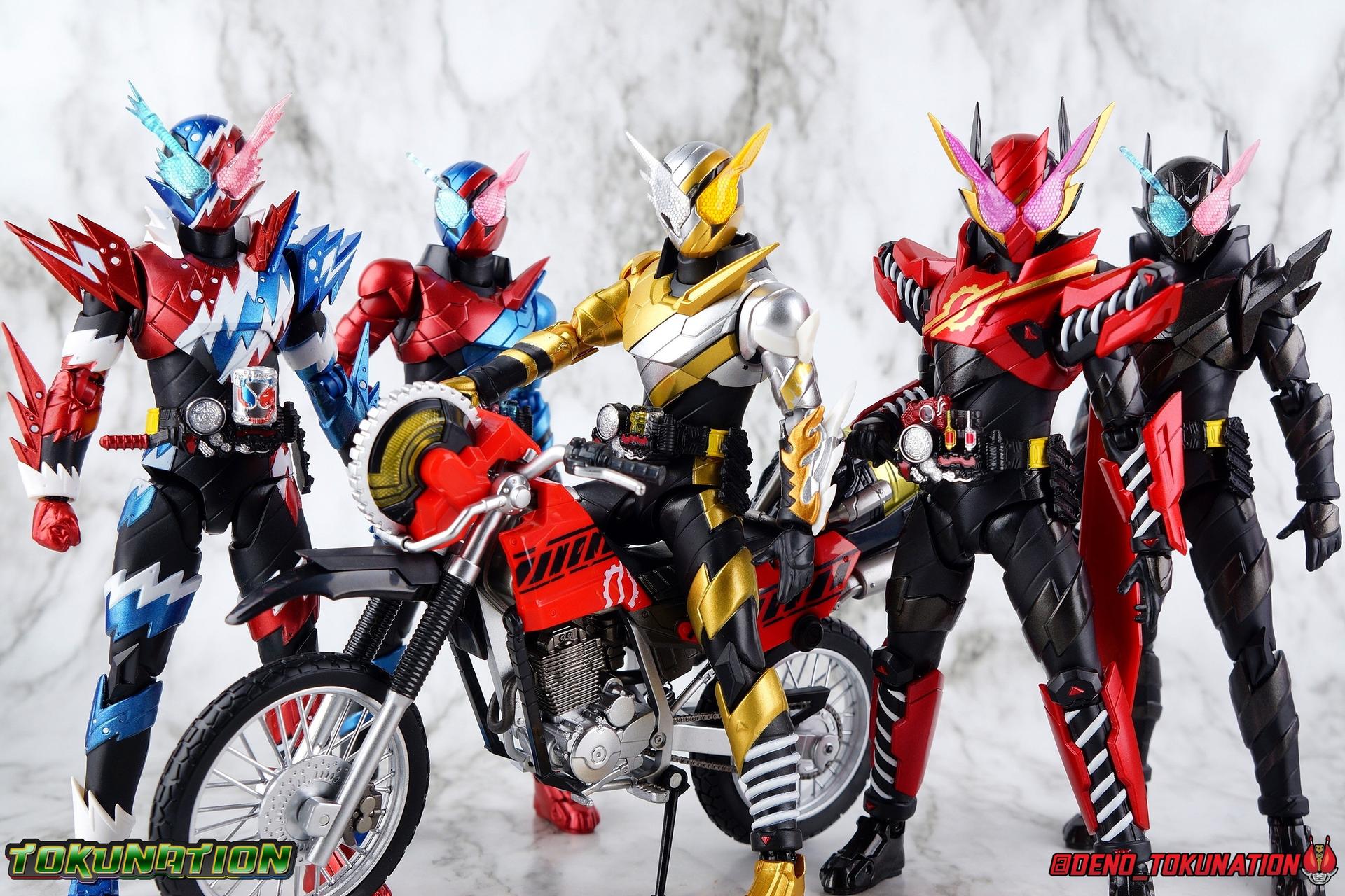 The Hazard Trigger, a weapon of unmatched power. With it, Sento Kiryu can gain the upper hand in any fight, becoming an unstoppable berserker in the process. To contain the uncontrollable power, Sento develops a new bottle to channel his strength and his consciousness. Surpassing the genius of Takumi Katsuragi, and maintaining himself within the chaos of Hazard Form, the Full Full Rabbit Tank Bottle creates Kamen Rider Build Rabbit Rabbit Form! Representing his home Seito in the 3-round battle, Build will test his new power against the dangerous Kamen Rider Rogue. Main Figure I mentioned it earlier this month when I reviewed Build Trial Form, but I absolutely love everything from Kamen Rider Build. It's one of a few series I consider it a necessity to own ever Figuart from. Even the BCR gimmick figures as well. It's just such a wonderful watch and every design felt so solid to me. Rabbit Rabbit Form is yet another stylish addition. Rabbit Rabbit Form is at a a basic level, a repaint of the tried and true Rabbit Tank Form. Much of this line is pretty basic parts reuse, with elaborate paint additions to differentiate them, and Rabbit Rabbit features some of the biggest addition to the classic base design. Since this form introduces us to one of Build's few symmetrical (mostly) forms though, there is less variation than you'd expect. The legs are physically similar to the left leg of Rabbit Tank, featuring the signature spring but contained in some new red armor. The ankles, it should be noted, do seem a little less dynamic than in previous uses of the mold. They lose some forward/back motion thanks to the cuff of the calve armor. The ankle joints as well as knees and hips are nice & tight, providing a very stable base of support. The torso features yet another outing for the wonderful Build Driver. This time with a couple significant additions. Carried over from the Hazard Form release is the Hazard Trigger, it's molded in place on the top right of the driver. I wish it was removable for a figure to hold, but if they were going to give us one of those I'm guessing it would have been with the actual Hazard Form figuart. The Driver also feature the new Full Full Rabbit Tank Bottle in it's collapsed form. It's removable as are all Full Bottles in the line, though it can't transform. An alternate accessory is included to replicate the cylinder form. As always an optional Full Bottle holster is attached to the left hip as well, though I refrain from using it out of fear of losing bottles. The torso features some radially different armor than Rabbit Tank, Sparkling or indeed Hazard. The new chest armor feels like a proper piece of torso armor wrapped around the figure, rather than two piece of armor fused together as is traditional of Build's red/blue forms. Emblazoned on the chest is the gold Build emblem. I've always really dug this gear like symbol and I wish more riders had something like it on their suits. The arms are likewise mostly new. The shoulders feature new pads with rabbit spring inspired designs. The basic design of builds arms means that these new shoulder have plenty of room to move out from the body to maneuver, while maintaining a very natural look. The forearms continue the springy armor look as well, though they don't affect the figure's poseability in one form or another. As always the Build mold's wrist design works wonderfully. Rabbit Rabbit also makes another pair of pretty huge additions to the design in the sort of rabbit coattails it has. In universe known as the "Mufflerabbit Accelerators". One is fixed to each side of the back plate with a small rotating ball joint at the base. They can spin a fill 360 at the joint, and can also spin 360 on the peg coming from the joint, while also being hinged for movement up and down. Making these things incredibly dynamic, not at all obtrusive, and because they're so lightweight they're never a problem for balance either. It's the best of both worlds and Tamashii needs to implement something akin to this a more figure. I'm looking at you Cronus! Finally Rabbit Rabbit's head has the obvious base of the Hazard Form, as seen by the black spires coming out from behind the rabbit mask. The new rabbit visors are easily some of the best I've seen from the line as well. The clarity of the underlying pattern is near crystal clear, and the gold accent really makes them pop. Accessories While it may not seem like a ton of stuff, this figure already has so many display options thanks to it's design and the accessories help accent this: 4 - sets of hands. As always, the Build line continues to give us a wealth of expressive options for each figure. Two sets of open palms, a set of weapon holding hands, as well as those for holding the Machine Builder's handlebars and striking Build's signature finger pointing pose. 1 - Full Bottle Buster. Originally this weapon was used mostly just by Rabbit Rabbit & Tank Tank. But later Build's standard form could also utilize it and he utilized it in Genius Form as well. The Buster can accept full bottles down it's barrel, those there's no locking mechanism or filler part to keep them from sliding back and forth unless you have it fully loaded. The trigger/grip can be folded down to transform it from Blade to Cannon mode as you wish as well. 1 - Full Full Rabbit Tank Bottle. This double sized Full Bottle in it's cylinder form can be used in the Buster or any other Full Bottle compatible device, though not quite in the same way because of it's length. Otherwise you may not get much use out of it since the folded version of the bottle comes attached to the Build Driver. That may not seem like a lot, but the other releases in this line has really knocked out all of the key accessories so far. The Full Bottle Buster was the last sort of big weapon or part we hadn't seen yet for Sento. So as far as accessories go I'm quite satisfied. Final Thoughts Seeing as I rarely have anything bad to say about a release from
