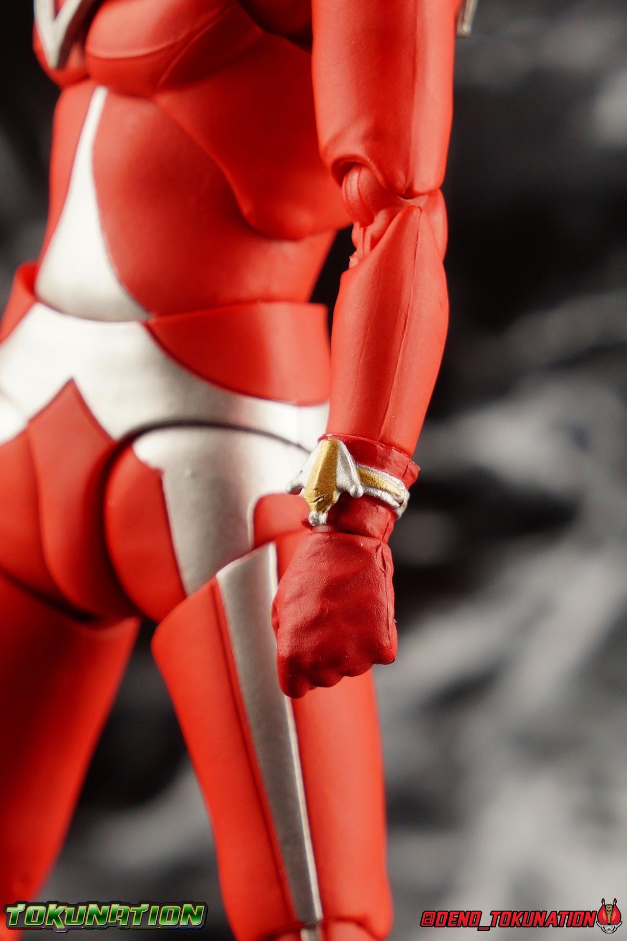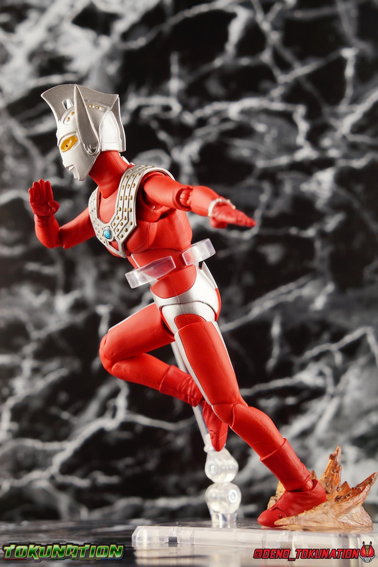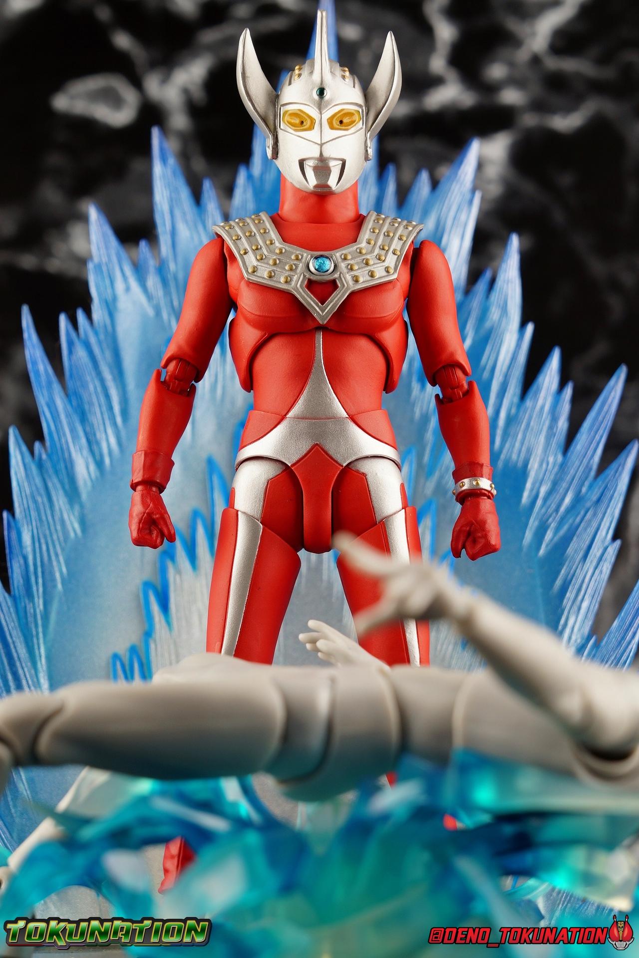 7 years after Earth first encountered the giant of light Ultraman, Ultraman Taro arrived! Taking the human Kotaro Higashi as his host, Taro fought against legions of Kaiju as they invaded the Earth. And for years since, Taro has fought hard and earned the respect of his peers. Mentoring new generations of heroes at the Ultra Coliseum, Taro also went on to instruct the likes of Mebius & Ginga. This Master fighter has lived a long and hard fought life, but that didn't stop him from settling down either. Passing his skills down to yet another generation, Taro instills the hope & power of the land of light in his son, Ultraman Taiga! This figure comes to us courtesy of our friends at Bluefin Brands and Team Rider. Check out their awesome selection of Kamen Rider items, Ultraman items, and more Tamashii Nations & Bandai Japan products! Packaging Like many figuarts of recent years, the Ultraman style packaging has undergone some drastic changes. Taro comes in a gorgeous and colorful box with a sweeping view of the figure, and an outstanding piece of box art adorning the front. I remember when the first revision of Ultra-Act packaging that began with V2's was something special. But what the line does now is really interesting. Taking the general gray & red of the Ultra's themselves, and adapting it to each classic character, this design looks very stylish. I also find it interesting that Ultraman is keeping in line with the older shape and size of Figuarts packaging that Kamen Rider began to shift away from in the Drive era, in favor of slimmer boxes. As characters of much larger stature, I think it helps set the line apart that Ultra Figuarts still come in larger packaging than their less titanic cousins. Main Figure Like I mentioned in my review for Ultraman Ginga, it had been some time since I reviewed any Ultra release. Before Ginga, one of my last reviews had been of the Ultraman 50th Edition set. So after a pair of modern Ultras with Ginga and the Seven Suit, it's nice to return to one of the classics with Ultraman Taro. In the same way as Ginga & Seven Suit, Taro is recreated lovingly and faithfully in this figure. While there is most certainly always something to be said of the intricacy of modern Ultra suit designs, I think there are volumes to be said of classic suits like Taro as well. There's something unmistakably fantastic about the classic red & silver look of classic Ultras. While I've never been a massive fan of the original Ultraman's design, the way that base has evolved over the decades is kind of magical. Somehow the placement of Taro's silver body lines on his slender build, helps communicate his youth and strength as well. While the figure is largely red, the silver paint apps go a long way to bringing out additional detail. Along Taro's legs, hips, waist, and lower torso, these apps are contoured by sculpted in body lines that help create additional depth and detail. Physically the articulation is sort of the Ultraman standard. The typical hinged ankles we see with almost any SHF are present as are a pair of sturdy toe bends. The added gap between the base of the foot and the cuff of the boot also helps add to the range of this joint. While there's nothing new present here, what we have is a tried and tested formula for good basic support. Like Ginga, Taro features some really great knee bends as well, and similarly the silver paint app on the knee continues above and below the exposed joint. This gives you a sense of continuity for the suit as the joint bends. It's little details like this I just love on any release. The built in hip and swiveling thigh combo works to really accent the lower legs as well. Looking far more visually pleasing than the kind of drop down style hips we see from time to time, the built in ones do a great job of keeping the sculpt and suit design flowing in a natural manner. I always appreciate a good thigh swivel as well. It lets a figure replicate the movements of an actual person in a suit in a way that doesn't compromise the figure or it's design in any tangible way. While Taro isn't one of your new-fangled modern bulging muscle Ultras, he still looks pretty imposing. Like Ginga, Taro's torso is separated into two chunks. The lower half is inset to the waist armor on a ball joint, allowing it to rotate side to side within the waist, while the upper body is on it's own ball joint twisting around the lower half. The combination of the two will let you move taro in a number of satisfying ways, exceeding what someone in a rubber suit could actually manage in reality. Taro's chest does feature one of his more interesting design elements as well, the Protector. Something worn by many an Ultra, such as Seven & Zero, the Protector (along with Taro's head and eyes in particular, convey the familial link that Taro has with cousin Ultra Seven. Unlike old Ultra-Acts of the past, this Protector is the perfect fit for the torso, and won't impact the articulation of the arms at all. On to the arms, Taro is another recent Ultra release that doesn't feature bicep swivels, much in the same way as the Seven Suit. Like that releases it's mostly made up for it with some very free moving shoulders. Though Taro doesn't really have the butterfly style joint of Seven Suit, the execution is largely similar. A red cup like part is inset, and the arm is plugged into it via ball joint. When you push the assembly forward the shoulders move in closer to the chest. This works pretty well, but because of the nature of the design the shoulders can also rotate up to be nearly perpendicular with the chest, and rotate a full 360 degrees around the joint. Though it looks less natural on a design based around a suit without armor, it's undeniable that it actually works. It's a pretty well implement design. Some fairly standard elbows and wrists follow this, but overall these choices make a lot of sense. Taro's left wrist features the sculpted in Taro Bracelet as well. An alterna