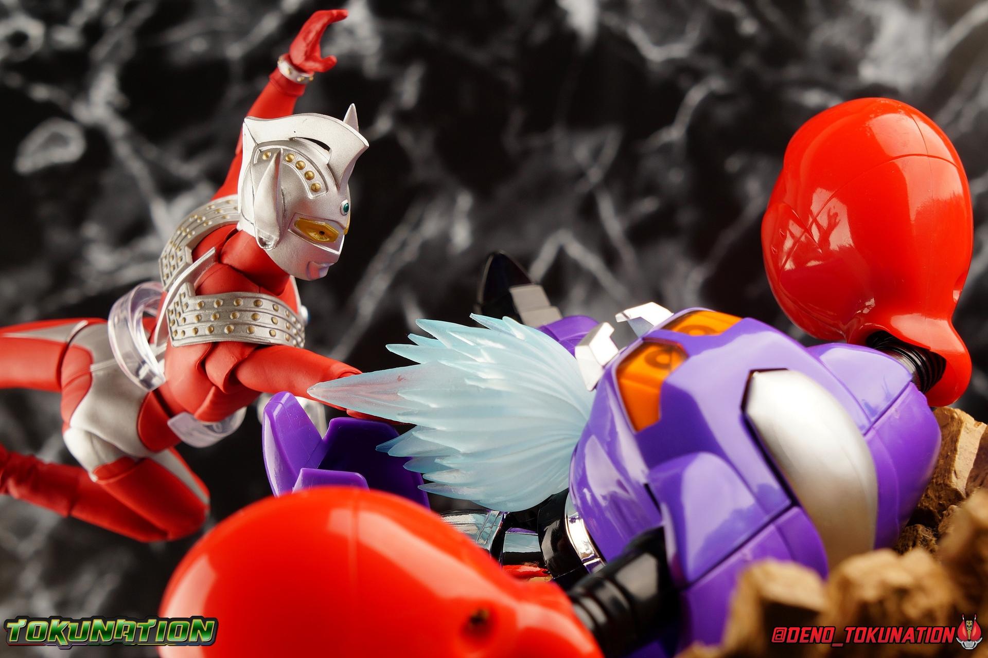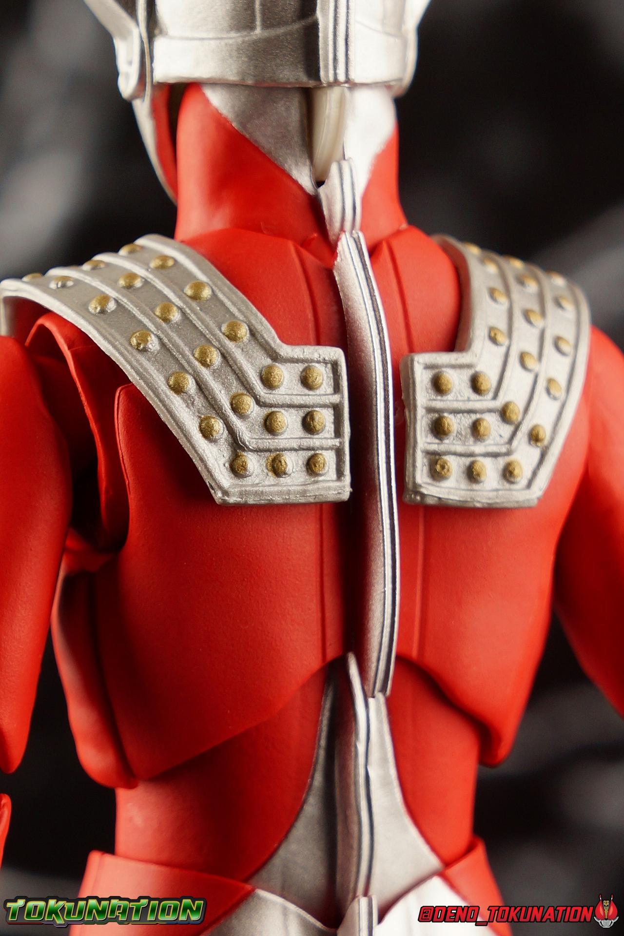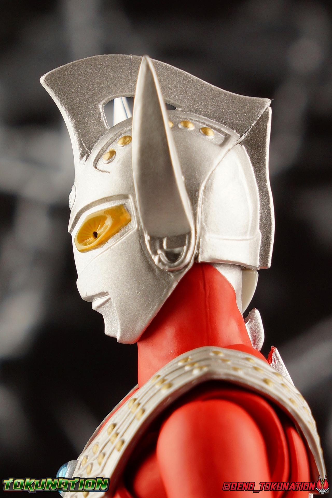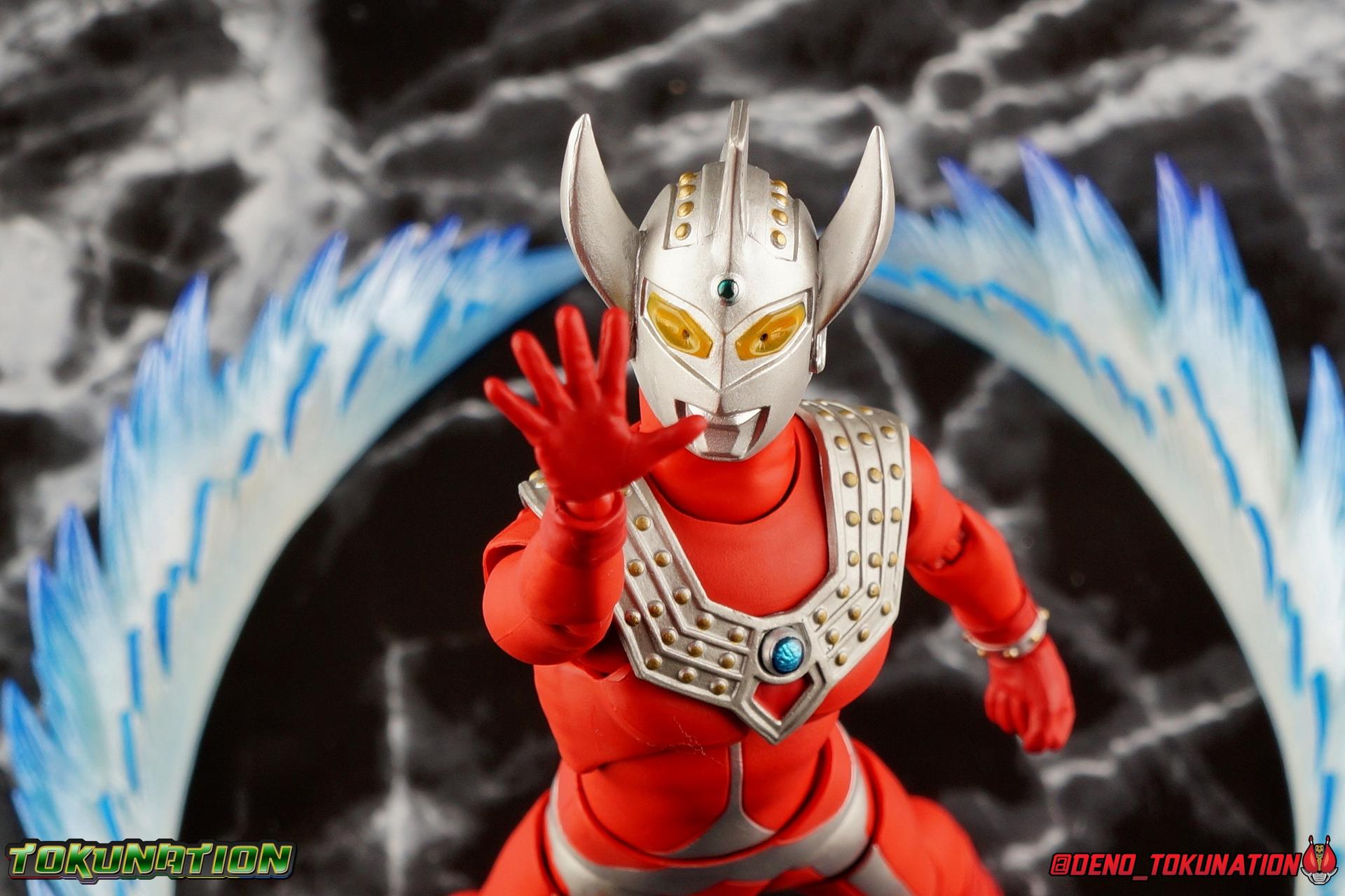 7 years after Earth first encountered the giant of light Ultraman, Ultraman Taro arrived! Taking the human Kotaro Higashi as his host, Taro fought against legions of Kaiju as they invaded the Earth. And for years since, Taro has fought hard and earned the respect of his peers. Mentoring new generations of heroes at the Ultra Coliseum, Taro also went on to instruct the likes of Mebius & Ginga. This Master fighter has lived a long and hard fought life, but that didn't stop him from settling down either. Passing his skills down to yet another generation, Taro instills the hope & power of the land of light in his son, Ultraman Taiga! This figure comes to us courtesy of our friends at Bluefin Brands and Team Rider. Check out their awesome selection of Kamen Rider items, Ultraman items, and more Tamashii Nations & Bandai Japan products! Packaging Like many figuarts of recent years, the Ultraman style packaging has undergone some drastic changes. Taro comes in a gorgeous and colorful box with a sweeping view of the figure, and an outstanding piece of box art adorning the front. I remember when the first revision of Ultra-Act packaging that began with V2's was something special. But what the line does now is really interesting. Taking the general gray & red of the Ultra's themselves, and adapting it to each classic character, this design looks very stylish. I also find it interesting that Ultraman is keeping in line with the older shape and size of Figuarts packaging that Kamen Rider began to shift away from in the Drive era, in favor of slimmer boxes. As characters of much larger stature, I think it helps set the line apart that Ultra Figuarts still come in larger packaging than their less titanic cousins. Main Figure Like I mentioned in my review for Ultraman Ginga, it had been some time since I reviewed any Ultra release. Before Ginga, one of my last reviews had been of the Ultraman 50th Edition set. So after a pair of modern Ultras with Ginga and the Seven Suit, it's nice to return to one of the classics with Ultraman Taro. In the same way as Ginga & Seven Suit, Taro is recreated lovingly and faithfully in this figure. While there is most certainly always something to be said of the intricacy of modern Ultra suit designs, I think there are volumes to be said of classic suits like Taro as well. There's something unmistakably fantastic about the classic red & silver look of classic Ultras. While I've never been a massive fan of the original Ultraman's design, the way that base has evolved over the decades is kind of magical. Somehow the placement of Taro's silver body lines on his slender build, helps communicate his youth and strength as well. While the figure is largely red, the silver paint apps go a long way to bringing out additional detail. Along Taro's legs, hips, waist, and lower torso, these apps are contoured by sculpted in body lines that help create additional depth and detail. Physically the articulation is sort of the Ultraman standard. The typical hinged ankles we see with almost any SHF are present as are a pair of sturdy toe bends. The added gap between the base of the foot and the cuff of the boot also helps add to the range of this joint. While there's nothing new present here, what we have is a tried and tested formula for good basic support. Like Ginga, Taro features some really great knee bends as well, and similarly the silver paint app on the knee continues above and below the exposed joint. This gives you a sense of continuity for the suit as the joint bends. It's little details like this I just love on any release. The built in hip and swiveling thigh combo works to really accent the lower legs as well. Looking far more visually pleasing than the kind of drop down style hips we see from time to time, the built in ones do a great job of keeping the sculpt and suit design flowing in a natural manner. I always appreciate a good thigh swivel as well. It lets a figure replicate the movements of an actual person in a suit in a way that doesn't compromise the figure or it's design in any tangible way. While Taro isn't one of your new-fangled modern bulging muscle Ultras, he still looks pretty imposing. Like Ginga, Taro's torso is separated into two chunks. The lower half is inset to the waist armor on a ball joint, allowing it to rotate side to side within the waist, while the upper body is on it's own ball joint twisting around the lower half. The combination of the two will let you move taro in a number of satisfying ways, exceeding what someone in a rubber suit could actually manage in reality. Taro's chest does feature one of his more interesting design elements as well, the Protector. Something worn by many an Ultra, such as Seven & Zero, the Protector (along with Taro's head and eyes in particular, convey the familial link that Taro has with cousin Ultra Seven. Unlike old Ultra-Acts of the past, this Protector is the perfect fit for the torso, and won't impact the articulation of the arms at all. On to the arms, Taro is another recent Ultra release that doesn't feature bicep swivels, much in the same way as the Seven Suit. Like that releases it's mostly made up for it with some very free moving shoulders. Though Taro doesn't really have the butterfly style joint of Seven Suit, the execution is largely similar. A red cup like part is inset, and the arm is plugged into it via ball joint. When you push the assembly forward the shoulders move in closer to the chest. This works pretty well, but because of the nature of the design the shoulders can also rotate up to be nearly perpendicular with the chest, and rotate a full 360 degrees around the joint. Though it looks less natural on a design based around a suit without armor, it's undeniable that it actually works. It's a pretty well implement design. Some fairly standard elbows and wrists follow this, but overall these choices make a lot of sense. Taro's left wrist features the sculpted in Taro Bracelet as well. An alterna