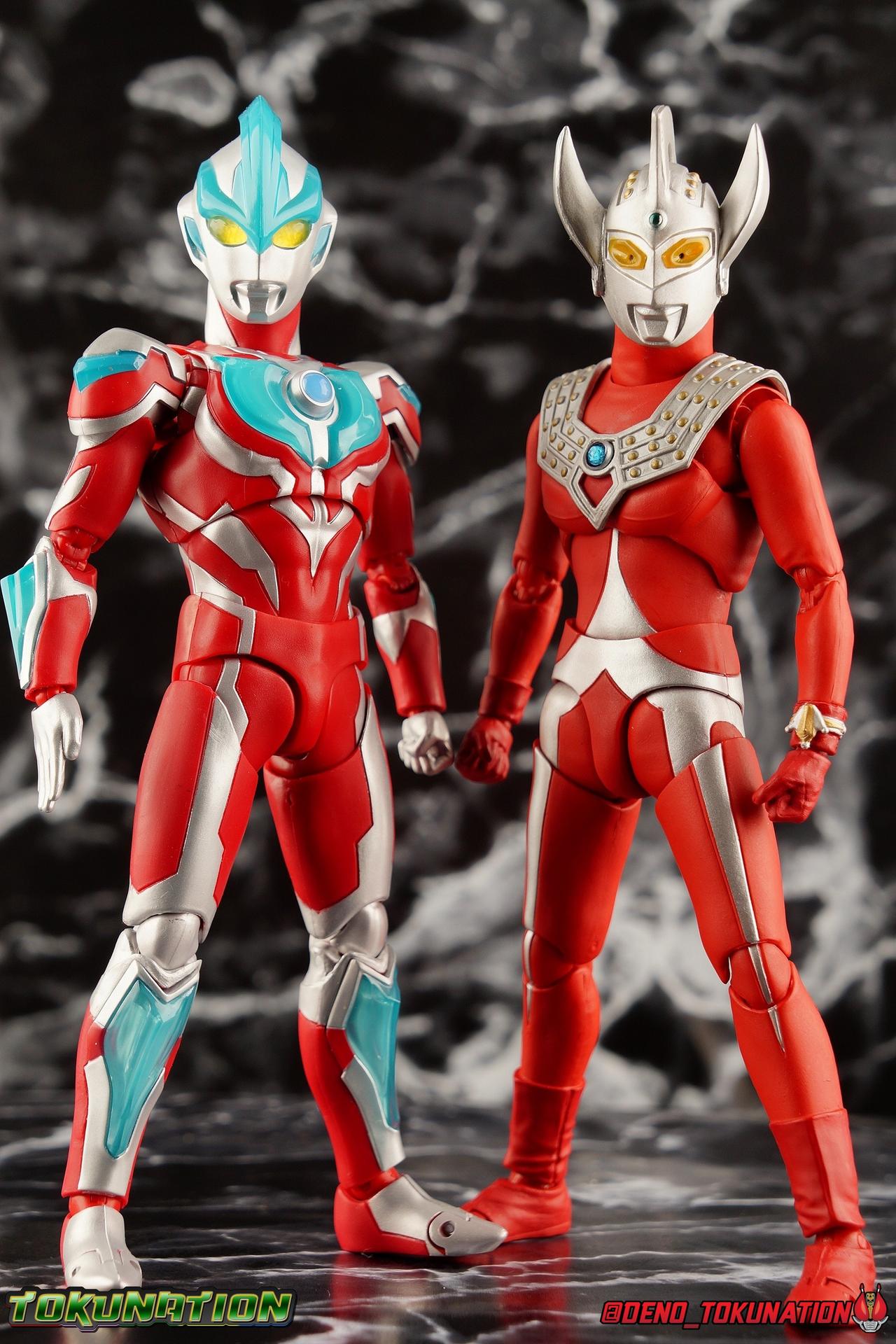 7 years after Earth first encountered the giant of light Ultraman, Ultraman Taro arrived! Taking the human Kotaro Higashi as his host, Taro fought against legions of Kaiju as they invaded the Earth. And for years since, Taro has fought hard and earned the respect of his peers. Mentoring new generations of heroes at the Ultra Coliseum, Taro also went on to instruct the likes of Mebius & Ginga. This Master fighter has lived a long and hard fought life, but that didn't stop him from settling down either. Passing his skills down to yet another generation, Taro instills the hope & power of the land of light in his son, Ultraman Taiga! This figure comes to us courtesy of our friends at Bluefin Brands and Team Rider. Check out their awesome selection of Kamen Rider items, Ultraman items, and more Tamashii Nations & Bandai Japan products! Packaging Like many figuarts of recent years, the Ultraman style packaging has undergone some drastic changes. Taro comes in a gorgeous and colorful box with a sweeping view of the figure, and an outstanding piece of box art adorning the front. I remember when the first revision of Ultra-Act packaging that began with V2's was something special. But what the line does now is really interesting. Taking the general gray & red of the Ultra's themselves, and adapting it to each classic character, this design looks very stylish. I also find it interesting that Ultraman is keeping in line with the older shape and size of Figuarts packaging that Kamen Rider began to shift away from in the Drive era, in favor of slimmer boxes. As characters of much larger stature, I think it helps set the line apart that Ultra Figuarts still come in larger packaging than their less titanic cousins. Main Figure Like I mentioned in my review for Ultraman Ginga, it had been some time since I reviewed any Ultra release. Before Ginga, one of my last reviews had been of the Ultraman 50th Edition set. So after a pair of modern Ultras with Ginga and the Seven Suit, it's nice to return to one of the classics with Ultraman Taro. In the same way as Ginga & Seven Suit, Taro is recreated lovingly and faithfully in this figure. While there is most certainly always something to be said of the intricacy of modern Ultra suit designs, I think there are volumes to be said of classic suits like Taro as well. There's something unmistakably fantastic about the classic red & silver look of classic Ultras. While I've never been a massive fan of the original Ultraman's design, the way that base has evolved over the decades is kind of magical. Somehow the placement of Taro's silver body lines on his slender build, helps communicate his youth and strength as well. While the figure is largely red, the silver paint apps go a long way to bringing out additional detail. Along Taro's legs, hips, waist, and lower torso, these apps are contoured by sculpted in body lines that help create additional depth and detail. Physically the articulation is sort of the Ultraman standard. The typical hinged ankles we see with almost any SHF are present as are a pair of sturdy toe bends. The added gap between the base of the foot and the cuff of the boot also helps add to the range of this joint. While there's nothing new present here, what we have is a tried and tested formula for good basic support. Like Ginga, Taro features some really great knee bends as well, and similarly the silver paint app on the knee continues above and below the exposed joint. This gives you a sense of continuity for the suit as the joint bends. It's little details like this I just love on any release. The built in hip and swiveling thigh combo works to really accent the lower legs as well. Looking far more visually pleasing than the kind of drop down style hips we see from time to time, the built in ones do a great job of keeping the sculpt and suit design flowing in a natural manner. I always appreciate a good thigh swivel as well. It lets a figure replicate the movements of an actual person in a suit in a way that doesn't compromise the figure or it's design in any tangible way. While Taro isn't one of your new-fangled modern bulging muscle Ultras, he still looks pretty imposing. Like Ginga, Taro's torso is separated into two chunks. The lower half is inset to the waist armor on a ball joint, allowing it to rotate side to side within the waist, while the upper body is on it's own ball joint twisting around the lower half. The combination of the two will let you move taro in a number of satisfying ways, exceeding what someone in a rubber suit could actually manage in reality. Taro's chest does feature one of his more interesting design elements as well, the Protector. Something worn by many an Ultra, such as Seven & Zero, the Protector (along with Taro's head and eyes in particular, convey the familial link that Taro has with cousin Ultra Seven. Unlike old Ultra-Acts of the past, this Protector is the perfect fit for the torso, and won't impact the articulation of the arms at all. On to the arms, Taro is another recent Ultra release that doesn't feature bicep swivels, much in the same way as the Seven Suit. Like that releases it's mostly made up for it with some very free moving shoulders. Though Taro doesn't really have the butterfly style joint of Seven Suit, the execution is largely similar. A red cup like part is inset, and the arm is plugged into it via ball joint. When you push the assembly forward the shoulders move in closer to the chest. This works pretty well, but because of the nature of the design the shoulders can also rotate up to be nearly perpendicular with the chest, and rotate a full 360 degrees around the joint. Though it looks less natural on a design based around a suit without armor, it's undeniable that it actually works. It's a pretty well implement design. Some fairly standard elbows and wrists follow this, but overall these choices make a lot of sense. Taro's left wrist features the sculpted in Taro Bracelet as well. An alterna