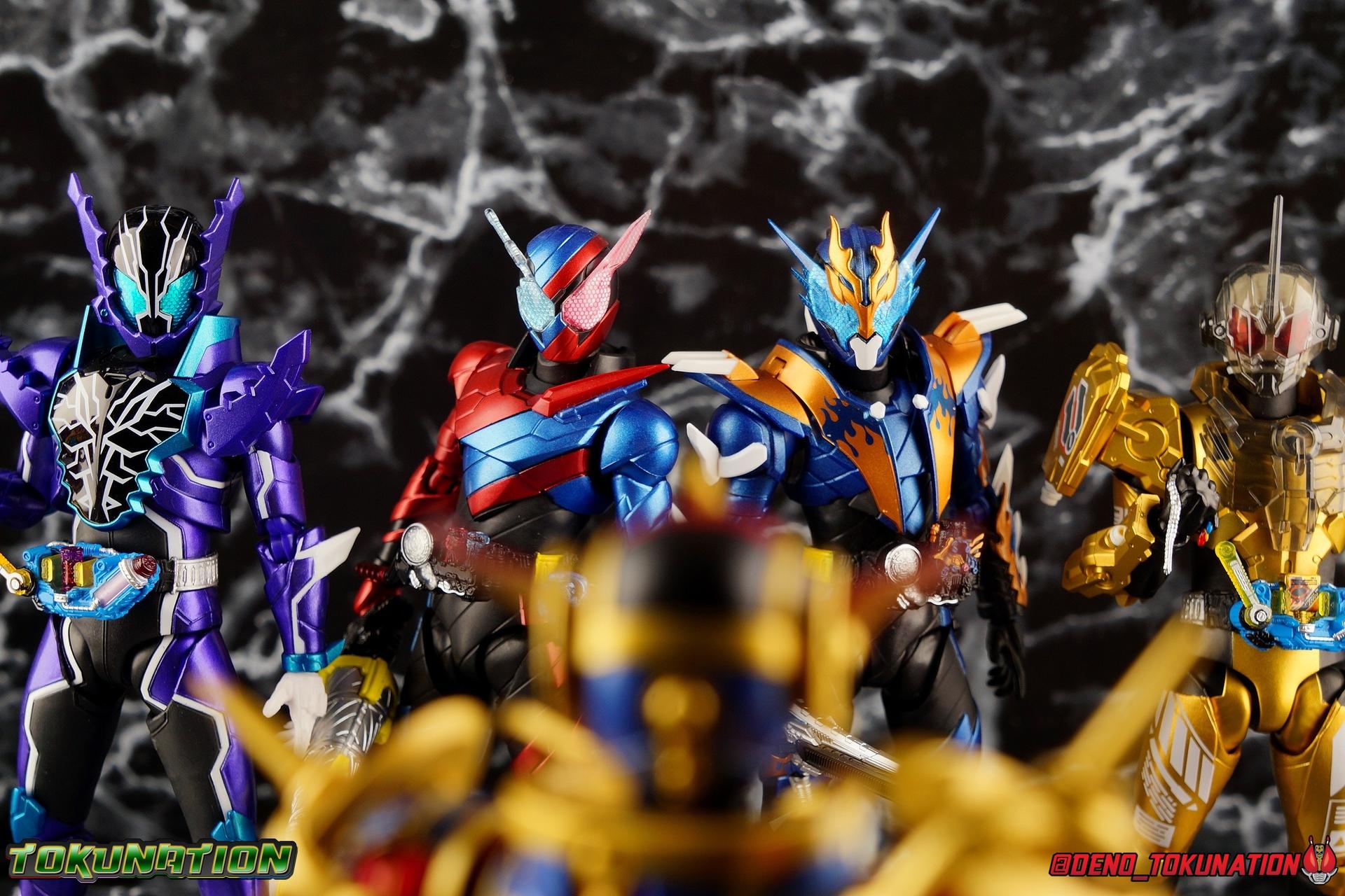 "Cobra! Dragon! Rabbit! Evolution!" Packaging Once more the two-tone packaging of the Build series returns. There isn't a ton of variety in this box design but it's aesthetically pleasing to line them all up together on my storage shelves. Evol's box, just by the nature of the red/blue color scheme does look very similar to Great Cross-Z, which is appropriate given the connections of the characters. And given that Evol is such a gorgeous suit, it's hard to argue with any of those stock photos adorning the box as well. Accessories This go around I'm doing my review a bit backwards so to speak. Instead of examining the figure first, then it's accessories, we'll do the parts first, then the forms we can create with them. 1 - set of Evol Dragon Form parts. This include the gorgeous Evol Dragon head, itself a more or less direct repack of the head that came with Great Cross-Z. The shade of red used here appears slightly darker, but that could vary figure to figure. We also get some new blue shoulder pads, again borrowed straight from Great Cross-Z. Finally we also get the Dragon Evol Bottle to use in the Evol Driver for this form. At this scale, some of the mechanical detailing of Evol's bottles can look a bit soft, but overall I think they've done a wonderful job. 1 - Set of Evol Rabbit Form parts. This includes another new head, itself a modification of the standard Build Rabbit/Tank head, just with a mirrored rabbit visor instead of an asymmetrical one. Evol's gold and blue lend themselves well to this head sculpt. The shoulder pads included are identical to builds, they're just both red this time with gold trim. I appreciate that in keeping with the diagonal design of the helmet, that the right shoulder pad also retains the triangular sculpt on both sides. To finish this form off we also have the included Rabbit Evol Bottle. 1 - Evol Bottle holster. Nigh identical to the bottle holsters the other riders in the line have come with, this one is really only necessary for a complete Phase 3/Evol Rabbit look. A holster appears on Evol's hip holding the Cobra & Dragon bottles after his second transformation into Phase 3. In the same episode that this occurs (38) the holster then disappears as Evol assumes his Black Hole form, and it's never actually seen again. As neither the Dragon nor Rabbit forms ever appear again after this set of episodes. So even including the holster with this figure at all was a nice extra touch that Tamashii really didn't have to do. 7 - additional hands. As expressive as Evolt/Evol/Blood Stalk is as a character, I'm really pleased by the hand selection here. 2 open expressive hands, 2 more relaxed waving type hands, 2 hands ostensibly for holding weapons or being used as a curled index finger come hither type of hand, and 1 right hand to grip the handle on the Evol Driver. Magnificent. This figure could have gone the easy way out. It could have been just Evol Cobra, and Tamashii could have milked out releases for the other two forms. Admittedly, I'd have still bought them like that too. I was tempted to buy 3 of this set just so that I could display all 3 forms, I'm still considering picking up 2 more to do just that. But the fact that everything came in one set as is, is just brilliant. Huge props to Tamashii for making that call and making this figure an all in one package. Below, you'll be able to read up on the cosmetic differences of the forms, and further below you can see the full gallery of them. Cobra Form "Evol, Phase 1." Of Evol's initial 3 forms, this is by far the most striking and stylish. Kamen Rider Build built (aha!) an incredibly rich world of characters and technology. The entire Rider system as well as offshoots like the Kaiser system, owe their existence to the original Evol Driver. Bearing that in mind, the earthly derivatives feel appropriately similar to each other from a design perspective. Whereas Evol feels absolutely alien, in absolutely all the right ways. Regal, ornate, deadly. I instantly fell in love with this suit when it appeared in show, and having it in figure form now the gorgeous details of it just jump right out at me again. Phase 1 is by far the most cohesive of the 3 forms, not to knock the other two, it's just that this flows a bit more naturally. The general astronomy theme as well as the cobra motif are a fantastic mix. Evol's body is criss-crossed by rings and lines that emulate astronomical equipment, I can't help but feel telescopes come into play in his design, but it's evident to me that an astrolabe is the primary inspiration for this suit. In any case let's move on to some of it's functionality. Though the design definitely looks foreign because of all the armor bits, at the core Evol uses the Build/Cross-Z leg design. This is mostly evident in the thighs but really the general shape of the leg is there, just contoured by new armor. Surprisingly the armor on the legs doesn't really affect how they function either. The ankles are about as good as they've always been, not outstanding by any measure, but decent enough to get good poses out of. Despite the overhang of armor on the bottom of the shin, and added bulk around the knee joint, both remain largely unrestricted as well. We run into issues when we get to the hanging skirt armor though. Evol has some pretty rocking thigh armor on the front and side that protrudes out from the body a bit, but it will occasionally hit the skirt. And unfortunately, having not learned from their Cronus mistake, the armor is thin rigid plastic on a rather limited hinge, so you'll have to fiddle with it somewhat to get the legs in and around that. So just be careful not to break anything. The legs can move, just not as much as I'd like. On his waist, Evol features the eponymous Evol Driver. This is basically the exact same Driver we got with Mad Rogue. The shade of red is a bit different but it's more or less identical. The difference here is Evol's very own Evol Bottles, the Cobra & Rid