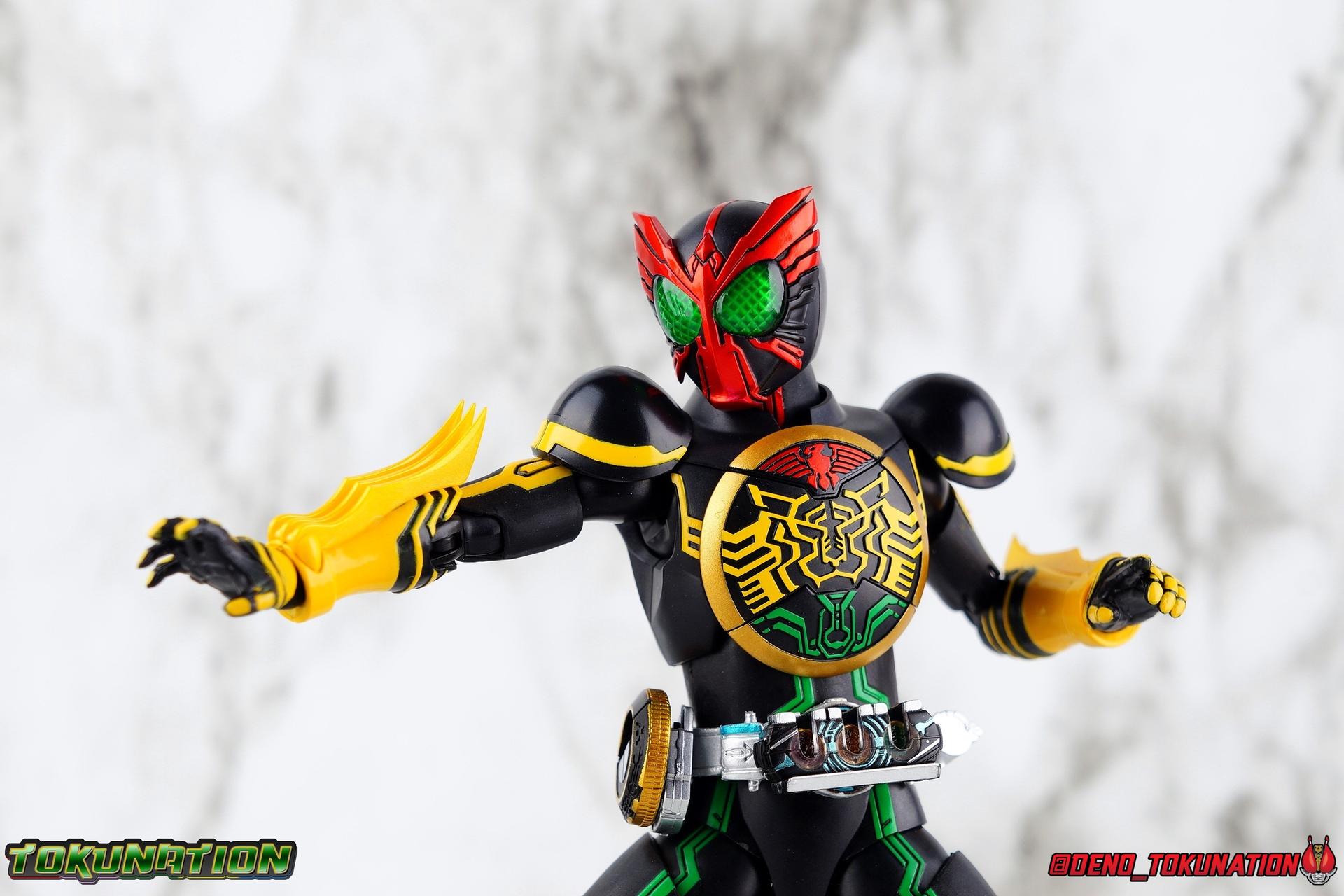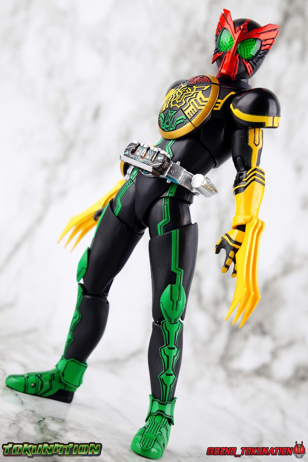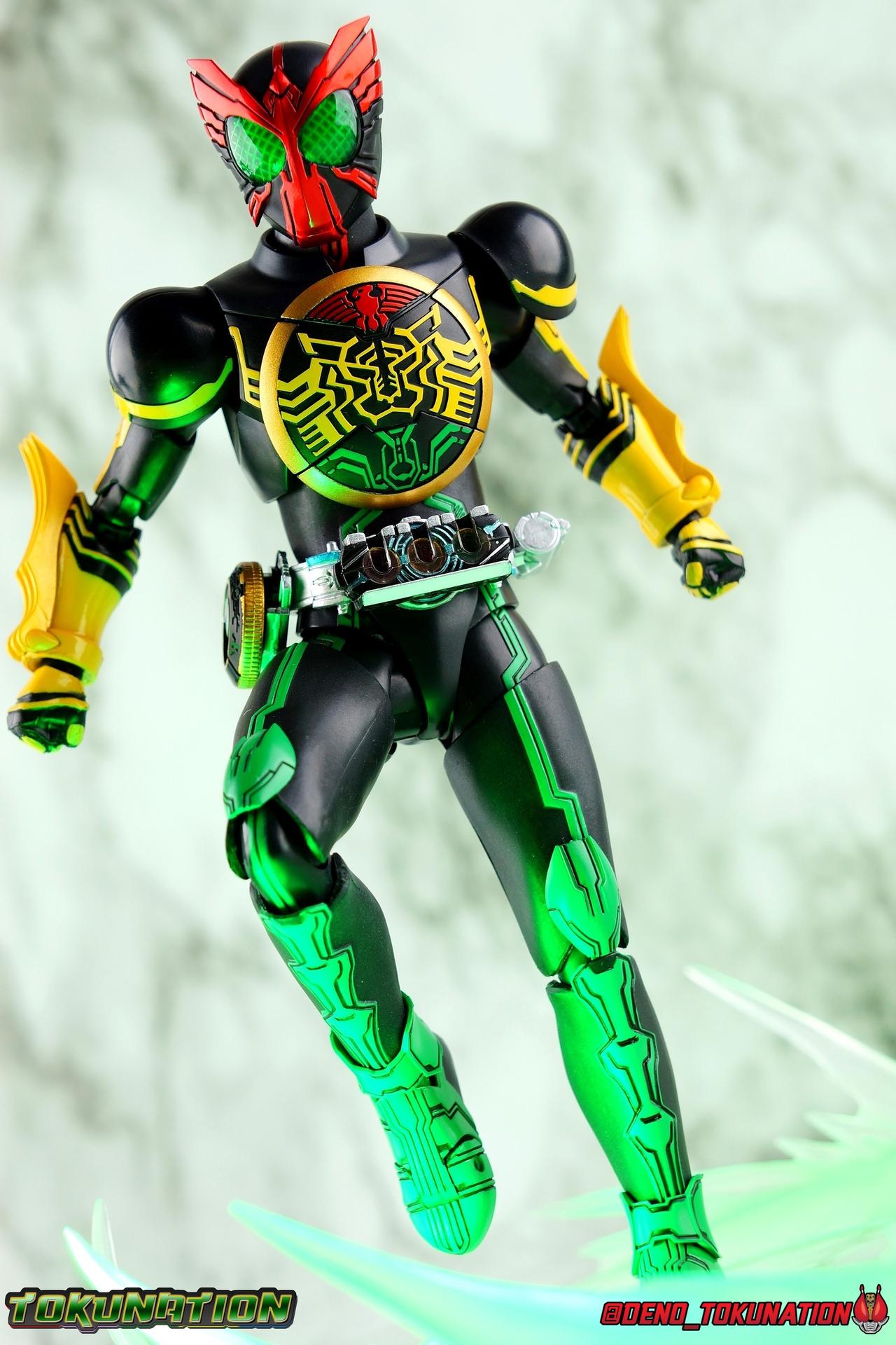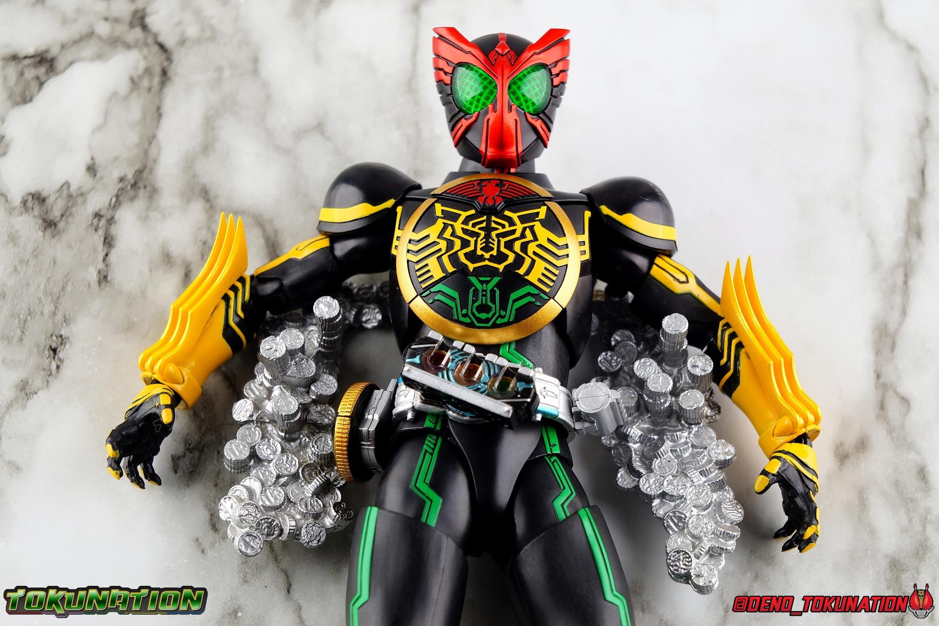 Long ago the King, the first OOO, instructed 4 alchemists to create life. Made from Core Medals these creatures, the Greeed, were filled with immense craving, unable to fill the voids within. Incapable of processing human emotions and senses, the Greeeds sought to consume the world of man to fill their sense of craving, but before they could they were sealed away by OOO. 800 years later, Eiji Hino was minding his own business as a part time security guard when the seal on the Greeed was broken, releasing them once more into the human world. Still craving to be whole, nothing could stand in their way without the power of the King. But one of their number, Ankh, took it upon himself to steal the Core Medals of his kind. Intending to find a human pawn, Ankh stumbles upon Eiji and a bond is born. Handing the Driver of the king and the Core Medals over, Ankh allows Eiji to become Kamen Rider OOO! What began as a begrudging alliance would spawn one of the greatest and truest friendships in Kamen Rider history, as the Greeed Ankh supported Eiji in his quest to save people wherever he could. Anything goes it's coming up OOO! Packaging Obviously, Seihou OOO comes in that familiar and collector friendly packaging this line has come to be known for. And it's quite the departure from what the original OOO line featured. It's much more subdued, which bothers me slightly, but it feels much sturdier and fits right in with an ever growing collection of Shinkocchou Seihou releases. As you can see in the gallery below, the two packaging types are very different, each with it's merits, but I welcome the change. Main Figure It's been quite a journey from the early days of the S.H. Figuarts toyline. Back in the day (2011) the original SHF Kamen Rider OOO TaToBa Combo was released, followed along eventually by every one of OOO other combos, and a variety of his mixed combo forms as well. Honestly it's astonishing how many OOO forms got Figuarts, but the mere fact that the 10 Main Combos from TV & Films happened is incredible. Flash forward to 2019 (though I'm getting to this review in 2020) and we're back to square one. Tamashii is finally treating us to a do-over for OOO, and giving us the figure we always hoped for. The original line was plagued by loose joints, gummy parts, inaccuracies, and more. Now, the Shinkocchou Seihou line is here to set things right. At a glance, there's no question, Shinkocchou Seihou OOO is absolutely an improvement in every single facet over the original figure. Let's start with the composition of the body. Seihou OOO goes the extra mile compared to the original by incorporating a Combo Change gimmick, hearkening back to the gimmick line of the show's day, aptly named Combo Change. Separating into Taka, Tora and Batta sections that means you'll be able to swap around the 3 components of the body between any of the current and future Seihou OOO releases. This is revolutionary, something I've always wanted to see Figuarts try more of. Though not as extensive as OOO, other recent releases have also begun to take on the form change aspect like Kamen Riders' Evol & Geiz Revive. What's really striking about the general look of the figure is it's proper proportions compared to the lanky and thin look of the original. Seihou OOO has all the beef of the actual suit, and so much more articulation than the previous release could have dreamed of. Each ankle has all the range necessary for OOO to get into his trademark wide stances, but it's really the double jointed knees that do a ton of the work. It's all about flexibility in the legs to make a figure feel dynamic, and no rider should feel more like that than OOO. The hips have that same genius sort of in set design type that Seihou's tend to have. The difference with OOO is that the Batta green markings extend up from the thigh across the separated hip joint and onto the waist. Each part can move independently so they may not always line up perfectly, but the attention to detail here is glorious, and the functionality far exceeds the limited range of the original figure's drop down hips. The black detailing on the green parts of the legs is crisp as well, but just rough enough to give it that ancient look that feels appropriate enough to be something from 800 years ago. And of course I'm a sucker for properly sculpted butt plates on riders, so I appreciate how the leg design doesn't take away from some correct anatomy. Around Eiji's waist, is the OOO Driver & Belt. I know the OOO Driver looks like it has a lot going on, but it's an incredibly well designed driver for this scale, even more so than some of my favorites like the Build Driver. The Driver in the center can accept the included 3 Core Medals or any other medals in the Seihou line, allowing you to fully and accurately recreate combo changes. A tool is included to remove and insert medals as you wish as well. The Driver can also tilt down to the figure's left accurately. On the left hip is a Cell Medal container, while the right hip has a holster for the included O Scanner. It's a bulky belt set up but one that feels undeniably perfect on a bulky body like OOO. Above the belt, at the point where OOO's chest emblem covers the torso, is where the figure can be taken apart. A firm plug holds the upper and lower torso together, but it's honestly the ingenious way the OOO emblem comes apart and un-pegs from the torso that blows my mind. While the head and neck can detached from the shoulders as one chunk. Even more astonishingly this entire gimmick doesn't impact the figure's design or articulation. Even the bottom section of the chest is hinged to move. It's just so satisfying all around. The emblem itself is exquisitely sculpted and painted as well. The arms are also a big attraction this go around for OOO. Far less gummy than the originals, these feel solid and extremely flexible. And that's in large part thanks to the hybrid shoulder pad design that incorporates them onto the arms