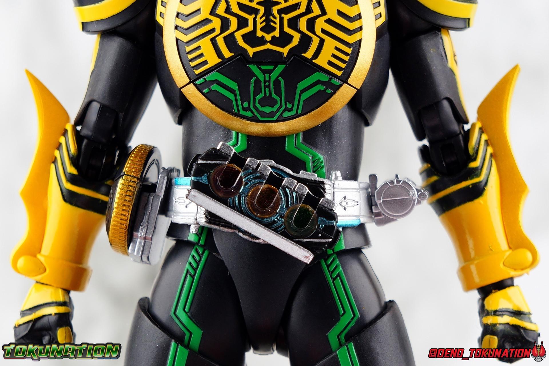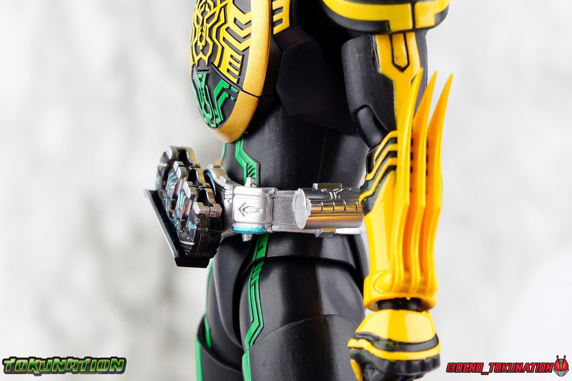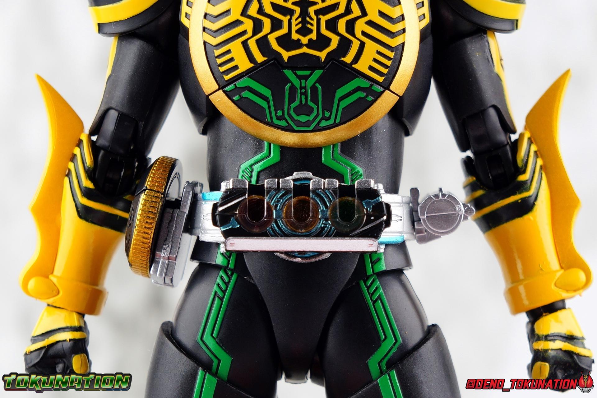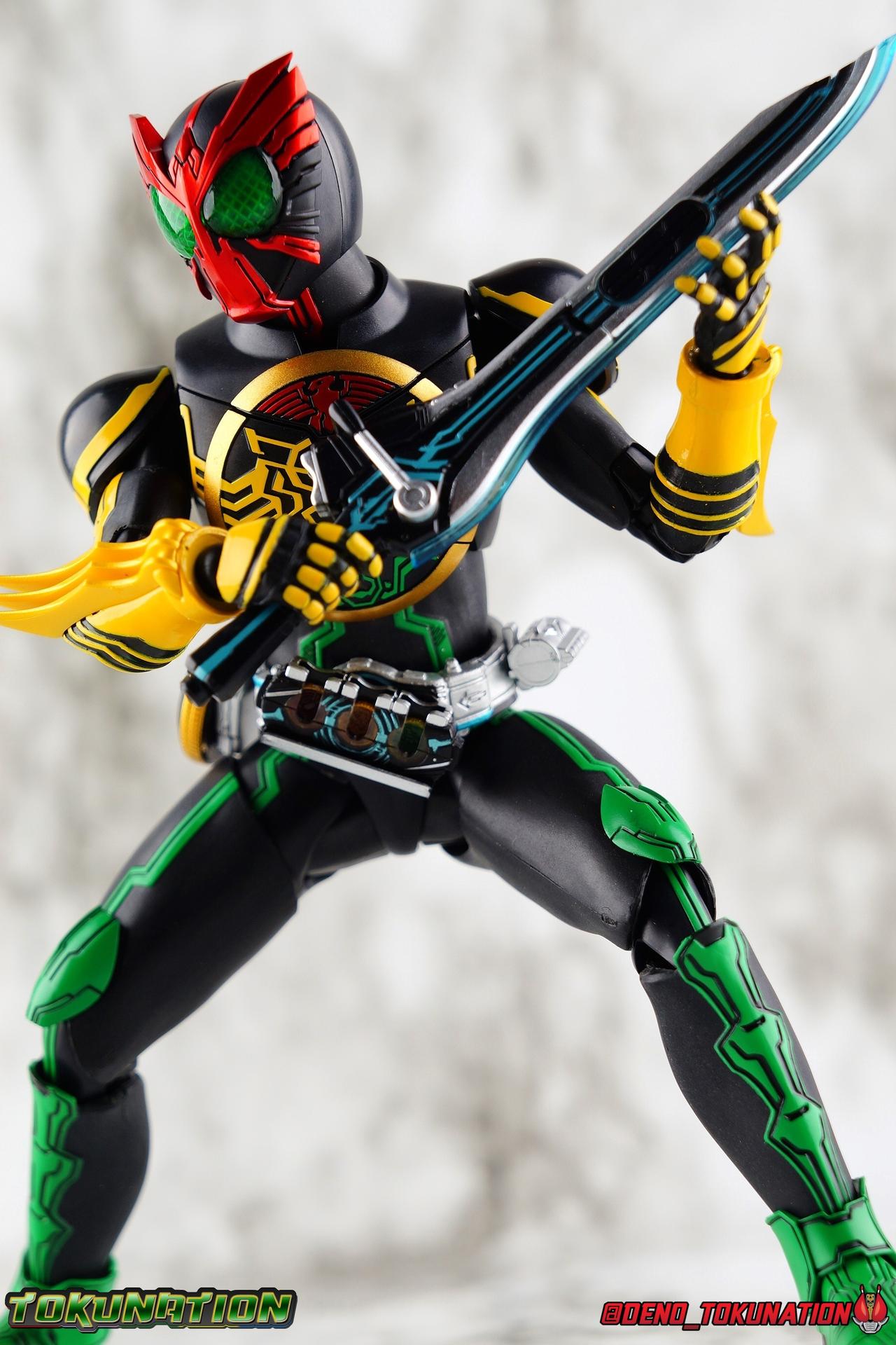 Long ago the King, the first OOO, instructed 4 alchemists to create life. Made from Core Medals these creatures, the Greeed, were filled with immense craving, unable to fill the voids within. Incapable of processing human emotions and senses, the Greeeds sought to consume the world of man to fill their sense of craving, but before they could they were sealed away by OOO. 800 years later, Eiji Hino was minding his own business as a part time security guard when the seal on the Greeed was broken, releasing them once more into the human world. Still craving to be whole, nothing could stand in their way without the power of the King. But one of their number, Ankh, took it upon himself to steal the Core Medals of his kind. Intending to find a human pawn, Ankh stumbles upon Eiji and a bond is born. Handing the Driver of the king and the Core Medals over, Ankh allows Eiji to become Kamen Rider OOO! What began as a begrudging alliance would spawn one of the greatest and truest friendships in Kamen Rider history, as the Greeed Ankh supported Eiji in his quest to save people wherever he could. Anything goes it's coming up OOO! Packaging Obviously, Seihou OOO comes in that familiar and collector friendly packaging this line has come to be known for. And it's quite the departure from what the original OOO line featured. It's much more subdued, which bothers me slightly, but it feels much sturdier and fits right in with an ever growing collection of Shinkocchou Seihou releases. As you can see in the gallery below, the two packaging types are very different, each with it's merits, but I welcome the change. Main Figure It's been quite a journey from the early days of the S.H. Figuarts toyline. Back in the day (2011) the original SHF Kamen Rider OOO TaToBa Combo was released, followed along eventually by every one of OOO other combos, and a variety of his mixed combo forms as well. Honestly it's astonishing how many OOO forms got Figuarts, but the mere fact that the 10 Main Combos from TV & Films happened is incredible. Flash forward to 2019 (though I'm getting to this review in 2020) and we're back to square one. Tamashii is finally treating us to a do-over for OOO, and giving us the figure we always hoped for. The original line was plagued by loose joints, gummy parts, inaccuracies, and more. Now, the Shinkocchou Seihou line is here to set things right. At a glance, there's no question, Shinkocchou Seihou OOO is absolutely an improvement in every single facet over the original figure. Let's start with the composition of the body. Seihou OOO goes the extra mile compared to the original by incorporating a Combo Change gimmick, hearkening back to the gimmick line of the show's day, aptly named Combo Change. Separating into Taka, Tora and Batta sections that means you'll be able to swap around the 3 components of the body between any of the current and future Seihou OOO releases. This is revolutionary, something I've always wanted to see Figuarts try more of. Though not as extensive as OOO, other recent releases have also begun to take on the form change aspect like Kamen Riders' Evol & Geiz Revive. What's really striking about the general look of the figure is it's proper proportions compared to the lanky and thin look of the original. Seihou OOO has all the beef of the actual suit, and so much more articulation than the previous release could have dreamed of. Each ankle has all the range necessary for OOO to get into his trademark wide stances, but it's really the double jointed knees that do a ton of the work. It's all about flexibility in the legs to make a figure feel dynamic, and no rider should feel more like that than OOO. The hips have that same genius sort of in set design type that Seihou's tend to have. The difference with OOO is that the Batta green markings extend up from the thigh across the separated hip joint and onto the waist. Each part can move independently so they may not always line up perfectly, but the attention to detail here is glorious, and the functionality far exceeds the limited range of the original figure's drop down hips. The black detailing on the green parts of the legs is crisp as well, but just rough enough to give it that ancient look that feels appropriate enough to be something from 800 years ago. And of course I'm a sucker for properly sculpted butt plates on riders, so I appreciate how the leg design doesn't take away from some correct anatomy. Around Eiji's waist, is the OOO Driver & Belt. I know the OOO Driver looks like it has a lot going on, but it's an incredibly well designed driver for this scale, even more so than some of my favorites like the Build Driver. The Driver in the center can accept the included 3 Core Medals or any other medals in the Seihou line, allowing you to fully and accurately recreate combo changes. A tool is included to remove and insert medals as you wish as well. The Driver can also tilt down to the figure's left accurately. On the left hip is a Cell Medal container, while the right hip has a holster for the included O Scanner. It's a bulky belt set up but one that feels undeniably perfect on a bulky body like OOO. Above the belt, at the point where OOO's chest emblem covers the torso, is where the figure can be taken apart. A firm plug holds the upper and lower torso together, but it's honestly the ingenious way the OOO emblem comes apart and un-pegs from the torso that blows my mind. While the head and neck can detached from the shoulders as one chunk. Even more astonishingly this entire gimmick doesn't impact the figure's design or articulation. Even the bottom section of the chest is hinged to move. It's just so satisfying all around. The emblem itself is exquisitely sculpted and painted as well. The arms are also a big attraction this go around for OOO. Far less gummy than the originals, these feel solid and extremely flexible. And that's in large part thanks to the hybrid shoulder pad design that incorporates them onto the arms