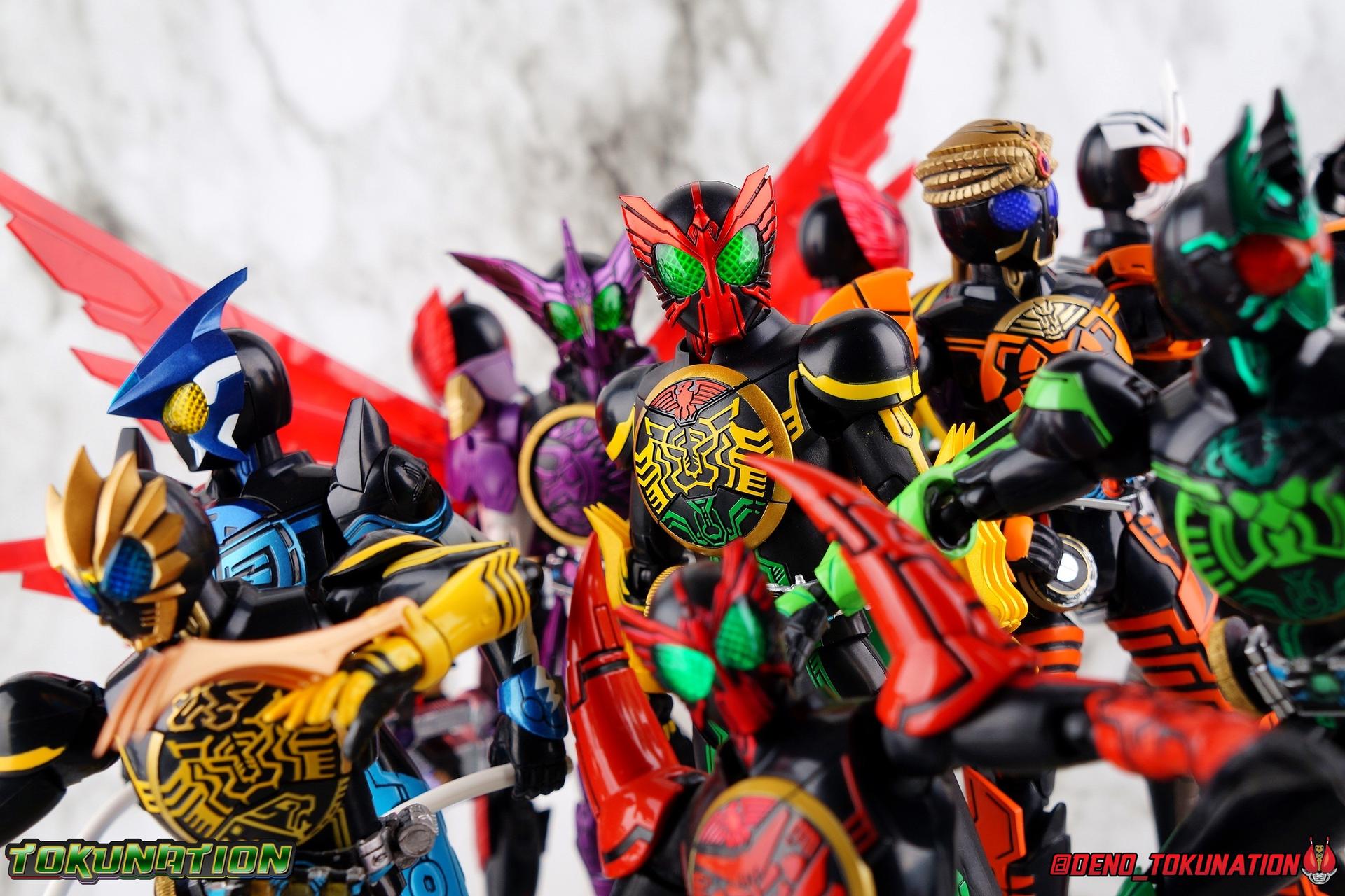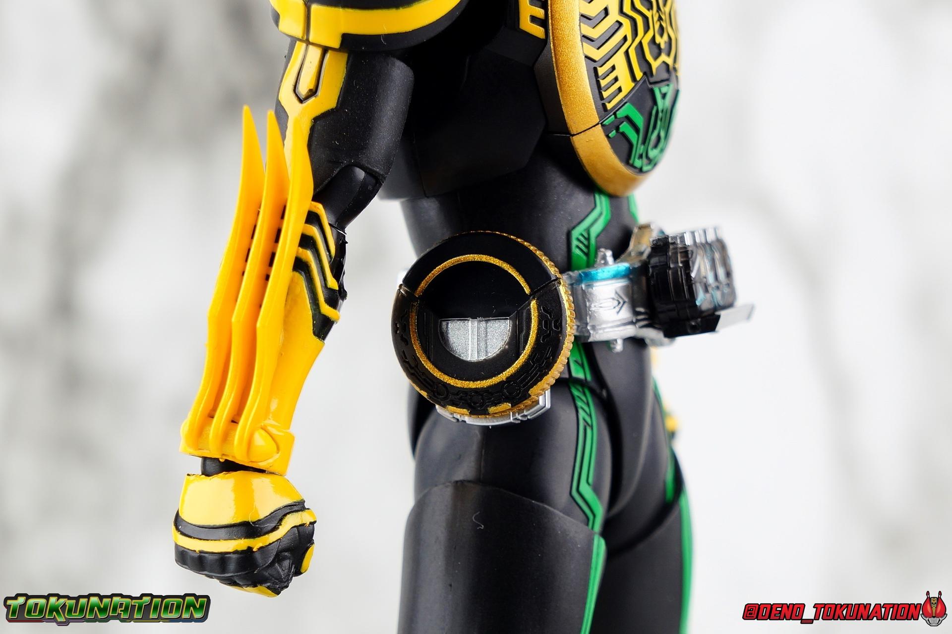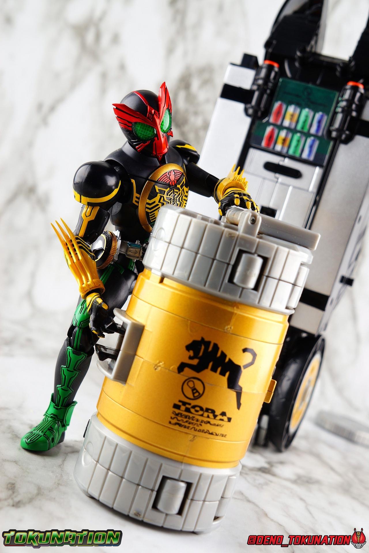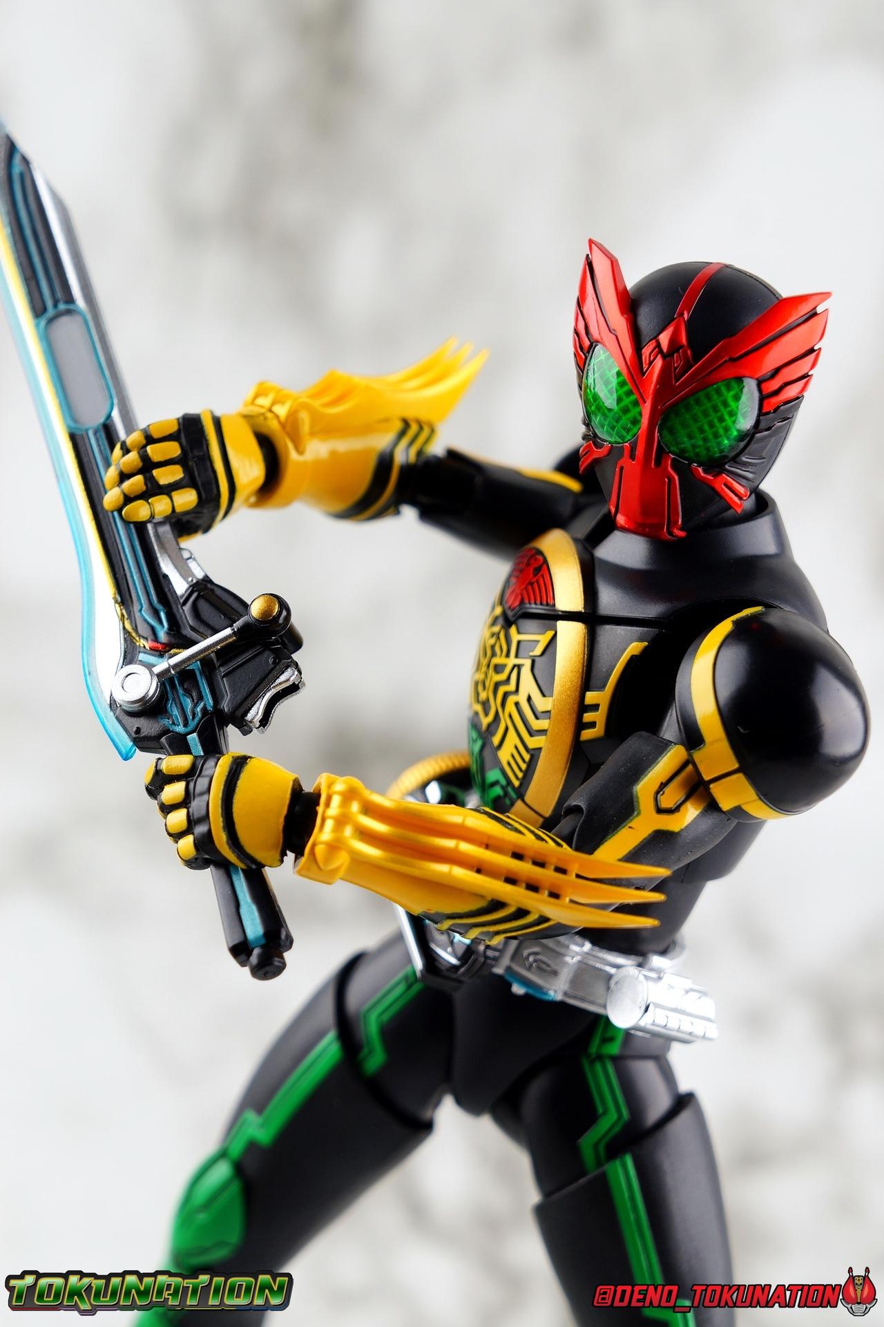 Long ago the King, the first OOO, instructed 4 alchemists to create life. Made from Core Medals these creatures, the Greeed, were filled with immense craving, unable to fill the voids within. Incapable of processing human emotions and senses, the Greeeds sought to consume the world of man to fill their sense of craving, but before they could they were sealed away by OOO. 800 years later, Eiji Hino was minding his own business as a part time security guard when the seal on the Greeed was broken, releasing them once more into the human world. Still craving to be whole, nothing could stand in their way without the power of the King. But one of their number, Ankh, took it upon himself to steal the Core Medals of his kind. Intending to find a human pawn, Ankh stumbles upon Eiji and a bond is born. Handing the Driver of the king and the Core Medals over, Ankh allows Eiji to become Kamen Rider OOO! What began as a begrudging alliance would spawn one of the greatest and truest friendships in Kamen Rider history, as the Greeed Ankh supported Eiji in his quest to save people wherever he could. Anything goes it's coming up OOO! Packaging Obviously, Seihou OOO comes in that familiar and collector friendly packaging this line has come to be known for. And it's quite the departure from what the original OOO line featured. It's much more subdued, which bothers me slightly, but it feels much sturdier and fits right in with an ever growing collection of Shinkocchou Seihou releases. As you can see in the gallery below, the two packaging types are very different, each with it's merits, but I welcome the change. Main Figure It's been quite a journey from the early days of the S.H. Figuarts toyline. Back in the day (2011) the original SHF Kamen Rider OOO TaToBa Combo was released, followed along eventually by every one of OOO other combos, and a variety of his mixed combo forms as well. Honestly it's astonishing how many OOO forms got Figuarts, but the mere fact that the 10 Main Combos from TV & Films happened is incredible. Flash forward to 2019 (though I'm getting to this review in 2020) and we're back to square one. Tamashii is finally treating us to a do-over for OOO, and giving us the figure we always hoped for. The original line was plagued by loose joints, gummy parts, inaccuracies, and more. Now, the Shinkocchou Seihou line is here to set things right. At a glance, there's no question, Shinkocchou Seihou OOO is absolutely an improvement in every single facet over the original figure. Let's start with the composition of the body. Seihou OOO goes the extra mile compared to the original by incorporating a Combo Change gimmick, hearkening back to the gimmick line of the show's day, aptly named Combo Change. Separating into Taka, Tora and Batta sections that means you'll be able to swap around the 3 components of the body between any of the current and future Seihou OOO releases. This is revolutionary, something I've always wanted to see Figuarts try more of. Though not as extensive as OOO, other recent releases have also begun to take on the form change aspect like Kamen Riders' Evol & Geiz Revive. What's really striking about the general look of the figure is it's proper proportions compared to the lanky and thin look of the original. Seihou OOO has all the beef of the actual suit, and so much more articulation than the previous release could have dreamed of. Each ankle has all the range necessary for OOO to get into his trademark wide stances, but it's really the double jointed knees that do a ton of the work. It's all about flexibility in the legs to make a figure feel dynamic, and no rider should feel more like that than OOO. The hips have that same genius sort of in set design type that Seihou's tend to have. The difference with OOO is that the Batta green markings extend up from the thigh across the separated hip joint and onto the waist. Each part can move independently so they may not always line up perfectly, but the attention to detail here is glorious, and the functionality far exceeds the limited range of the original figure's drop down hips. The black detailing on the green parts of the legs is crisp as well, but just rough enough to give it that ancient look that feels appropriate enough to be something from 800 years ago. And of course I'm a sucker for properly sculpted butt plates on riders, so I appreciate how the leg design doesn't take away from some correct anatomy. Around Eiji's waist, is the OOO Driver & Belt. I know the OOO Driver looks like it has a lot going on, but it's an incredibly well designed driver for this scale, even more so than some of my favorites like the Build Driver. The Driver in the center can accept the included 3 Core Medals or any other medals in the Seihou line, allowing you to fully and accurately recreate combo changes. A tool is included to remove and insert medals as you wish as well. The Driver can also tilt down to the figure's left accurately. On the left hip is a Cell Medal container, while the right hip has a holster for the included O Scanner. It's a bulky belt set up but one that feels undeniably perfect on a bulky body like OOO. Above the belt, at the point where OOO's chest emblem covers the torso, is where the figure can be taken apart. A firm plug holds the upper and lower torso together, but it's honestly the ingenious way the OOO emblem comes apart and un-pegs from the torso that blows my mind. While the head and neck can detached from the shoulders as one chunk. Even more astonishingly this entire gimmick doesn't impact the figure's design or articulation. Even the bottom section of the chest is hinged to move. It's just so satisfying all around. The emblem itself is exquisitely sculpted and painted as well. The arms are also a big attraction this go around for OOO. Far less gummy than the originals, these feel solid and extremely flexible. And that's in large part thanks to the hybrid shoulder pad design that incorporates them onto the arms