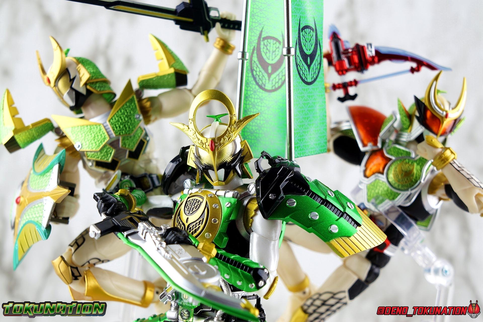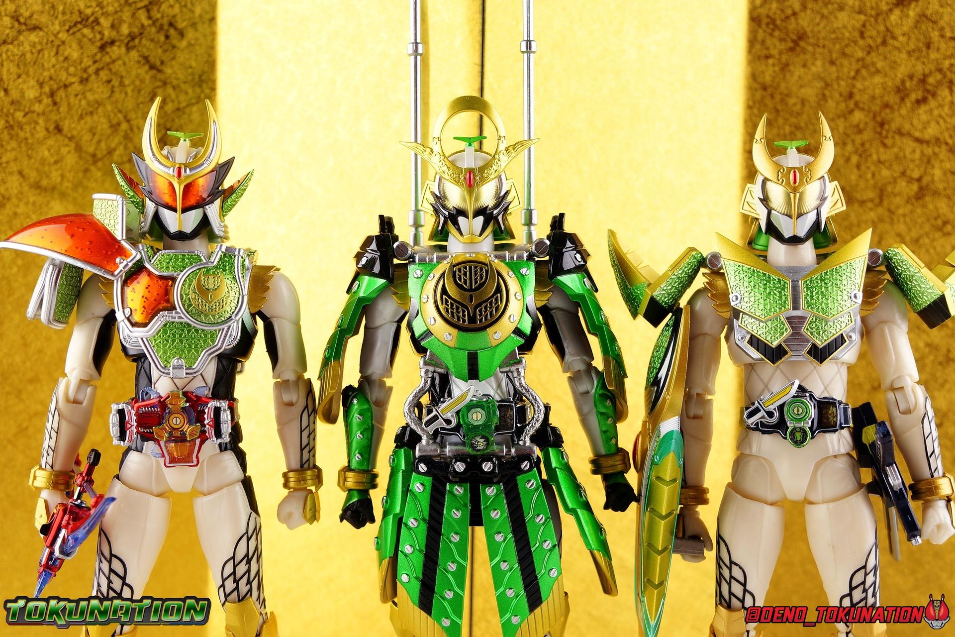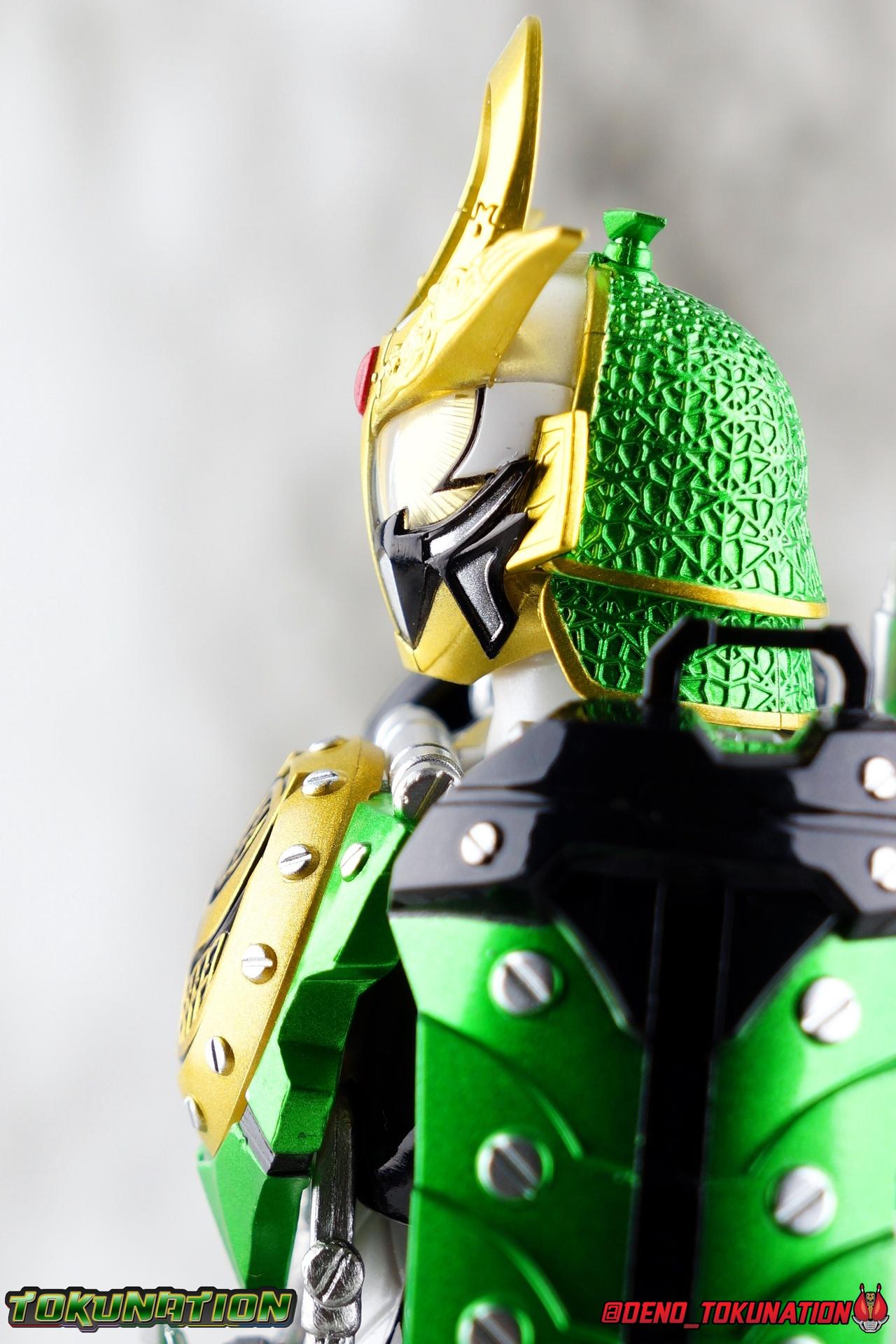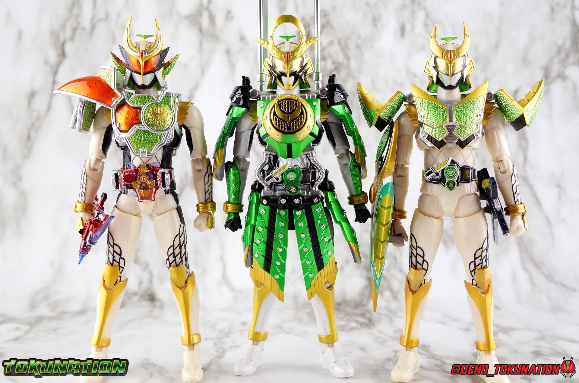 An experiment. That's all that the desolate Torkia Republic was in the eyes of the massive Yggdrasill Corporation. Devastated by poverty, lack of resources, and economic support from it's neighbors, the fruits of this horrible labor was Project Ark. Lock Seeds, Sengoku Drivers..... Kamen Riders. Years have passed since the incidents with the Riders & Invess, and now Takatora Kureshima has been lead to Torkia once more to investigate strange occurrences among the nation's underground populace. Ambushed upon arrival, Takatora has lost his memories. Confronted with the tragic new reality of young men forced to fight to the death, will the sight of these Proto-Riders awaken Takatora's memories? Could a final gift from Kouta Kazuraba be the key to saving this nation, and Takatora? And what does Masahito have to do with all of it? Packaging It's honestly a little jarring to see this older style of packaging art return. Gaim series boxes were gorgeous, and I didn't realize how much i missed them before now. Whatever filter Tamashii uses on the stock photos for these releases, I absolutely love it. Main Figure It has been *quite* some time since I've revisited Kamen Rider Gaim. As releases from the series grew fewer and farther between, and distance from the show diminished my appreciation of it, I really fell off collecting Figuarts from the series. It was really going to take something wild to bring me back to the stage for this series. And what better way than a one-off form created exclusively for a theater play sequel to a show that had ended 5 years prior to it?? Sign me up! Zangetsu Kachidoki Arms, it should come as no surprise, brings back elements of two very familiar figures for Kamen Rider Gaim collectors. Zangetsu Melon Arms & Gaim Kachidoki Arms. In practical terms, this figure is just the Kachidoki Arms Gaim figure painted in Zangetsu colors with a new head & chest emblem for physical changes as well. If you're familiar with the Gaim/Zangetsu body type, it was an incredibly solid and versatile figure for it's time, and still really holds up today. Gaim Orange Arms was the standard barer of the SHF line to me for quite some time, striking a wonderful balance of toy functionality and screen realization. But that doesn't mean this figure isn't without fault, especially looking at today's Figuarts by comparison. Zangetsu itself was a mere pallet swap of the base Gaim mold with new armor, and the same is true here. Kachidoki Arms, is of course a super bulky form. Lot's of flaps and panels and hinges, laid on top of an otherwise very well articulated base figure. A number of Gaim release stood out to me for having some very solid ankles, without obstruction to the joints from the shin cuffs. But honestly the knee bends and rotating hip joints are the real winners. Gaim could get into such incredible poses as could Zangetsu, but both suffer in their Kachidoki forms because of the new front and side facing skirt armor. The shade of metallic green used this go around is just glorious on these parts, but nothing can really save the design aspect of this parts reuse. The figure can still move it's legs just as well as before, but you'll need to angle those panels out of the way to make use of the joints, and the panels are only single hinged. So they're gonna stick straight out and maybe look a bit awkward in most poses. You can work around them, but I do wish they had a midway hinge for some variety. On Zangetu's waist is the ever reliable Sengoku Driver. Detailed & functional, this piece is pretty interactive for this scale. Each Sengoku Driver can accept open or unlocked Lock Seeds, the variety of which are already attached to a rider out of the box. Unopened or closed Lock Seeds can't quite fit because the shackle or looped section, isn't open. However the blade on the driver cant rotate to simulate the way Lock Seeds are "cut" open, which is perfect for the already attached open seeds. After 6 years this is still a pretty great design, and I'm always pleasantly surprised how good the faceplates on the left side look, as well as how nice the lock seeds are. In this case we have a new version of the Kachidoki Lock Seed. An apparent fusion of the Melon and Melon Energy Lock Seeds, this one is a gorgeous translucent green with a really great piece of artwork on the open portions. Obviously since these parts are reuses of the Gaim Kachidoki Arms mold, there's no holster on the left hip for the Musou Saber of previous releases. All good since this one doesn't have one. The torso features the new exquisitely sculpted chest plate with the Zangetsu emblem in place of Gaim's. The rest of the armor is nigh identical, but the colors are just so striking on this release of the mold. The big detriment to the upper body however is the connection to the waist armor. The silver straps that run between the two neuter most of the side to side rotation. This was a problem I had with the first Kachidoki release as well. And while the tubing is made of a softer plastic, it just doesn't put enough play into the waist to accomplish much unfortunately. The arms are another familiar experience. Thankfully the shoulder pads are on great rotating joints so they can angle out as well as forward & back when posing the arms. So you don't lose much of any of the awesome visuals in the upper body like you tend to with the waist. My one big gripe with the Gaim style arms is that the wrist pegs are still very very difficult, exchanging hands is still frustrating. Even with the other Gaim & Zangetsu figures I busted out for this gallery, I was reminded of the hands being a tight fit on those joints. And where Gaim got a rocking mustache on his helmet for Kachidoki, Zangetsu instead preserves more of the basic head sculpt and adds new ornamentation to the head crest. This new head for this release has Zangetu's exquisitely sculpted melon armor helm, and a face plate that seems to incorporate elements of both his previous fo
