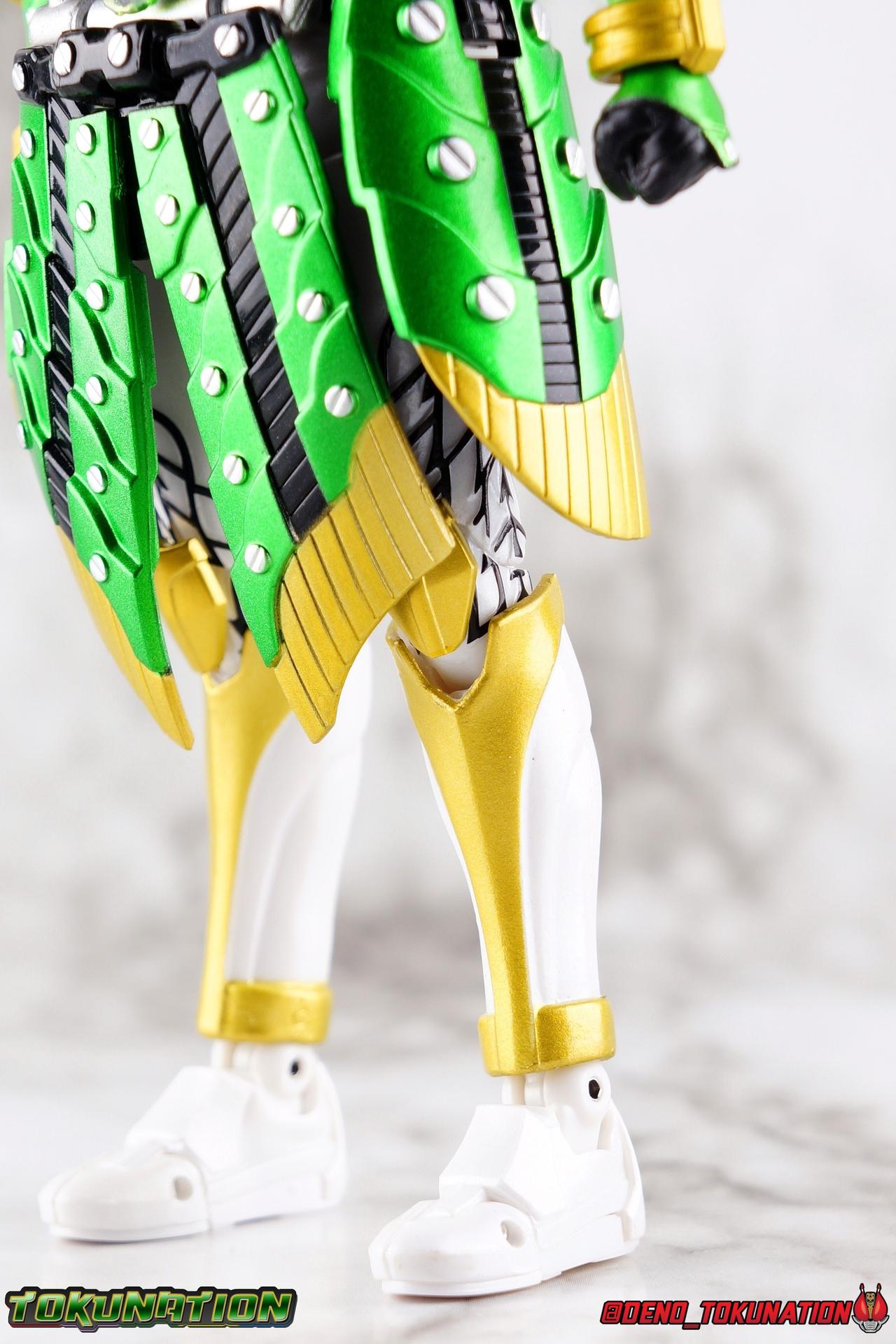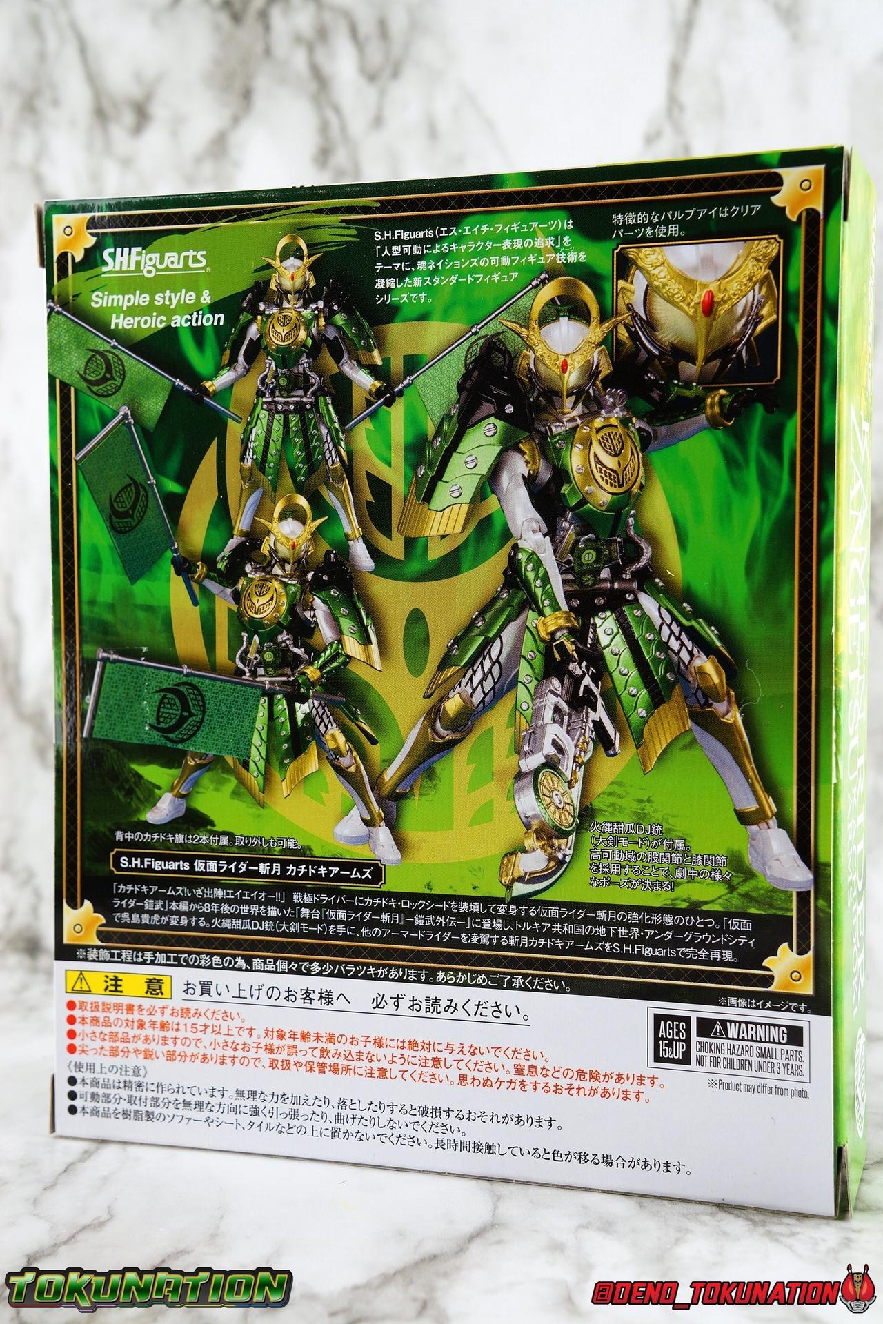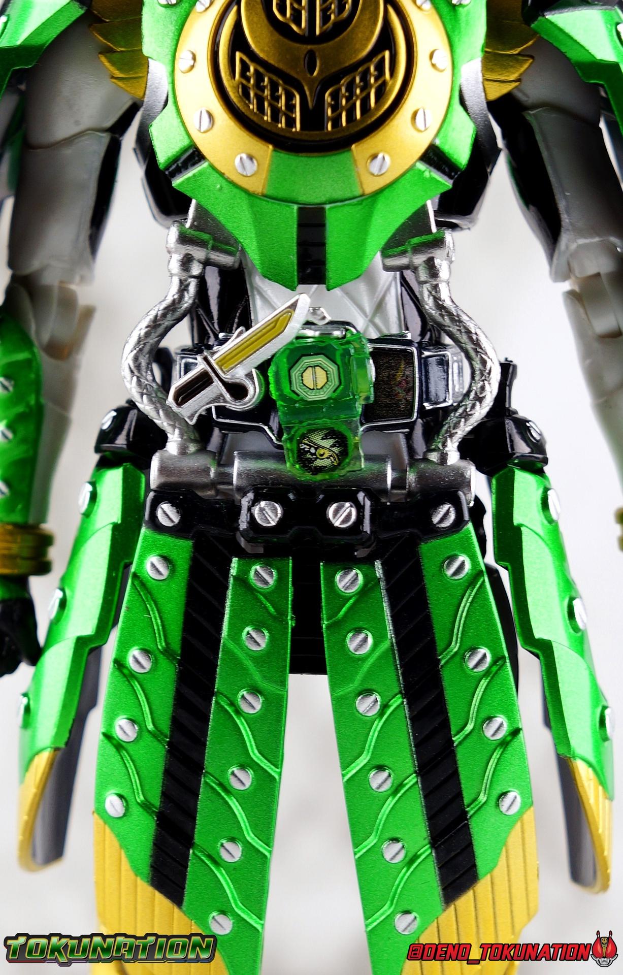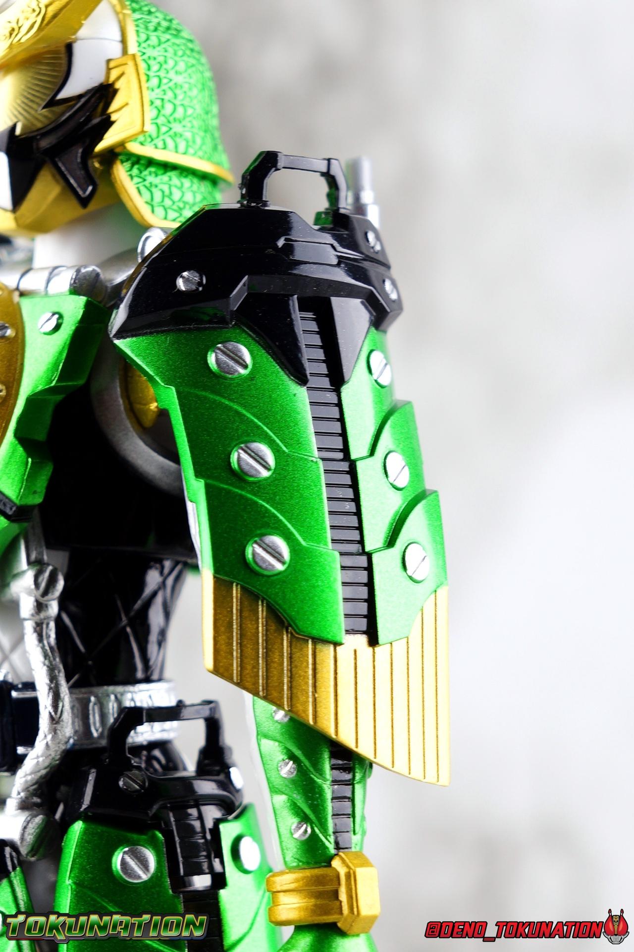 An experiment. That's all that the desolate Torkia Republic was in the eyes of the massive Yggdrasill Corporation. Devastated by poverty, lack of resources, and economic support from it's neighbors, the fruits of this horrible labor was Project Ark. Lock Seeds, Sengoku Drivers..... Kamen Riders. Years have passed since the incidents with the Riders & Invess, and now Takatora Kureshima has been lead to Torkia once more to investigate strange occurrences among the nation's underground populace. Ambushed upon arrival, Takatora has lost his memories. Confronted with the tragic new reality of young men forced to fight to the death, will the sight of these Proto-Riders awaken Takatora's memories? Could a final gift from Kouta Kazuraba be the key to saving this nation, and Takatora? And what does Masahito have to do with all of it? Packaging It's honestly a little jarring to see this older style of packaging art return. Gaim series boxes were gorgeous, and I didn't realize how much i missed them before now. Whatever filter Tamashii uses on the stock photos for these releases, I absolutely love it. Main Figure It has been *quite* some time since I've revisited Kamen Rider Gaim. As releases from the series grew fewer and farther between, and distance from the show diminished my appreciation of it, I really fell off collecting Figuarts from the series. It was really going to take something wild to bring me back to the stage for this series. And what better way than a one-off form created exclusively for a theater play sequel to a show that had ended 5 years prior to it?? Sign me up! Zangetsu Kachidoki Arms, it should come as no surprise, brings back elements of two very familiar figures for Kamen Rider Gaim collectors. Zangetsu Melon Arms & Gaim Kachidoki Arms. In practical terms, this figure is just the Kachidoki Arms Gaim figure painted in Zangetsu colors with a new head & chest emblem for physical changes as well. If you're familiar with the Gaim/Zangetsu body type, it was an incredibly solid and versatile figure for it's time, and still really holds up today. Gaim Orange Arms was the standard barer of the SHF line to me for quite some time, striking a wonderful balance of toy functionality and screen realization. But that doesn't mean this figure isn't without fault, especially looking at today's Figuarts by comparison. Zangetsu itself was a mere pallet swap of the base Gaim mold with new armor, and the same is true here. Kachidoki Arms, is of course a super bulky form. Lot's of flaps and panels and hinges, laid on top of an otherwise very well articulated base figure. A number of Gaim release stood out to me for having some very solid ankles, without obstruction to the joints from the shin cuffs. But honestly the knee bends and rotating hip joints are the real winners. Gaim could get into such incredible poses as could Zangetsu, but both suffer in their Kachidoki forms because of the new front and side facing skirt armor. The shade of metallic green used this go around is just glorious on these parts, but nothing can really save the design aspect of this parts reuse. The figure can still move it's legs just as well as before, but you'll need to angle those panels out of the way to make use of the joints, and the panels are only single hinged. So they're gonna stick straight out and maybe look a bit awkward in most poses. You can work around them, but I do wish they had a midway hinge for some variety. On Zangetu's waist is the ever reliable Sengoku Driver. Detailed & functional, this piece is pretty interactive for this scale. Each Sengoku Driver can accept open or unlocked Lock Seeds, the variety of which are already attached to a rider out of the box. Unopened or closed Lock Seeds can't quite fit because the shackle or looped section, isn't open. However the blade on the driver cant rotate to simulate the way Lock Seeds are "cut" open, which is perfect for the already attached open seeds. After 6 years this is still a pretty great design, and I'm always pleasantly surprised how good the faceplates on the left side look, as well as how nice the lock seeds are. In this case we have a new version of the Kachidoki Lock Seed. An apparent fusion of the Melon and Melon Energy Lock Seeds, this one is a gorgeous translucent green with a really great piece of artwork on the open portions. Obviously since these parts are reuses of the Gaim Kachidoki Arms mold, there's no holster on the left hip for the Musou Saber of previous releases. All good since this one doesn't have one. The torso features the new exquisitely sculpted chest plate with the Zangetsu emblem in place of Gaim's. The rest of the armor is nigh identical, but the colors are just so striking on this release of the mold. The big detriment to the upper body however is the connection to the waist armor. The silver straps that run between the two neuter most of the side to side rotation. This was a problem I had with the first Kachidoki release as well. And while the tubing is made of a softer plastic, it just doesn't put enough play into the waist to accomplish much unfortunately. The arms are another familiar experience. Thankfully the shoulder pads are on great rotating joints so they can angle out as well as forward & back when posing the arms. So you don't lose much of any of the awesome visuals in the upper body like you tend to with the waist. My one big gripe with the Gaim style arms is that the wrist pegs are still very very difficult, exchanging hands is still frustrating. Even with the other Gaim & Zangetsu figures I busted out for this gallery, I was reminded of the hands being a tight fit on those joints. And where Gaim got a rocking mustache on his helmet for Kachidoki, Zangetsu instead preserves more of the basic head sculpt and adds new ornamentation to the head crest. This new head for this release has Zangetu's exquisitely sculpted melon armor helm, and a face plate that seems to incorporate elements of both his previous fo