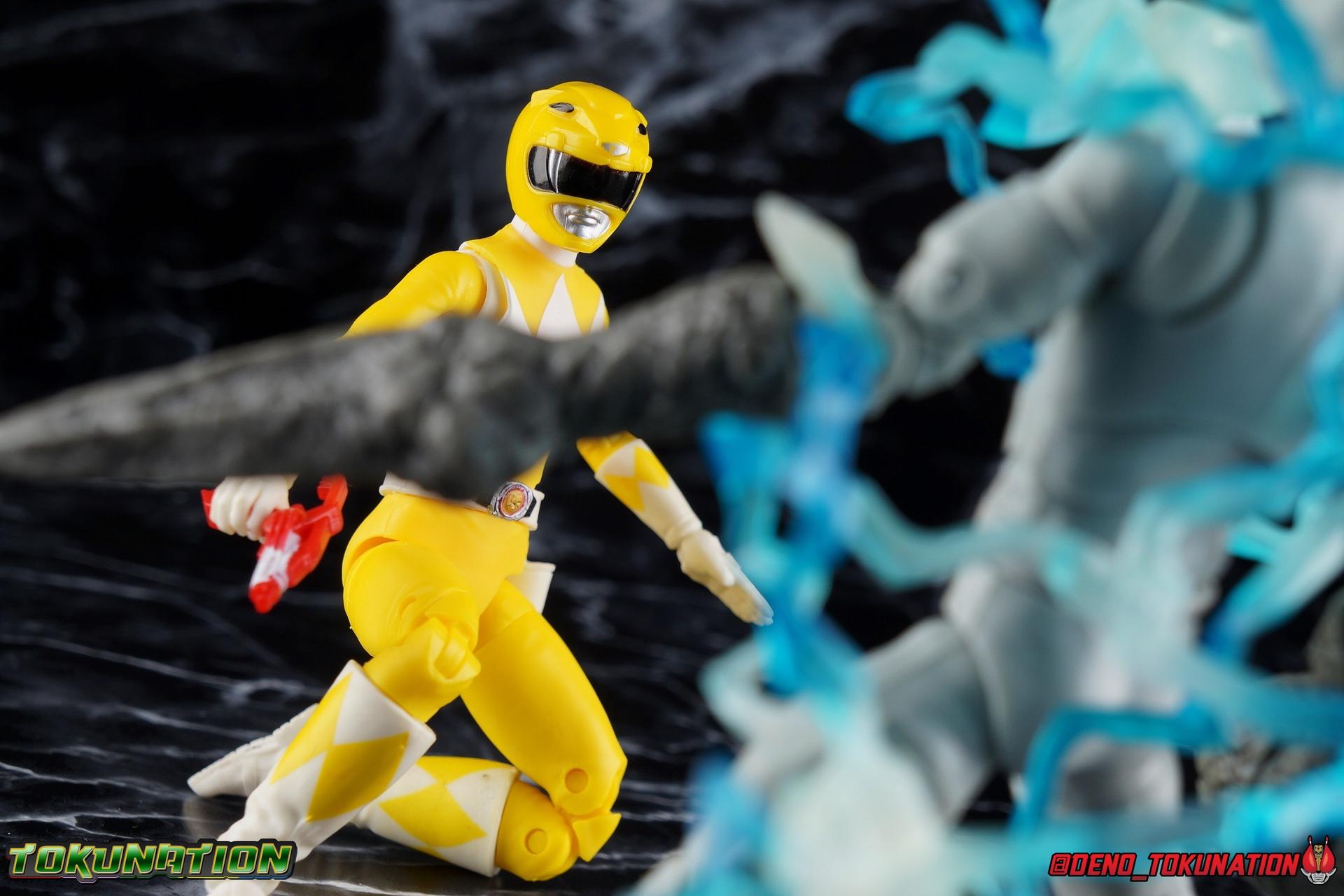 When 5 teenagers with attitude were chosen to defend the Earth, each of them was given access to a universe of power. Transported to the Command Center, and introduced to the quirky robot Alpha 5 & the inter-dimensional being Zordon of Eltar, these young heroes were bestowed with the strength of the ancient dinosaurs. Fearless and agile, Trini Kwan was honored with the powers of the mighty Saber-Toothed Tiger Dino Zord! Power Daggers in hand, Trini joined her teammates as they battled the likes of Goldar, Scorpina, and the evil sorceress Rita Repulsa! Packaging As we are all pretty familiar with the line by now, I'm sure I probably don't need to go through my usual list of reasons why it's awesome. Hasbro was keen to make sure these appealed to collectors and fans of the franchise from throughout it's various eras. And they also really pop thanks in no small part to some wonderful box art, lovingly crafted by artist Tom Whalen aka @strongstufftom on twitter. His artwork is breathtaking, and makes these figure's feel like just a bit more of a passion project from the folks at Hasbro. Main Figure We keep inching closer to the completion of the full Mighty Morphin Power Rangers team from Hasbro's Lightning Collection. After Red, Dragon Shield Red, Dragon Shield Black, Fighting Spirit Green, Pink, White, the upcoming release of Blue, and today's subject the Yellow Ranger, the gap has closed considerably. Leaving only a standard version of Green Ranger, and non-shielded Black Ranger to come. The Yellow Ranger is yet another welcome addition to this team though, and despite some of the molding reused from Pink Ranger, it feels like a slight improvement. As the first female ranger in the line, the Pink Ranger definitely set the bar at an underwhelming level so building Yellow off that base didn't have me super enthused. From the outset the big difference here is that Yellow Ranger doesn't have a skirt, which is of course an accurate look. What I don't really care for is the general build of the body. I get it, Trini was a female Yellow Ranger in Power Rangers, but the source footage used for a majority of her appearances of course depicts the male Tiger Ranger. I would have really preferred a more neutral sculpt for this figure than the proportions given to it. As is it really suits more of a season 2/3 Aisha look, where a majority of the appearances were US filmed footage with a female suit. I know it's a nit-pick, this figure just feels a bit off because of this to me. But at least it isn't the long and lanky outrageously proportioned Bandai 6.5" figure. Structurally we have exactly the same articulation cuts as the pink ranger. Rocker ankles with forward/back ratchets, swiveling boot cuffs below the knee as well as a double jointed knee, a great but tight thigh swivel, and hinged hips. The knees feel a bit loose much as they did on my Pink Ranger, making it a little awkward at times to get Trini standing or posed properly. Loose knees with tight hips is an odd combo for stability. I do feel like I've noticed something more this time around with the mold though, the boots are just a bit too big. Visually they seem too wide for the legs they're attached too. That's admittedly a cosmetic gripe rather than a functional one though. The Yellow Ranger's belt is a little unsightly, upon closer inspection you can see that the paint application is actually off to the left from the sculpted details, making it a bit wonky. But the paint is a bit spotty as well contributing to the issue. So it's hard to make out the Sabertooth Tiger coin. The belt features a holster on the left hip for the included Blade Blaster as well. The holster looks kind of over sized on this figure to me, but I could be wrong. Since there's no skirt attached to the belt we can see the identical waist parts that Yellow Ranger shares with Pink. The torso itself features the same basic design as Pink Ranger, but these are actually different parts.The female MMPR mold has a sort of floating lower torso behind the belt and a ball jointed upper body. While not quite as dynamic as the male mold, it certainly gets the job done. Yellow Ranger appears to have a slightly more slender sculpt with a longer ab section resulting in the two actually looking quite different. The arms are actually in a similar situation. The shoulders are the same butterfly style joint we've seen pretty much across the line. In Yellow Ranger's case the joint has a bit different shape and takes up a little bit less real estate on the torso. The actual shoulders are also a bit different than typical. They sit just a bit out further from the body but ratchet up and out in the same manner. The elbows are of the same new variety as Pink Ranger as well. Rather than the normal double joint hinge we've seen with the boys, Yellow & Pink have a fully rotating elbow on a peg. It's pegged into bicep with a single hinge joint to move it up. This means the elbow isn't double jointed or nearly as dynamic in a forward/back sense, but that it can rotate fully giving it some weird extra range. This is largely to make up for the lack of a bicep swivel. The wrists operate as normal though but I've found the hinges on each hand's peg is very tight. Like a handful of other rangers in the line thus far, I do feel the sculpt is a bit soft on the Yellow Ranger's helmet, but moreover the QC is a bit iffy. On the mouth plate of mine are some strange sculpted lines, the black on the visor isn't fully applied around the edges, and even the silver on the tiger nose is missing a big chunk. The girls are so far not my favorite figures in the Lightning Collection, but I feel the shortcomings of the mold at this point are largely owed to growing pains of the line more than anything else. Accessories 1 - Trini unmasked head. By far one of the better likenesses in the line, Hasbro really nailed Thuy Trang's face with this sculpt. The long hair also manages to be less cumbersome than some others like 