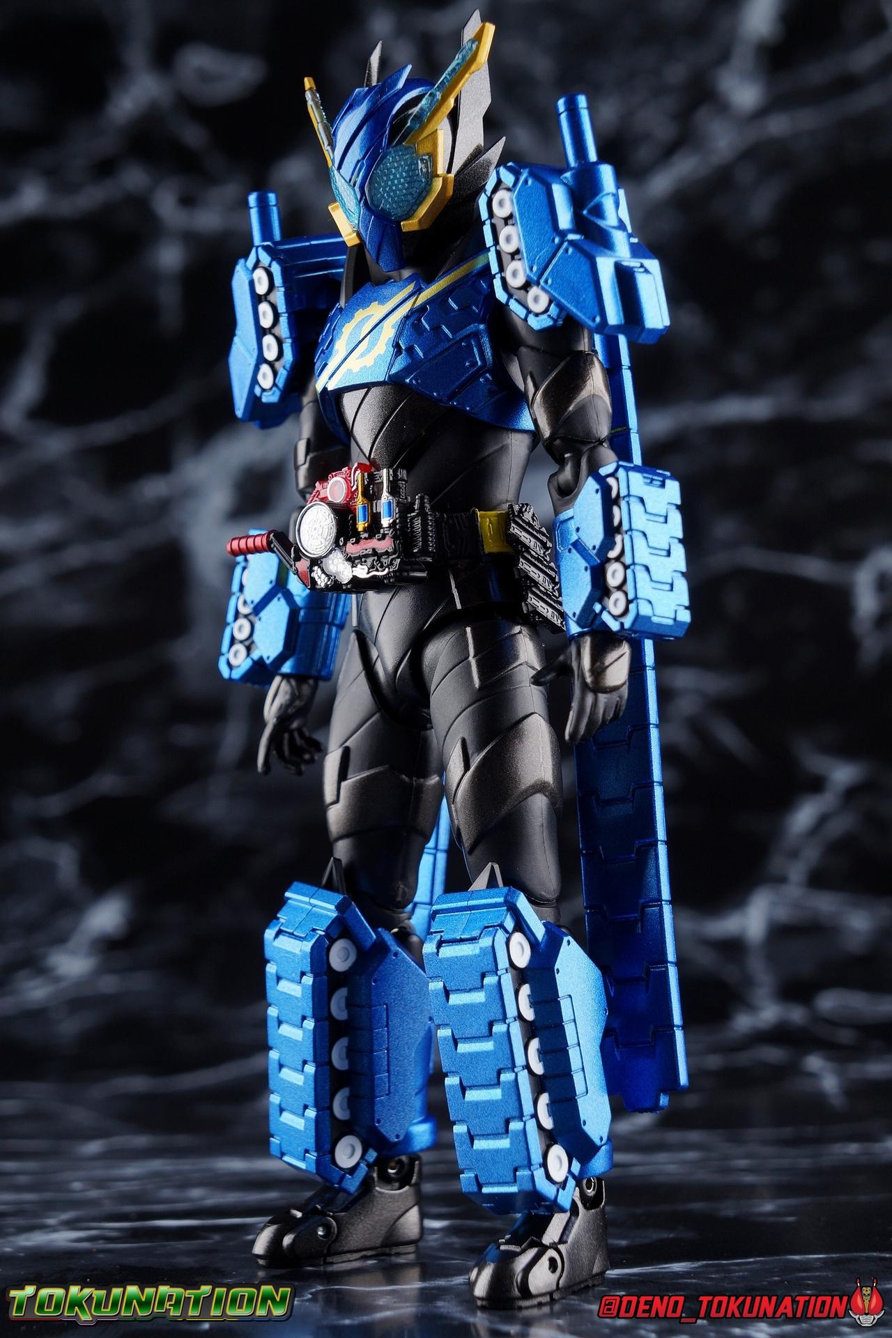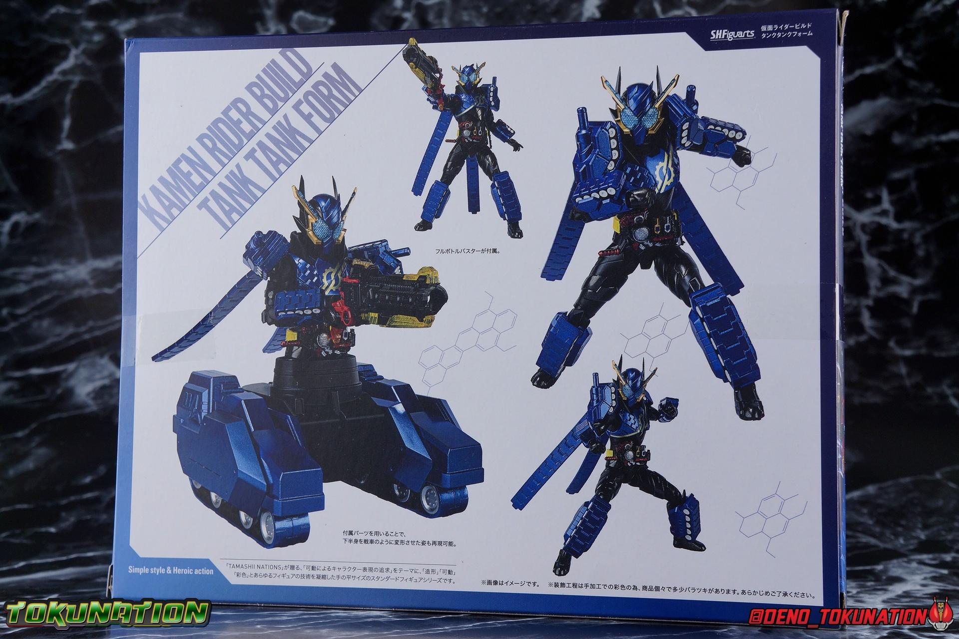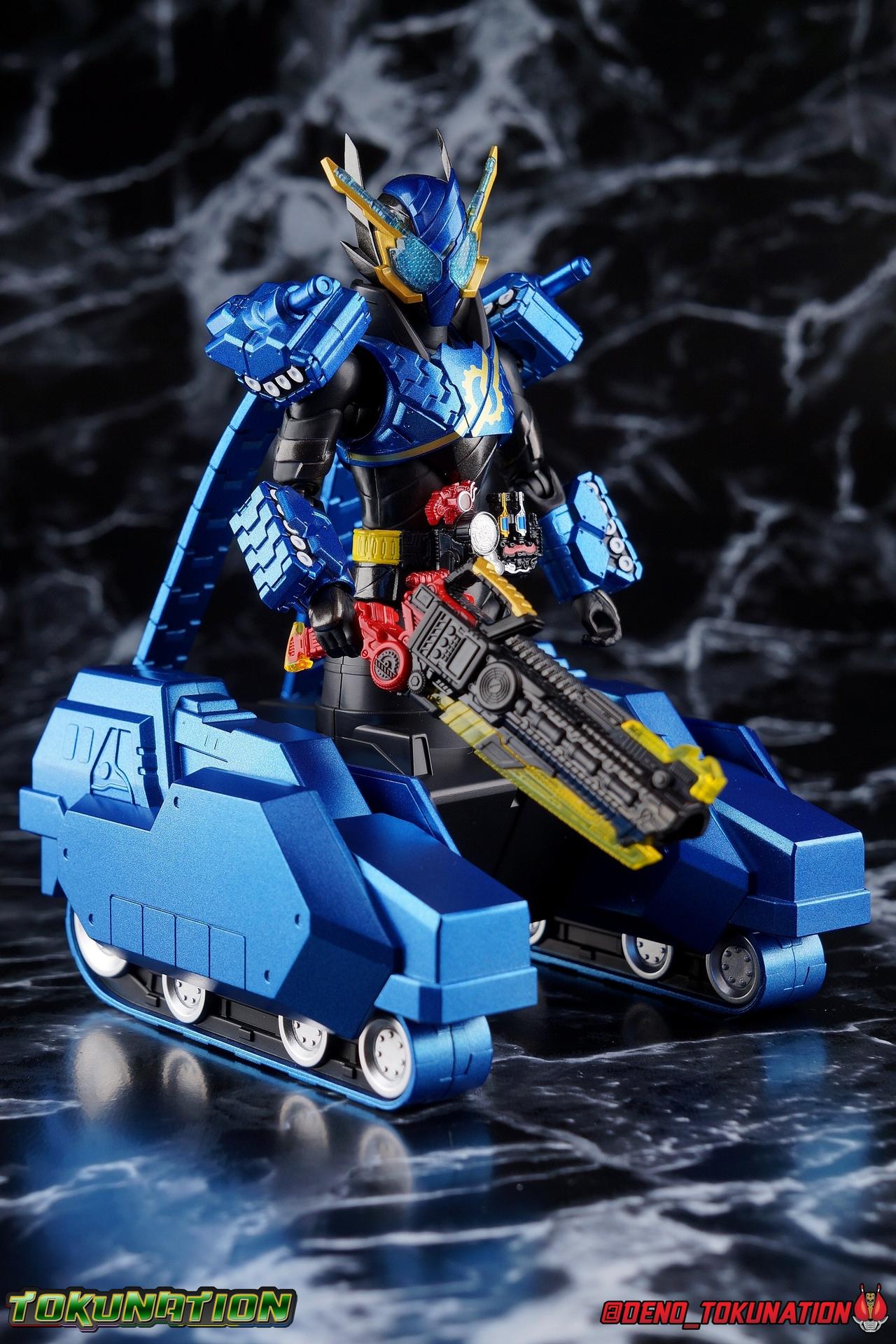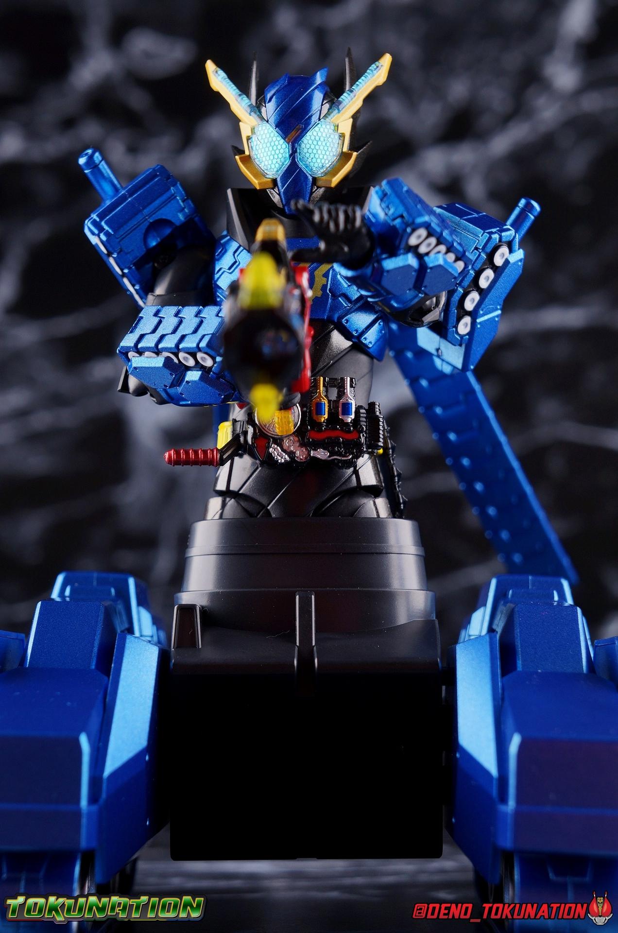 The Hazard Trigger, a weapon of unmatched power. With it, Sento Kiryu can gain the upper hand in any fight, becoming an unstoppable berserker in the process. To contain this uncontrollable power, Sento develops a new Full Bottle to channel his strength and his consciousness. Surpassing the genius of Takumi Katsuragi, and maintaining himself within the chaos of Hazard Form, the Full Full Rabbit Tank Bottle creates two divergent forms! One with all the speed and agility of a rabbit, the crimson speedy jumper Kamen Rider Build Rabbit Rabbit Form! The other, bearing the firepower of it's own military force and the strength to wield it, the steel blue warrior, Kamen Rider Build Tank Tank Form! Representing his home Seito in the 3-round battle, Build will test his new powers against the dangerous Kamen Rider Rogue. Packaging At odds with the regularity of the Build subline's packaging, Tank Tank Form comes in a massive box. While the odd release here and there like the Hokuto Three Crows or Machine Builder have come in expanded packaging styles, this one is quite unique as an alternate form. The large box is primarily the result of the massive Tank Mode parts included with this release, which double the size of the parts trays needed. It's an impressive release and the packaging is evidence of this. Aside from the unusual size the Tank Tank box fits right in thematically with the rest of Build's line. Main Figure Like many figuarts from Build, Tank Tank Form is at a basic structural level, a reuse of the standard Rabbit Tank Form mold. Much of this line is basic parts reuse, with elaborate paint additions to differentiate them, and Tank Tank takes the changes made for the Rabbit Rabbit Form release and builds (ha ha!) on them as well. Essentially the molde is the same with new armor in place of a bulk of Rabbit Rabbit's parts. The legs are identical to Rabbit Rabbit, aside from those massive tank treads on the shins. They may be big but they don't weigh much so they don't cause any instability. And despite the bulk they don't terribly hamper ankle movement, the range is about the same as you can get out of rabbit rabbit, maybe slightly less in the forward direction. The ankle joints *as well as knees and hips) are nice & tight, providing a very stable base of support. And if anything that big raised flat surface on the shin gives the figure a great base to rest one leg down on the ground with. And works well for the included Tank Mode parts. The leg's as a whole function largely unchanged from their very first outing with Rabbit Tank, and really are a dynamic functional design. The torso features yet another outing for the wonderful Build Driver, with a the same additions that came along with both Hazard & Rabbit Rabbit. Carried over from the Hazard Form release is the Hazard Trigger, it's molded in place on the top right of the driver. I wish it was removable for a figure to hold, but if they were going to give us one of those I'm guessing it would have been with the actual Hazard Form figuart. The Driver also feature the new Full Full Rabbit Tank Bottle in it's collapsed form, and colored blue for Tank Tank Form. It's removable as are all Full Bottles in the line, though it can't transform. An alternate accessory is included to replicate the cylinder form. As always an optional Full Bottle holster is attached to the left hip as well, though I refrain from using it out of fear of losing bottles. The torso features armor that's functionally the same as Rabbit Rabbit, but is cosmetically differnet, sporting a really cool tank tread pattern this time. The chest armor feels like a proper piece of torso armor wrapped around the figure, rather than two piece of armor fused together as is traditional of Build's red/blue asymmetrical forms. Emblazoned on the chest is the golden Build emblem as well. I've always really dug this gear like symbol and I wish more riders had something like it on their suits. The arms are likewise mostly the same as what Rabbit Rabbit gave us. The shoulders do feature new rotating mini-tank pads. Each is on an up/down hinge but also has a full 360 ball joint so they can be spun forward to simulate shots being fired. The basic design of builds arms means that the shoulders have plenty of room to move out from the body to maneuver and angle, while maintaining a very natural look. The forearms continue the tank theme with more big beefy treads that thankfully don't add a ton of weight to the design. As always the Build mold's wrist design works wonderfully. Tank Tank also has it's own version of the signature coattails. Rather than pegging directly into the back on a ball jointed peg, these flowing tank treads attach to the underside of a couple panels. You lose a little bit of the freedom of movement from the rabbit rabbit design, but they still work just fine and don't interfere with how the figure functions. Tank Tank's tread are made of a softer plastic and are therefore a bit more flexible, but still lightweight so they're never a problem for balance either. It's the best of both worlds and Tamashii needs to implement something akin to this in more figures. Finally Tank Tank's head has the obvious base of the Hazard Form, as seen by the black spires coming out from behind the mask. The new tank visors are (like rabbit rabbit) easily some of the best I've seen from the line as well. The clarity of the underlying pattern is near crystal clear, and the gold accent really makes them pop. And while this figure can't exactly replicate the little Advance Wars style battalion of tanks descending on the battlefield (much as Rabbit Rabbit has no giant jumping rabbit mode) for Sento to armor up with, it is an absolutely solid retool of an already tried & true mold. The overall package s very impressive without even taking into account the accessories. Accessories 4 - sets of hands. As always, the Build line continues to give us a wealth of expressive options for each figure. Two ty