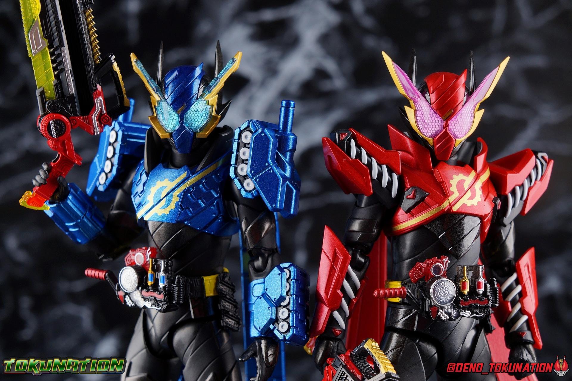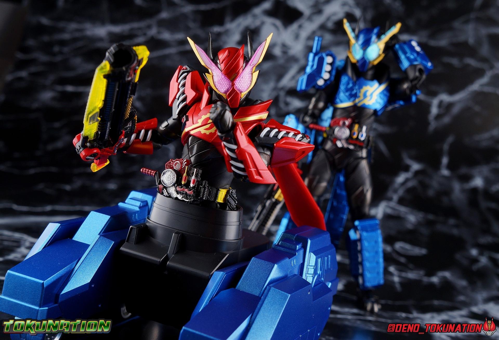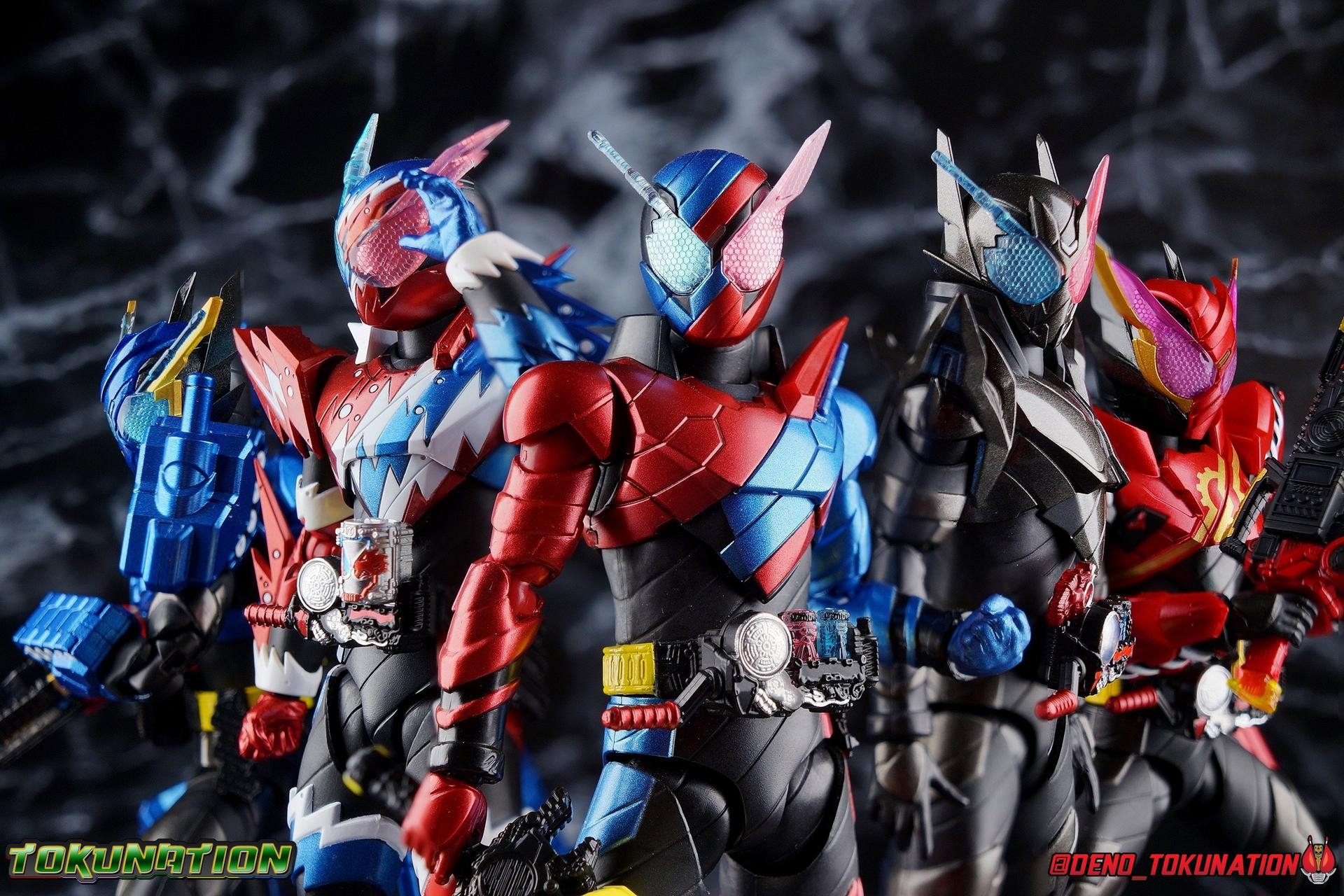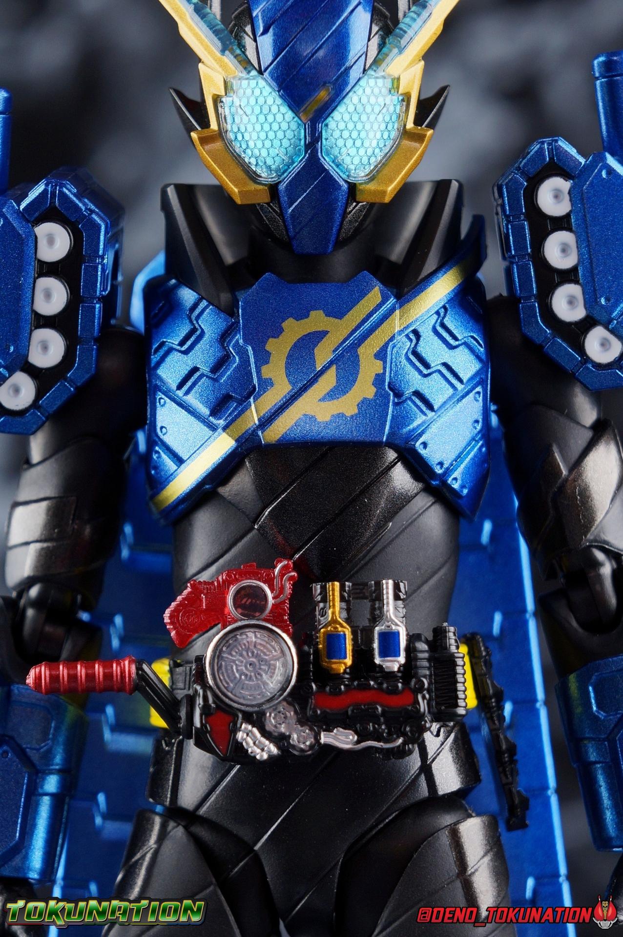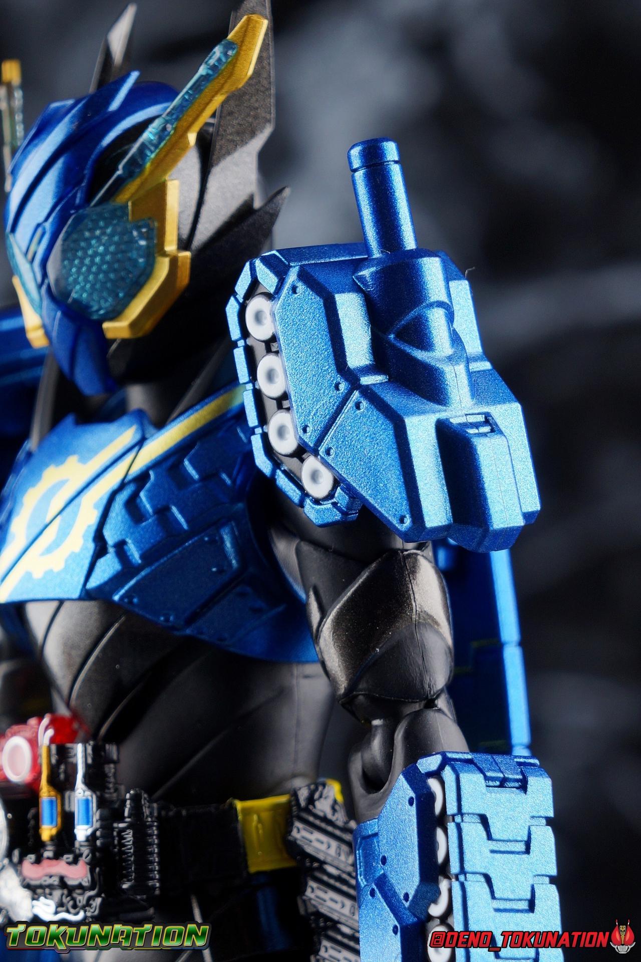 The Hazard Trigger, a weapon of unmatched power. With it, Sento Kiryu can gain the upper hand in any fight, becoming an unstoppable berserker in the process. To contain this uncontrollable power, Sento develops a new Full Bottle to channel his strength and his consciousness. Surpassing the genius of Takumi Katsuragi, and maintaining himself within the chaos of Hazard Form, the Full Full Rabbit Tank Bottle creates two divergent forms! One with all the speed and agility of a rabbit, the crimson speedy jumper Kamen Rider Build Rabbit Rabbit Form! The other, bearing the firepower of it's own military force and the strength to wield it, the steel blue warrior, Kamen Rider Build Tank Tank Form! Representing his home Seito in the 3-round battle, Build will test his new powers against the dangerous Kamen Rider Rogue. Packaging At odds with the regularity of the Build subline's packaging, Tank Tank Form comes in a massive box. While the odd release here and there like the Hokuto Three Crows or Machine Builder have come in expanded packaging styles, this one is quite unique as an alternate form. The large box is primarily the result of the massive Tank Mode parts included with this release, which double the size of the parts trays needed. It's an impressive release and the packaging is evidence of this. Aside from the unusual size the Tank Tank box fits right in thematically with the rest of Build's line. Main Figure Like many figuarts from Build, Tank Tank Form is at a basic structural level, a reuse of the standard Rabbit Tank Form mold. Much of this line is basic parts reuse, with elaborate paint additions to differentiate them, and Tank Tank takes the changes made for the Rabbit Rabbit Form release and builds (ha ha!) on them as well. Essentially the molde is the same with new armor in place of a bulk of Rabbit Rabbit's parts. The legs are identical to Rabbit Rabbit, aside from those massive tank treads on the shins. They may be big but they don't weigh much so they don't cause any instability. And despite the bulk they don't terribly hamper ankle movement, the range is about the same as you can get out of rabbit rabbit, maybe slightly less in the forward direction. The ankle joints *as well as knees and hips) are nice & tight, providing a very stable base of support. And if anything that big raised flat surface on the shin gives the figure a great base to rest one leg down on the ground with. And works well for the included Tank Mode parts. The leg's as a whole function largely unchanged from their very first outing with Rabbit Tank, and really are a dynamic functional design. The torso features yet another outing for the wonderful Build Driver, with a the same additions that came along with both Hazard & Rabbit Rabbit. Carried over from the Hazard Form release is the Hazard Trigger, it's molded in place on the top right of the driver. I wish it was removable for a figure to hold, but if they were going to give us one of those I'm guessing it would have been with the actual Hazard Form figuart. The Driver also feature the new Full Full Rabbit Tank Bottle in it's collapsed form, and colored blue for Tank Tank Form. It's removable as are all Full Bottles in the line, though it can't transform. An alternate accessory is included to replicate the cylinder form. As always an optional Full Bottle holster is attached to the left hip as well, though I refrain from using it out of fear of losing bottles. The torso features armor that's functionally the same as Rabbit Rabbit, but is cosmetically differnet, sporting a really cool tank tread pattern this time. The chest armor feels like a proper piece of torso armor wrapped around the figure, rather than two piece of armor fused together as is traditional of Build's red/blue asymmetrical forms. Emblazoned on the chest is the golden Build emblem as well. I've always really dug this gear like symbol and I wish more riders had something like it on their suits. The arms are likewise mostly the same as what Rabbit Rabbit gave us. The shoulders do feature new rotating mini-tank pads. Each is on an up/down hinge but also has a full 360 ball joint so they can be spun forward to simulate shots being fired. The basic design of builds arms means that the shoulders have plenty of room to move out from the body to maneuver and angle, while maintaining a very natural look. The forearms continue the tank theme with more big beefy treads that thankfully don't add a ton of weight to the design. As always the Build mold's wrist design works wonderfully. Tank Tank also has it's own version of the signature coattails. Rather than pegging directly into the back on a ball jointed peg, these flowing tank treads attach to the underside of a couple panels. You lose a little bit of the freedom of movement from the rabbit rabbit design, but they still work just fine and don't interfere with how the figure functions. Tank Tank's tread are made of a softer plastic and are therefore a bit more flexible, but still lightweight so they're never a problem for balance either. It's the best of both worlds and Tamashii needs to implement something akin to this in more figures. Finally Tank Tank's head has the obvious base of the Hazard Form, as seen by the black spires coming out from behind the mask. The new tank visors are (like rabbit rabbit) easily some of the best I've seen from the line as well. The clarity of the underlying pattern is near crystal clear, and the gold accent really makes them pop. And while this figure can't exactly replicate the little Advance Wars style battalion of tanks descending on the battlefield (much as Rabbit Rabbit has no giant jumping rabbit mode) for Sento to armor up with, it is an absolutely solid retool of an already tried & true mold. The overall package s very impressive without even taking into account the accessories. Accessories 4 - sets of hands. As always, the Build line continues to give us a wealth of expressive options for each figure. Two ty