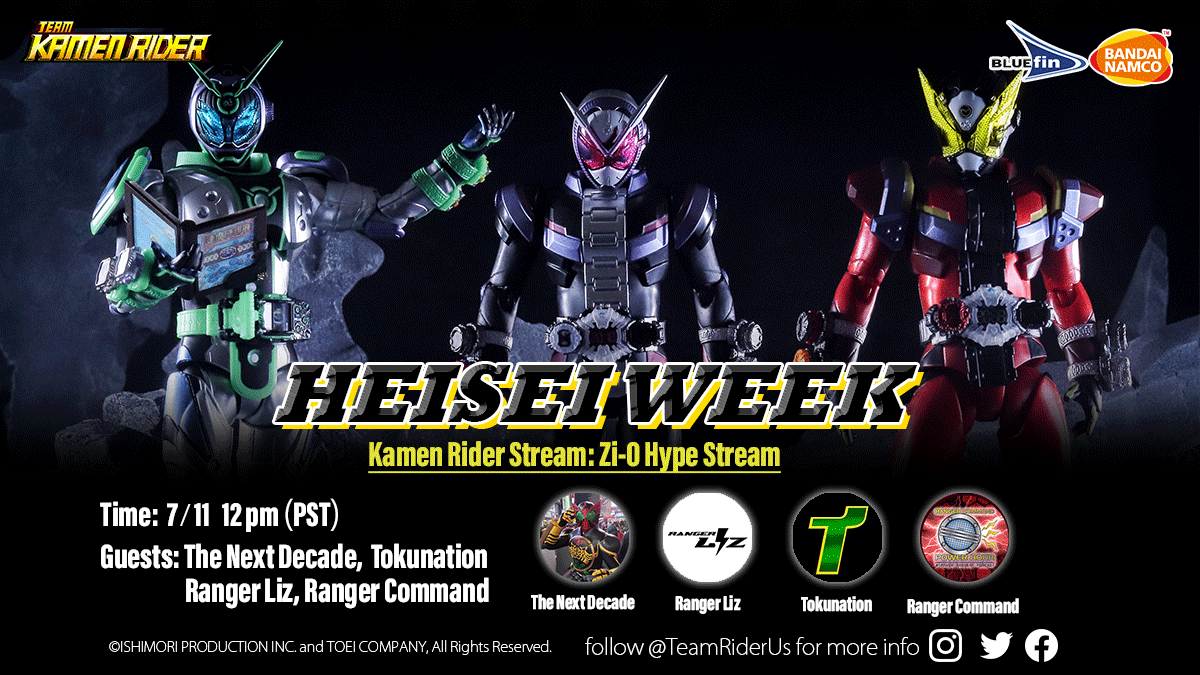 July 6th through the 11th is officially KAMEN RIDER HEISEI WEEK! All week long we will be celebrating the Heisei era of Kamen Rider along with our friends at Team Kamen Rider, Bluefin Brands, Shout! Factory TV, TokuSHOUTsu, and Nerdist. So let's get straight to the details! KAMEN RIDER HEISEI GENERATIONS FOREVER MOVIE WHAT: The final Heisei era movie for Kamen Rider featuring every main Kamen Rider from the Heisei era WHERE: Premiering July 11th (exact time TBD) on Nerdist's YouTube Channel as well as Geek & Sundry's Twitch channel. WHEN: TBD (stay tuned!) WHO: The stream will be available for audiences in the United States and Canada (and anyone with a VPN ... just saying ...) ALSO: The movie will be available via TokuSHOUTsu and their streaming partners by August 1st. NERDIST HOUSE 2020 PANEL PRIOR TO THE MOVIE WHAT: Join Team Kamen Rider, Shout! Factory TV, TokuNation, and Tokusatsu Network as they discuss Kamen Rider, the Heisei Generations FOREVER movie, and more! Hosted by Nerdist on their Nerdist House 2020 program! WHERE: The Nerdist YouTube channel WHEN: Immediately prior to the movie's premiere FOR HOW LONG: TBD! EXCLUSIVE MERCHANDISE? Team Kamen Rider has teased that new merchandise exclusive to this event will become available during Heisei Week! The first wave of product announcements will come via Ranger Liz and her YouTube channel. WHAT: Merchandise reveal for Heisei week! WHERE: Ranger Liz YouTube channel! WHEN: Friday, July 3rd (Time TBD) WHO: Team Kamen Rider will join Ranger Liz to reveal merchandise that is being made available for US fans for the first time ever during the Heisei Week celebration and the Kamen Rider Heisei Generations Forever movie. Click here for our entire list of official Kamen Rider apparel available now at Amazon! Click here to check out everything available via the Team Kamen Rider page! LIVE STREAM EVENTS WHAT: All week long during Heisei Week, Team Kamen Rider will be hosting live streams with tokusatsu influencers to discuss all your favorite Heisei Kamen Rider shows and collectibles. WHERE: Bluefin Brands YouTube channel but also streamed via their Twitter, Instagram, and Facebook pages