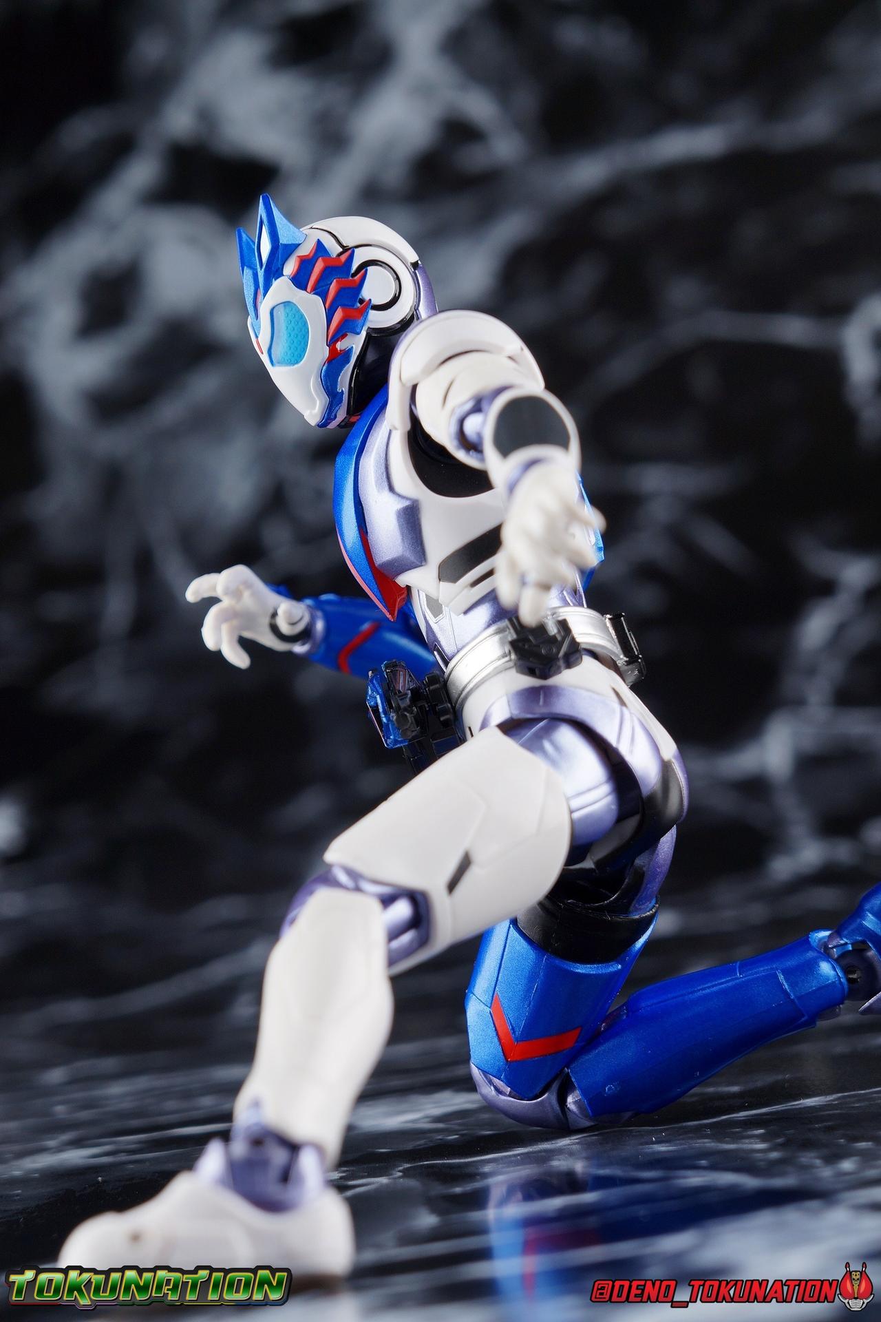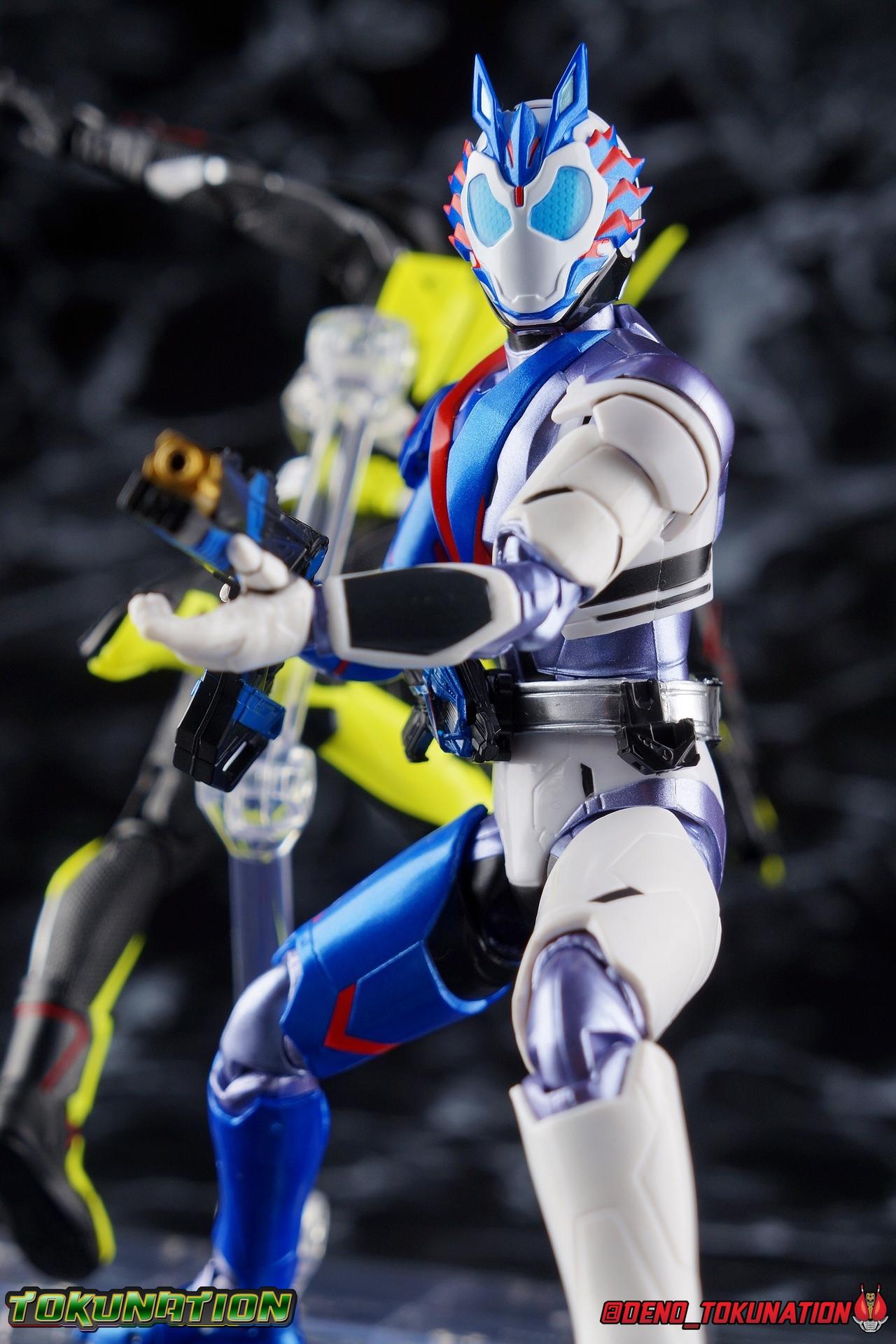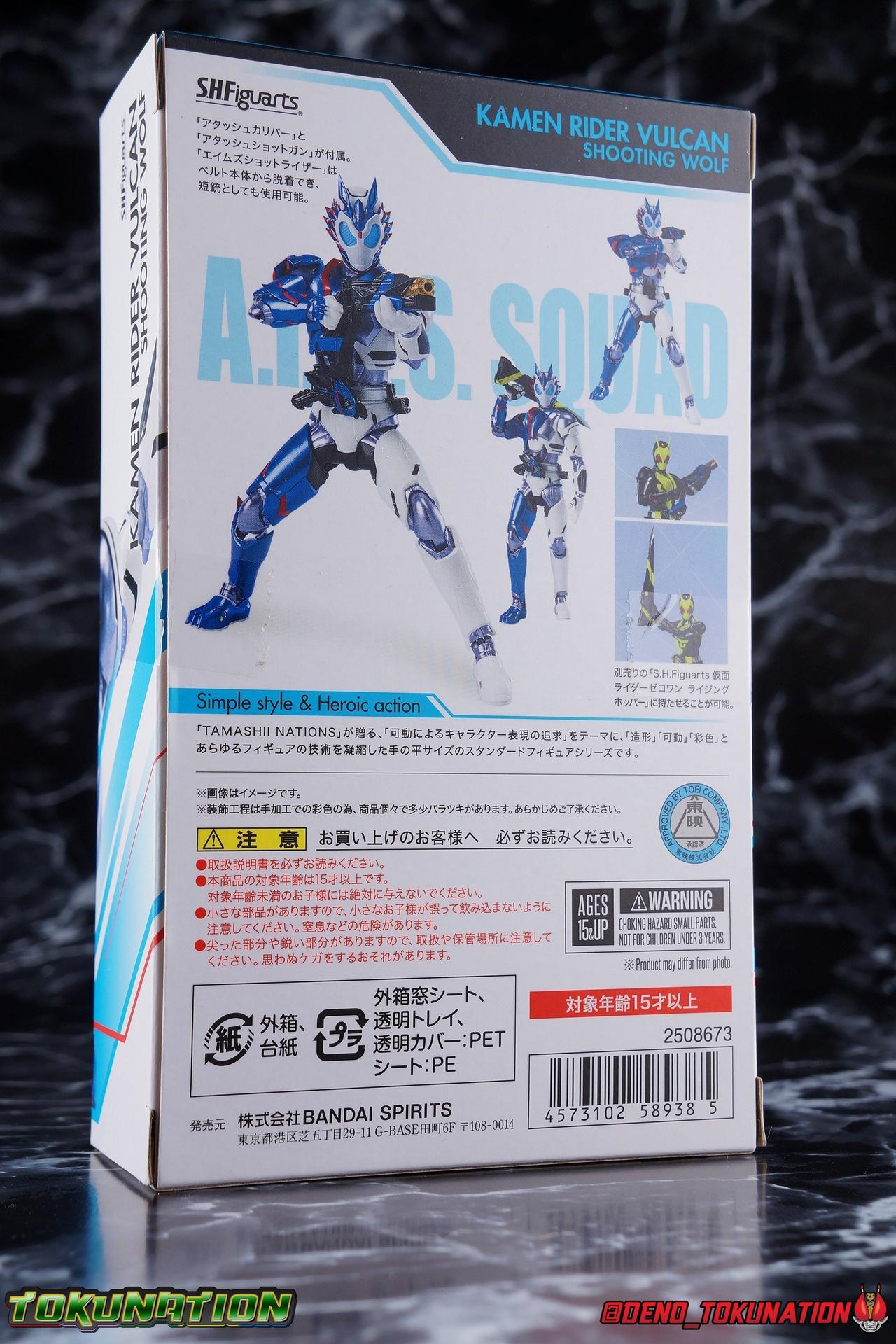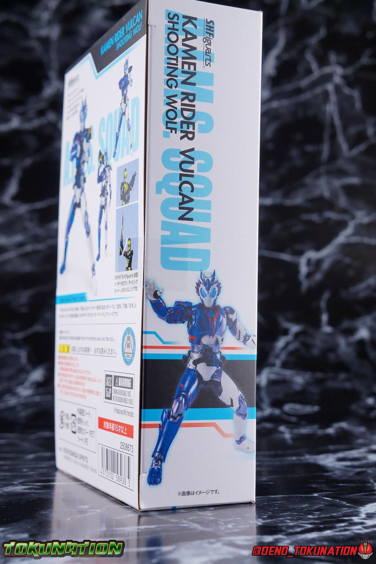 For as long as Fuwa Isamu could remember, his past was ruined by the berserk Humagears of Daybreak Town. Holding a grudge against them all because of this, Fuwa dedicated himself to their total destruction as a member of A.I.M.S. However, this was all a plot by president Gai Amatsu of ZAIA, to drive Fuwa to hate Humagears even more as he became a Kamen Rider. With the knowledge of his true past revealed, and both he and Naki free of ZAIA's control, Fuwa is ready to continue fighting free of the anger that drove him. Instead Fuwa will help defend Humagears with Aruto Hiden & Izu. He will realize his own dream, to truly be Kamen Rider Vulcan! Packaging While it's hard to say that there have been any real innovations in Kamen Rider Figuart packaging in recent years physically, Zero-One's box did something pretty cool with the black light reactive stripes. Vulcan however doesn't feature that same kind of touch. Zero-One is the only character in show to really be shown in that black light style in the opening though, so I'm not so surprised. The box design itself is very reminiscent of Vulcan's own Rising Impact attack. And I always welcome the annual change in rider box designs, so this is no different. Main Figure So Kamen Rider Zero-One really set quite the high bar for the riders of this series. Vulcan builds off that quite nicely as well. A new series always need to start strong and set the standard and two releases in, I believe Zero-One is going strong. The one thing Zero-One really has on Vulcan is the black light reactive parts. Despite being primarily colored white, Vulcan doesn't really have much reactivity to black lights. But that's not really a gimmick of his either, unlike Zero-One. But from functionality and detail stand points, Vulcan packs every bit of punch that Zero-One does. Vulcan's body is decked out in the same kinds of minute details as Zero-One. From the ground up it's a splendid recreation of the show costume. Much like Zero-One, Vulcan has feet that look an awful lot like actual sporty sneakers and function much the same, leaving the ankles to fully rotate and angle pretty freely back and forth. While toe bends can be easily overlooked, it's a big solid joint with plenty of surface coverage for support. For the legs we get a a really stellar backward bend in the knees giving us the ability to nearly lay the legs back parallel on themselves. Also like Zero-One, Vulcan has a ton of really well defined textured details on the body, though not really the same kinds. Zero-One's raised black textures are magnificent and add much depth to the design, but Vulcan has more of an armored appearance with nicely segmented components. This design looks much more like a suit of armor than Zero-One's more sporty look. One little not I adore is the slight creased folds on the knee joints giving them the appearance of real fabric. The thighs and hips themselves are also fantastically designed. While the hips are of the drop down variety, a kind I don't always like, these really are great and and leave plenty of leeway for posing particularly with that thick raised thigh armor. A similar design to Zero-One but clearly a different mold. Around the waist is the new Shot Riser! This A.I.M.S driver acts as both transformation device and weapon. About as functional as other recent driver's the Shot Riser is easily removable from the buckle around Vulcan's waist. A perfect fit for the hands included for it, this firearm can also except the same Progrise Keys that are present through out the Zero-One line. Like the Zero-One Driver there's a small window within the Shot Riser that shows the Progrise Key currently inserted, which is a fantastic detail. The Shot Riser of course has the Shooting Wolf Key pre-loaded. Both the left & right hips feature Progrise Holders like Zero-One, which may seem a bit odd given that so far we don't actually have any closed Progrise Keys in the line to use with them. I'm almost certain we'll see some included with future releases. The upper body is of a similar albeit slightly improved design over Zero-One. We get a complete 360 degree rotating waist joint, a floating upper body that can lean about 45 degrees to either side, and lots of room to arch the back with forward bends that are more pronounced than Zero-One. Vulcan also features some arms every bit as nice as his buddy. While he doesn't have the same kind of low profile shoulder pads as Zero-One, we get lots of play in the shoulder pads thanks to the same slide mechanism underneath. You can take advantage of it to angle the armor up over the main body and stretch the arms outward a bit more. There's a full 360 rotating bicep swivel, double jointed elbows and a great set of wrist ball joints. The arms may not do anything particularly new, but what they do accomplish makes them very solid. This finally brings us to Vulcan's head. The sculpt is certainly dead on, but I swear every time I look at it, it feels less like a wolf and more like a horse design to me? That may just be me, but still the head looks great, particularly those striking blue compound eyes. However I do feel the neck has a bit more limitation to it than Zero-One did. But Zero-One also has quite the extraordinarily designed neck as well. Even with it's slight limitation this is still a fantastic design that tops off the figure very nicely. Accessories Fuwa comes with everything he needs and then some: 4 - sets of hands. 1 pair each for holding either of the included weapons, 1 pair of open palms, and 1 pair of closed fists. The figure comes with another pair of open palms already attached as well. 1 - Attache Shotgun. A powerful sidearm wielded by both Kamen Rider's Vulcan & Jin, this Attache Shotgun is a non-transforming scale representation of the in-show weapon. While it's non-functional it's still pretty great to have it included when Zero-One didn't get his Attache weapon. Speaking of... 1 - Attache Calibur. Intended for use with you