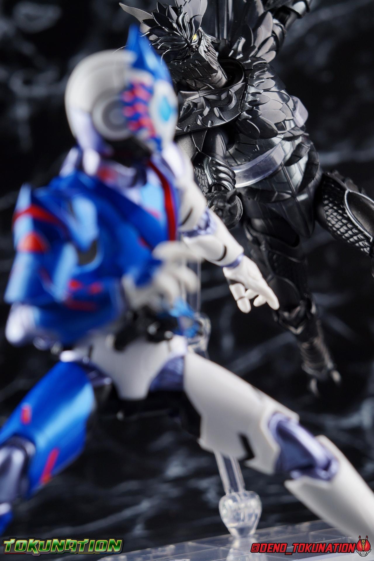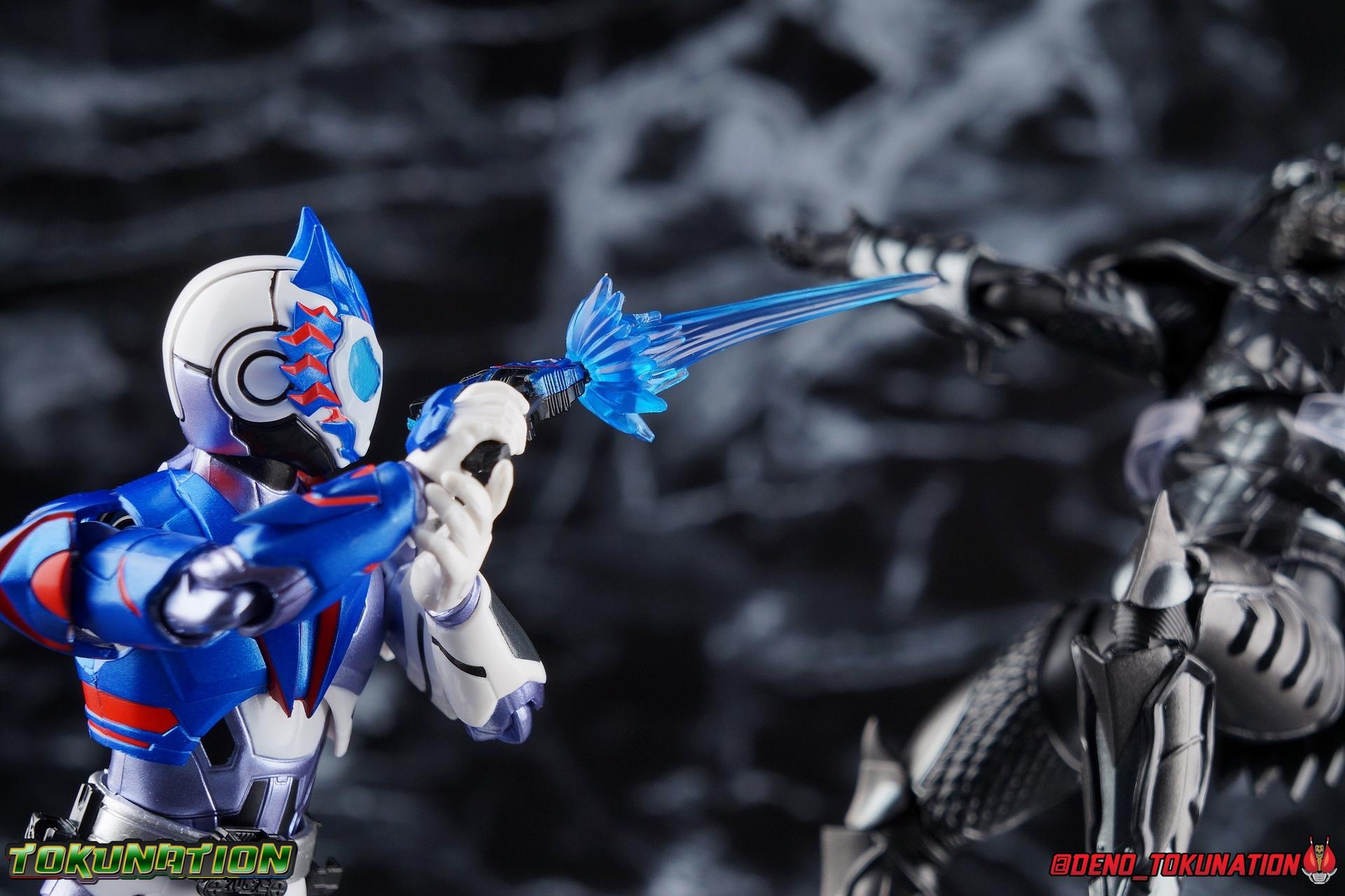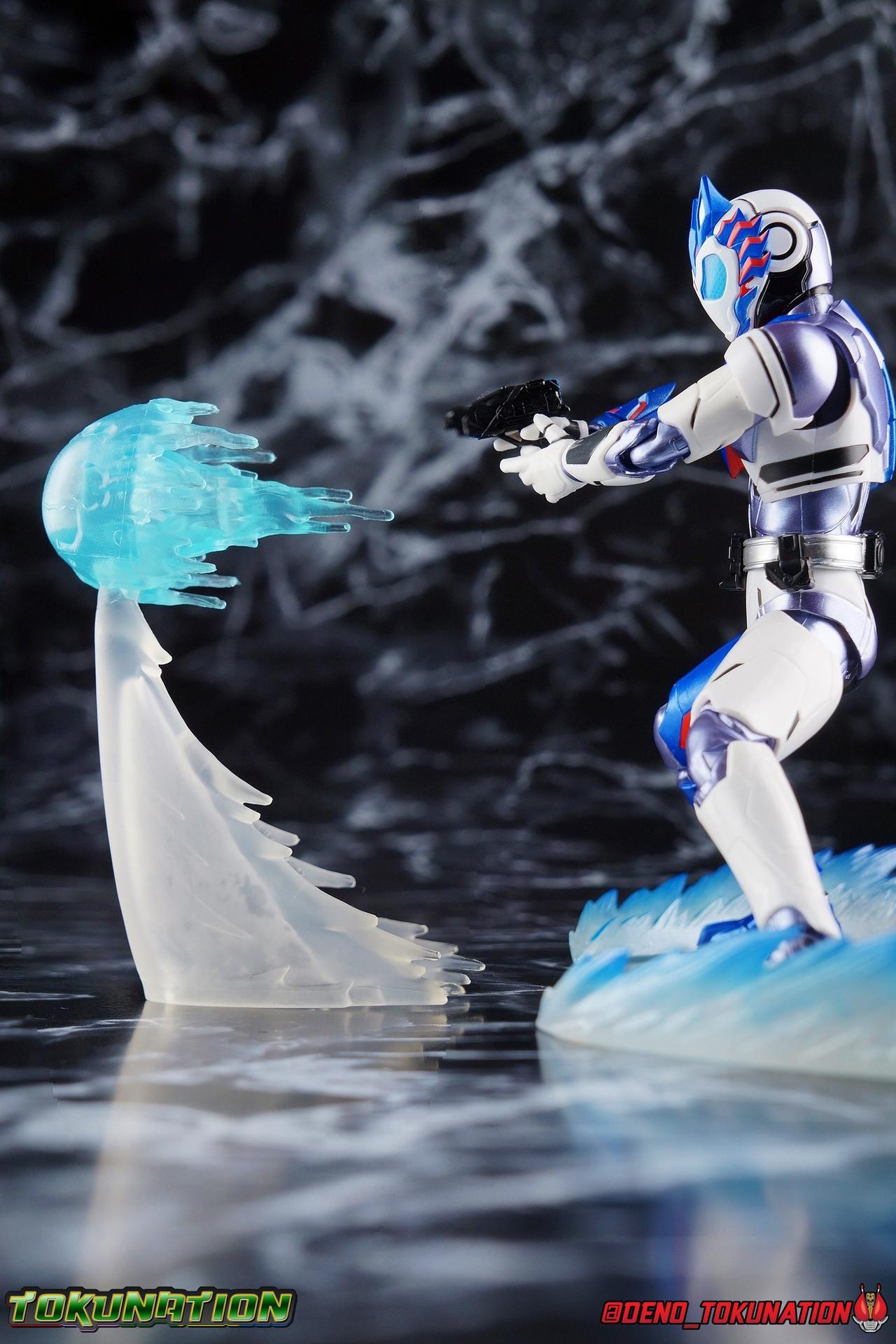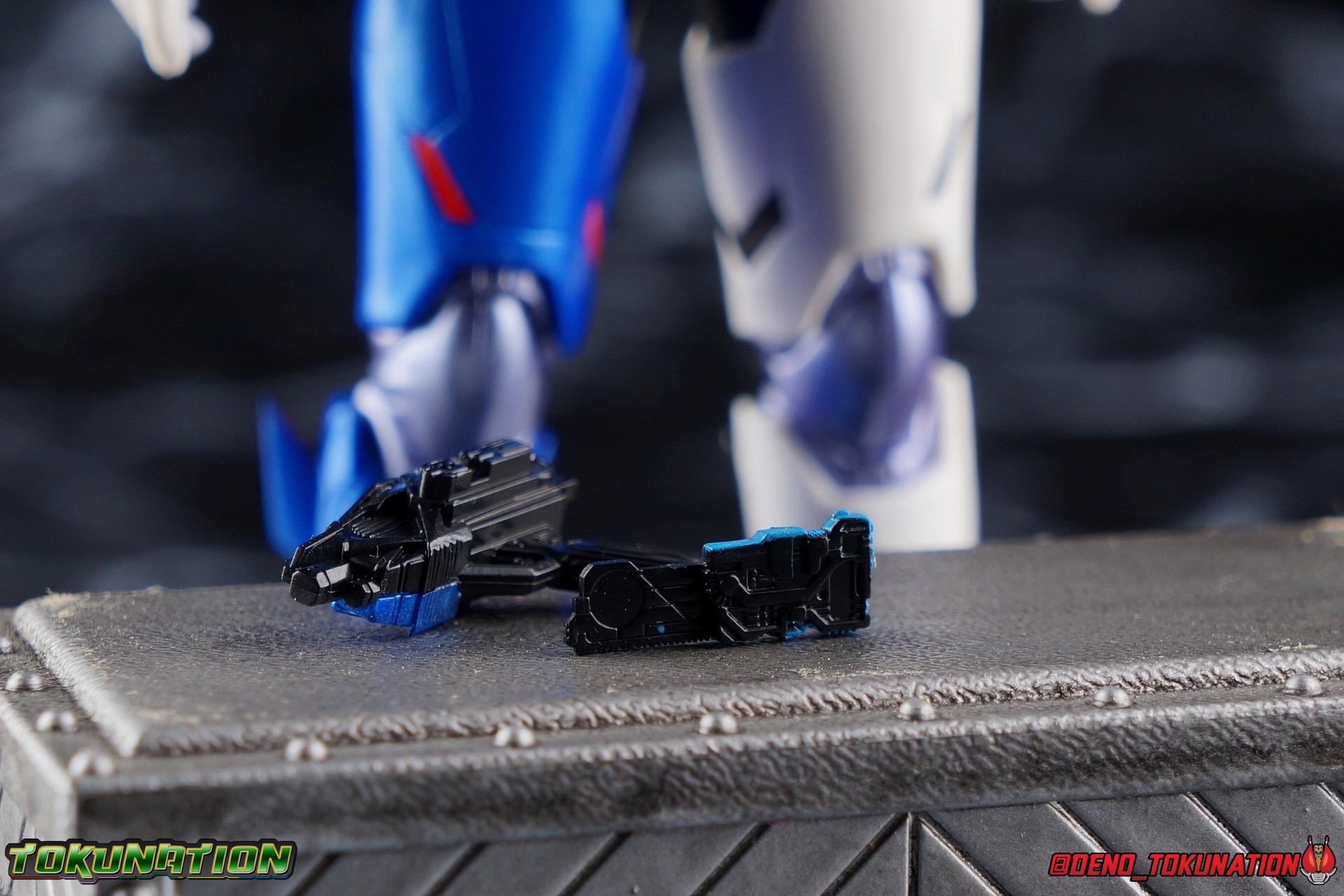 For as long as Fuwa Isamu could remember, his past was ruined by the berserk Humagears of Daybreak Town. Holding a grudge against them all because of this, Fuwa dedicated himself to their total destruction as a member of A.I.M.S. However, this was all a plot by president Gai Amatsu of ZAIA, to drive Fuwa to hate Humagears even more as he became a Kamen Rider. With the knowledge of his true past revealed, and both he and Naki free of ZAIA's control, Fuwa is ready to continue fighting free of the anger that drove him. Instead Fuwa will help defend Humagears with Aruto Hiden & Izu. He will realize his own dream, to truly be Kamen Rider Vulcan! Packaging While it's hard to say that there have been any real innovations in Kamen Rider Figuart packaging in recent years physically, Zero-One's box did something pretty cool with the black light reactive stripes. Vulcan however doesn't feature that same kind of touch. Zero-One is the only character in show to really be shown in that black light style in the opening though, so I'm not so surprised. The box design itself is very reminiscent of Vulcan's own Rising Impact attack. And I always welcome the annual change in rider box designs, so this is no different. Main Figure So Kamen Rider Zero-One really set quite the high bar for the riders of this series. Vulcan builds off that quite nicely as well. A new series always need to start strong and set the standard and two releases in, I believe Zero-One is going strong. The one thing Zero-One really has on Vulcan is the black light reactive parts. Despite being primarily colored white, Vulcan doesn't really have much reactivity to black lights. But that's not really a gimmick of his either, unlike Zero-One. But from functionality and detail stand points, Vulcan packs every bit of punch that Zero-One does. Vulcan's body is decked out in the same kinds of minute details as Zero-One. From the ground up it's a splendid recreation of the show costume. Much like Zero-One, Vulcan has feet that look an awful lot like actual sporty sneakers and function much the same, leaving the ankles to fully rotate and angle pretty freely back and forth. While toe bends can be easily overlooked, it's a big solid joint with plenty of surface coverage for support. For the legs we get a a really stellar backward bend in the knees giving us the ability to nearly lay the legs back parallel on themselves. Also like Zero-One, Vulcan has a ton of really well defined textured details on the body, though not really the same kinds. Zero-One's raised black textures are magnificent and add much depth to the design, but Vulcan has more of an armored appearance with nicely segmented components. This design looks much more like a suit of armor than Zero-One's more sporty look. One little not I adore is the slight creased folds on the knee joints giving them the appearance of real fabric. The thighs and hips themselves are also fantastically designed. While the hips are of the drop down variety, a kind I don't always like, these really are great and and leave plenty of leeway for posing particularly with that thick raised thigh armor. A similar design to Zero-One but clearly a different mold. Around the waist is the new Shot Riser! This A.I.M.S driver acts as both transformation device and weapon. About as functional as other recent driver's the Shot Riser is easily removable from the buckle around Vulcan's waist. A perfect fit for the hands included for it, this firearm can also except the same Progrise Keys that are present through out the Zero-One line. Like the Zero-One Driver there's a small window within the Shot Riser that shows the Progrise Key currently inserted, which is a fantastic detail. The Shot Riser of course has the Shooting Wolf Key pre-loaded. Both the left & right hips feature Progrise Holders like Zero-One, which may seem a bit odd given that so far we don't actually have any closed Progrise Keys in the line to use with them. I'm almost certain we'll see some included with future releases. The upper body is of a similar albeit slightly improved design over Zero-One. We get a complete 360 degree rotating waist joint, a floating upper body that can lean about 45 degrees to either side, and lots of room to arch the back with forward bends that are more pronounced than Zero-One. Vulcan also features some arms every bit as nice as his buddy. While he doesn't have the same kind of low profile shoulder pads as Zero-One, we get lots of play in the shoulder pads thanks to the same slide mechanism underneath. You can take advantage of it to angle the armor up over the main body and stretch the arms outward a bit more. There's a full 360 rotating bicep swivel, double jointed elbows and a great set of wrist ball joints. The arms may not do anything particularly new, but what they do accomplish makes them very solid. This finally brings us to Vulcan's head. The sculpt is certainly dead on, but I swear every time I look at it, it feels less like a wolf and more like a horse design to me? That may just be me, but still the head looks great, particularly those striking blue compound eyes. However I do feel the neck has a bit more limitation to it than Zero-One did. But Zero-One also has quite the extraordinarily designed neck as well. Even with it's slight limitation this is still a fantastic design that tops off the figure very nicely. Accessories Fuwa comes with everything he needs and then some: 4 - sets of hands. 1 pair each for holding either of the included weapons, 1 pair of open palms, and 1 pair of closed fists. The figure comes with another pair of open palms already attached as well. 1 - Attache Shotgun. A powerful sidearm wielded by both Kamen Rider's Vulcan & Jin, this Attache Shotgun is a non-transforming scale representation of the in-show weapon. While it's non-functional it's still pretty great to have it included when Zero-One didn't get his Attache weapon. Speaking of... 1 - Attache Calibur. Intended for use with you