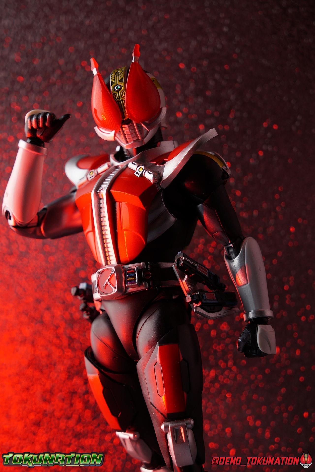 "Well now I'm angry. 'Kay?" Ryotaro Nogami has terrible luck. He's clumsy, easily taken advantage, frightful, and one of the best people you could ever know. Kind & strong, though not particularly brave, Ryotaro carries in him all the qualities that can make a hero. Including a revolving door of monsters possessing his body! On his own Ryotaro may seem weak, but when he's partnered with the 'Taros he's unstoppable, as Kamen Rider Den-O! With the fiery peach oni Momotaros, Den-O Sword Form is born! But when possessed by the deadly dancing dragon Ryutaros, Den-O Gun Form arrives! Travelling the train of time, righting wrongs of the past, from start to finish this rider is always at a climax! Packaging Obviously, Seihou Den-O comes in that familiar Seihou style box, the collector friendly packaging this line has come to be known for. And it's a big departure from what the original Den-O line featured. It's much more subdued. In the original line of releases nearly all the figures feature boxes based on the Den-Liner pass. This go around it's regular Seihou aesthetics though the box is a bit wider to accommodate all the accessories and features a spectacular double portrait of both forms of this rider. Like Ankh, this is one of the few outliers in terms of packaging for Shinkocchou Seihou. The core figure and armor components are packaged in one tray side by side, while a secondary and much smaller tray is packed beneath them with all of the various extra hands needed for either form. Sword Form Let's get this review going a bit differently. This is really one core figure, with two sets of armor. So separating out a review into "Main Figure" & "Accessories" as I normally would doesn't really make a ton of sense. So I'll do the two forms of Den-O with their parts included here instead. Kicking things off is Sword Form. This is the default form the figure comes packaged in. And it should come as no surprise to anyone who knows me or is reading this review, that I am the number Den-O fan you know. And that this form is one of my favorite rider designs ever. A few years back I did a belated review of the original Den-O figuart, because at the time the rumor was that a Seihou was on the way. Now that the dream has been realized, it's safe to say this this figure blows the original away. As you can see in the comparison shots in the gallery below, the Seihou is taller, bulkier, more accurately colored, far more detailed, and all around better than the original. This figure is almost modular because of it's form change ability, something that really calls back even further in Kamen Rider history, to the Souchaku Henshin days for Den-O. To change forms with this mold you need only remove the thigh plates, the Set Touch at the core of the Den-O Belt, the upper body armor, and the head. The figure is rather naked when the parts are removed but in it's complete Sword Form state, it's really astonishing what Bandai have pulled off here. While many figures choose form over function, or vice versa, Seihou Den-O opts for both. Gone are the nearly chicken like legs of the original figuarts, instead replaced by some appropriately beefy ones. But as I said, it isn't just the visual aspect, but the functional one that's improved as well. As this suit design permits, we get some great rocker ankles with a toe bend as well. Unusually the legs also have a small bit of extra play in the shins below the knee joint. It's akin to the way the elbow works on Seihou OOO, though seemingly much less fragile. The knees are double jointed giving us a stellar backward bend for them too. While the thighs feature the same tried and true in-set swivel design Seihou's have made nearly standard and the hips are of the modern design as well. Not drop down joints, but rather built directly into the waist, and engineered in such a way as to be dynamic without physically impacting the waist armor or the often referred to "diaper" part. Speaking of, well, Den-O has quite the sculpted booty! Depending on how you move the legs you may knock the thigh pads off by mistake as I've done though, but otherwise they work quite well. This combination of articulation cuts provides Den-O with exponentially more range than his predecessor had and looks far better while utilizing it too. Around Den-O's waist is the signature Den-O Belt. This is a lovingly crafted recreation of the full scale piece right down to the buttons to select each of Den-O's forms to the right of the set touch panel. In fact this part is one which can be swapped to recreate the character's various other forms. On either hip is a holster for the four included Dengasher parts. Included in both it's deconstructed and fully formed appearances, you can use these parts to display your Den-O (in either form) however you'd like. The individual Dengasher parts slide into the holsters and lock pretty securely in place thanks to small square pegs on the back of each. The holsters can swing back and forth as necessary to work around posing the hips as well. We'll get into the fully formed Dengasher below. The upper body really is a bit of a work of art too. Under the chest we see the inner workings of the figure. Down to how the shoulder joints are set within the body and how they function freely. The chest armor, any compatible with this body, plugs on by tabbing over a semi-x shape joint in the center of the torso. The upper body has so much range in it despite how it may look from the outside. There's plenty of room to arch the back and spin the torso around as needed, though I find the bottom of the Sword Form chest armor gets a bit too close for comfort to the belt on occasion. Once again this armor looks magnificent. That gloss red looks just like the show suit, and I could get lost in how well defined the track detailing up the center of the torso is. The shoulder pads are actually built into the chest armor as well and can angle up and down on a very small ball joint. This is an