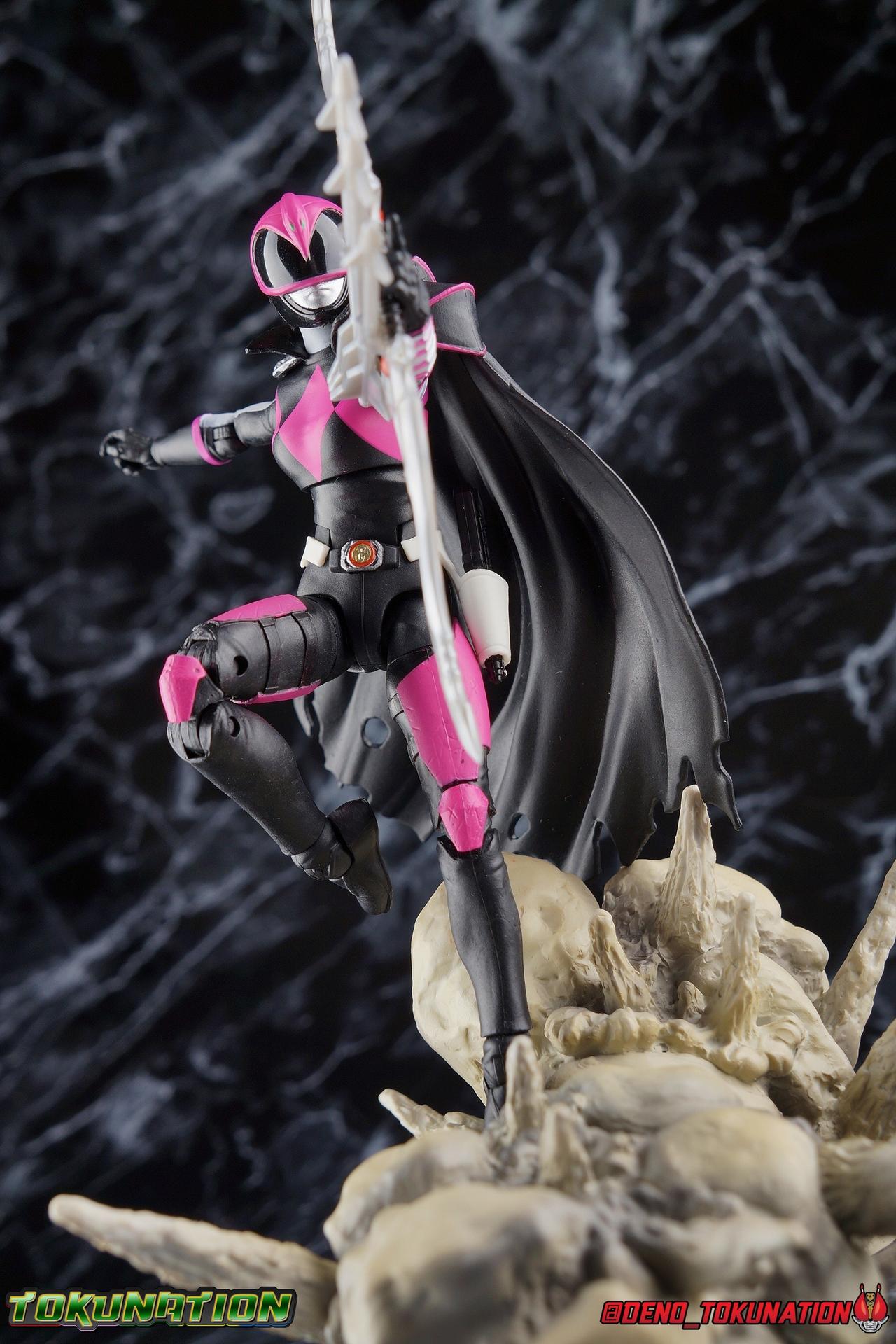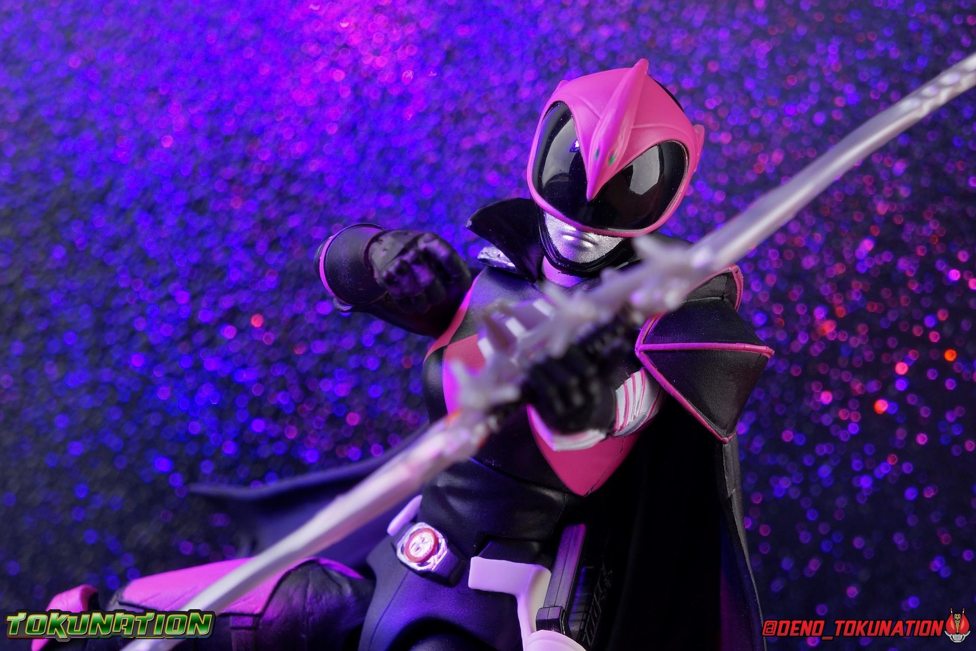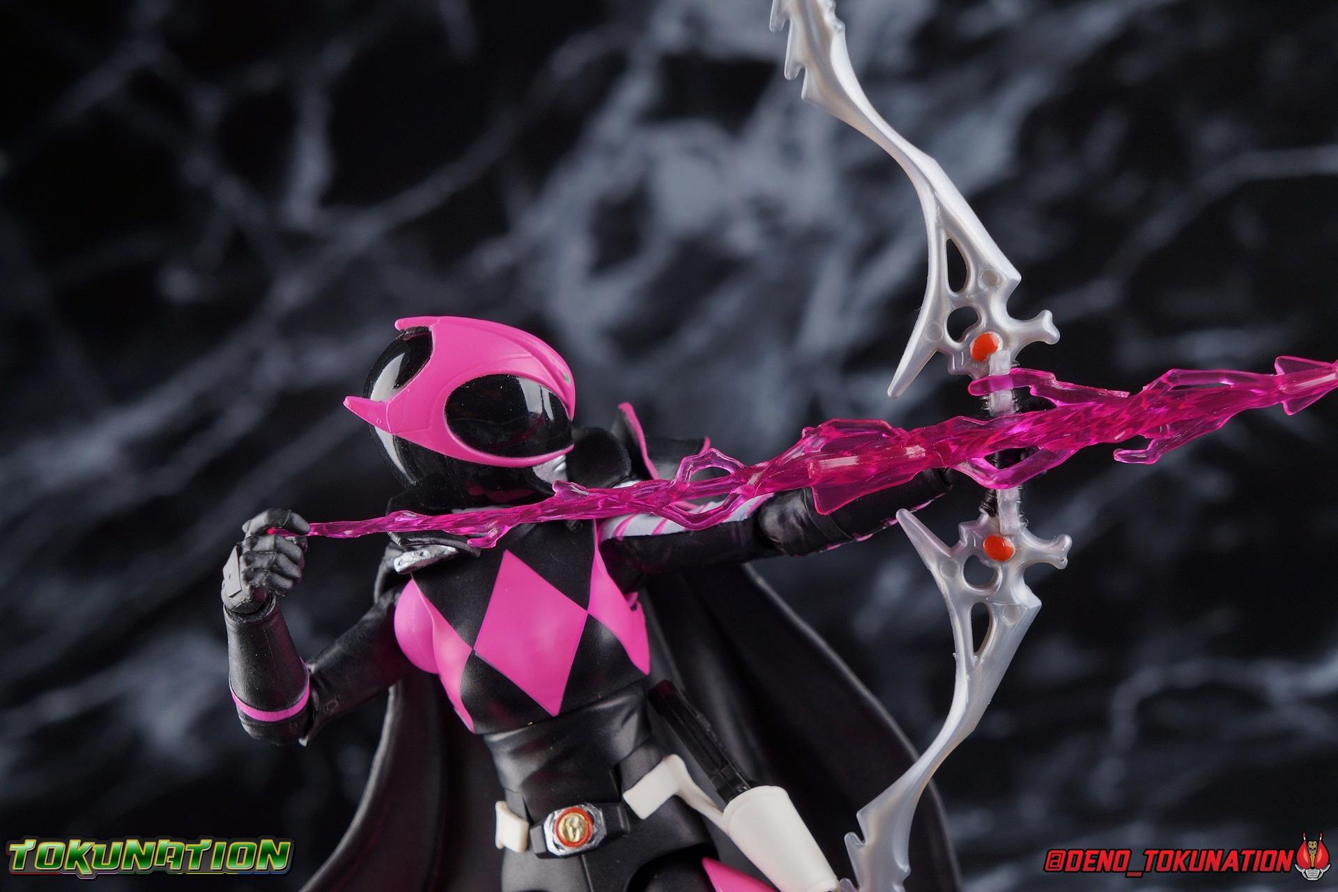 When the Mighty Morphin Power Rangers freed Tommy Oliver from Rita Repulsa's control, the prophecy was fulfilled and the Green Ranger, joined the side of good to defend the Earth. At least, in one world. Once free in another, Tommy became something else entirely, Lord Drakkon. He ruled over a shattered world where only the Coinless stood up to him. Kimberly Hart may not have been a Power Ranger anymore, but given the choice she would fight for her world, til the end. But bewitched by Lord Drakkon, cursed with the Bow of Darkness, Kimberly became a tool for this would be king. She became his Ranger Slayer. Kimberly's path has been dark and full of loss, but once a ranger, always a ranger. Coinless, beyond the grid, returning home. She has done terrible things she will always regret, but the power still protects. No longer bound by Drakkon's magic, can Kimberly bring peace to her world? Or will threats to come have other plans? Packaging As we are all pretty familiar with the line by now, I'm sure I probably don't need to go through my usual list of reasons why it's awesome. Hasbro was keen to make sure these appealed to collectors and fans of the franchise from throughout it's various eras. And they also really pop thanks in no small part to some wonderful box art, lovingly crafted by artist Tom Whalen aka @strongstufftom on twitter. His artwork is breathtaking, and makes these figure's feel like just a bit more of a passion project from the folks at Hasbro. Main Figure At a glance one would assume the Ranger Slayer is a reuse of the MMPR Pink Ranger mold, but on closer inspection and comparison of the two, this appears to be an entirely new sculpt outside either the Pink or Yellow Rangers. The classic boots are gone, replaced by solid legs that do not swivel below the knee. Instead we get feet and lower legs that feel more uniform and have some subtle sculpted leather/fabric folds, and there are raised armor parts coming into play on the knee and thigh pads. Ranger Slayer also features some really awesome suit weathering that I've yet to see on other figures in the line so far. Being that she comes from a pretty dismal future, one where she has fought hard and continues to fight again now in her new series, the weathering is very appropriate, much appreciated, and maybe easy to miss. While QC discrepancies happen from time to time, there's no question that this detail is intentional, though depending on how your Ranger Slayer is painted it may not look like that. On Kim's knee & thigh pads we have some sculpted in scuff marks and battle scars that evoke a pretty good representation of how her suit looks in a number of appearances in the Boom! comics. This figure also features a far more natural waist assembly than the Pink Ranger, largely thanks to there being no skirt involved in this design. Now this lower waist and mid torso section may be the same as the Yellow Ranger, they do look physically similar but I can't say that for certain. What I can say is that because this is a normal waist, we get normal dynamic hip movement out of the figure, which combined with the double jointed knees and swivel/hinge ankles gives us a great starting point for most posing. But around the waist of the figure are some more newly sculpted parts in the form of Ranger Slayer's Power Morpher. The core morpher itself appears to be mostly the same as the other Mighty Morphin Rangers, though the details are a bit hard to decipher at this scale. The Morpher is set in place on a black buckle across her waist, while an angular white belt wraps around her back and sides, evoking a far more sinister look than the traditional Power Morphers. One bit of parts reuse we do see is the Blade Blaster holster on the left hip, which can accommodate Ranger Slayer's own Dark Blade Blaster. Though officially I don't believe it has a unique name. While the waist probably shares tooling with the Yellow Ranger, the upper body of this figure is very much a new part. There are only 3 feminine body figures in the Lightning Collection so far, this being the third (with Rita yet to release), and Ranger Slayer evokes an older Kimberly with a stockier build over all. Ultimately the range of articulation the upper body has is just as good if not better than the yellow ranger, and far exceeds what the limited Pink Ranger design could achieve. Being able to arch her fully forward & back and rotate the upper body gives you plenty of options. The arms are unfortunately executed in the same way as the others. The shoulders are the same butterfly style joint we've seen pretty much across the line. To accommodate the new upper body design the joints range and open areas are a bit different taking up a just slightly less real estate on the torso than Yellow Ranger. The actual shoulders are also a bit different than typical. They sit just a bit out further from the body but ratchet up and out in the same manner. The elbows are of the same variety as Pink/Yellow Ranger as well. Rather than the normal double joint hinge we've seen with the boys, Ranger Slayer continues the odd trend of having a fully rotating elbow on a peg. It's pegged into bicep with a single hinge joint to move it up. This means the elbow isn't double jointed or nearly as dynamic in a forward/back sense, but that it can rotate fully giving it some weird extra range. This is largely to make up for the lack of a bicep swivel. The wrists operate as usual, though you will undoubtedly notice the difference in the forearm sculpts. No MMPR gloves gives them a much smoother and proportional appearance, while the left arms has some spectacular sculpted and painted chevrons going all the way down it. This design is very reminiscent of the Pink Ranger as she appeared in Boom's Power Rangers Pink mini-series. The Ranger Slayer does get one other new part that's uniquely her own, and that's her sweet sweet tattered cape. I'm a sucker for ratty looking capes on badass characters and this ver