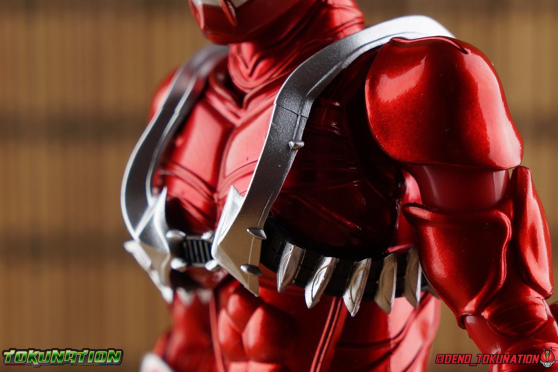 It is the Summer of Training. And while mentoring Todoroki's inconsistent practice of the Taiko drum, and even bestowing the Ongekibou to both Todoroki & Ibuki, Kamen Rider Hibiki furiously trains himself. Faster, stronger, hotter. Burning brighter than he ever has before, Hibiki must master the rhythm of his core once again and draw out the full potential of his Ongekibou. Without this strength, the deadly Dorotabou will continue to multiply, wreaking havoc on the local villages. With a fire of strength raging in his heart, Hibiki explodes into a new form, Kamen Rider Hibiki Kurenai! Packaging Hibiki Kurenai comes in that familiar and collector friendly packaging this line has come to be known for. No massive changes here even from the first Seihou Hibiki release from 6 years ago, the only differenes here being the stock imagery and the front facing portrait. It's a stylish box type even if it feels a little bit more stale each time. I do appreciate when they change things up more with releases like Ankh, Den-O, & Kiba. Main Figure Obviously, Shinkocchou Seihou Hibiki was one of the first figures of the entire Seihou line, predated only by Kabuto. So it's great to see that just over 6 years later, that this fantastic mold has returned to the line with this explosive form. The 3 previous releases in the Hibiki line, Ibuki Todoroki & Zanki, were all magnificent and brought something new and unique to this body type. At their core each shares the basic body structure that Hibiki pioneered. With Hibiki Kurenai though, we finally circle back around the to original tooling of the mold. It's hard to say anything new about the mold itself. As I've gone into on 4 occasions now reviewing Hibiki releases, this is a stellar figure. Each iteration of the mold looks like a suit that's just walked off screen. Of the entire Seihou line, I think the Oni Riders by far look the most gorgeous and lifelike. I'll get into the usual in's and out's of the articulation scheme soon, but first I want to focus on the stunning paint apps on this beauty. The entire figure is decked out in a gorgeous metallic red in the same fashion as that metallic purple of the original release. The paint apps to the core body are largely the only change we see as well, though there are some additional red paint apps on the upper forearms giving them a uniform red look, and some new apps on the head giving Hibiki a much needed visor and mouth plate that really bring the design together. As always Tamashii's attention to detail is jaw dropping. Below we'll get into the articulation this mold has always boasted, but it won't be terribly different from my previous breakdowns of the Hibiki Riders. Feel free to skip down if you wish. The sculpt of this body type really brings to life these unique Oni Rider suits. In every way imaginable it captures the look of the on screen suit right down to the textured musculature, and the gloss of the armor really gives in that pleather/vinyl feel of an actual suit. The design process Seihou's go through has always been much much more involved than that of the standard figuarts line and the best examples of this were the special booklets included with Kabuto & the original Hibiki. When the design begins with a sort of skeletal inner frame, and builds out what would be like a suit over a real human body like this, you get a much more realistic application of articulation and proportion to the body as a result. Now despite the obvious color shift to red, Hibiki Kurenai is physically identical to the original release. When Bandai nails the basic design of the body, it can be truly astounding how outer level cosmetic changes can create a vastly different experience though. Even so, some of my minor gripes still exist. I've always found the legs to be odd. To me, they look really long and at odds with the torso, especially when bent for crouching poses. Something about them looks off. They function well enough, though I've always thought this mold had one of the more strange figuarts hip joints out there. While the part separation undoubtedly gives them great range, the hips look very small by the time you angle them out fully, making the thigh seem huge by comparison. And while the knees function just fine, the feet could have slightly more range. The only unchanged part of the legs color wise, is the silver bands which adorn Kurenai's ankles. Hibiki Kurenai's belt is really loaded up with accessories like his predecessors as well. This figure comes with a lot and luckily you can store some of it on his belt given the display options you've chosen. When loaded out for static poses, the left hip can be outfitted with a Disc Animal holster with 3 non-removable discs sculpted in. Or you can keep the out of box standard part attached which is an empty holster for when you want him to hold the discs in hand. At the center of the belt is the same Ongekiko Kaentsuzumi the original Hibiki had. This circular piece is removable to simulate how how Hibiki uses it like a taiko drum for Ongeki Da finishers. It can be used with any Oni Rider that has a similarly designed belt. The right hip features Hibiki's signature transformation tuning fork, the Henshin Onsa Onkaku in it's collapsed form, though a standard open one is included for use with the figure as well. The back side of the belt can either feature an empty Ongekibou holster or a part is included showing them stored away. If you're paying attention you'll see that in a few photos below I forgot to remove them until well after this shoot was over. Once again the upper body is identical to classic Hibiki. The torso is a beautiful glossy read offset by that magnificently sculpted chest harness that goes around the back as well. The upper and lower halves of the torso move independent of one another, though it's a tight fit to get either to move very far. I've always felt this body type was a bit stiff, but it gets the job done very nicely still. Kurenai's arms 
