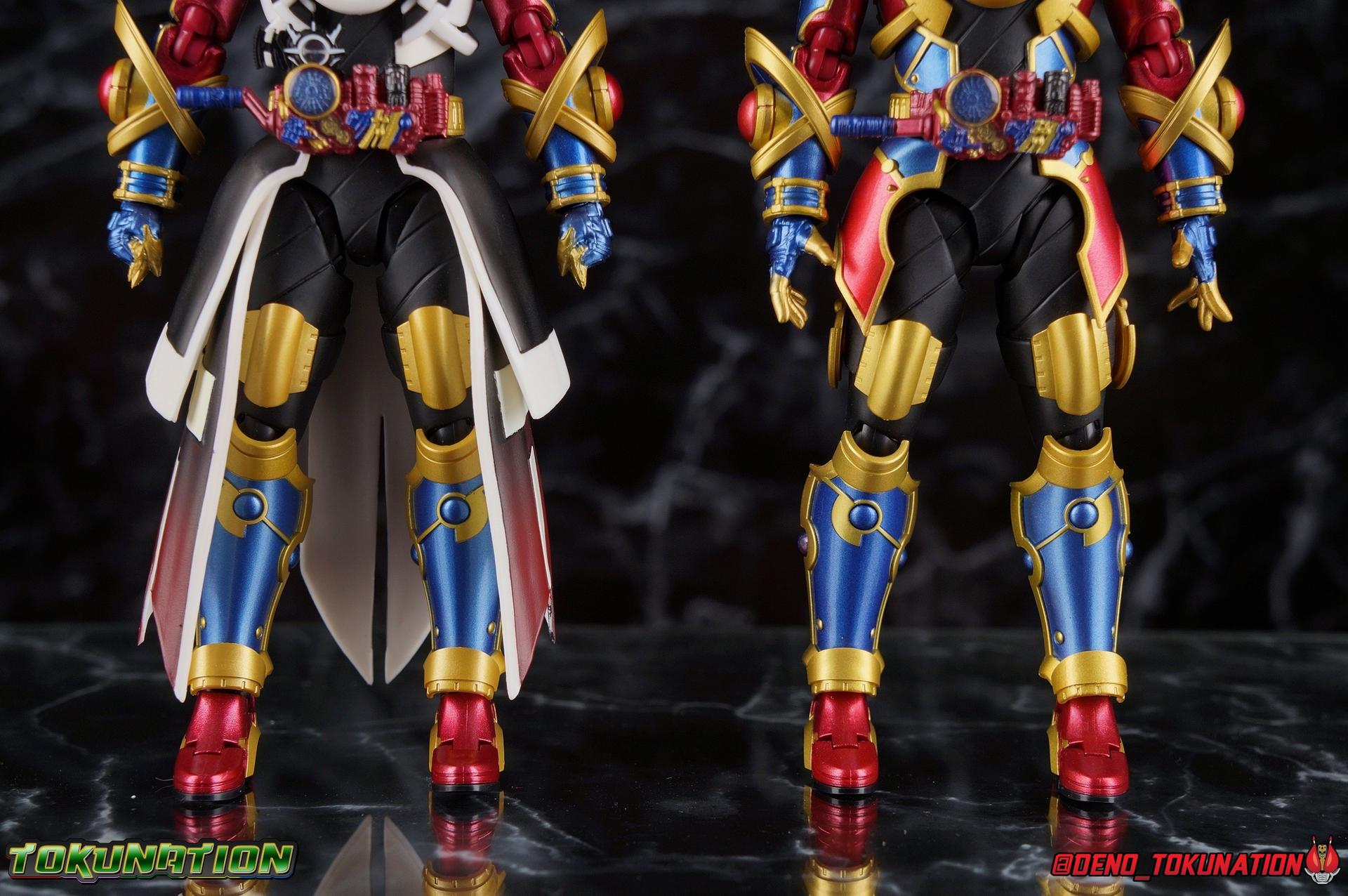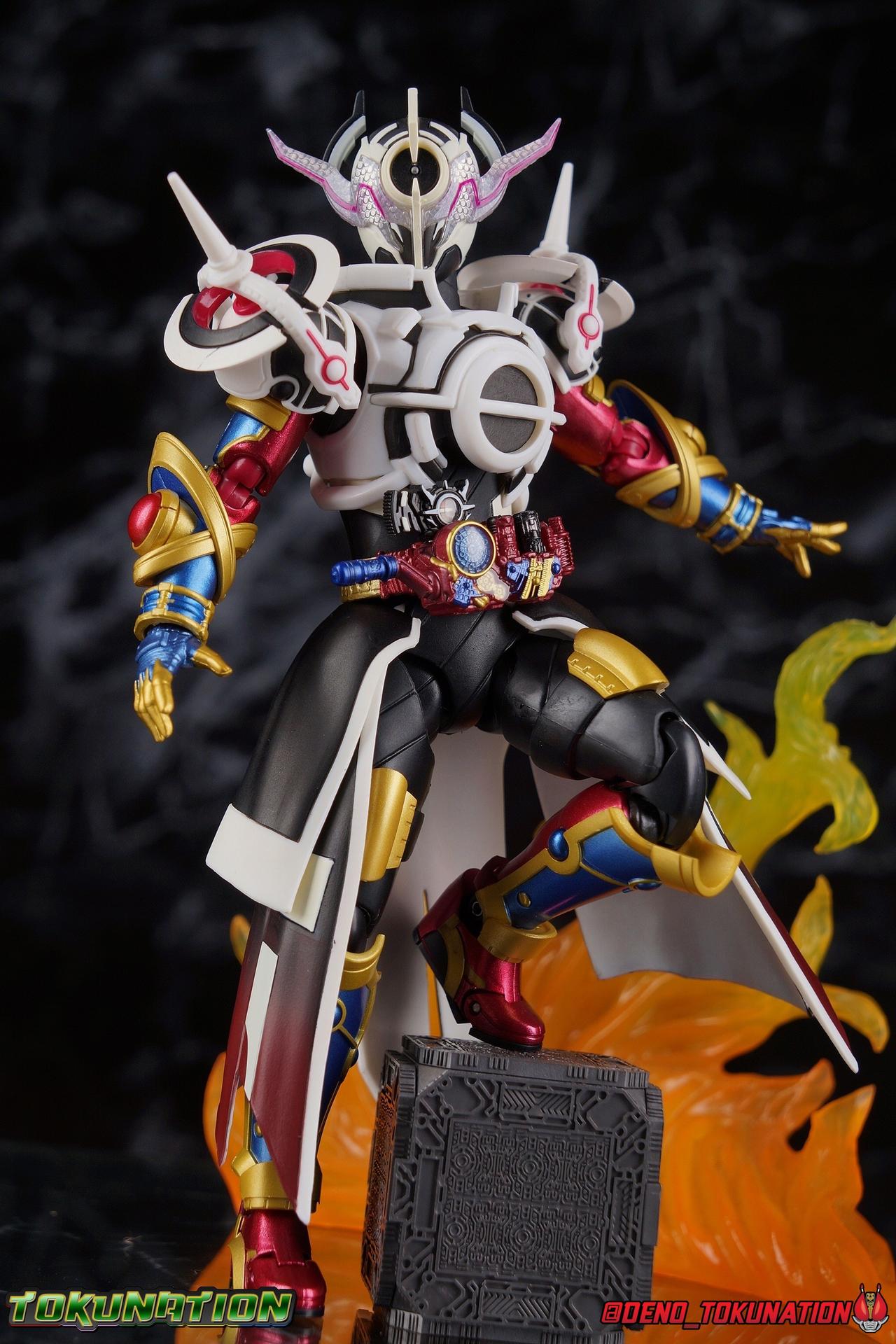 Manipulating the world around him since he arrived on Earth, the alien Evolt has continued to evolve. Shedding the skin of Blood Stalk thanks to the Evol Driver at Phase 1. Absorbing the rage of a dragon with Ryuga at Phase 2. And absorbing the rabbit genius with Sento at Phase 3. But with the powers of the Evol Trigger finally restored, an even greater evolution is revealed as Evolt enters Phase 4. The awesome power of Kamen Rider Evol Black Hole is reborn! Consuming everything in his path, this is the power that destroyed Mars, and will destroy the Earth if Kamen Rider Build and his allies fail. Are you ready? Packaging Nothing terribly new to report here after over 20 Kamen Rider Build figuarts releases. This box is very similar in general design to the Evol Phase 1 2 3 set packaging. The only difference being here that there isn't an extra layer of accessories in the bottom of the tray. So the overall box isn't as thick. The color scheme of this box is a bit more subdued than the prior release as well, but really that's not the part of the review you're here for. Main Figure A portion of the review for Evol Black Hole will be the same as my review for the Evol Phase 1 2 3 Set Largely because the majority of the body is unchanged for this release of the mold. The basic engineering and structures are the same, though some new armor is included this go around. Kamen Rider Evol's base form, Cobra, is an incredibly stylish suit design. While I like Dragon & Rabbit as well, Phase 1 is still the best of the 3, and thankfully that's the basis for Black Hole or Phase 4. Like the other 3 forms, Black Hole feels as alien as possible. The Riders feel like the earthly derivatives of Evol that they are, and while Black Hole changes some of what I liked about Phase 1, it really helps set it even further apart from the earthly riders while drawing a couple just a bit closer as well, like Mad Rogue & the Hell Bros. Phase 1 was littered with gold and orbs and circular lines and even had a star map emblazoned on it's forehead. It reminded me very much of theoretical Da Vinci machines as well as telescopes astrolabes sextants and more. Black Hold trades in much of those vibrant colors for the appropriately vacant and cold white and black color scheme of most of the body. Though the design definitely looks foreign because of all the armor bits, at the core Black Hole uses the Build/Cross-Z leg design. This is mostly evident in the thighs but really the general shape of the leg is there, just contoured by new gold armor. Surprisingly the armor on the legs doesn't really affect how they function though. The ankles are about as good as they've always been, not outstanding by any measure, but decent enough to get good poses out of. Despite the overhang of armor on the bottom of the shin, and added bulk around the knee joint, both remain largely unrestricted as well. We run into issues when we get to the hanging skirt armor though. Evol had some great thigh armor on the front and sides. Black Hole extends this even further, giving the form a sort of 2 layered coattails. Unfortunately, having not learned from their mistakes making capes and such out of hard plastic, these parts are thin rigid, somewhat flexible, plastic on a rather limited hinge. So you'll have to fiddle with it somewhat to get the legs in and around that. So just be careful not to break anything. This plastic can flex, but I do not at all recommend doing it for extending periods or you risk warping and stress fracturing it. Which would be a shame on a figure this extensive. Aside from the skirt armor, the legs themselves are 100% unchanged from their use in the previous Evol set. On his waist, Evol Black Hole features his eponymous Evol Driver. This is now the 3rd time we've seen this exact same Driver in the line too. We got it with Mad Rogue as well as the last Evol. The shade of red appears identical to Evol, though Mad Rogue's is still curiously slightly different. The Evol Driver also includes the same Evol Bottles this go around with the Cobra & Rider System Bottles. Once again this driver is functional, bottles can be swapped out as desired, and the handle can be cranked. Finally the one big change for the Driver is the inclusion of the Evol Trigger, the original basis for the Hazard Trigger. Once again I love seeing these parts of Evol's technology and piecing together how the earth made equipment was derived from it. The Evol Trigger looks very alien indeed. I wish it was removeable, perhaps it is even. But the paint's rather thick on mine and it just won't budge. at this point I'd rather not break it attempting to remove it. The lower torso also features that same black striated form we've come to know from the Build Rabbit/Tank torso. Only this time it's encased in the alien armor of Evol. Despite what you may assume, or in fact what I assumed about the chest armor, that chunk of the body is entirely new. It's not just a remold of the previous one. As you can see in my comparison photos below, not only is it larger and bulkier making Black Hole seem even more imposing, it actually makes him slightly taller as well, just slightly taller than Evol Phase 1. The spherical structures of this chest are more refined and symmetrical now, which is a bit of a shame considering how much I loved the last form, but it looks unquestionably nice as well. The general contour of the armor is the same as the old one but like I said it's much bulkier. The articulation of the torso may leave a bit to be desired because of all this bulk, but it could be much worse as well. There's a surprising amount room to play with. Black Hole's arms feature new parts only in the shoulder pads. While the basic mold is the same, some of the surface details have been changed to match the new aesthetic and they're now white to match the torso color. Oddly enough, these pads didn't affect articulation much on the first Evol, but because of the new torso armor bulk they 