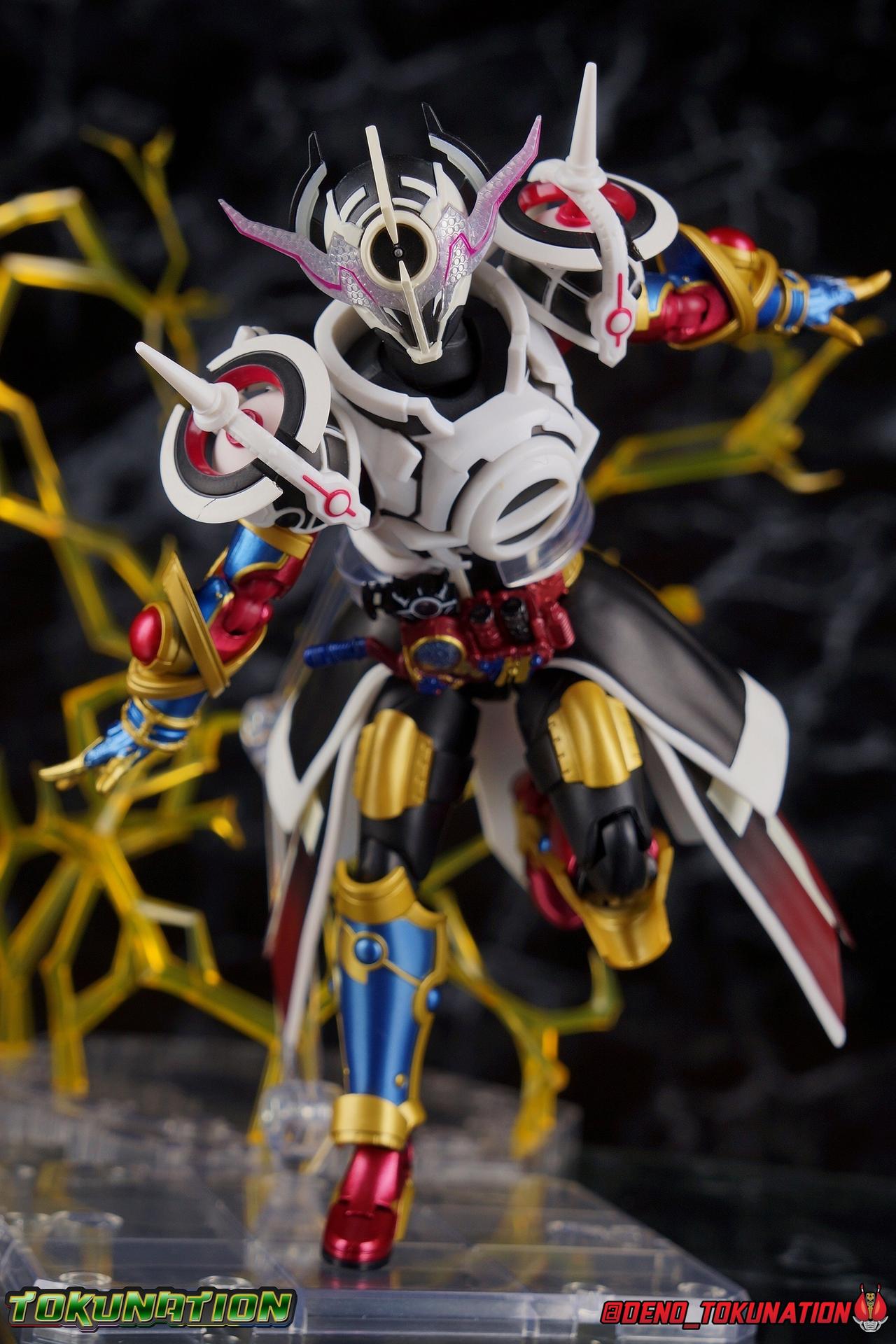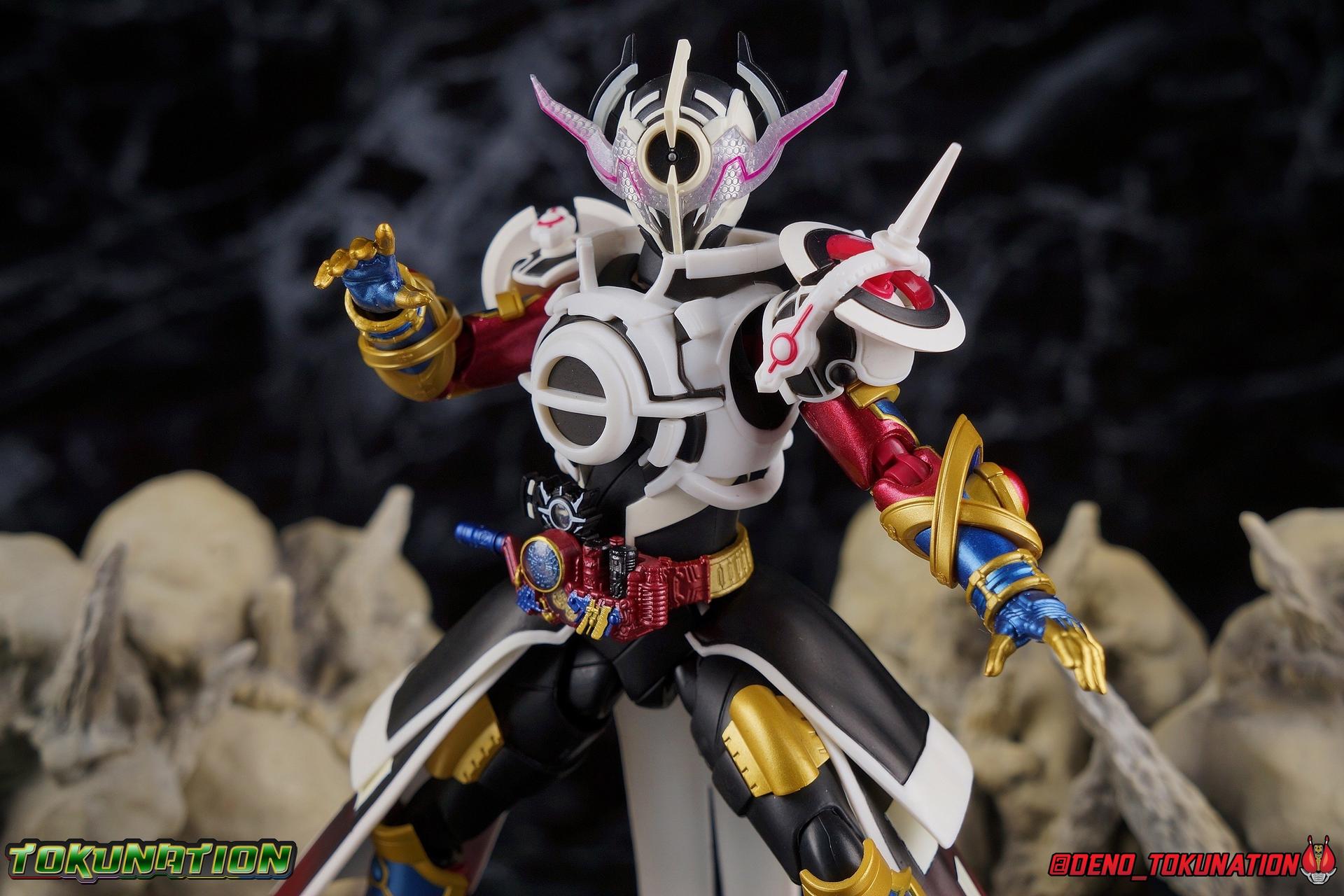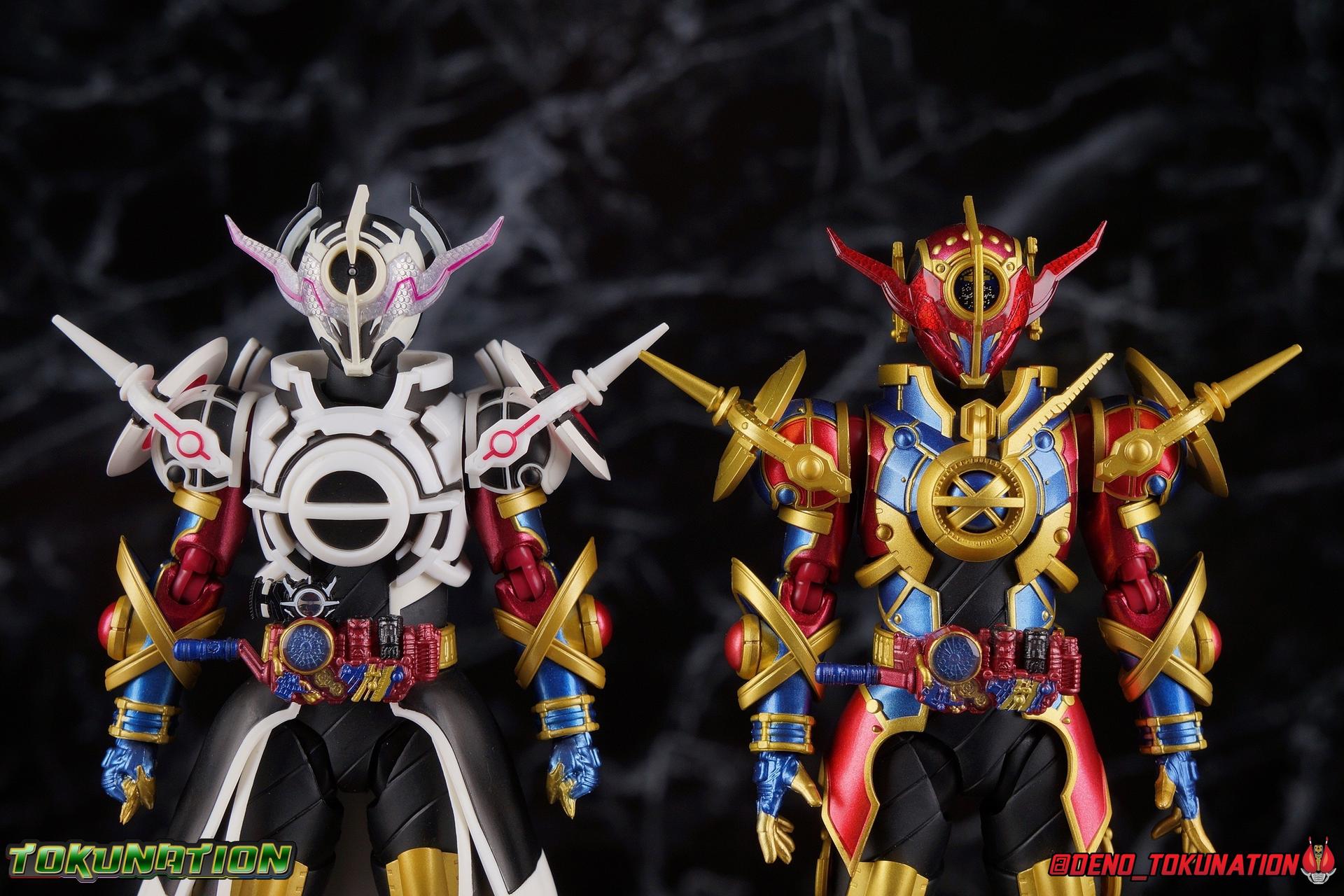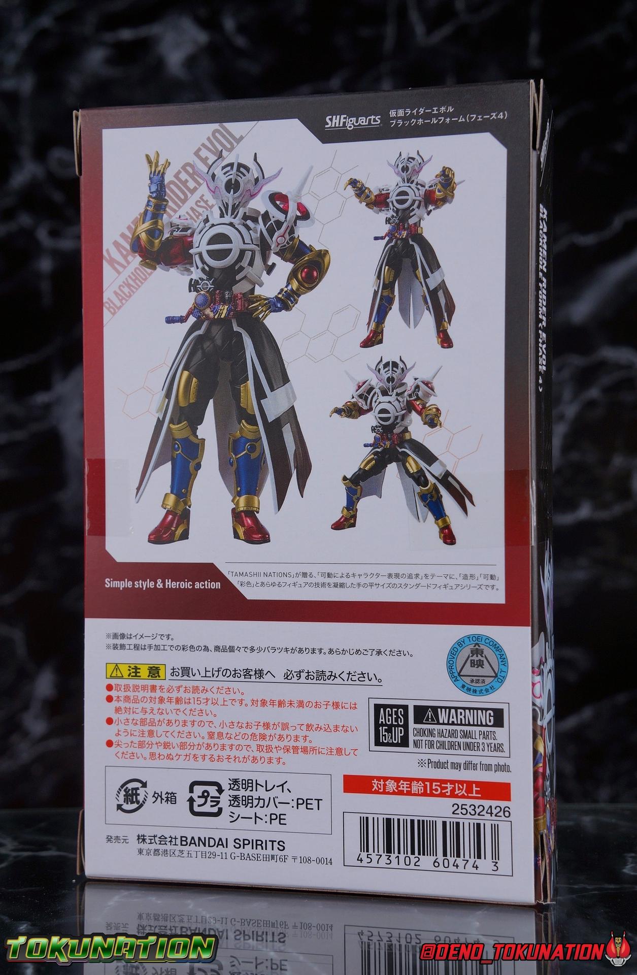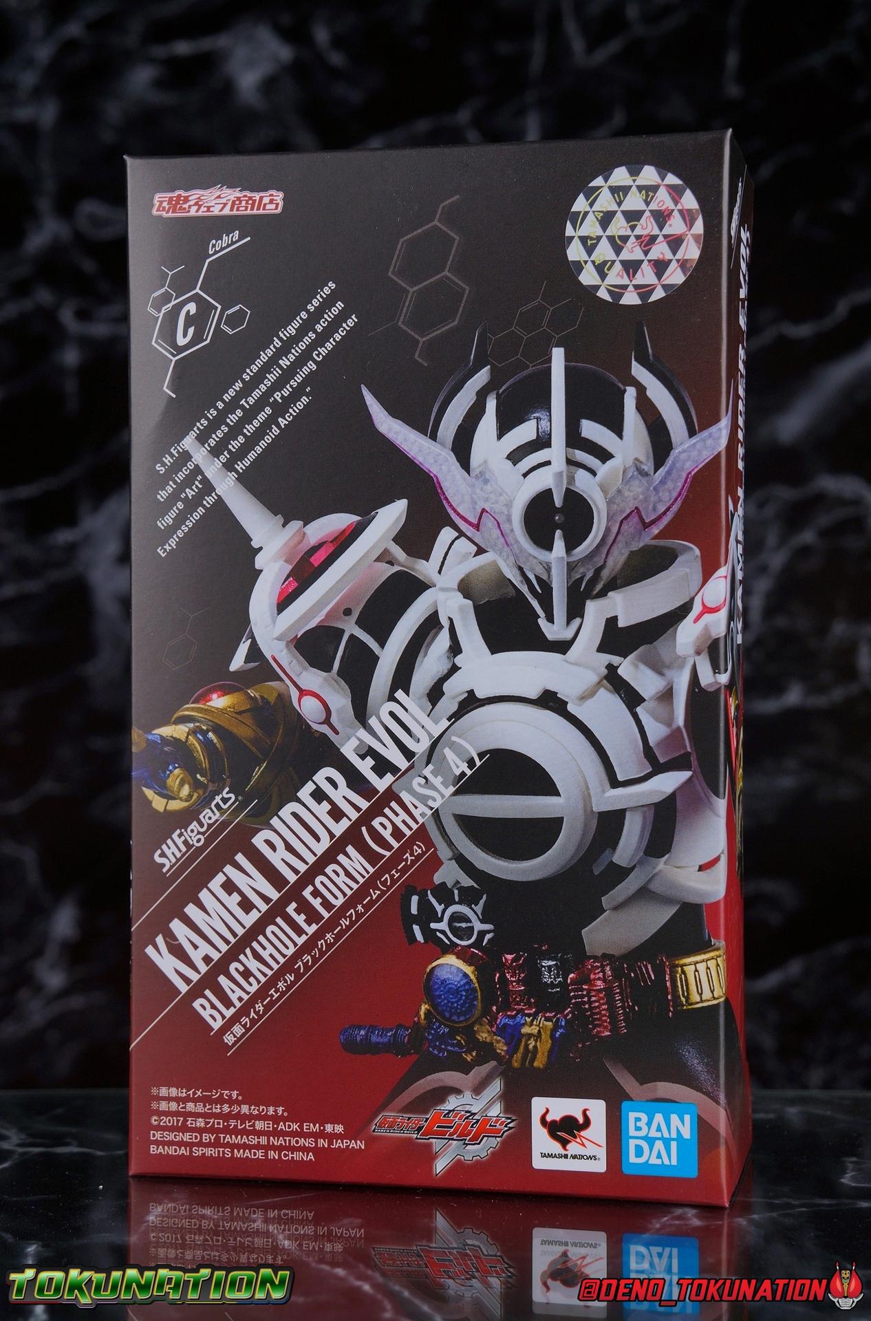 Manipulating the world around him since he arrived on Earth, the alien Evolt has continued to evolve. Shedding the skin of Blood Stalk thanks to the Evol Driver at Phase 1. Absorbing the rage of a dragon with Ryuga at Phase 2. And absorbing the rabbit genius with Sento at Phase 3. But with the powers of the Evol Trigger finally restored, an even greater evolution is revealed as Evolt enters Phase 4. The awesome power of Kamen Rider Evol Black Hole is reborn! Consuming everything in his path, this is the power that destroyed Mars, and will destroy the Earth if Kamen Rider Build and his allies fail. Are you ready? Packaging Nothing terribly new to report here after over 20 Kamen Rider Build figuarts releases. This box is very similar in general design to the Evol Phase 1 2 3 set packaging. The only difference being here that there isn't an extra layer of accessories in the bottom of the tray. So the overall box isn't as thick. The color scheme of this box is a bit more subdued than the prior release as well, but really that's not the part of the review you're here for. Main Figure A portion of the review for Evol Black Hole will be the same as my review for the Evol Phase 1 2 3 Set Largely because the majority of the body is unchanged for this release of the mold. The basic engineering and structures are the same, though some new armor is included this go around. Kamen Rider Evol's base form, Cobra, is an incredibly stylish suit design. While I like Dragon & Rabbit as well, Phase 1 is still the best of the 3, and thankfully that's the basis for Black Hole or Phase 4. Like the other 3 forms, Black Hole feels as alien as possible. The Riders feel like the earthly derivatives of Evol that they are, and while Black Hole changes some of what I liked about Phase 1, it really helps set it even further apart from the earthly riders while drawing a couple just a bit closer as well, like Mad Rogue & the Hell Bros. Phase 1 was littered with gold and orbs and circular lines and even had a star map emblazoned on it's forehead. It reminded me very much of theoretical Da Vinci machines as well as telescopes astrolabes sextants and more. Black Hold trades in much of those vibrant colors for the appropriately vacant and cold white and black color scheme of most of the body. Though the design definitely looks foreign because of all the armor bits, at the core Black Hole uses the Build/Cross-Z leg design. This is mostly evident in the thighs but really the general shape of the leg is there, just contoured by new gold armor. Surprisingly the armor on the legs doesn't really affect how they function though. The ankles are about as good as they've always been, not outstanding by any measure, but decent enough to get good poses out of. Despite the overhang of armor on the bottom of the shin, and added bulk around the knee joint, both remain largely unrestricted as well. We run into issues when we get to the hanging skirt armor though. Evol had some great thigh armor on the front and sides. Black Hole extends this even further, giving the form a sort of 2 layered coattails. Unfortunately, having not learned from their mistakes making capes and such out of hard plastic, these parts are thin rigid, somewhat flexible, plastic on a rather limited hinge. So you'll have to fiddle with it somewhat to get the legs in and around that. So just be careful not to break anything. This plastic can flex, but I do not at all recommend doing it for extending periods or you risk warping and stress fracturing it. Which would be a shame on a figure this extensive. Aside from the skirt armor, the legs themselves are 100% unchanged from their use in the previous Evol set. On his waist, Evol Black Hole features his eponymous Evol Driver. This is now the 3rd time we've seen this exact same Driver in the line too. We got it with Mad Rogue as well as the last Evol. The shade of red appears identical to Evol, though Mad Rogue's is still curiously slightly different. The Evol Driver also includes the same Evol Bottles this go around with the Cobra & Rider System Bottles. Once again this driver is functional, bottles can be swapped out as desired, and the handle can be cranked. Finally the one big change for the Driver is the inclusion of the Evol Trigger, the original basis for the Hazard Trigger. Once again I love seeing these parts of Evol's technology and piecing together how the earth made equipment was derived from it. The Evol Trigger looks very alien indeed. I wish it was removeable, perhaps it is even. But the paint's rather thick on mine and it just won't budge. at this point I'd rather not break it attempting to remove it. The lower torso also features that same black striated form we've come to know from the Build Rabbit/Tank torso. Only this time it's encased in the alien armor of Evol. Despite what you may assume, or in fact what I assumed about the chest armor, that chunk of the body is entirely new. It's not just a remold of the previous one. As you can see in my comparison photos below, not only is it larger and bulkier making Black Hole seem even more imposing, it actually makes him slightly taller as well, just slightly taller than Evol Phase 1. The spherical structures of this chest are more refined and symmetrical now, which is a bit of a shame considering how much I loved the last form, but it looks unquestionably nice as well. The general contour of the armor is the same as the old one but like I said it's much bulkier. The articulation of the torso may leave a bit to be desired because of all this bulk, but it could be much worse as well. There's a surprising amount room to play with. Black Hole's arms feature new parts only in the shoulder pads. While the basic mold is the same, some of the surface details have been changed to match the new aesthetic and they're now white to match the torso color. Oddly enough, these pads didn't affect articulation much on the first Evol, but because of the new torso armor bulk they 