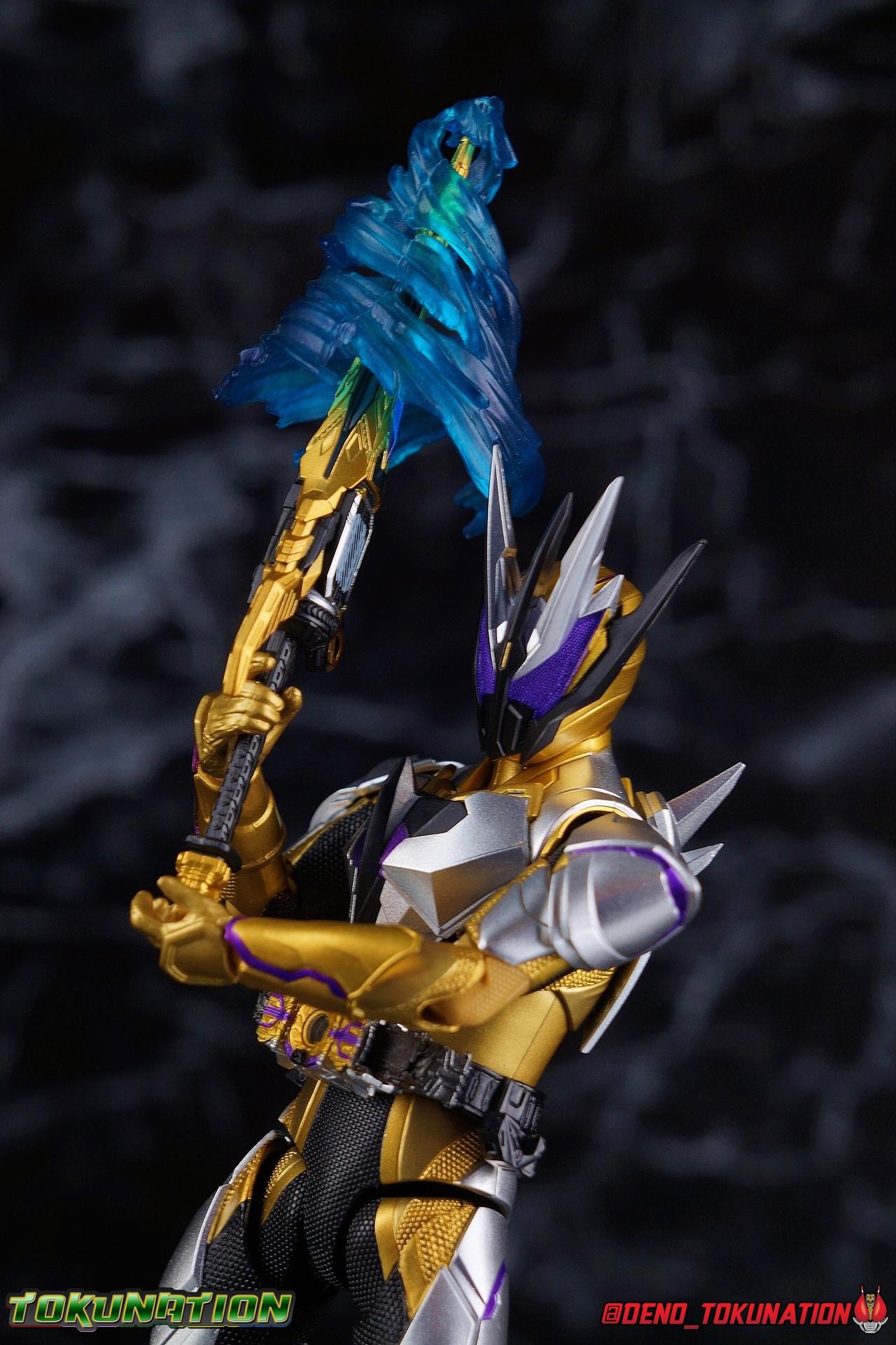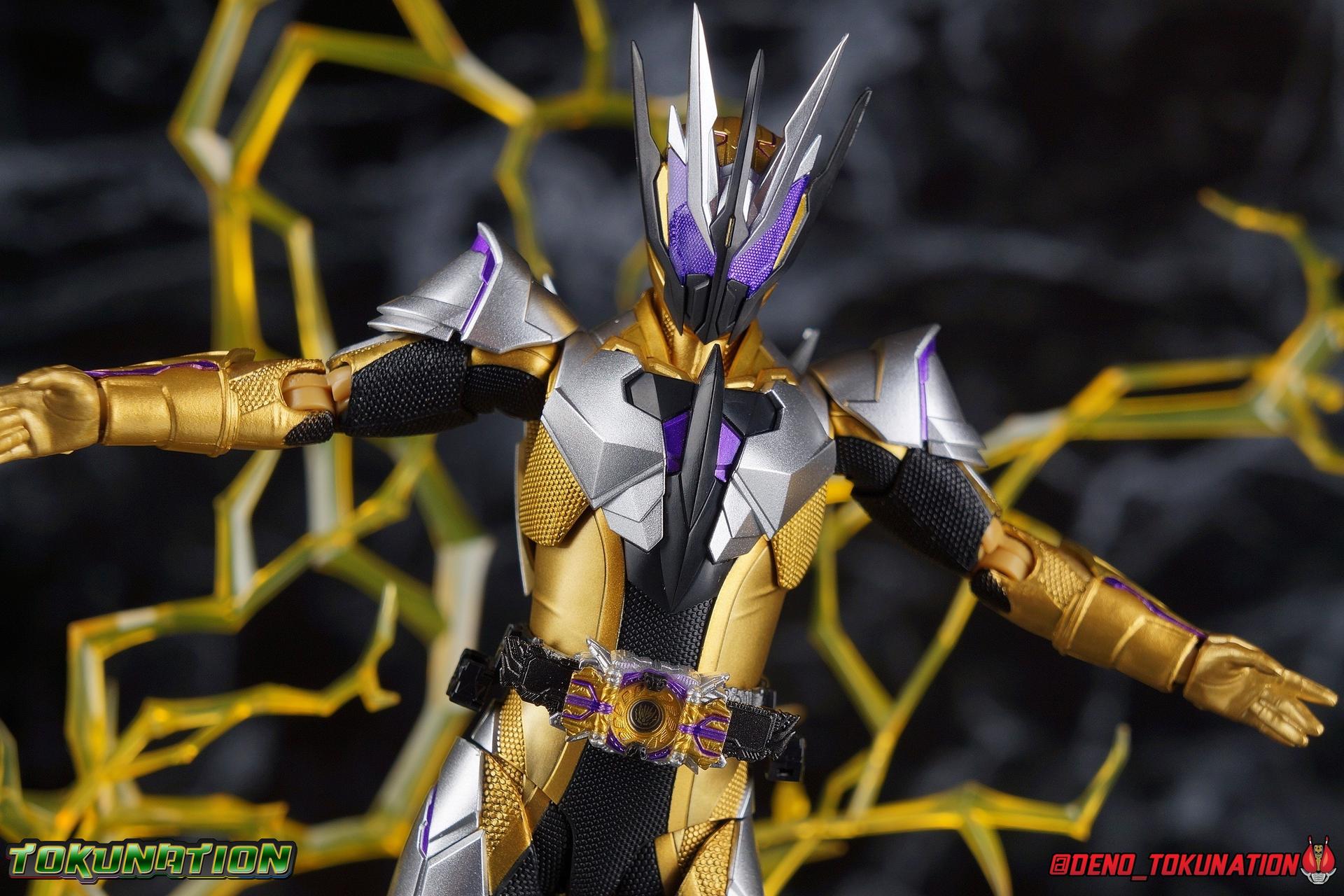 The cruelty of humanity. That is what Gai Amatsu instilled in Satellite Ark. In doing so he instigated not only the Daybreak Town Incident, but also the creation of Metsuboujinrai.net, and all the pain to come for both humans & humagears. For 12 years Gai has manipulated events from the comfortable shadows of ZAIA Enterprise. Now the mysterious man behind A.I.M.S. has his sights set on Hiden Intelligence as well, but can Zero-One keep his grandfather's company safe? Gai Amatsu is a master manipulator, and maybe one day, he could even be a hero. But for now? With strength that's 1000% greater than Zero-One's, the golden solider Kamen Rider Thouser is born! Packaging Keeping in line with the sort of packaging the Zero-One line has had, Thouser arrives in a mostly white box, but with appropriately ostentatious gold details and lettering. There are no fun black light gimmicks or anything like that with Thouser's box. Just some really standard stock photos and a nice portrait of the figure across the front. Nothing special to report this go around. Figure time! Main Figure Unfortunately I've yet to be able to handle all the riders from Zero-One so far. Having missed Horobi, Jin, & Valkyrie, I feel like I need to preface this review. Because I don't feel like I have a complete picture of the Zero-One Figuarts line yet without them. So if my impressions of Thouser are way off base, I apologize. That being said, while he's certainly the most ornately detailed of the Zero-One riders, he has a number of flaws as well that need to be addressed as this line continues. Zero-One really set the standard for this line. An absolutely rock solid release to kick off a new line up of rider figuarts, which doesn't always happen. And while I thought he was fantastic, I did feel Vulcan was a less than perfect follow up. With Thouser much of what we see is new, but there's a lot of familiarity as well. The basic form of the Zero-One mold is there, but Thouser still manages to be very different. In the legs we can see the exact same textured black detailing between the two, but the armor that covers it is entirely different. So these two do share at least some parts. However what they don't share is the same range of articulation. Thouser has very restricted ankles, largely due to the design of the ankle cuff, where it drops down around the back of the foot. This nixes almost all of the outward movement of the foot, so good luck with wide stances. The knee bends are fortunately spared, having been directly carried over from Zero-One, no new armor to get in the way. The hip and thigh are largely identical, with only surface details having been changed for Thouser. However the thigh armor does extend further up toward the waist on him as well. And because the drop down hips on this mold already don't go down very far, rotating the hips up to pose the figure is a dangerous preposition. Be very very careful to angle them correctly or you will damage the silver paint on the thighs. Bot overall I really like the way the legs look, the design is great and paint work magnificent. Around his waist, Thouser has the appropriately named Thousandriver. And much like the Zero-One Driver in this line, I feel like we've been a little cheated. The Zero-One Driver is essentially non-functional because it can't revert to it's closed pre-henshin state, and the Thousandriver is exactly the same. The two halves that cover the window of the driver are permanently molded open. So even if you remove the keys you can't really recreate the closed driver. As for the keys we get the Amazing Caucasus Progrisekey & Awaking Arsino Zetsumerisekey. Only the Caucasus key has any detail and that's just the emblem on the end of the key that winds up being in the driver window. Outside of this both keys are just black plastic. The Driver looks fantastic, but it feels half realized, much like the Forceriser. The belt also has Key holsters on each hip, but considering so far there are no closed Progrise or Zetsumerise Keys in this line that I'm aware of, these holsters are entirely pointless. The ab section of the torso is very very similar to Zero-One, it's possibly the same part, though there are some details sculpted into the surface like fabric folds on Thouser. The upper body is the big difference with Thouser having completely newly sculpted armor and some really bright regal colors. But Thouser's armor is also quite thick? The chest armor sticks out a fair bit further than Zero-One, nearly as far out as the Thousandriver. Luckily the torso's articulation is nearly the same as Zero-One. We get a full rotating waist joint, and a ball jointed upper body that can lean about 45 degrees to either side, with a fair bit of room to arch the back. Thouser also features quite similar arms to Zero-One. They're essentially the same, again with new armor for Thouser. Thankfully this means we get the same basic elbow bend and wrist articulation. However the shoulders are a different story. Largely because of the large new shoulder pads which Thouser sports. Covering a greater portion of the joint, and having less range to move, the pad limits what the arms can do. Leaving us with about a 45 degree bend in straight out and upward movement. This is a bummer but it wasn't unexpected as well. Finally, probably the most interesting thing about the Thouser design, is his helmet. It's a harsh, striking design that certainly looks like the bad guy. Even despite Gai's change of heart later in the series, the design still speaks to it's villainous origins. Early concept art for Thouser had the compound eyes in blue and I think that actually would have gone a long way to making the suit look more heroic overall. As is there's some great royal purple compound eyes set amongst a crown of beetle horns. Luckily all the added bulk of the head itself and the armor of the torso don't really impact how the head can maneuver. While the figure has plenty of areas that should have