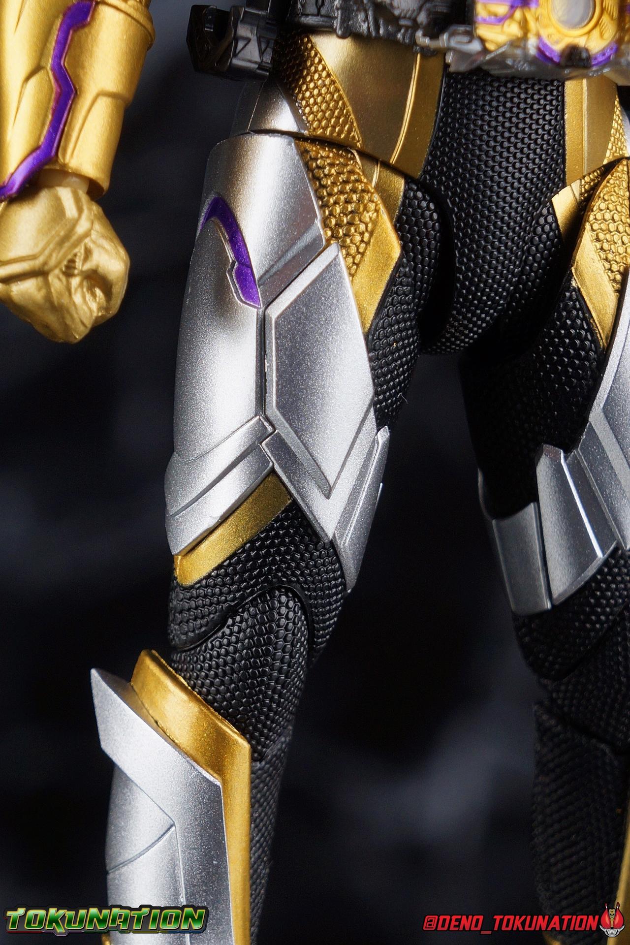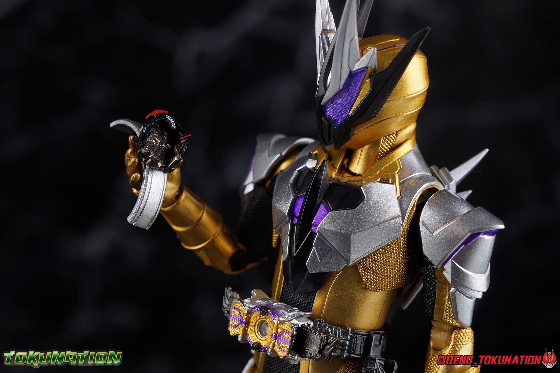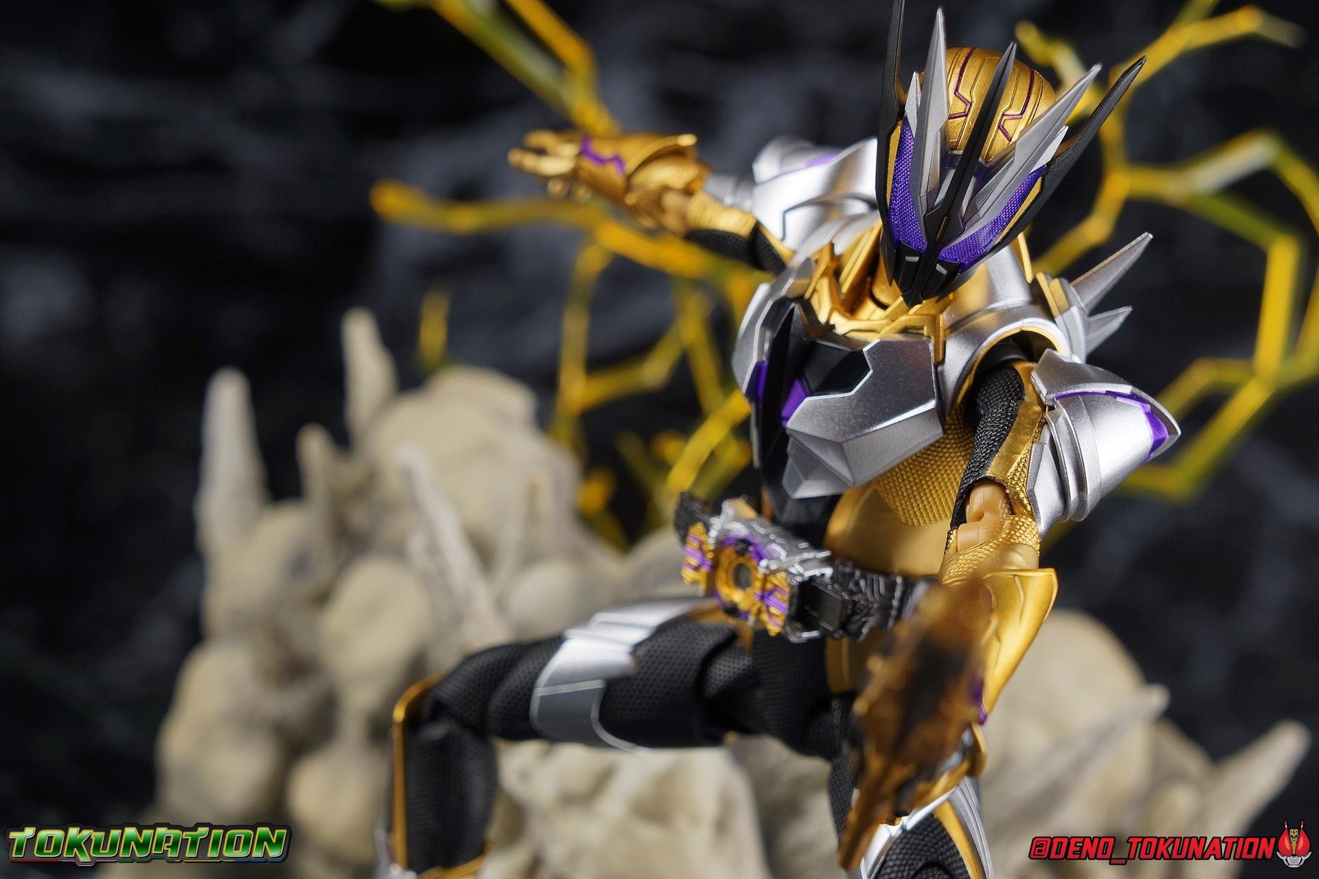 The cruelty of humanity. That is what Gai Amatsu instilled in Satellite Ark. In doing so he instigated not only the Daybreak Town Incident, but also the creation of Metsuboujinrai.net, and all the pain to come for both humans & humagears. For 12 years Gai has manipulated events from the comfortable shadows of ZAIA Enterprise. Now the mysterious man behind A.I.M.S. has his sights set on Hiden Intelligence as well, but can Zero-One keep his grandfather's company safe? Gai Amatsu is a master manipulator, and maybe one day, he could even be a hero. But for now? With strength that's 1000% greater than Zero-One's, the golden solider Kamen Rider Thouser is born! Packaging Keeping in line with the sort of packaging the Zero-One line has had, Thouser arrives in a mostly white box, but with appropriately ostentatious gold details and lettering. There are no fun black light gimmicks or anything like that with Thouser's box. Just some really standard stock photos and a nice portrait of the figure across the front. Nothing special to report this go around. Figure time! Main Figure Unfortunately I've yet to be able to handle all the riders from Zero-One so far. Having missed Horobi, Jin, & Valkyrie, I feel like I need to preface this review. Because I don't feel like I have a complete picture of the Zero-One Figuarts line yet without them. So if my impressions of Thouser are way off base, I apologize. That being said, while he's certainly the most ornately detailed of the Zero-One riders, he has a number of flaws as well that need to be addressed as this line continues. Zero-One really set the standard for this line. An absolutely rock solid release to kick off a new line up of rider figuarts, which doesn't always happen. And while I thought he was fantastic, I did feel Vulcan was a less than perfect follow up. With Thouser much of what we see is new, but there's a lot of familiarity as well. The basic form of the Zero-One mold is there, but Thouser still manages to be very different. In the legs we can see the exact same textured black detailing between the two, but the armor that covers it is entirely different. So these two do share at least some parts. However what they don't share is the same range of articulation. Thouser has very restricted ankles, largely due to the design of the ankle cuff, where it drops down around the back of the foot. This nixes almost all of the outward movement of the foot, so good luck with wide stances. The knee bends are fortunately spared, having been directly carried over from Zero-One, no new armor to get in the way. The hip and thigh are largely identical, with only surface details having been changed for Thouser. However the thigh armor does extend further up toward the waist on him as well. And because the drop down hips on this mold already don't go down very far, rotating the hips up to pose the figure is a dangerous preposition. Be very very careful to angle them correctly or you will damage the silver paint on the thighs. Bot overall I really like the way the legs look, the design is great and paint work magnificent. Around his waist, Thouser has the appropriately named Thousandriver. And much like the Zero-One Driver in this line, I feel like we've been a little cheated. The Zero-One Driver is essentially non-functional because it can't revert to it's closed pre-henshin state, and the Thousandriver is exactly the same. The two halves that cover the window of the driver are permanently molded open. So even if you remove the keys you can't really recreate the closed driver. As for the keys we get the Amazing Caucasus Progrisekey & Awaking Arsino Zetsumerisekey. Only the Caucasus key has any detail and that's just the emblem on the end of the key that winds up being in the driver window. Outside of this both keys are just black plastic. The Driver looks fantastic, but it feels half realized, much like the Forceriser. The belt also has Key holsters on each hip, but considering so far there are no closed Progrise or Zetsumerise Keys in this line that I'm aware of, these holsters are entirely pointless. The ab section of the torso is very very similar to Zero-One, it's possibly the same part, though there are some details sculpted into the surface like fabric folds on Thouser. The upper body is the big difference with Thouser having completely newly sculpted armor and some really bright regal colors. But Thouser's armor is also quite thick? The chest armor sticks out a fair bit further than Zero-One, nearly as far out as the Thousandriver. Luckily the torso's articulation is nearly the same as Zero-One. We get a full rotating waist joint, and a ball jointed upper body that can lean about 45 degrees to either side, with a fair bit of room to arch the back. Thouser also features quite similar arms to Zero-One. They're essentially the same, again with new armor for Thouser. Thankfully this means we get the same basic elbow bend and wrist articulation. However the shoulders are a different story. Largely because of the large new shoulder pads which Thouser sports. Covering a greater portion of the joint, and having less range to move, the pad limits what the arms can do. Leaving us with about a 45 degree bend in straight out and upward movement. This is a bummer but it wasn't unexpected as well. Finally, probably the most interesting thing about the Thouser design, is his helmet. It's a harsh, striking design that certainly looks like the bad guy. Even despite Gai's change of heart later in the series, the design still speaks to it's villainous origins. Early concept art for Thouser had the compound eyes in blue and I think that actually would have gone a long way to making the suit look more heroic overall. As is there's some great royal purple compound eyes set amongst a crown of beetle horns. Luckily all the added bulk of the head itself and the armor of the torso don't really impact how the head can maneuver. While the figure has plenty of areas that should have