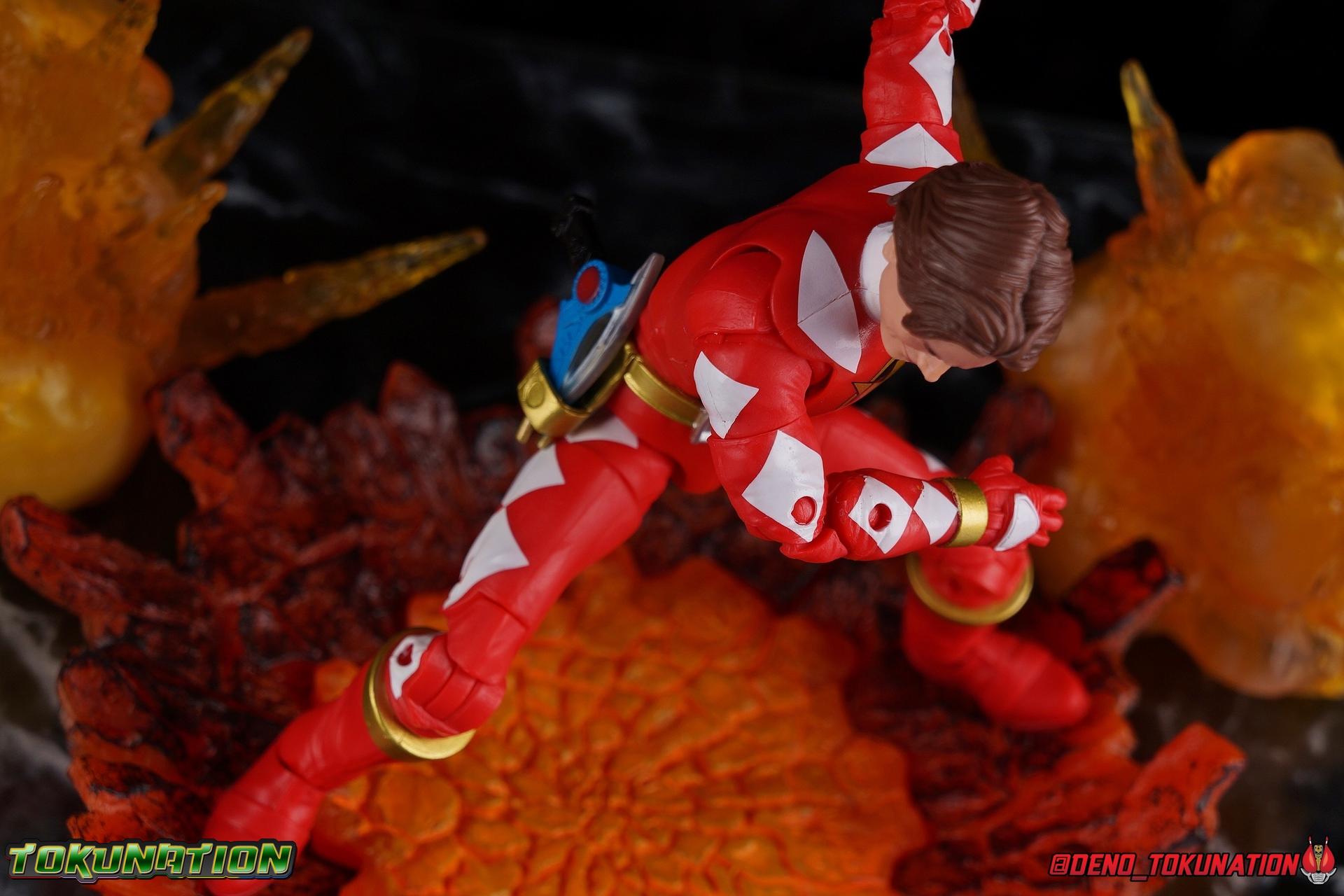 Connor McKnight could have never guessed that his teacher, Dr. Tommy Oliver, was once a Power Ranger. But after accidentally bonding with an ancient Dino Gem, becoming a Power Ranger himself with his two best friends, and facing off against the forces of an evil dinosaur mutant bent on returning Earth to the age of dinosaurs, nothing surprises him now. With power from within and the roar of the T-Rex in his heart, Connor has become the Dino Thunder Red Ranger! Protectors of the right, defenders sworn to fight, together Connor Ethan & Kira are the Power Rangers Dino Thunder! Packaging As we are all pretty familiar with the line by now, I'm sure I probably don't need to go through my usual list of reasons why it's awesome. Hasbro was keen to make sure these appealed to collectors and fans of the franchise from throughout it's various eras. And they also really pop thanks in no small part to some wonderful box art, lovingly crafted by artist Tom Whalen aka @strongstufftom on twitter. His artwork is breathtaking, and makes these figure's feel like just a bit more of a passion project from the folks at Hasbro. Main Figure The Red Ranger is now the 2nd release from Dino Thunder (aside from the Fighting Spirit Green Ranger) following the White Ranger. That release gave us a pretty good idea of what to expect for this team, and with Red in hand now I think we're really off to a fantastic start for Dino Thunder. While the mold may not be exactly identical between the two, they are very very similar and that made me feel pretty comfortable with red right from the start. The entire body is molded in red plastic, and it's broken up mostly by gold trim and white dino scale paint apps. Starting with the boots they've got a pretty basic gold sculpted cuff below the shin swivel, nothing fancy like the White Ranger. The figure features full rotating rocker ankles as well as a clicking swivel joint for them to go back and forth. Above this is the shin swivel, allowing you to rotate that portion of the leg 360 degrees below the knee. Then we get a very playful double jointed knee which lets you fully bend the leg back in on itself. This is already great but there's also a 360 thigh swivel as well as full hips with back/forth and outward motion. No matter what when posing the legs, you're obviously going to wind up breaking up the white paint apps along the exterior of the legs. All of these cuts are executed in the standard Lightning Collection styling, doing their best to not be obtrusive to this design. I will mention though to watch the thigh swivels on this one. Mine became extremely weak and loose after only a few minutes of posing. This is an issue I've yet to really experience on any other LC figures. Dino Thunder Red features the signature silver buckle and gold belt around his waist, with a right side hip holster for his included Thundermax Blaster. Unfortunately though this holster isn't designed to properly accommodate the weapon, and because the blaster doesn't transform there's no way to make it go in the holster correctly. The rest of the torso is totally standard stuff for the line. The lower half has a satisfying if way too tight ratcheting ab joint, while the upper body sits on a ball joint. The combination of the two gives you quite a bit to work with when posing. The chest also features a pretty crisp Dino Thunder emblem paint application. While mine has a couple minor flaws, on the whole it looks fantastic. Thankfully DT Red's design lends itself well the Lightning Collection styling and the upper body looks very fluid when posed thanks to that largely very monotone color scheme. The arms hit the sweet spot with that classic butterfly style shoulder joint. As you angle the shoulder back, the body slides out to fill the gap and vice versa. There's a full 360 rotating bicep swivel, double jointed elbows, and the same peg style hands as the rest of the line. But, in the same way as the White Ranger, DT Red's arms are oddly positioned. They can't really rest against the figure's torso naturally and instead angle outward. They also features white dino paint apps down the their full length. The left arm of course features the Dino Morpher. It is painted, however only in red, and in a more metallic shade of it than the rest of the figure is presented in. Thankfully this figure does not suffer the biggest flaw of it's teammate. Dino Thunder Red comes with a correctly painted and molded helmet. even if the details are somewhat inconsistent on my copy. I always liked the angular nature of the Dino Thunder helmets and I still feel that way here. It's a really great design that's translated well to toy form. And thankfully unlike another recent release (Time Force Red) the neck joint works and gives the head access to the full range of articulation. It's overall a really fantastic figure! Accessories Like the White Ranger before him, Connor comes with basically everything he needs: 1 - Thundermax Blaster. While a decent size to be held by the Dino Thunder rangers, I can't help but feel that shade of blue is wrong. Also, it can't be slotted into the hip holster properly so it's going to impact the torso while posing unfortunately. And it can't be holstered properly because it can't transform. So there's no way to get the blade along the top around the holser as needed. 1 - Thundermax Saber. Though in show the Blaster could literally transform into the Saber, Hasbro has opted to give us both versions of the weapon instead. A smart choice, but again, that shade of blue feels just a bit off to me, but the bigger issue, is really that it's too small. The blade feels very short and disproportionate to the body that's holding it. 1 - Tyranno Staff. This is another odd one honestly. I'm really glad to see they've included the staff, but it's missing all the paint apps it should have. None of the white diamond print, the T-Rex head isn't fully painted either. We just get a couple gold bands near the bottom 